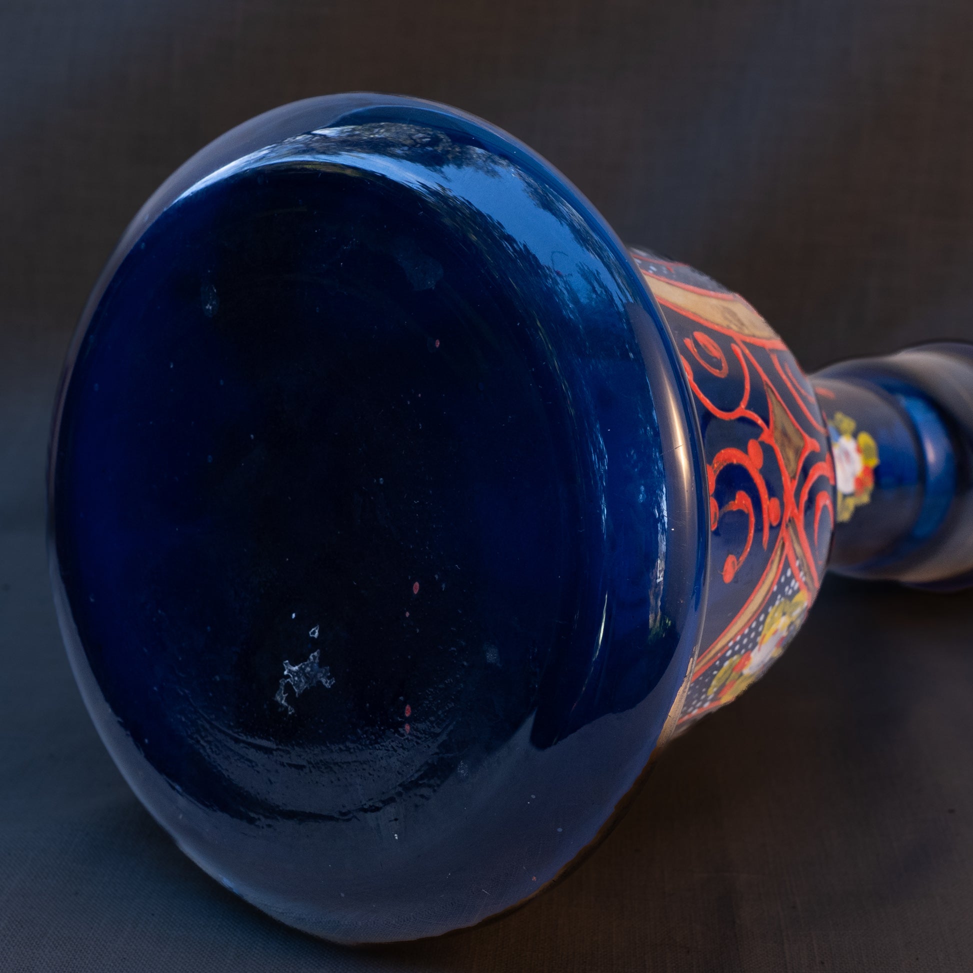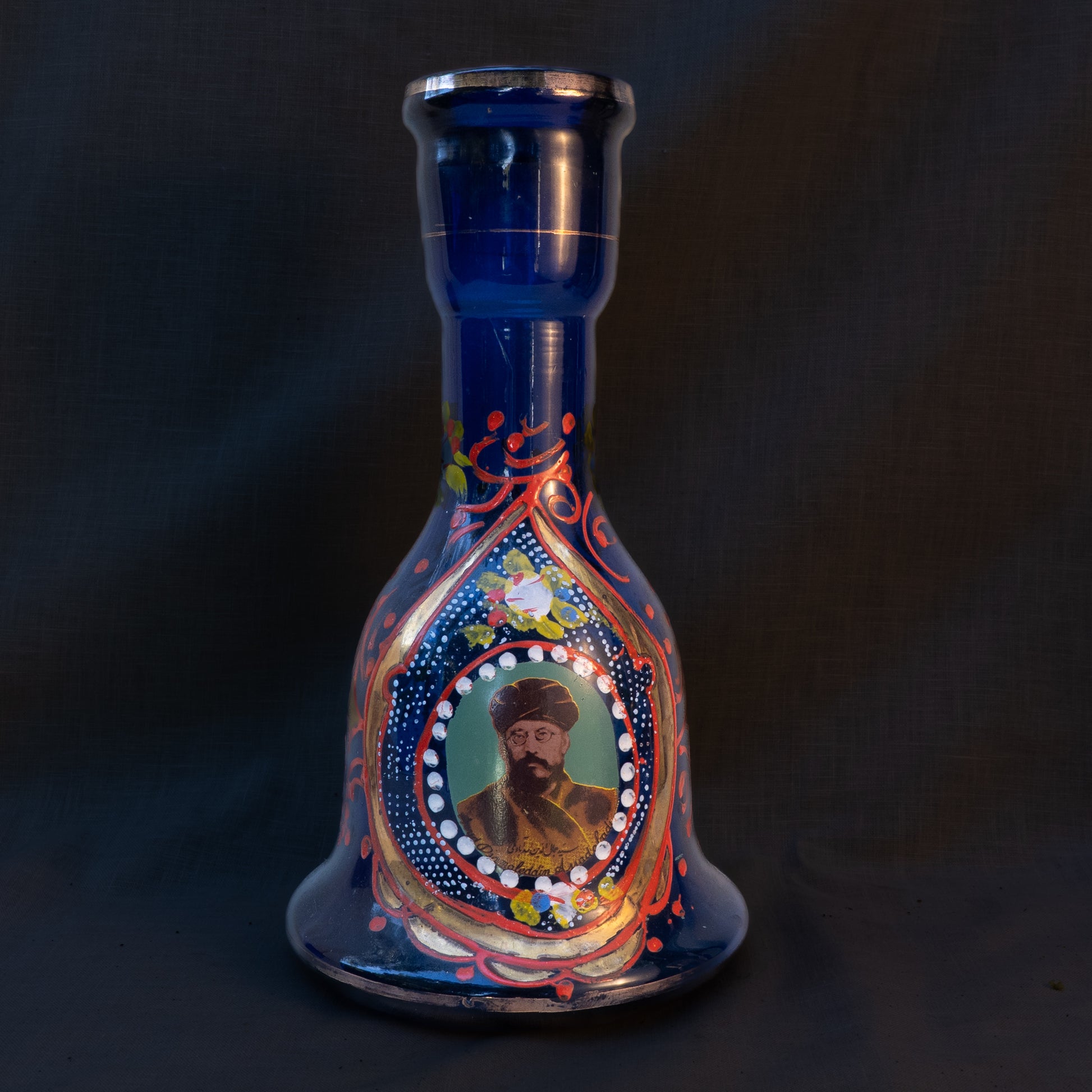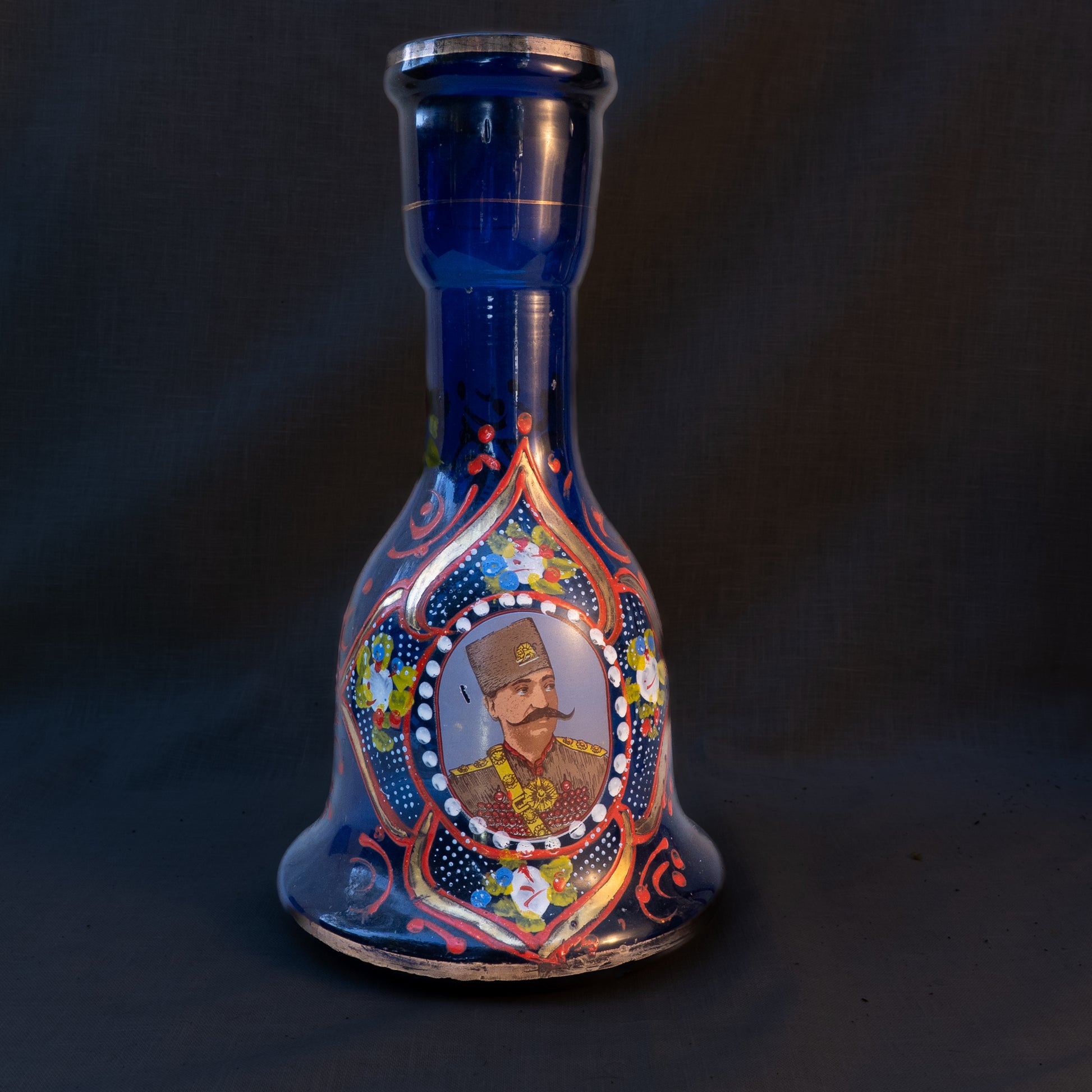 A gorgeous hand blown cobalt blue glass hookah base from around the turn of the century. It features hand painted arabeque designs and not one but two portraits applied using transferware. This hookah base is a standard size for the time in which it was created and finding the appropriate hardware for it to be used as a functional hookah should be fairly easy. It can also be used as a flower vase or an accent piece in any home. This was found in Beirut's famed souk il ahad flea market.