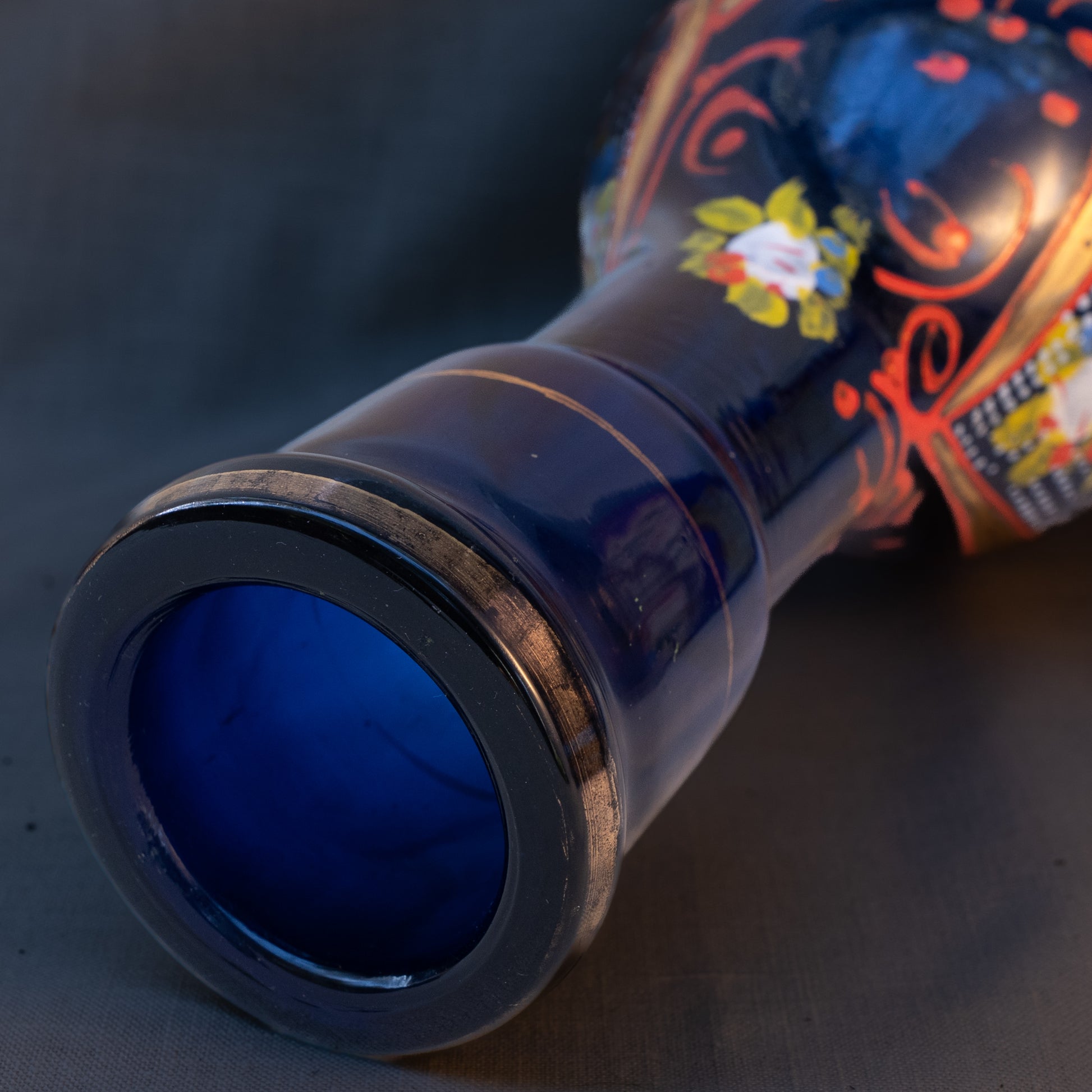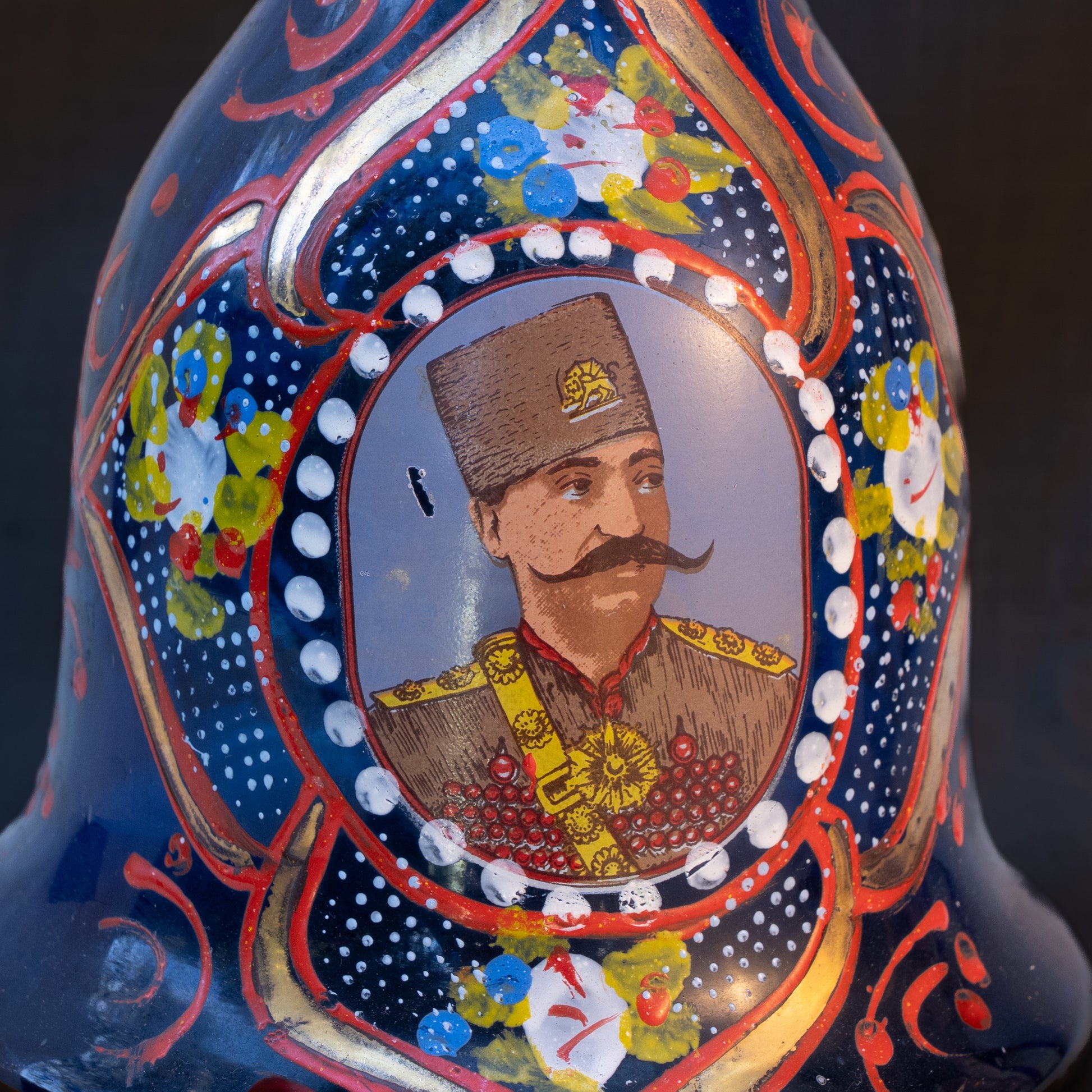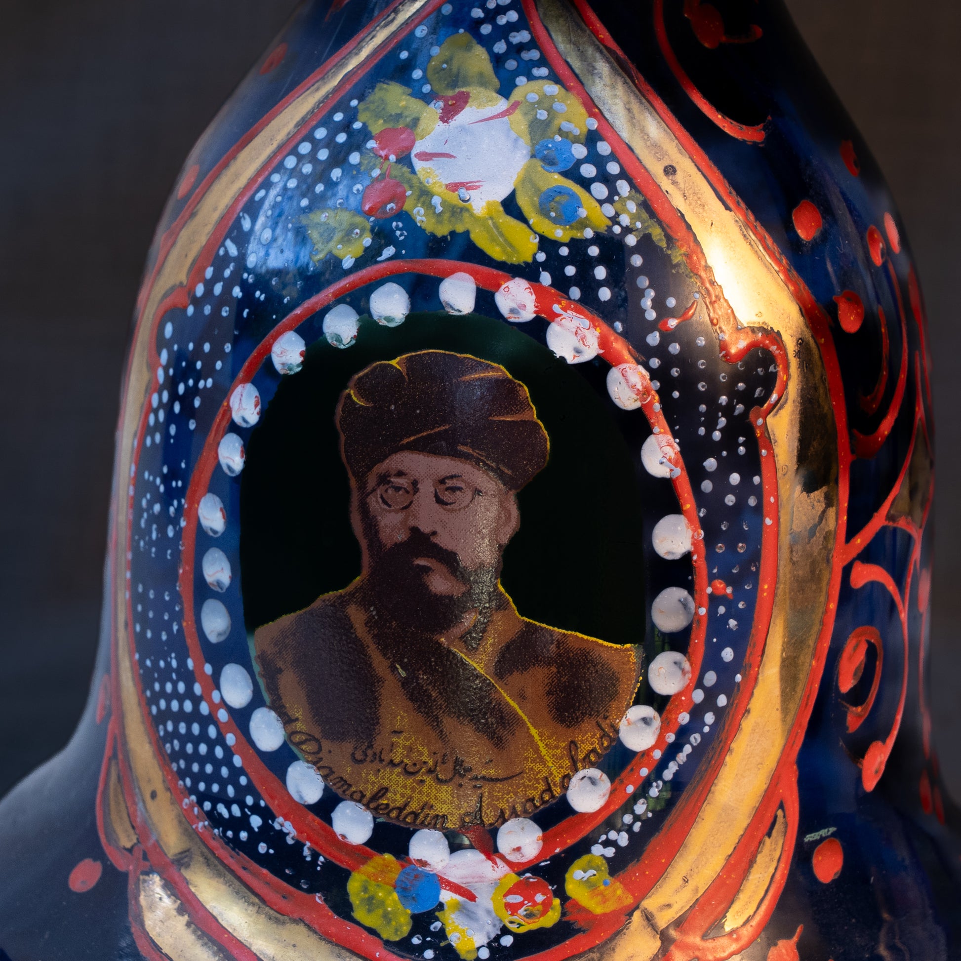 A gorgeous hand blown cobalt blue glass hookah base from around the turn of the century. It features hand painted arabeque designs and not one but two portraits applied using transferware. This hookah base is a standard size for the time in which it was created and finding the appropriate hardware for it to be used as a functional hookah should be fairly easy. It can also be used as a flower vase or an accent piece in any home. This was found in Beirut's famed souk il ahad flea market.