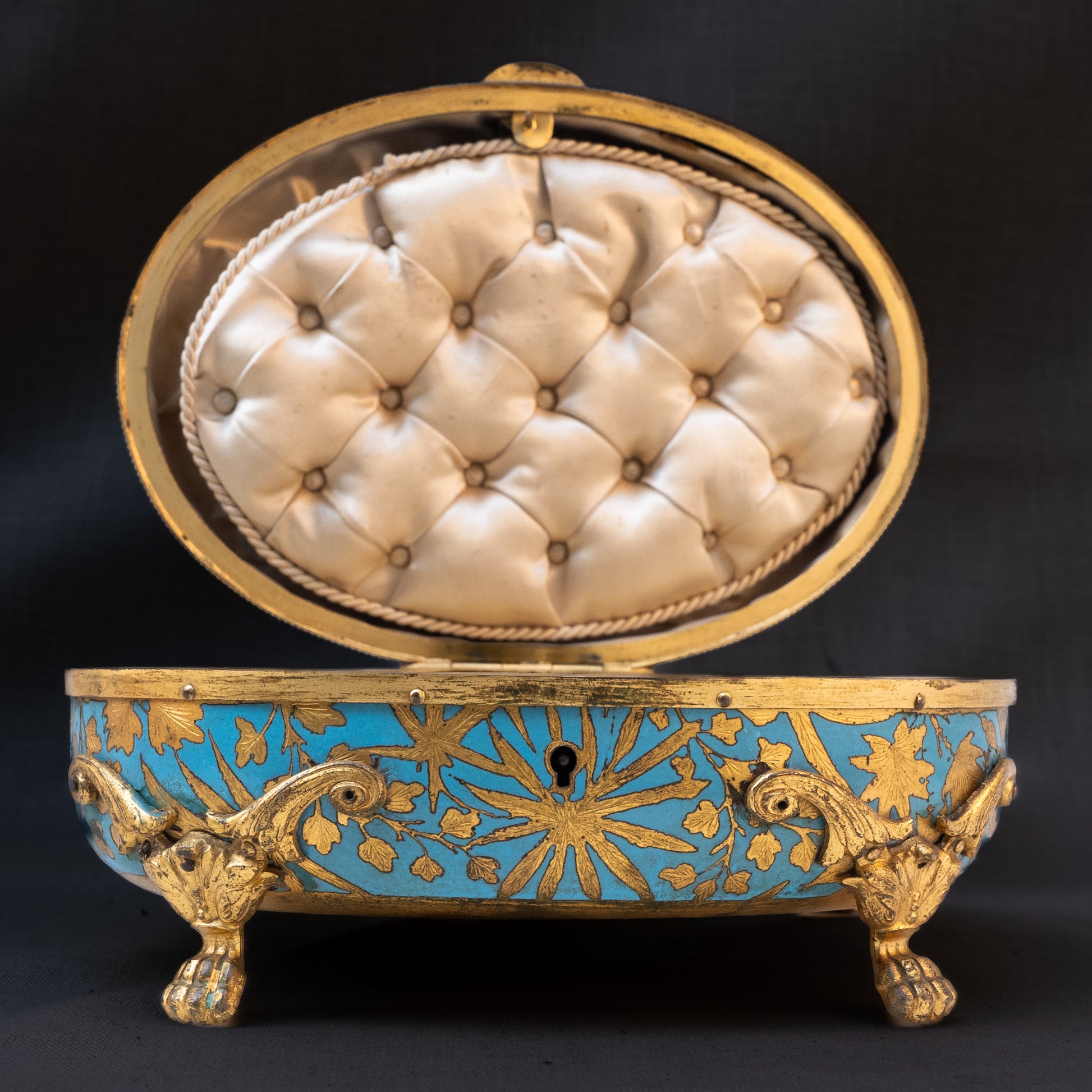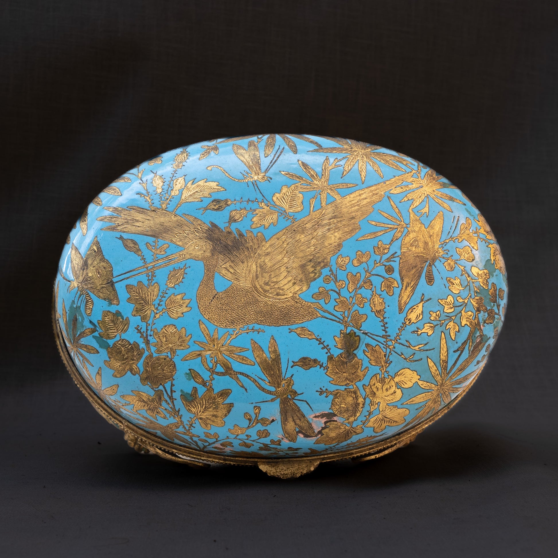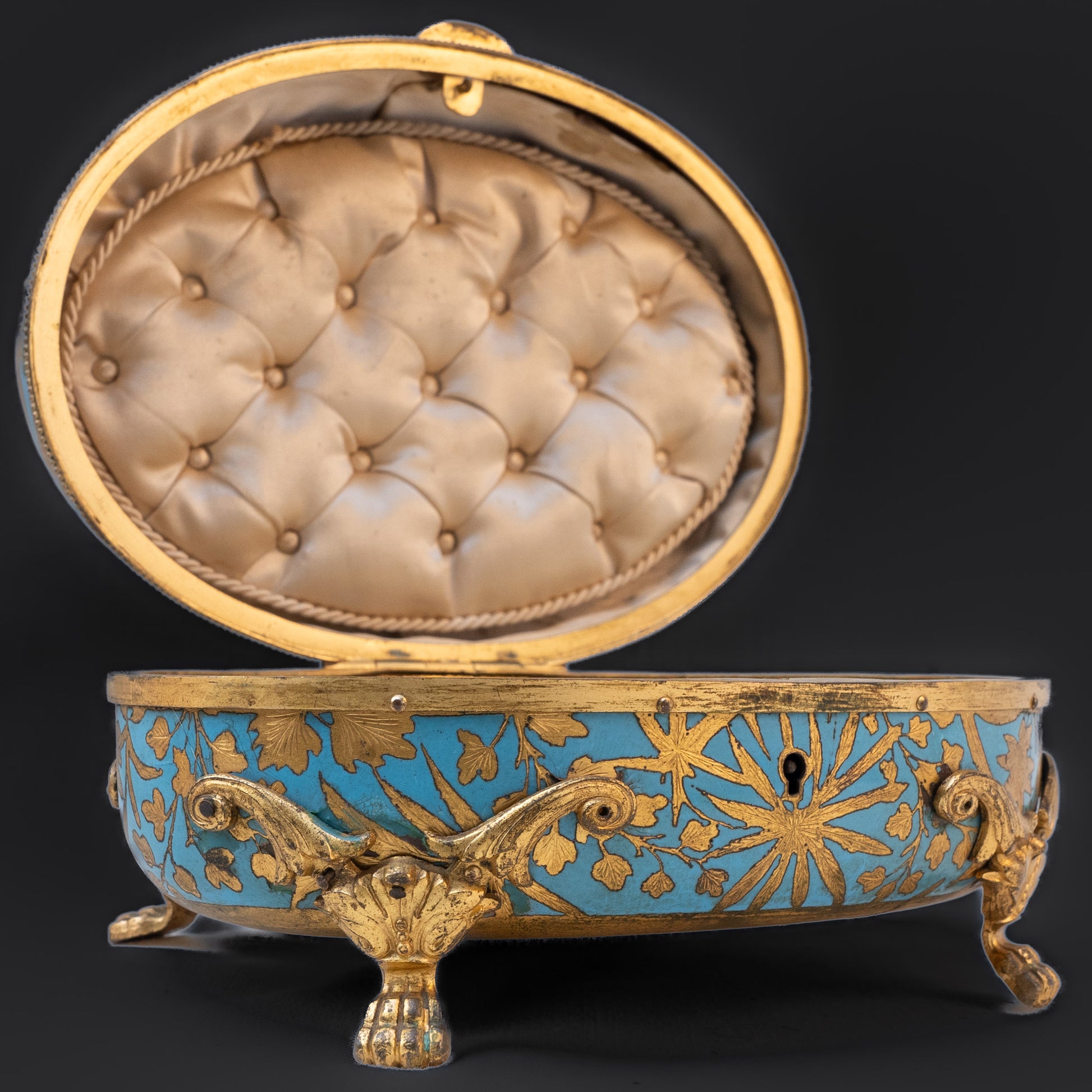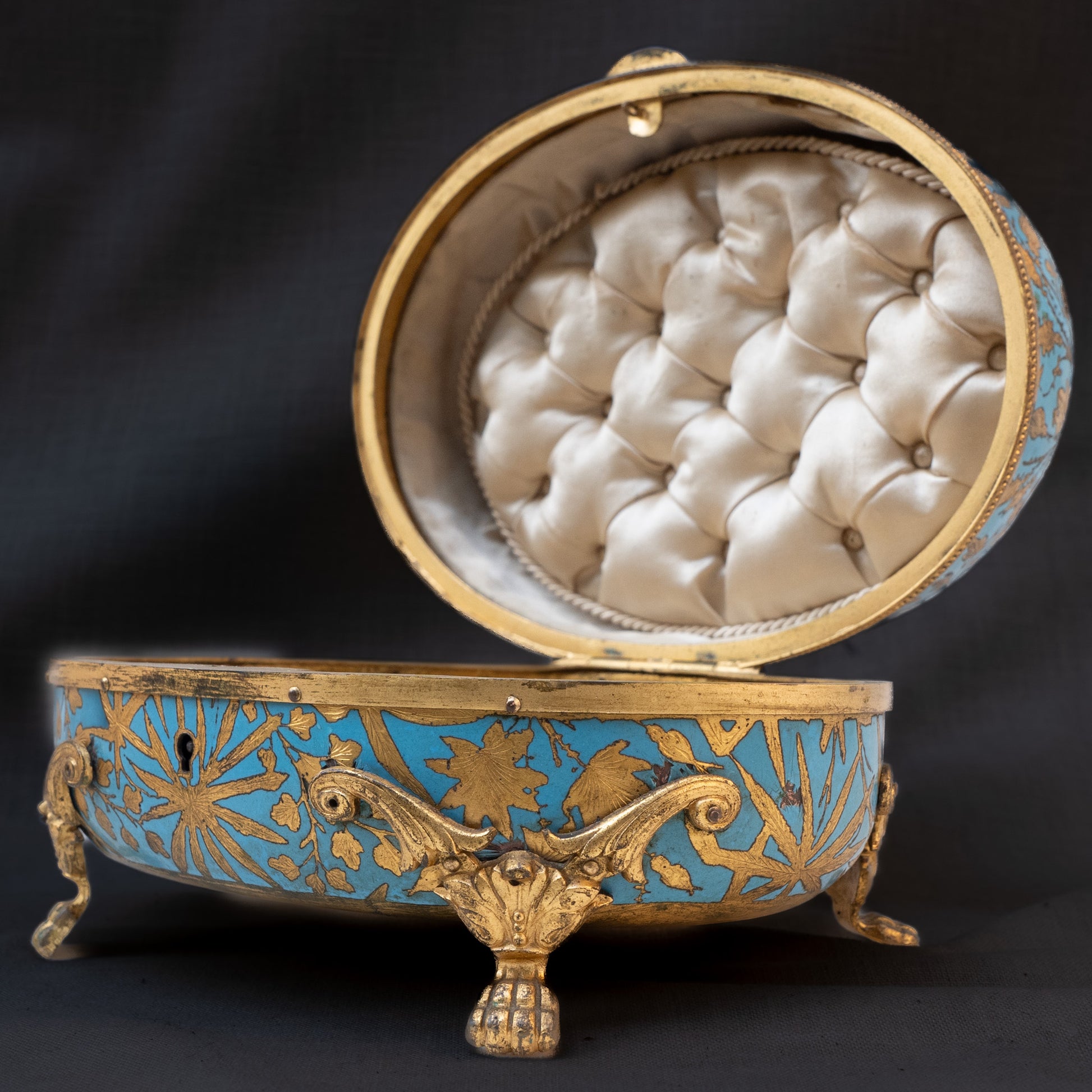 This is a beautiful 19th Century French Enamel Trinket/Jewelry Box. It is adorned with beauitiful ormolu hardware with lions claw feet, and the most beautiful turqoise enamel. It features a large crane on the lid of the box, with a beautiful background of foliage and butterflies. Inside the box is quilted silk upholstery. Missing the original key, and worn in a matter consistent with the age of the piece this is a rare find. Found in the Coastal city of Batroun, of Northern Lebanon you won't find a piece like it anytime soon.