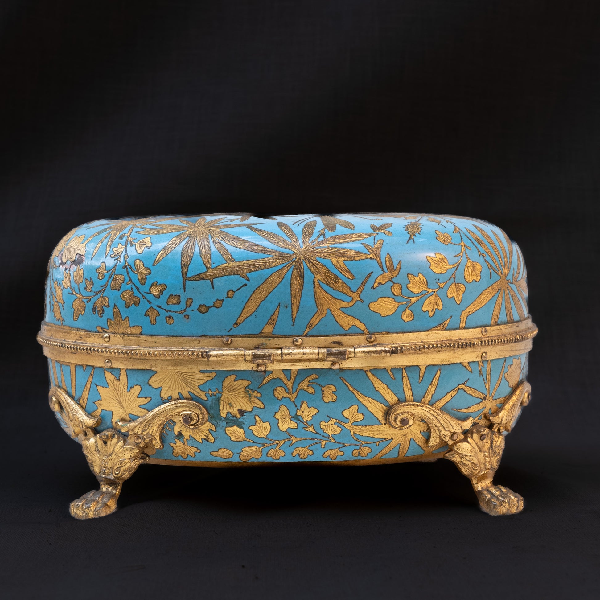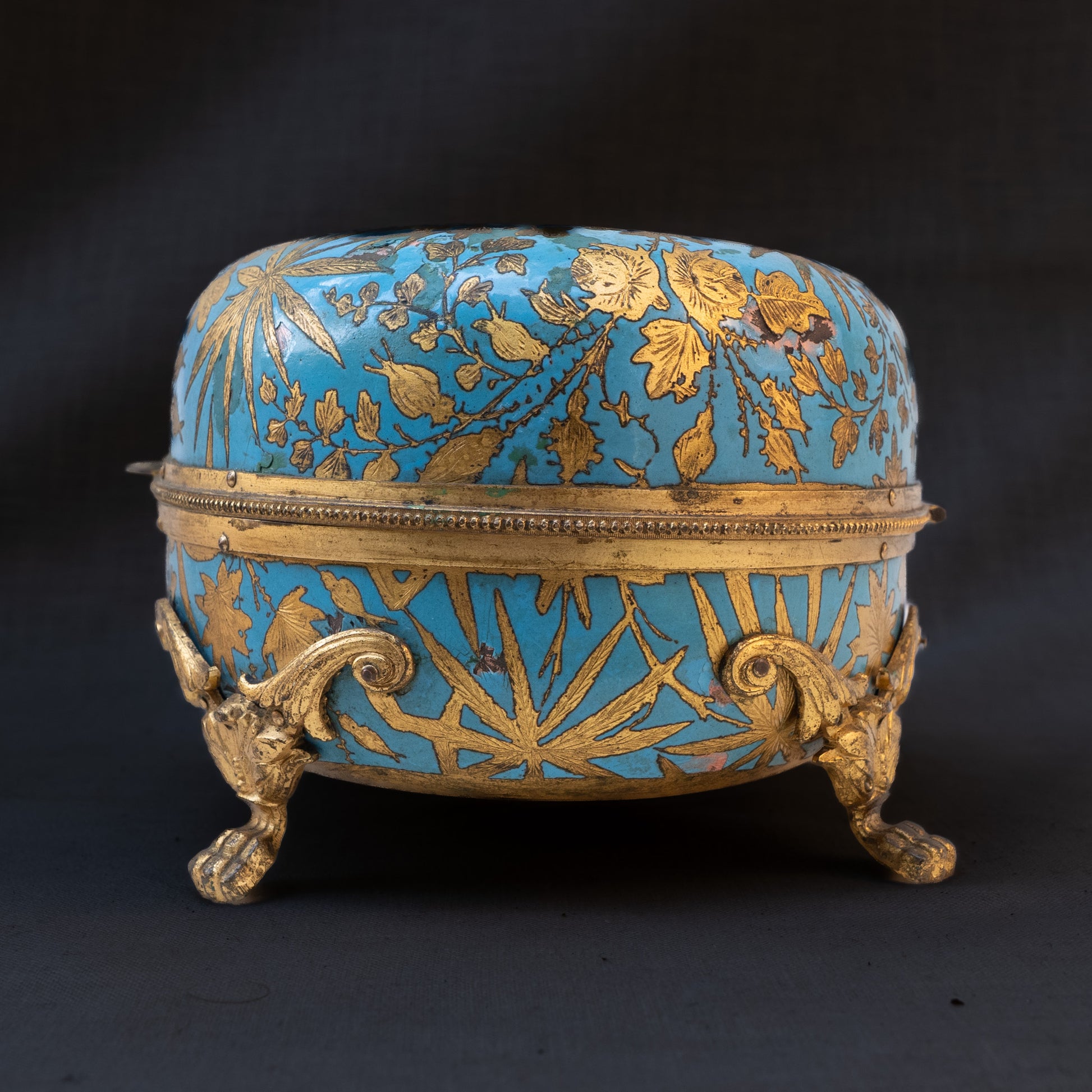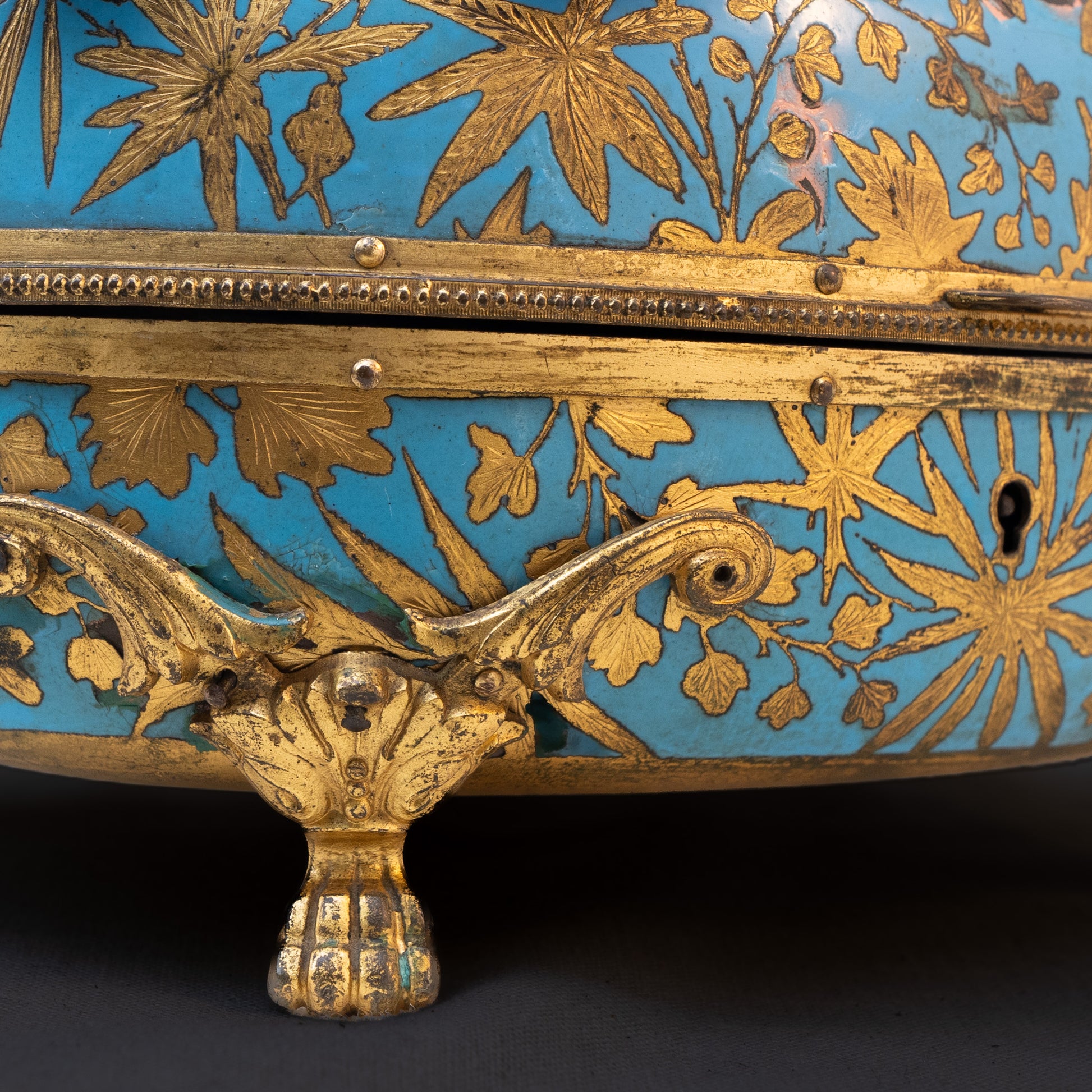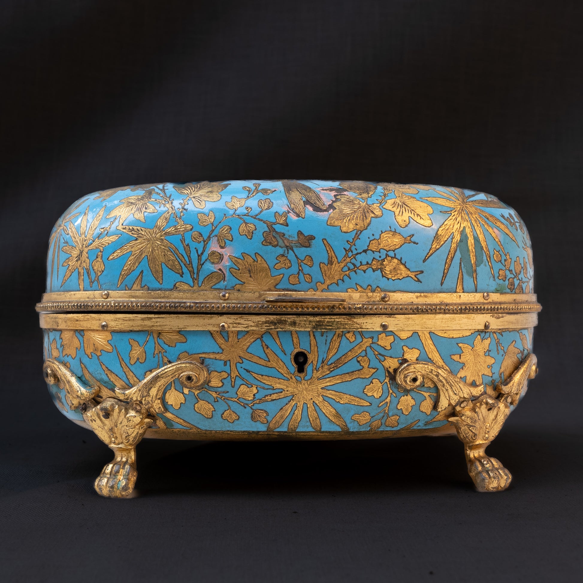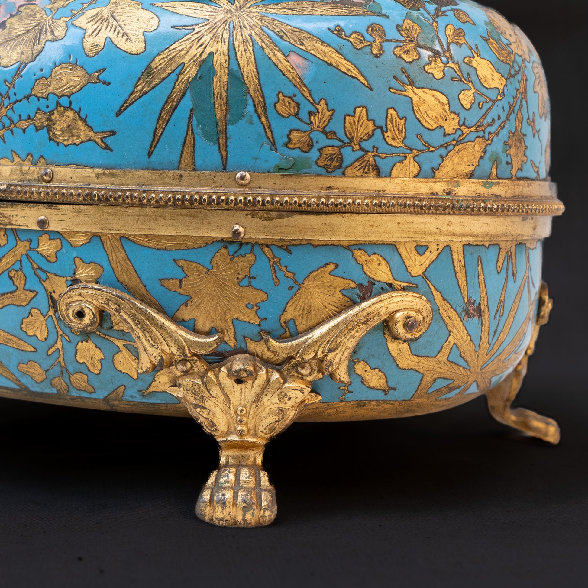 This is a beautiful 19th Century French Enamel Trinket/Jewelry Box. It is adorned with beauitiful ormolu hardware with lions claw feet, and the most beautiful turqoise enamel. It features a large crane on the lid of the box, with a beautiful background of foliage and butterflies. Inside the box is quilted silk upholstery. Missing the original key, and worn in a matter consistent with the age of the piece this is a rare find. Found in the Coastal city of Batroun, of Northern Lebanon you won't find a piece like it anytime soon.
