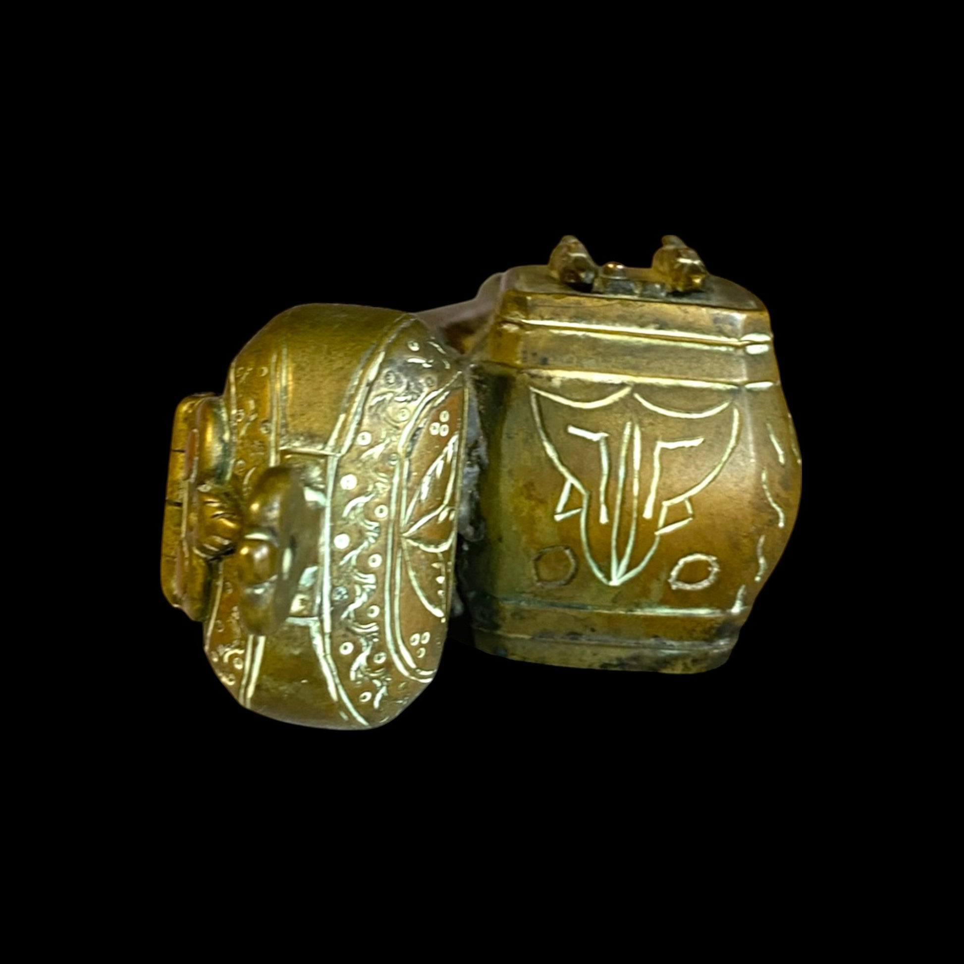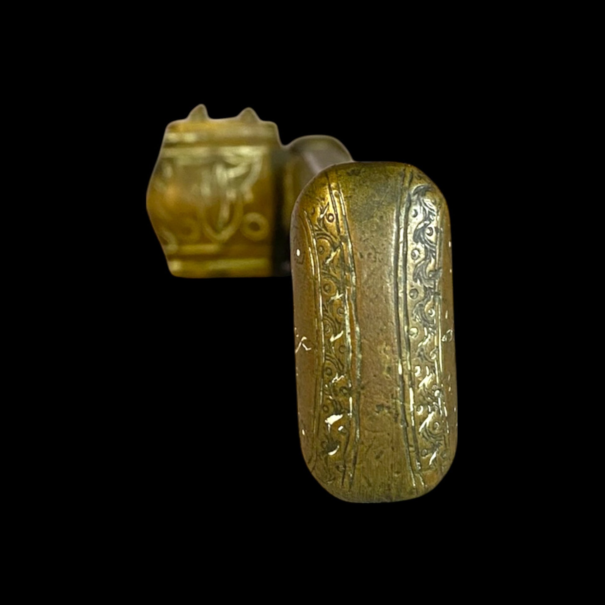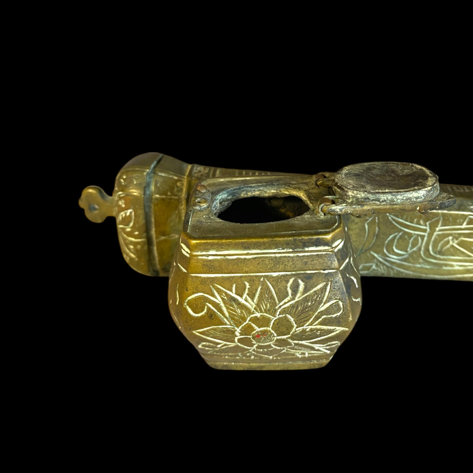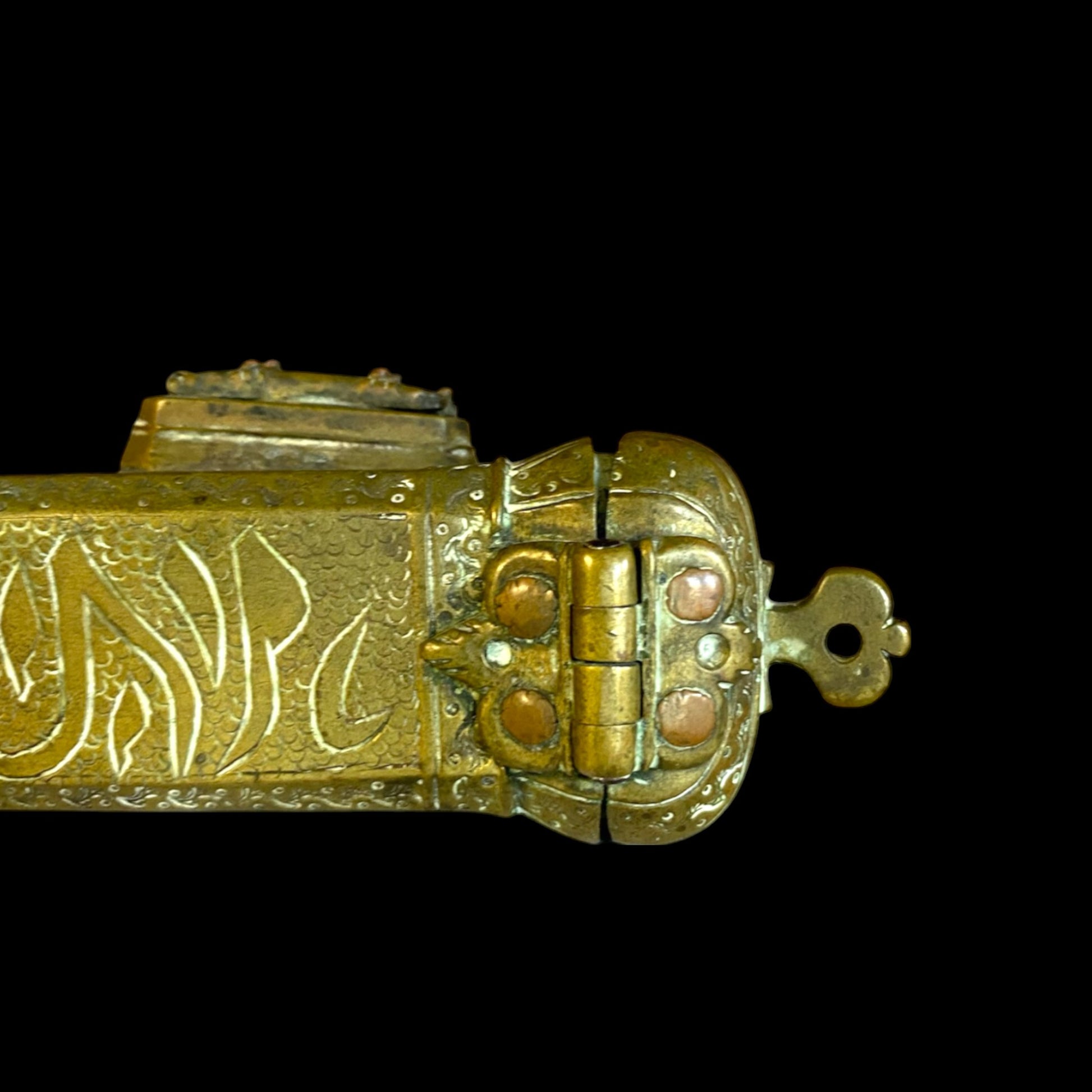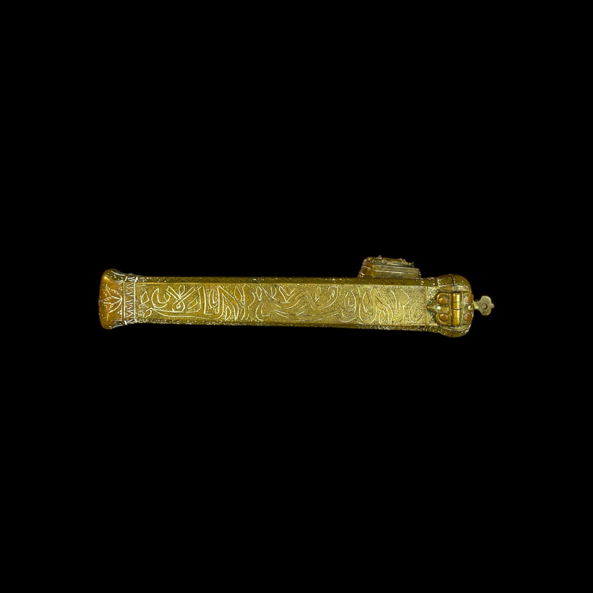 This antique Arab-Armenian Qalamdan, dated 1857, is a magnificent example of traditional calligraphy tools. Qalamdans were used by calligraphers to store and transport their writing instruments, such as reed pens and ink pots. The intricate design and expert craftsmanship of this piece are indicative of the rich cultural heritage of the Arab-Armenian community. The date of 1857 adds a personal touch and historical significance to the Qalamdan, making it a unique and valuable addition to any collection of antique calligraphy tools or Middle Eastern art.