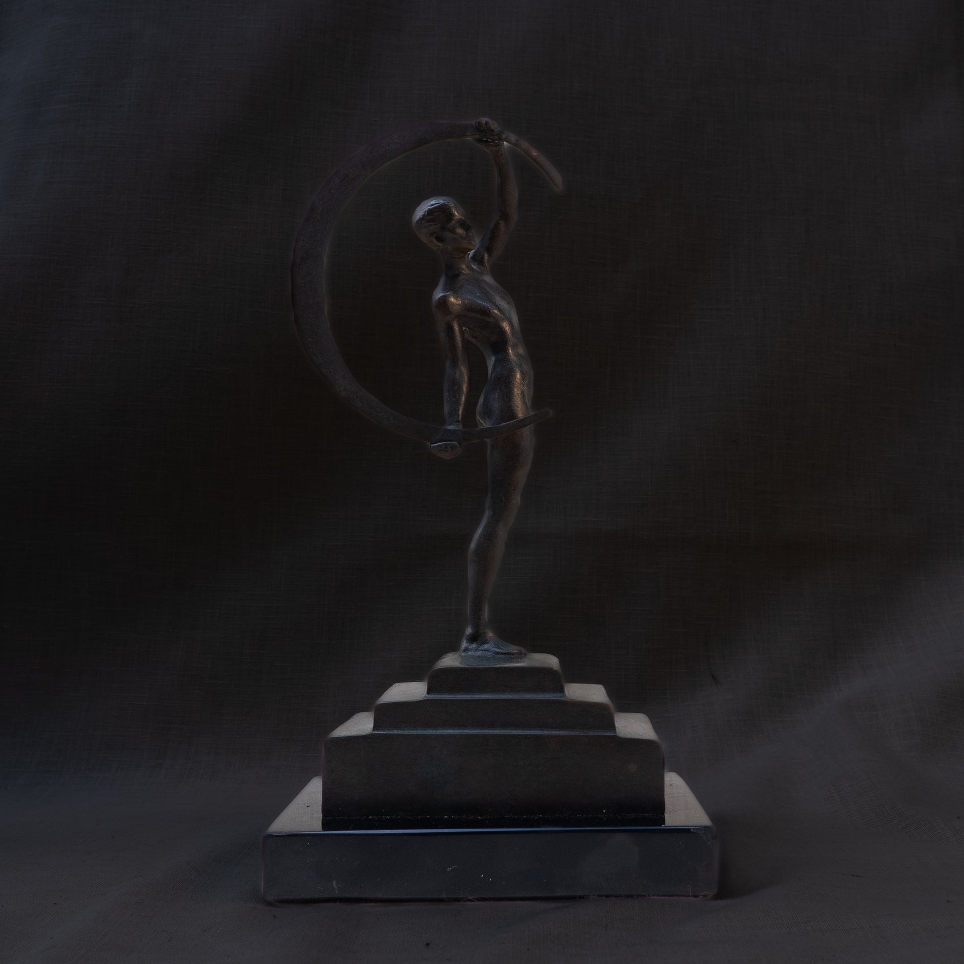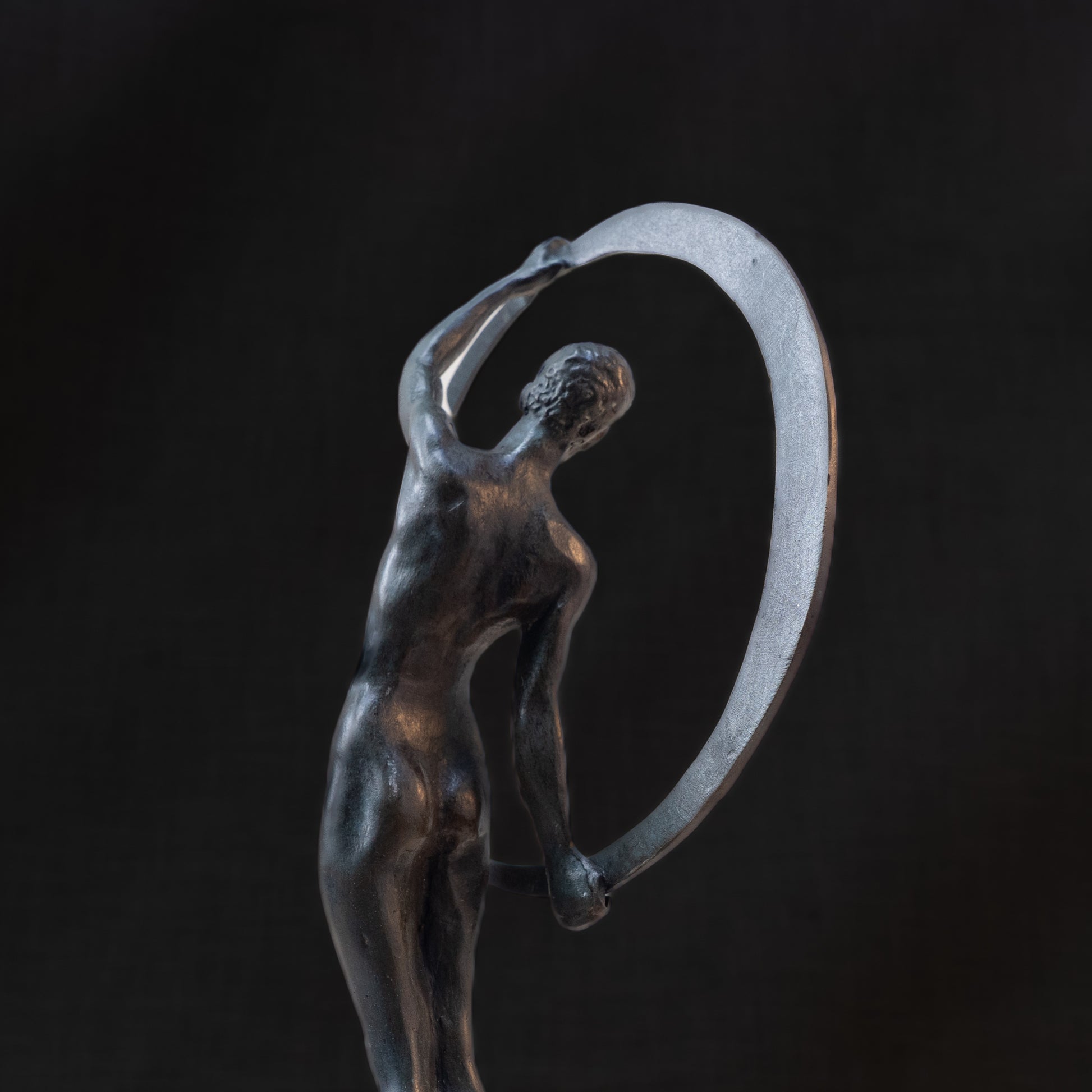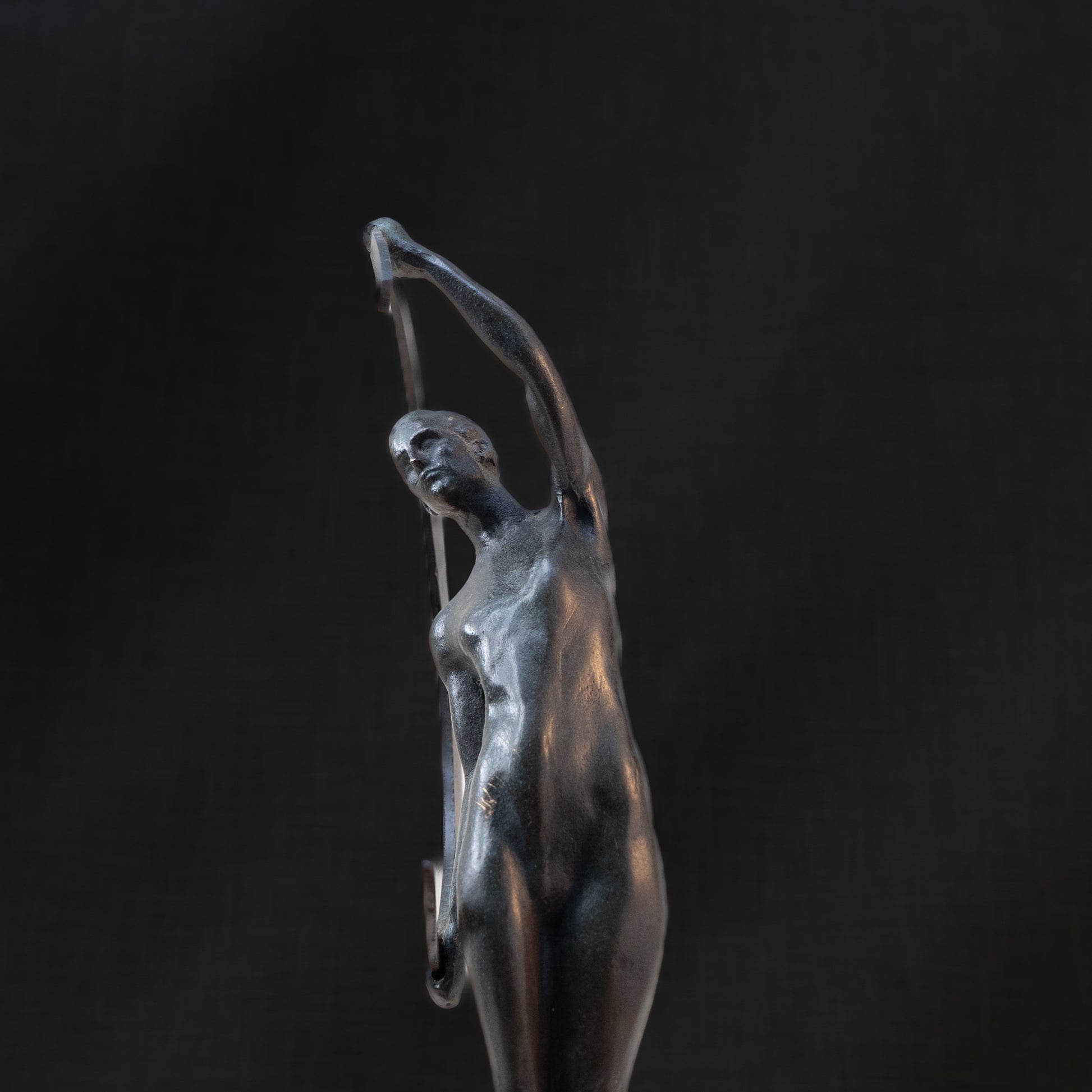 A dynamic and elegant bronze sculpture from the Art Deco period, likely France, circa 1925, depicting a nude female dancer balanced within a circular hoop. Poised in a contrapposto stance upon a black stepped marble base, the figure embodies the streamlined sensuality and geometric precision that define the Deco movement. Her outstretched limbs and the arc of the hoop create a visual rhythm that captures motion in stillness — an ode to the age of jazz, athleticism, and modern femininity. Sculptures of this kind, often found in the salons and drawing rooms of interwar Paris, celebrate the marriage of classical form and avant-garde innovation.