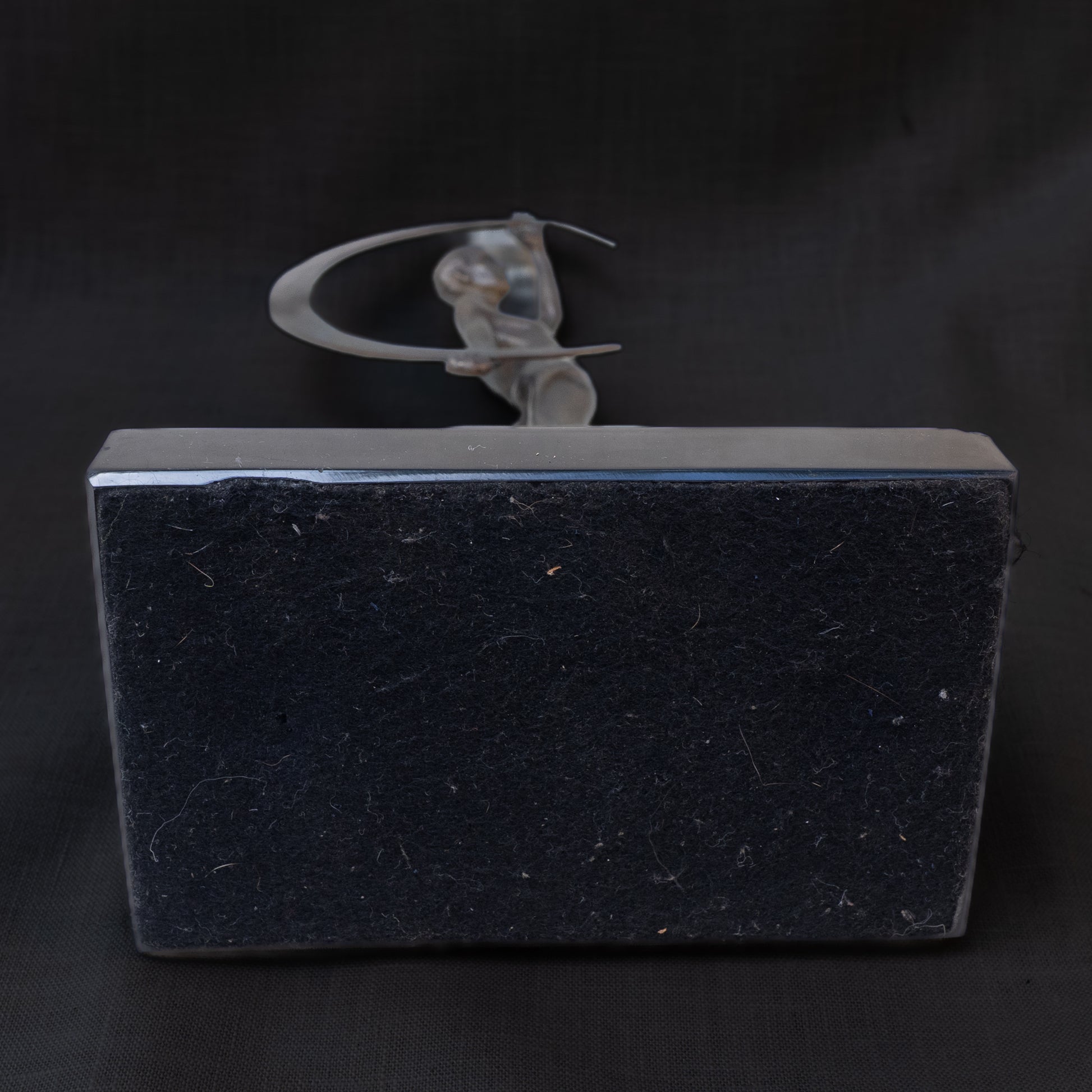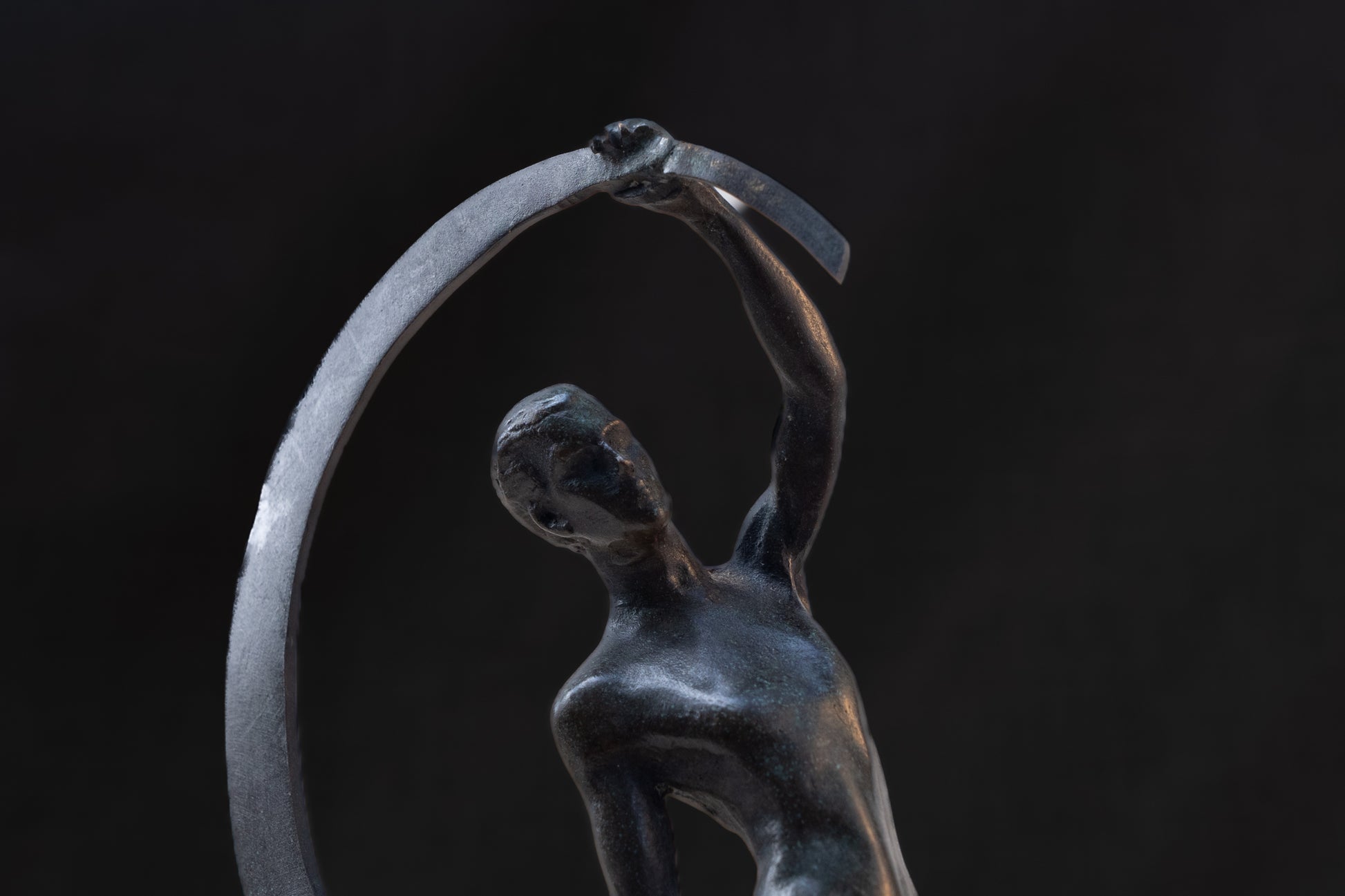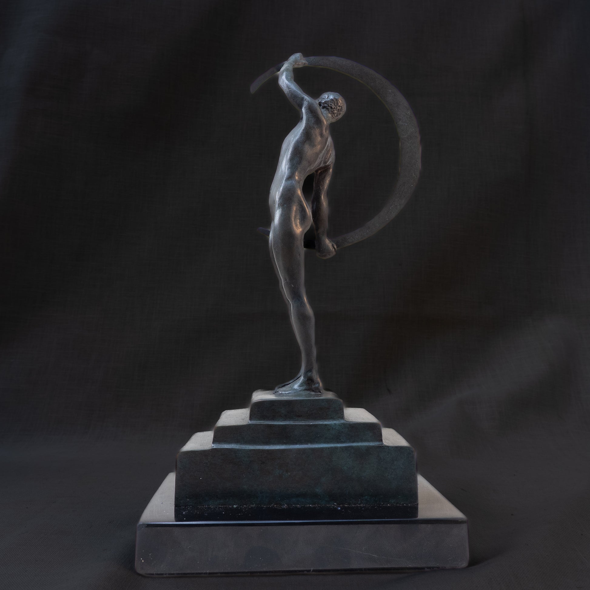 A dynamic and elegant bronze sculpture from the Art Deco period, likely France, circa 1925, depicting a nude female dancer balanced within a circular hoop. Poised in a contrapposto stance upon a black stepped marble base, the figure embodies the streamlined sensuality and geometric precision that define the Deco movement. Her outstretched limbs and the arc of the hoop create a visual rhythm that captures motion in stillness — an ode to the age of jazz, athleticism, and modern femininity. Sculptures of this kind, often found in the salons and drawing rooms of interwar Paris, celebrate the marriage of classical form and avant-garde innovation.