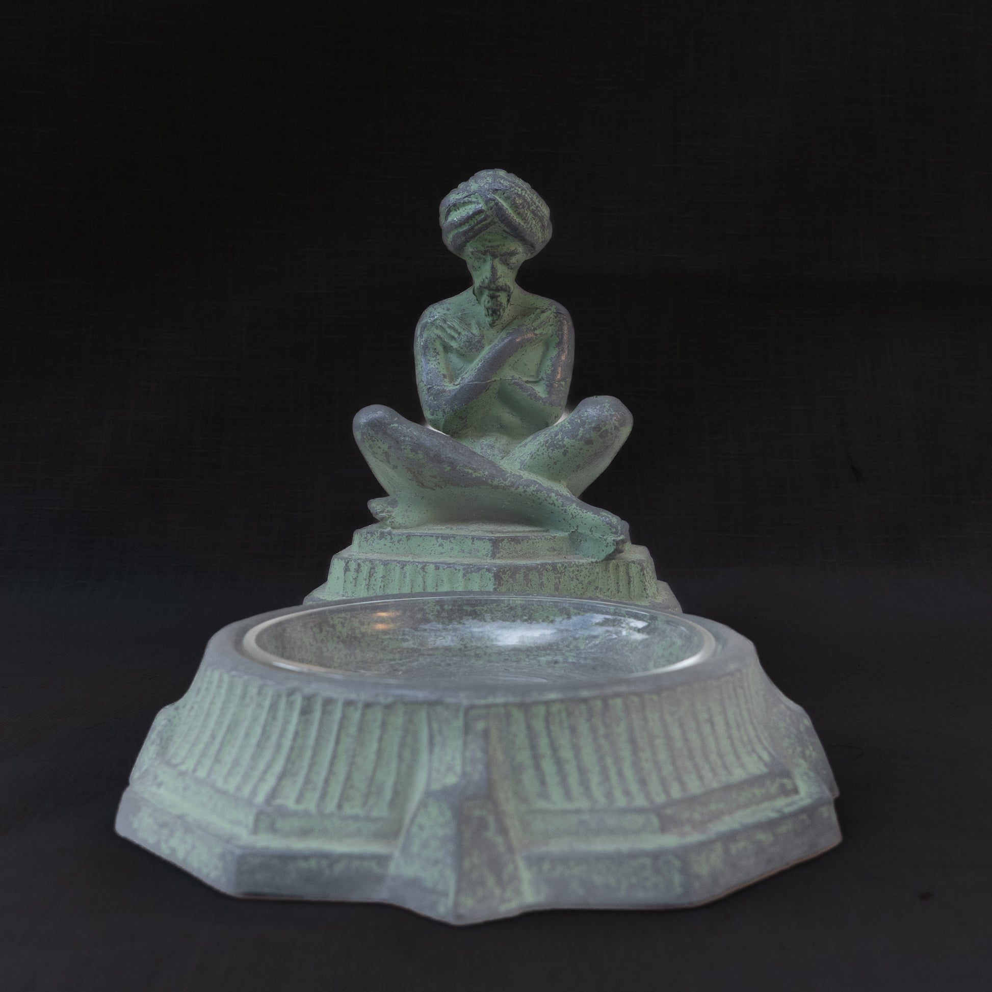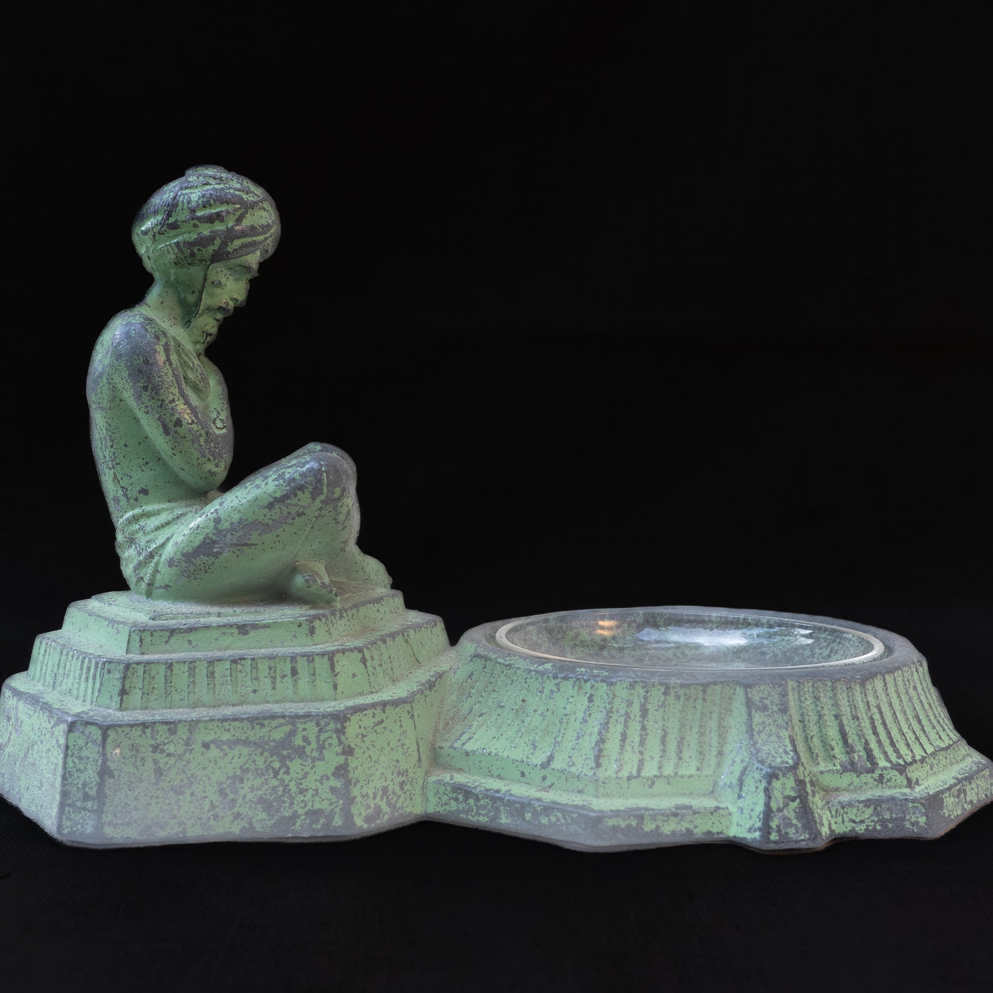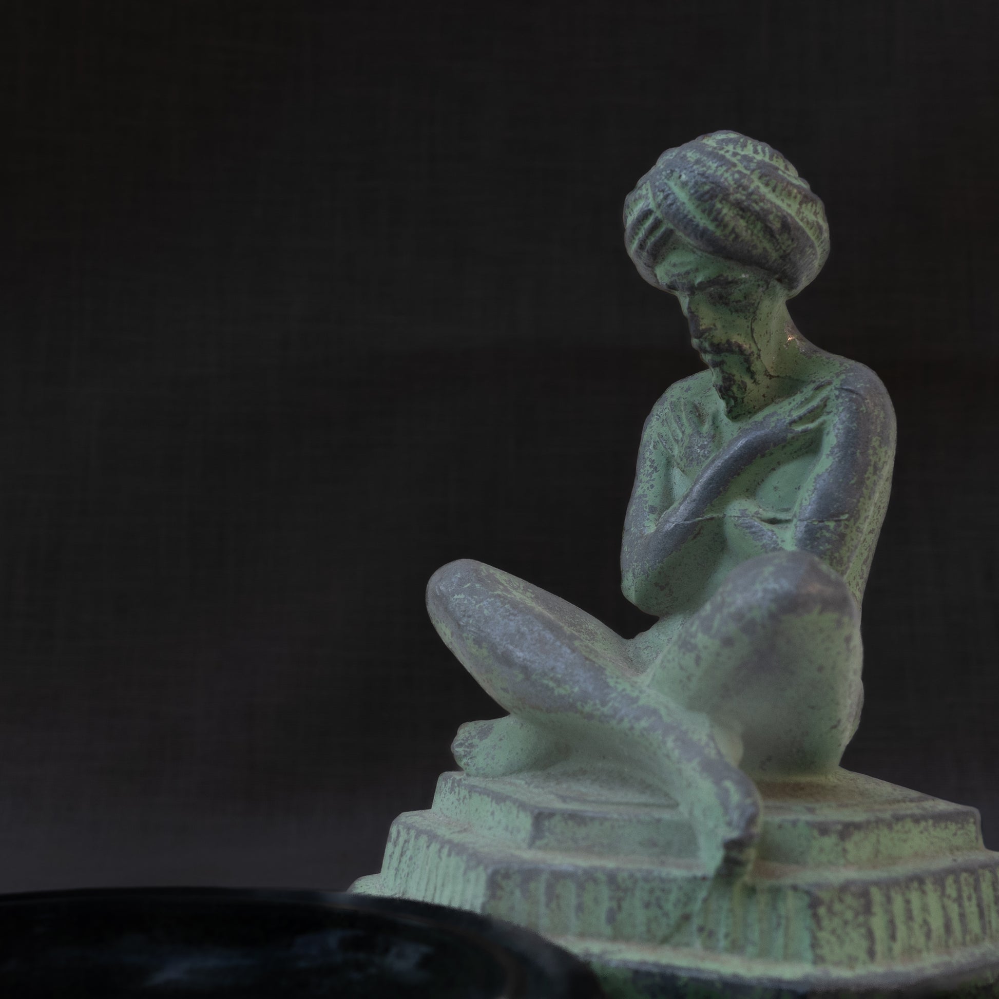 An exceptional example of Austrian cold-painted bronze craftsmanship, this figural ashtray embodies the romanticized vision of the East that captivated European decorative arts at the turn of the 20th century. Likely produced in Vienna circa 1900, the piece features a young man seated in repose, cast in meticulous detail and finished with original polychrome cold painting now softened to a richly patinated verdigris. He is positioned beside a circular ashtray basin integrated into an architectural base of stepped tiers and linear fluting. Objects such as this were not merely utilitarian; they served as table-top vignettes — small windows into the Orientalist imagination, where exoticism, leisure, and storytelling intertwined. A poetic synthesis of form and function, this piece exemplifies the golden era of Viennese bronzes and their enduring collectible appeal.