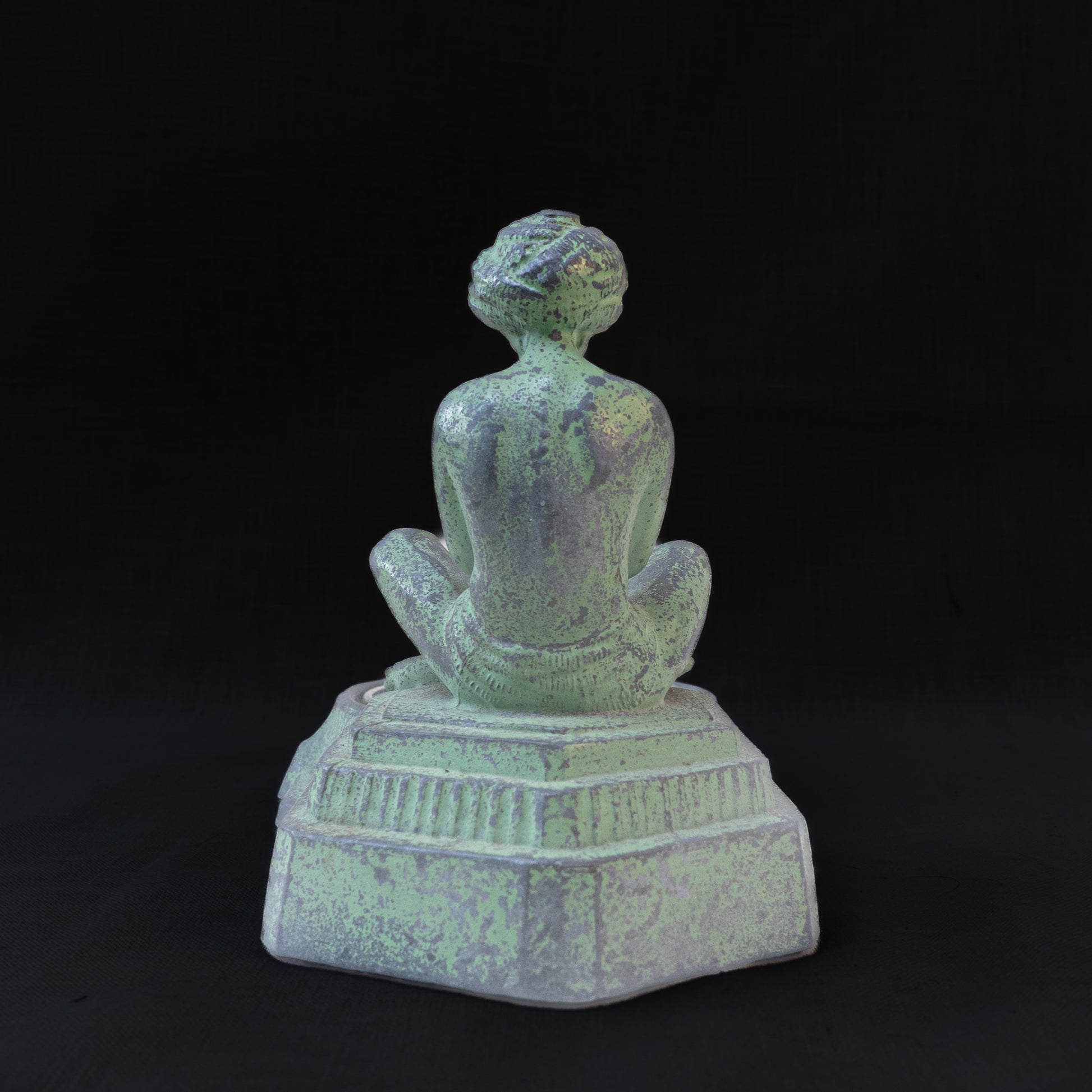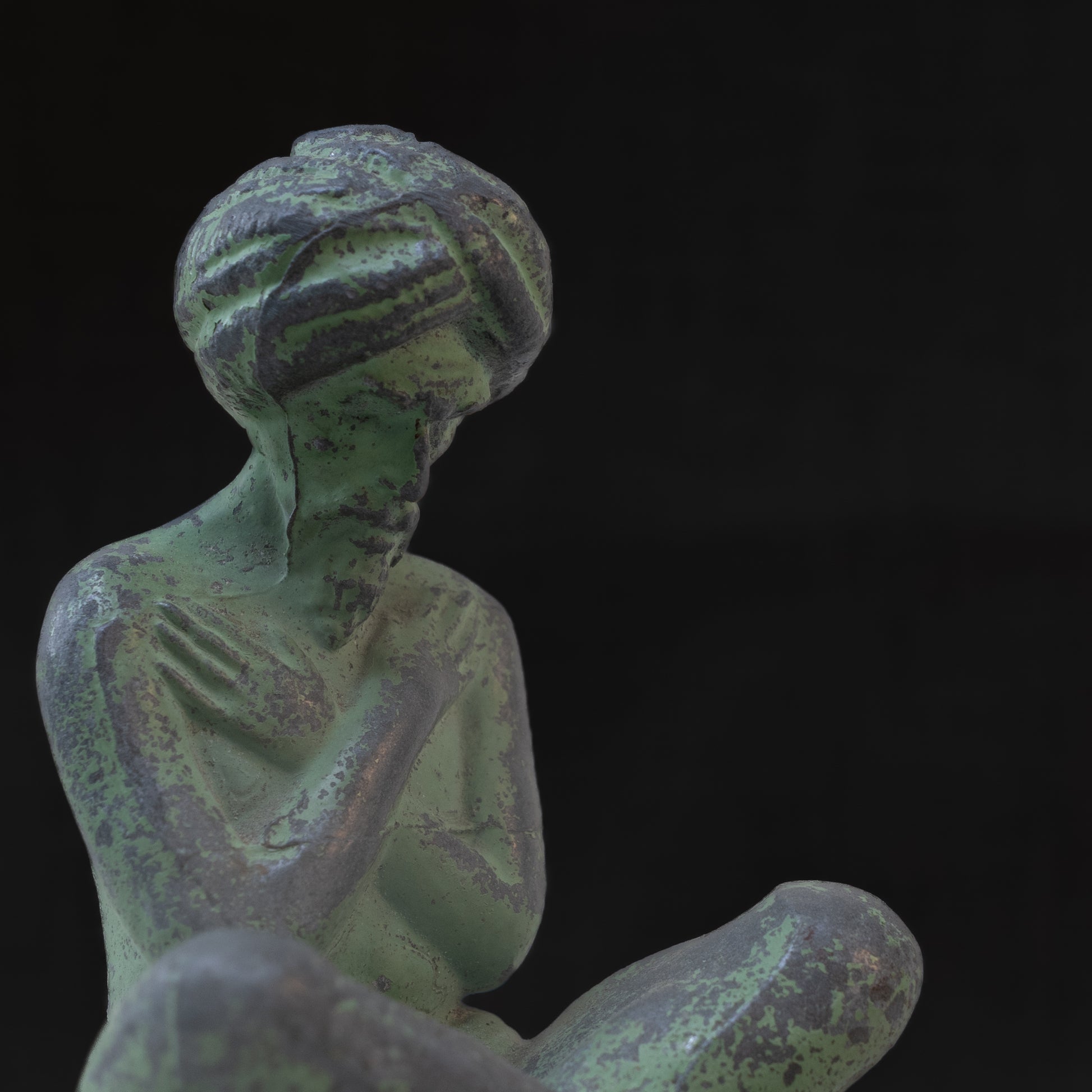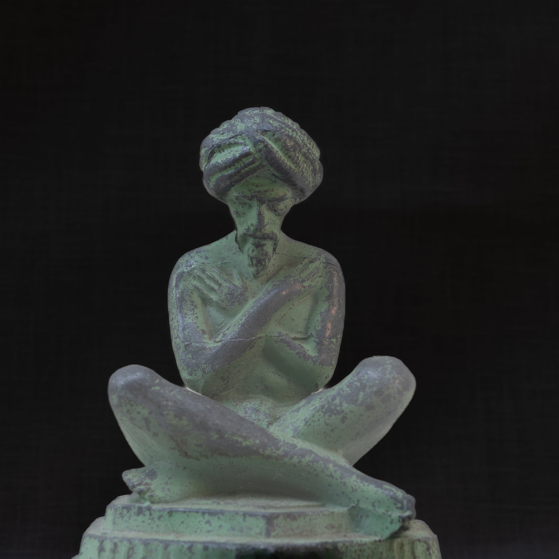 An exceptional example of Austrian cold-painted bronze craftsmanship, this figural ashtray embodies the romanticized vision of the East that captivated European decorative arts at the turn of the 20th century. Likely produced in Vienna circa 1900, the piece features a young man seated in repose, cast in meticulous detail and finished with original polychrome cold painting now softened to a richly patinated verdigris. He is positioned beside a circular ashtray basin integrated into an architectural base of stepped tiers and linear fluting. Objects such as this were not merely utilitarian; they served as table-top vignettes — small windows into the Orientalist imagination, where exoticism, leisure, and storytelling intertwined. A poetic synthesis of form and function, this piece exemplifies the golden era of Viennese bronzes and their enduring collectible appeal.