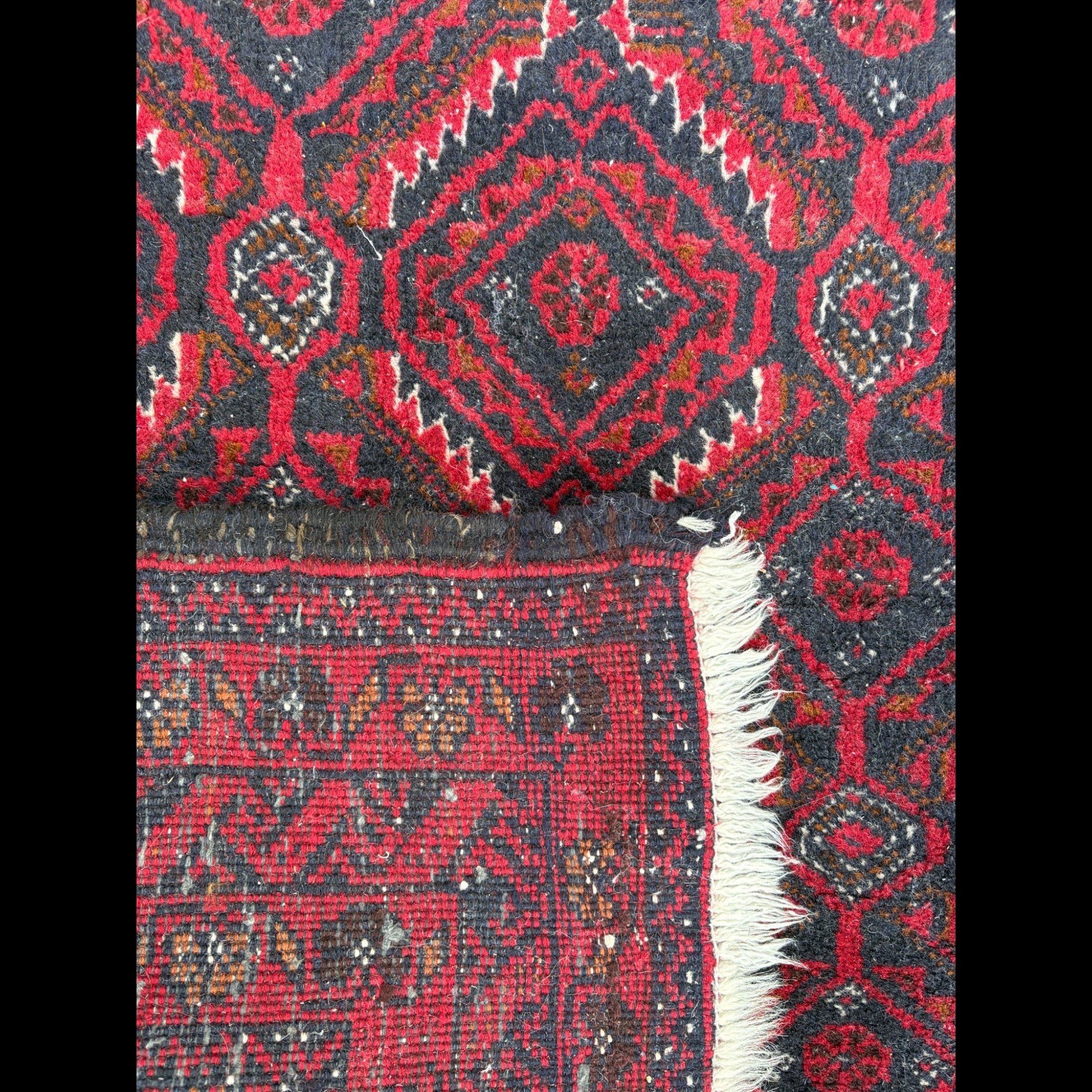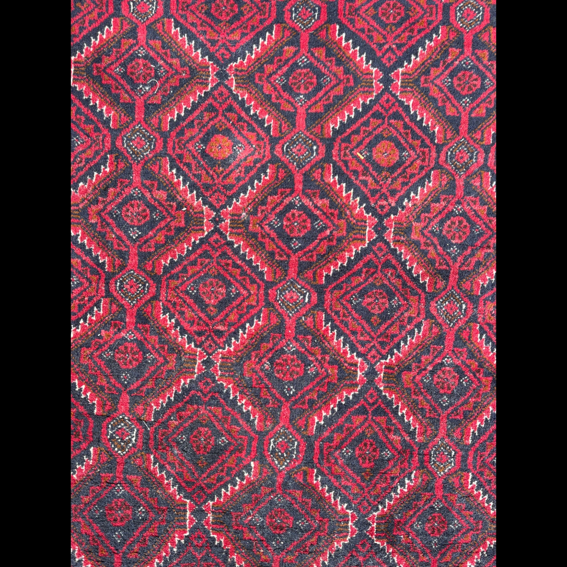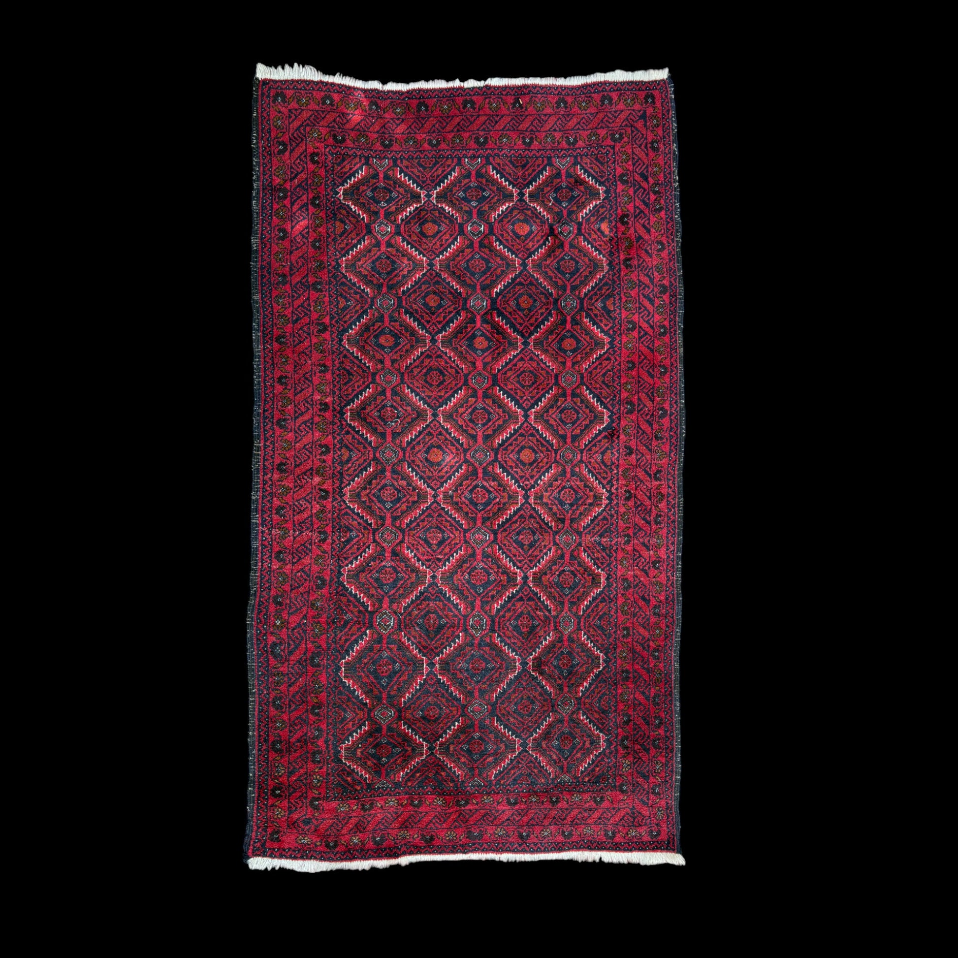 Of deep saturated tones and finely knotted craftsmanship, this elegant Baluch tribal rug is a quintessential example of nomadic artistry from the Khorasan region, where Persian and Afghan influences converge. The field is richly decorated with a continuous lattice of diamond-shaped gul motifs, each intricately filled with stylized floral medallions and symbolic patterns believed to represent protection and prosperity.