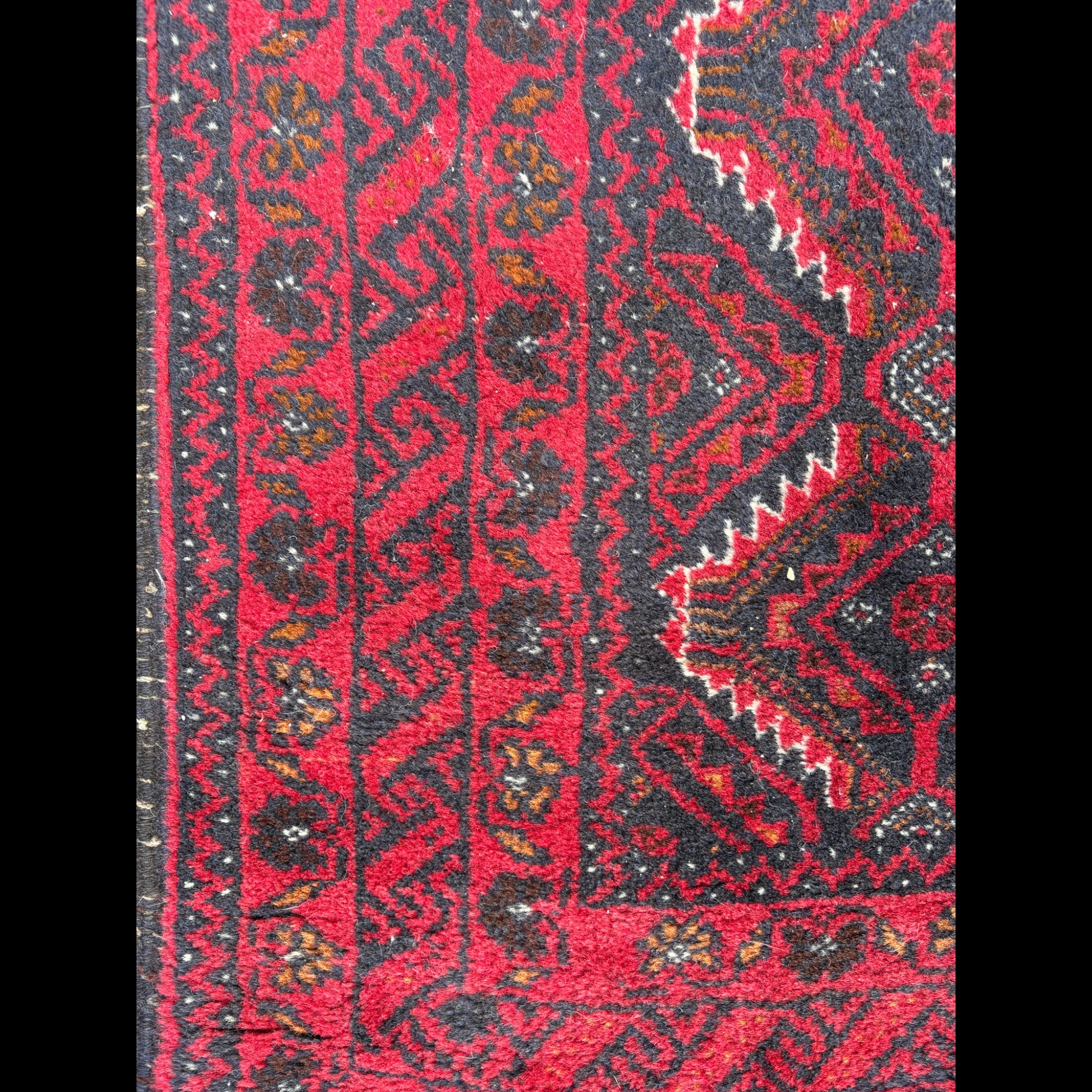 Rendered in a dramatic palette of cochineal reds, midnight blues, and ivory highlights, the piece features a classic double border design: the inner guard bearing rosette floret patterns and the outer border adorned with a distinctive wave-like leaf motif. The spontaneous yet harmonious asymmetry of the motifs, typical of Baluch weaving, reflects the intuitive artistry of its creator, likely a tribal weaver from the Mashhad or Herat region.
