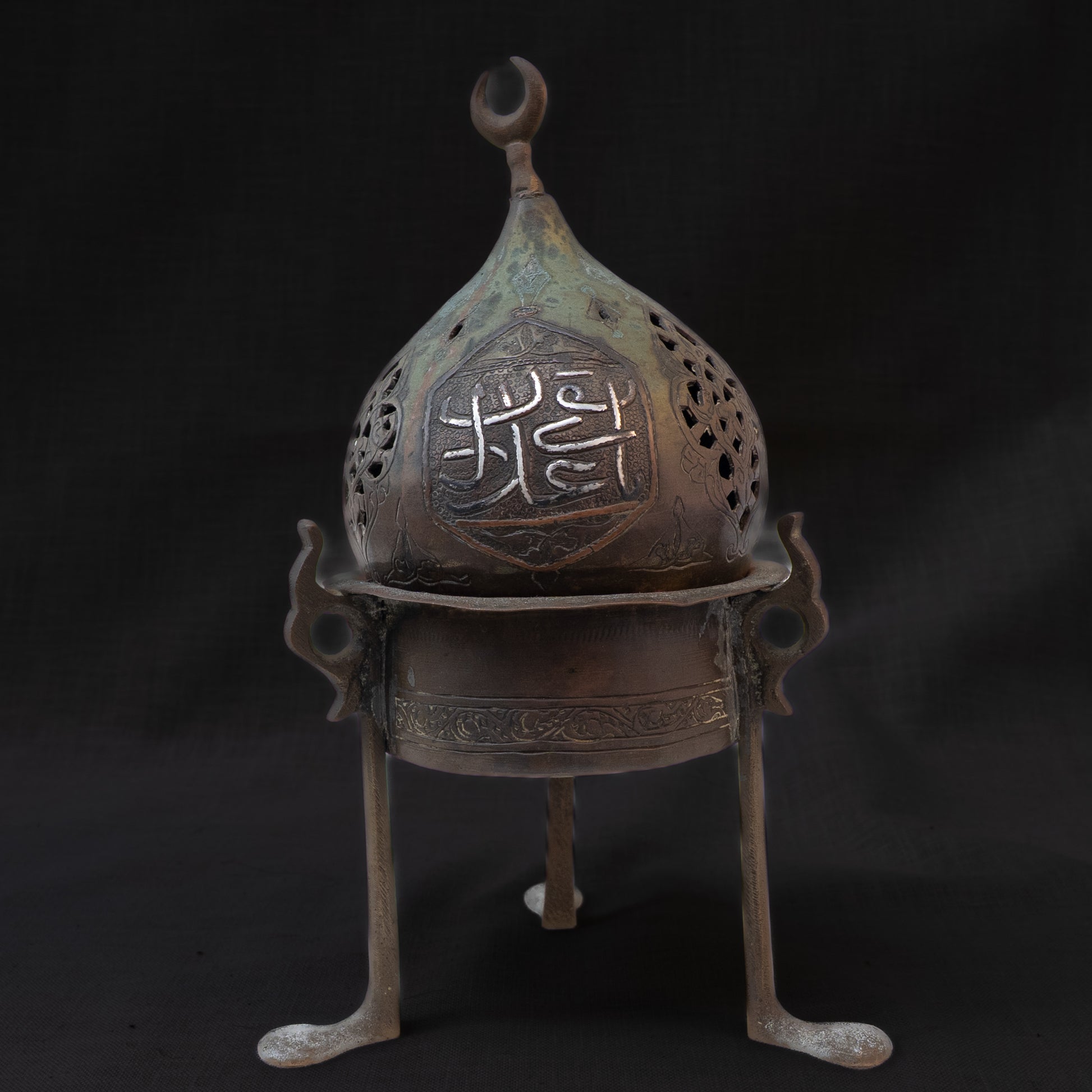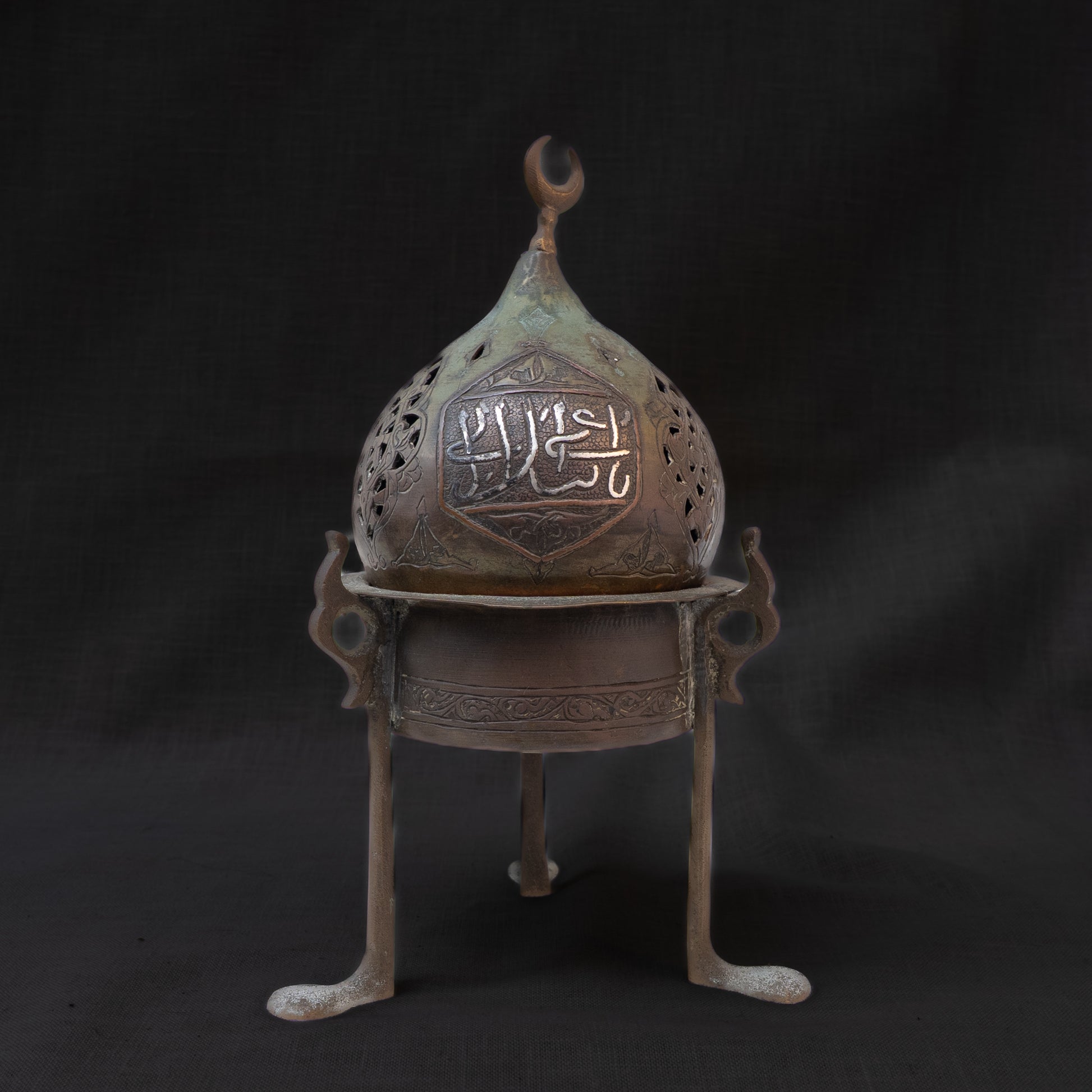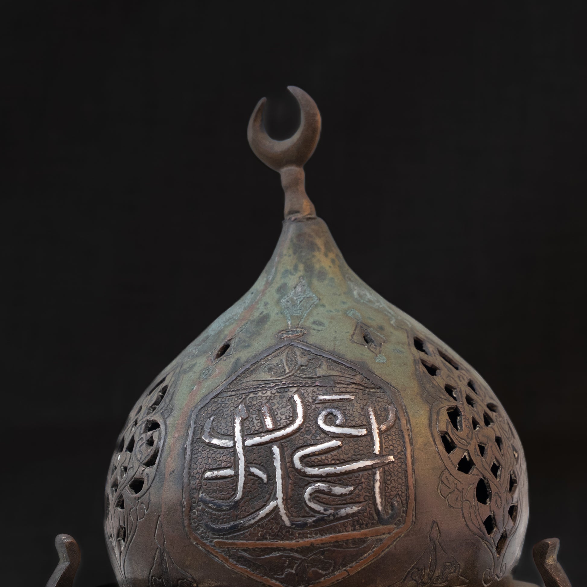 A rare and architecturally inspired Cairoware incense burner, Egypt, late 19th to early 20th century, cast in brass with inlaid and incised silver and copper ornamentation. The domed lid, pierced with crescent and star-shaped apertures, mimics the silhouette of an Ottoman-style mosque and is topped with an Islamic crescent finial. The cylindrical base rests on three delicately curved tripod legs and is encircled by intricate calligraphic panels in naskh script. The entire form serves as both a devotional object and a decorative sculpture—allowing fragrant smoke to rise like a prayer, evoking the multisensory experience of Islamic interiors.