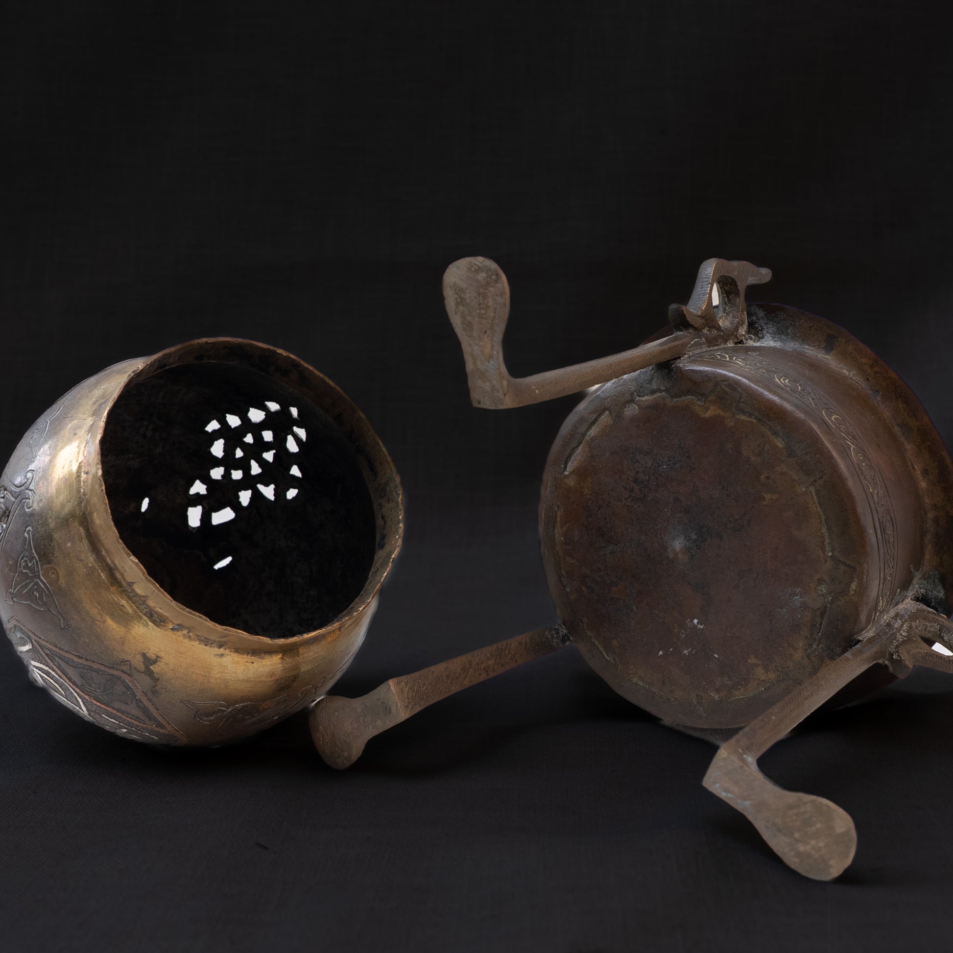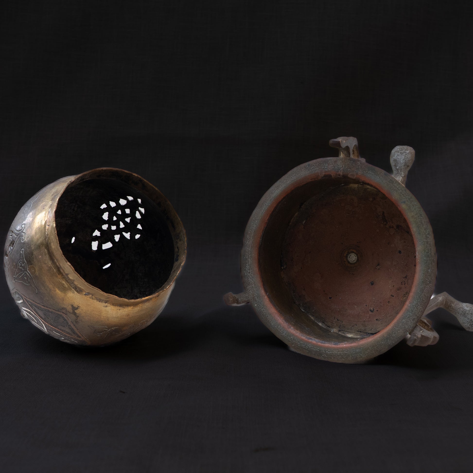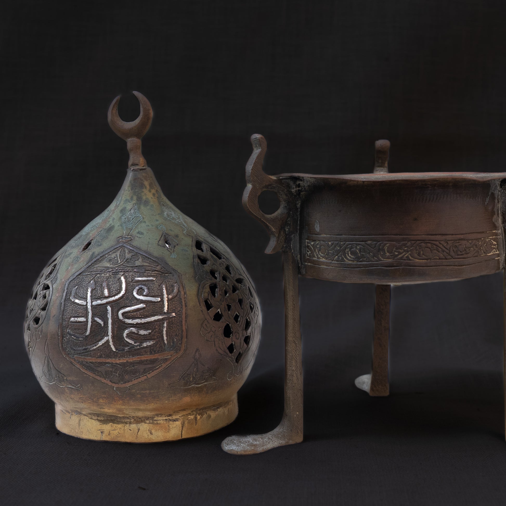 A rare and architecturally inspired Cairoware incense burner, Egypt, late 19th to early 20th century, cast in brass with inlaid and incised silver and copper ornamentation. The domed lid, pierced with crescent and star-shaped apertures, mimics the silhouette of an Ottoman-style mosque and is topped with an Islamic crescent finial. The cylindrical base rests on three delicately curved tripod legs and is encircled by intricate calligraphic panels in naskh script. The entire form serves as both a devotional object and a decorative sculpture—allowing fragrant smoke to rise like a prayer, evoking the multisensory experience of Islamic interiors.