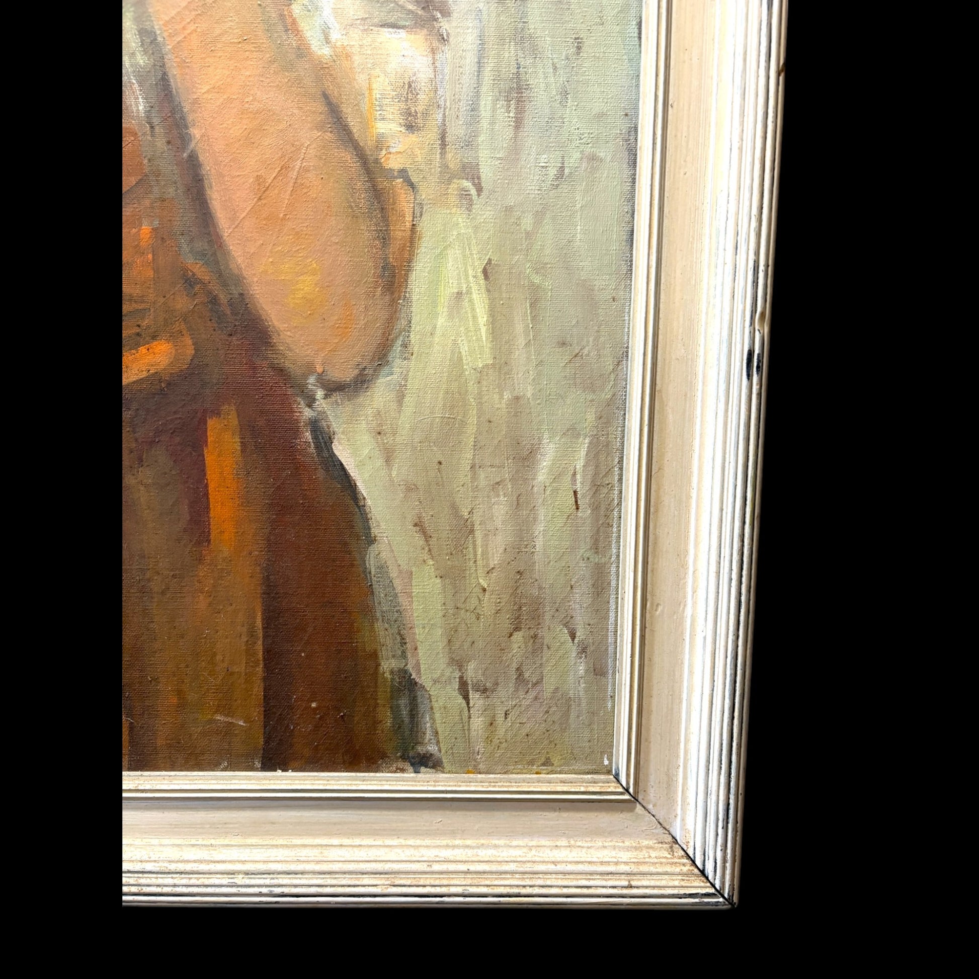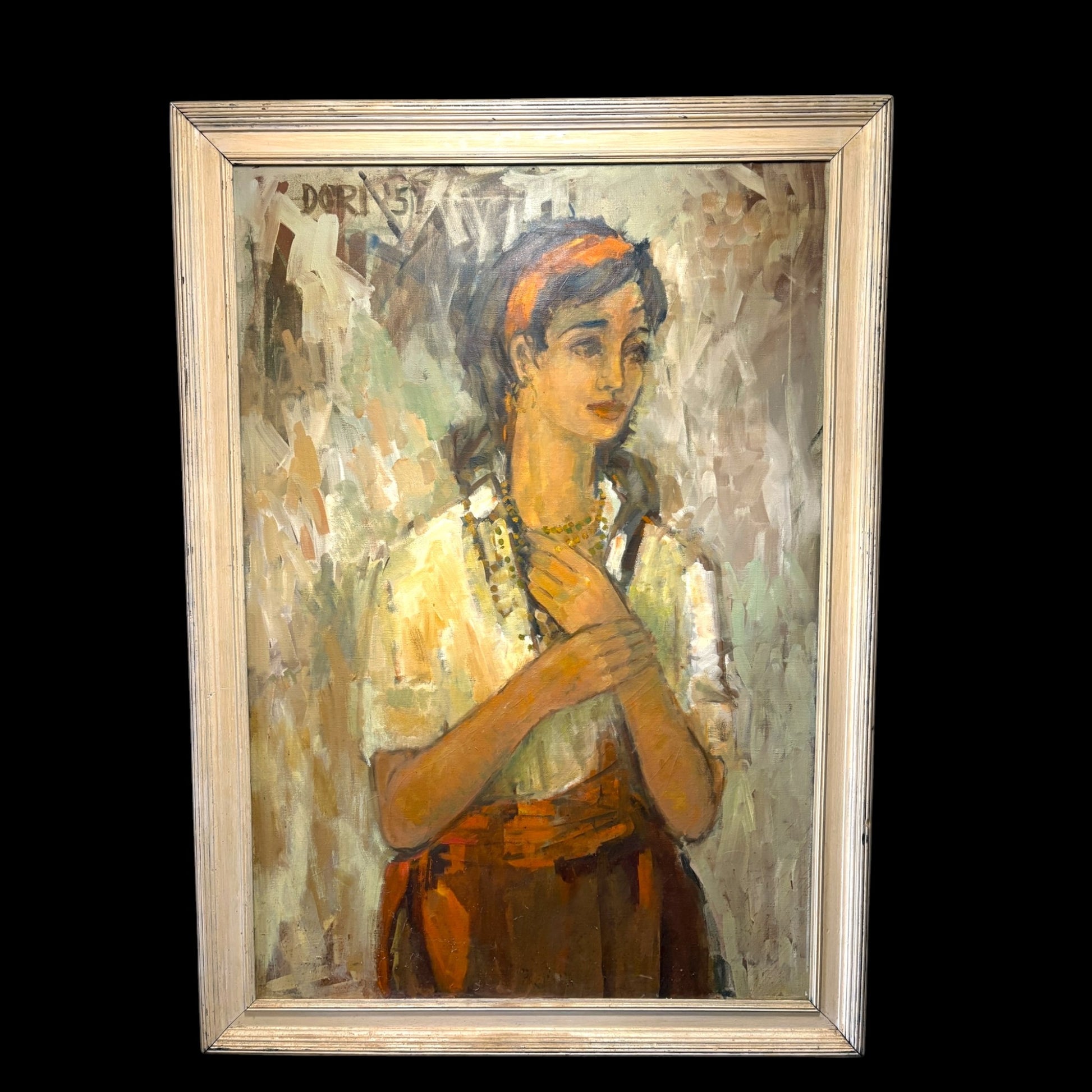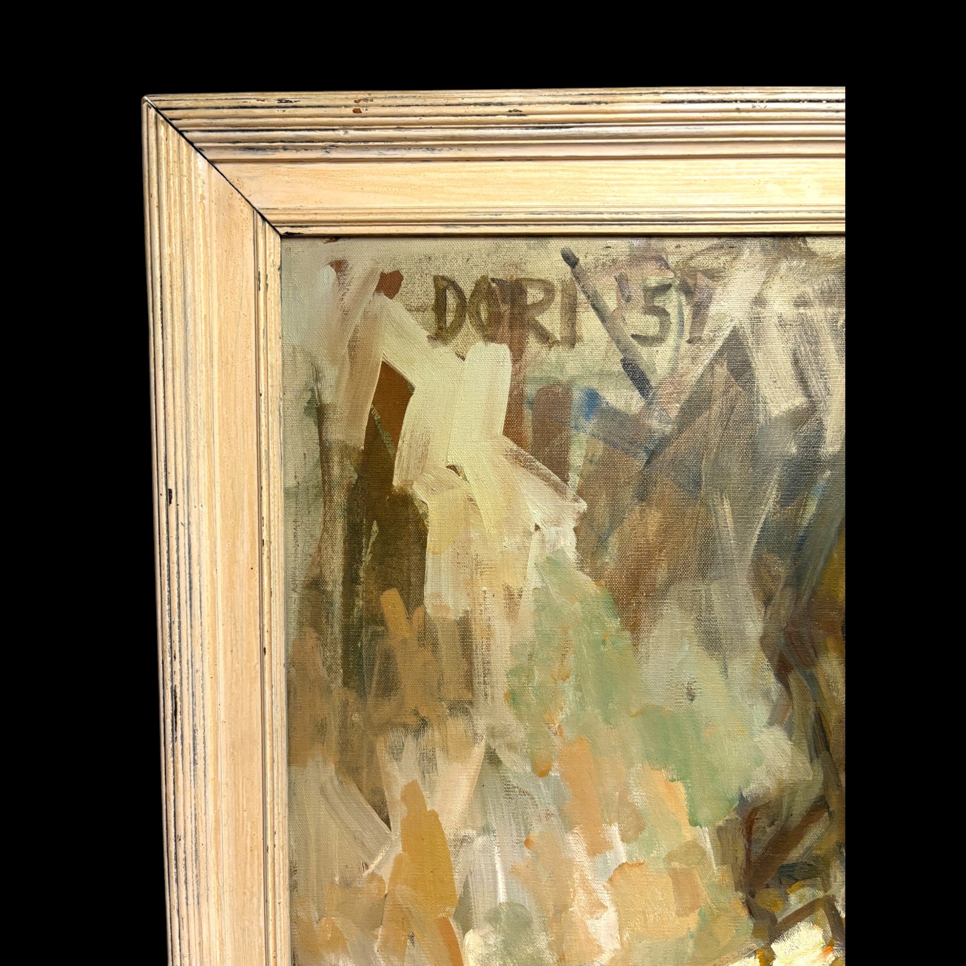 Dori Starkey, Self Portrait, 1957 — Painted while still in high school, this early self-portrait by San Diego artist Dori Starkey offers a glimpse into the quiet confidence and creative spirit that would shape a remarkable life. With a palette of warm earth tones and expressive brushwork, Dori captures herself mid-thought — poised, perceptive, and full of promise. Her delicate features, gently clasped hands, and subtle smile speak to both vulnerability and strength, set against an abstracted backdrop that frames her presence with painterly energy. Born in 1935 and raised in Hillcrest, Dori pursued art with passion and depth, studying under Phil Dike and Millard Sheets at Scripps College before continuing at Otis Art Institute and in Mexico City. She later became a beloved figure in the Southern California arts community — exhibiting widely, founding the Rancho Santa Fe Art Guild, and operating a gallery of her own. This self-portrait, painted in 1957 and signed simply “Dori,” is a rare and intimate record of a young artist at the threshold of her journey — a tribute to her enduring artistry and her San Diego roots.