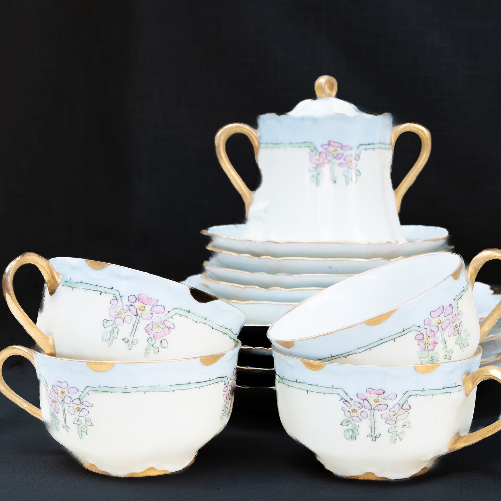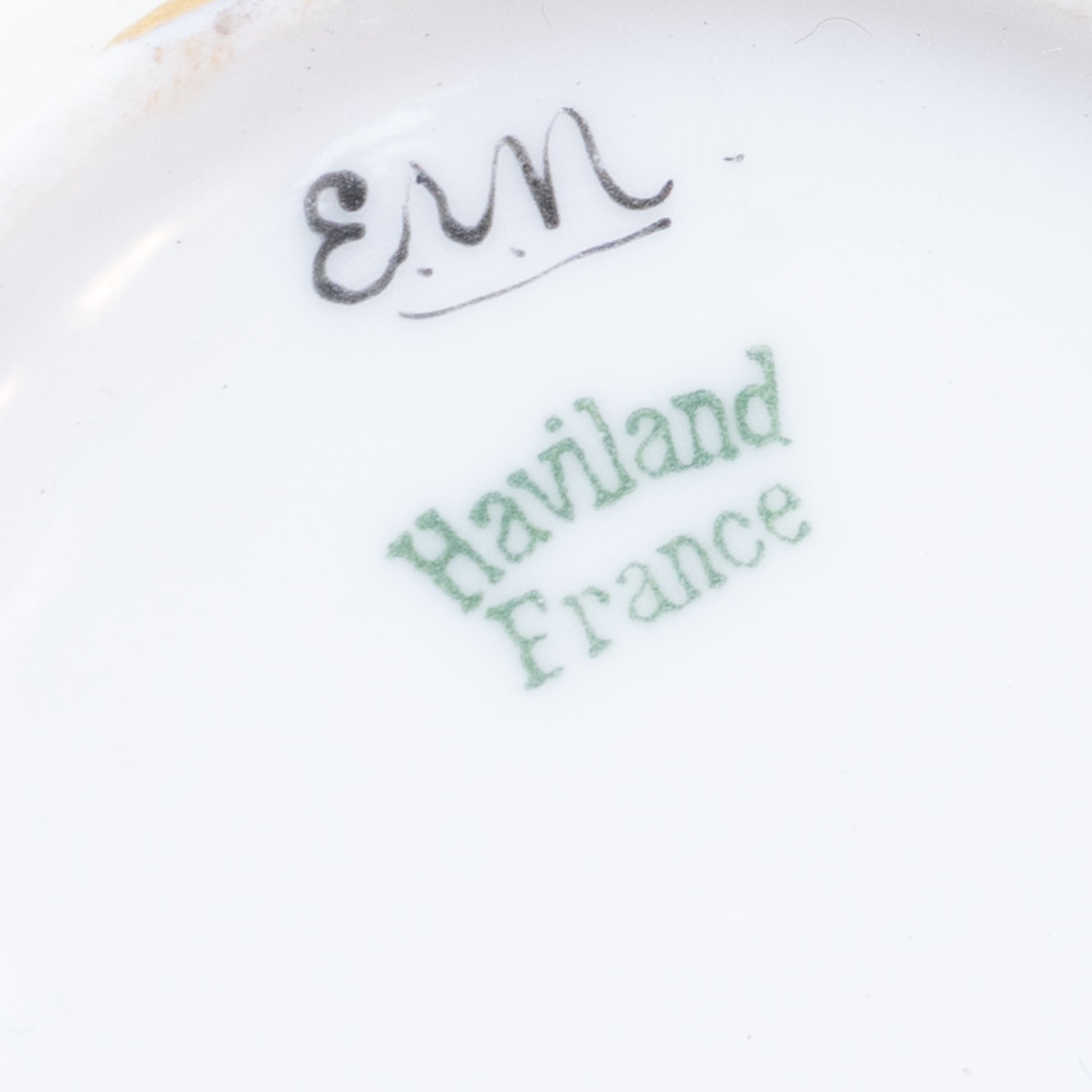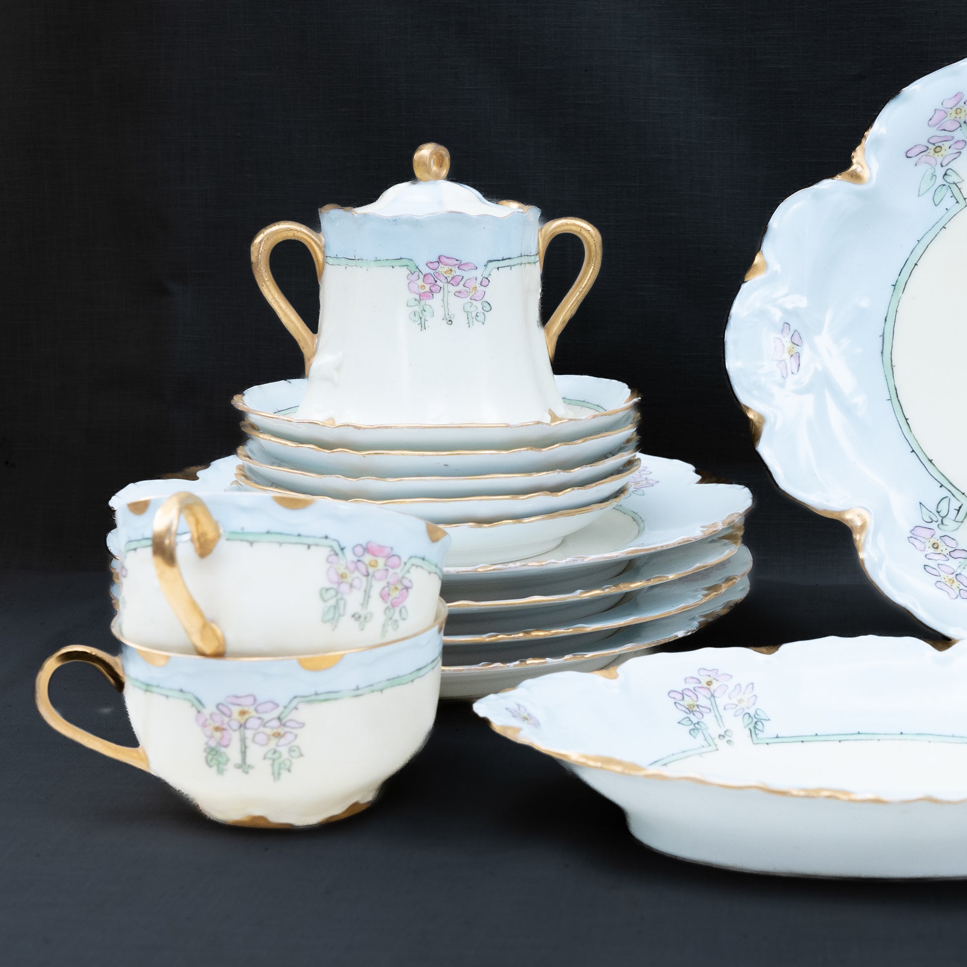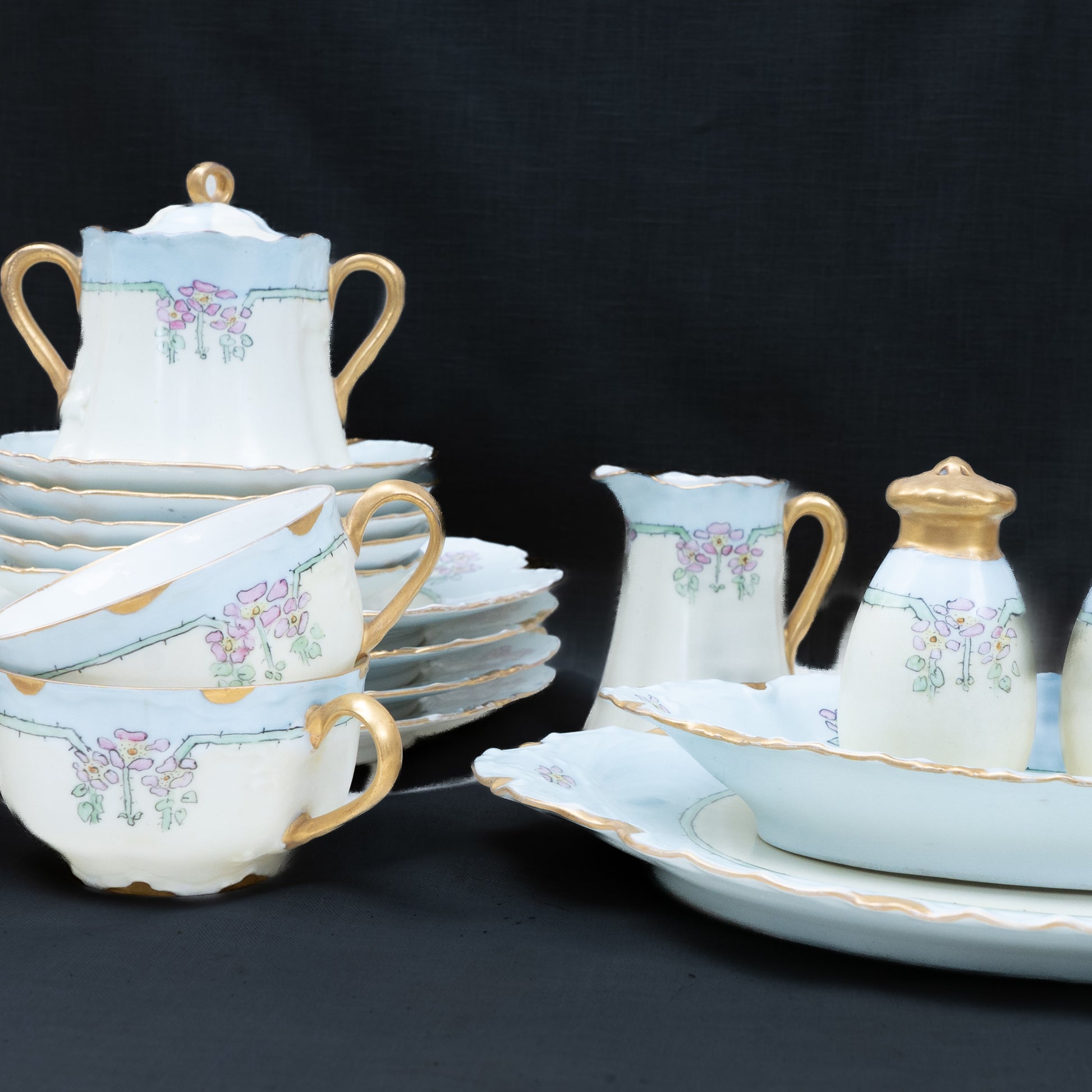 A charming 19-piece French porcelain breakfast service by Haviland & Co. Limoges, dating from 1894 to 1931, featuring a delightfully naïve hand-painted poppy motif in soft coral red, light blue, blush pink, and gilded accents. This early 20th-century ensemble includes four breakfast plates, four teacups with matching saucers, two oval serving platters, a lidded sugar jar, a creamer, and a pair of salt and pepper shakers—all rendered in luminous white porcelain with delicate brushwork and restrained gold detailing. The whimsical floral design, paired with the refined forms and subtle palette, evokes a sense of quiet morning rituals and rustic elegance, exemplifying the enduring charm of Haviland’s Limoges production at the turn of the century. See photos for condition.