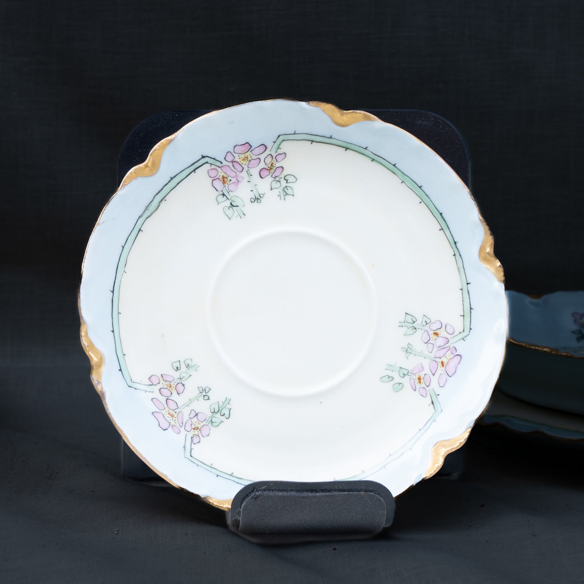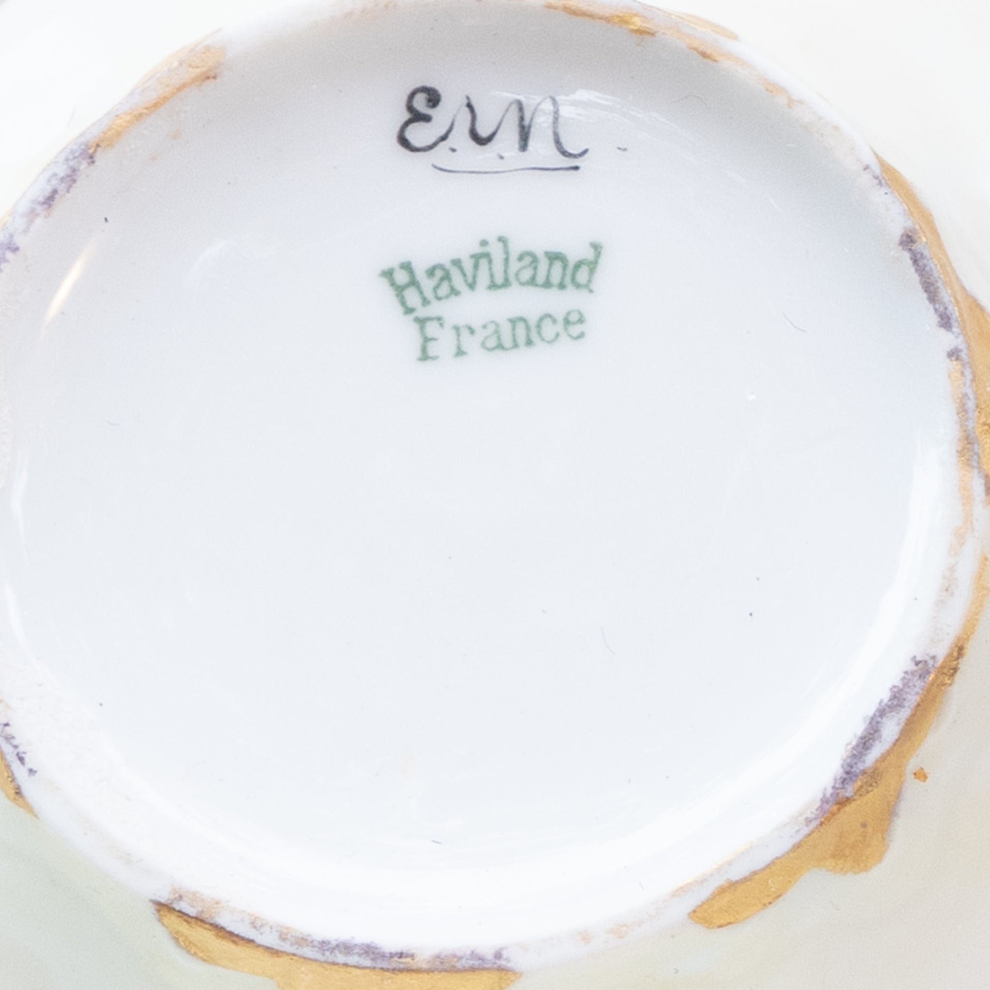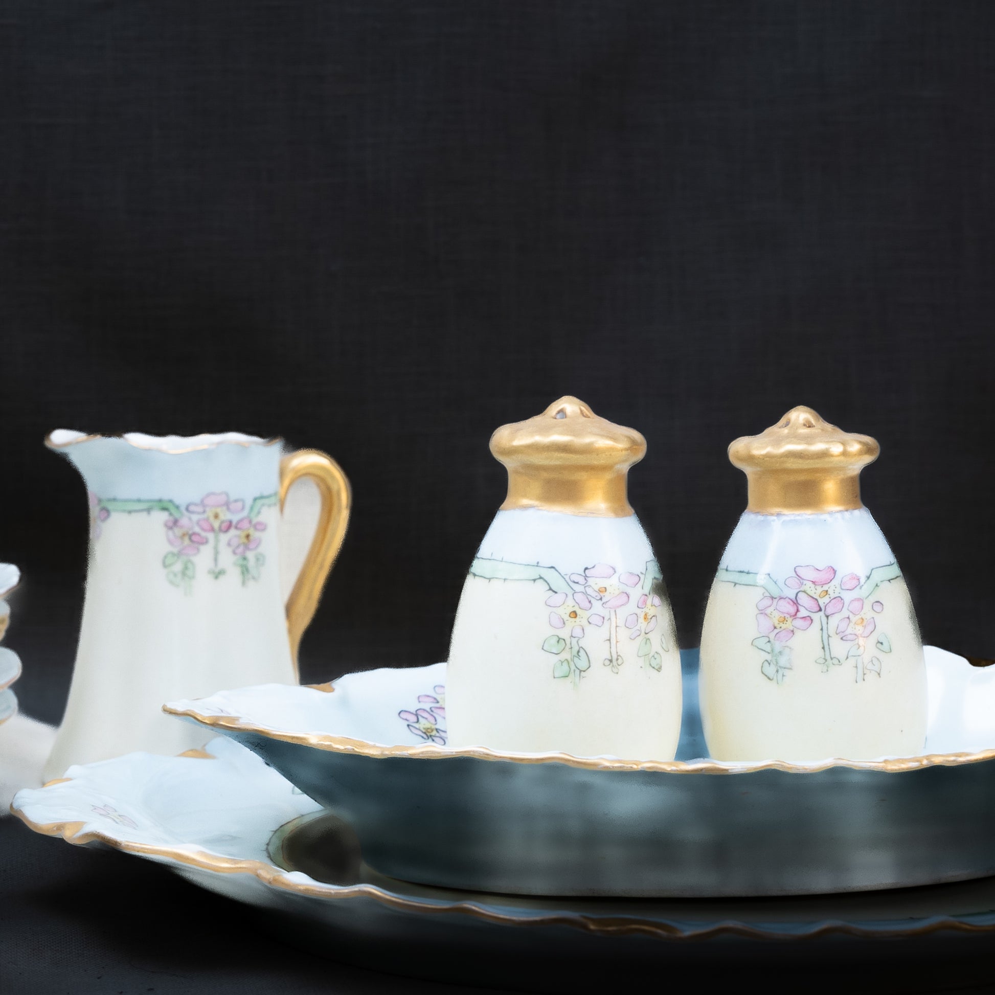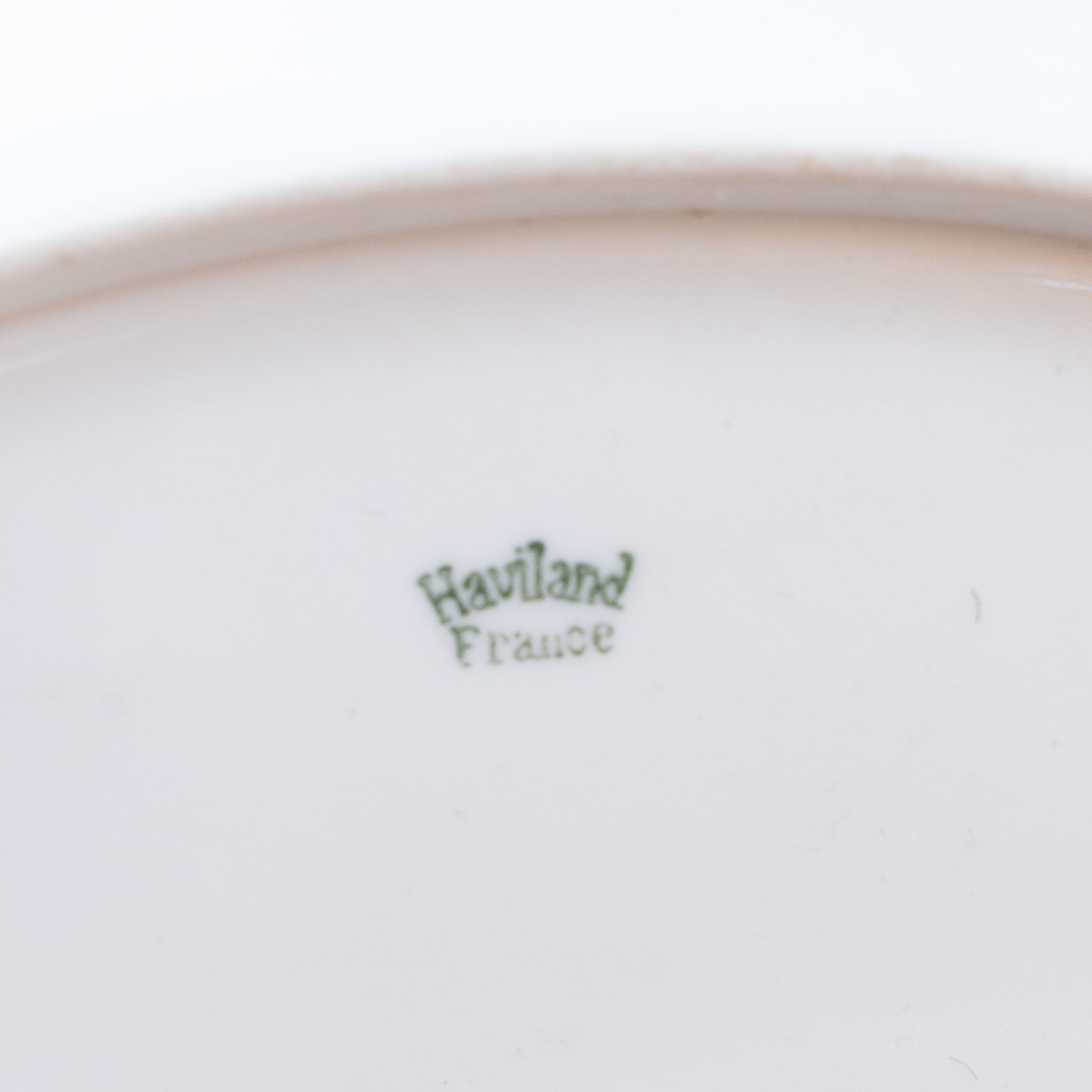 A charming 19-piece French porcelain breakfast service by Haviland & Co. Limoges, dating from 1894 to 1931, featuring a delightfully naïve hand-painted poppy motif in soft coral red, light blue, blush pink, and gilded accents. This early 20th-century ensemble includes four breakfast plates, four teacups with matching saucers, two oval serving platters, a lidded sugar jar, a creamer, and a pair of salt and pepper shakers—all rendered in luminous white porcelain with delicate brushwork and restrained gold detailing. The whimsical floral design, paired with the refined forms and subtle palette, evokes a sense of quiet morning rituals and rustic elegance, exemplifying the enduring charm of Haviland’s Limoges production at the turn of the century. See photos for condition.