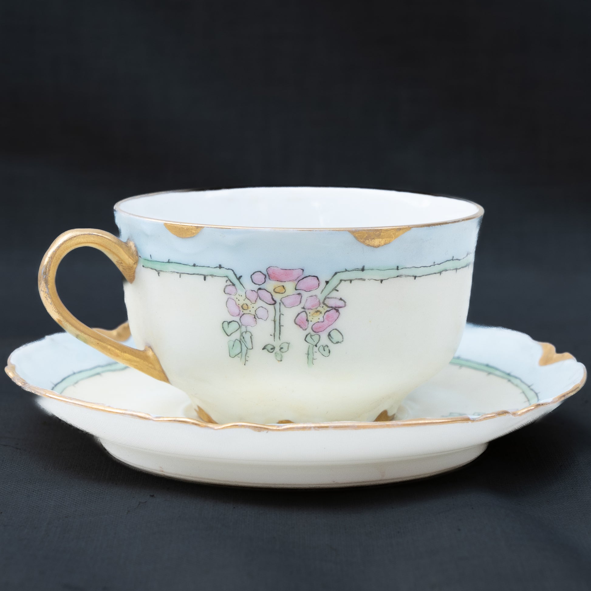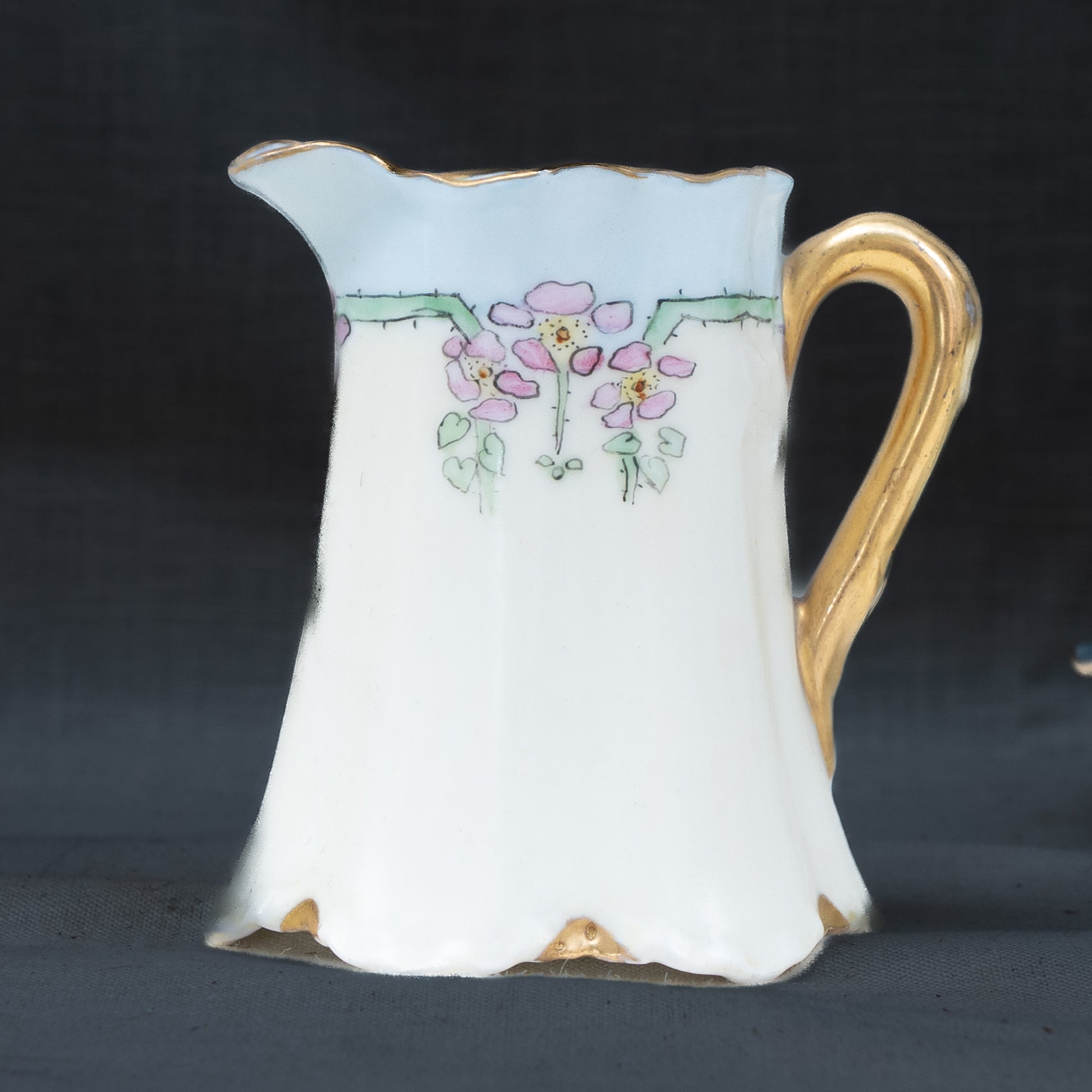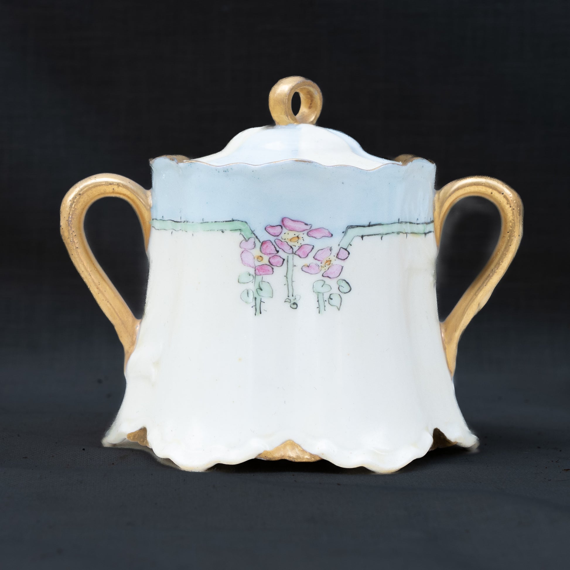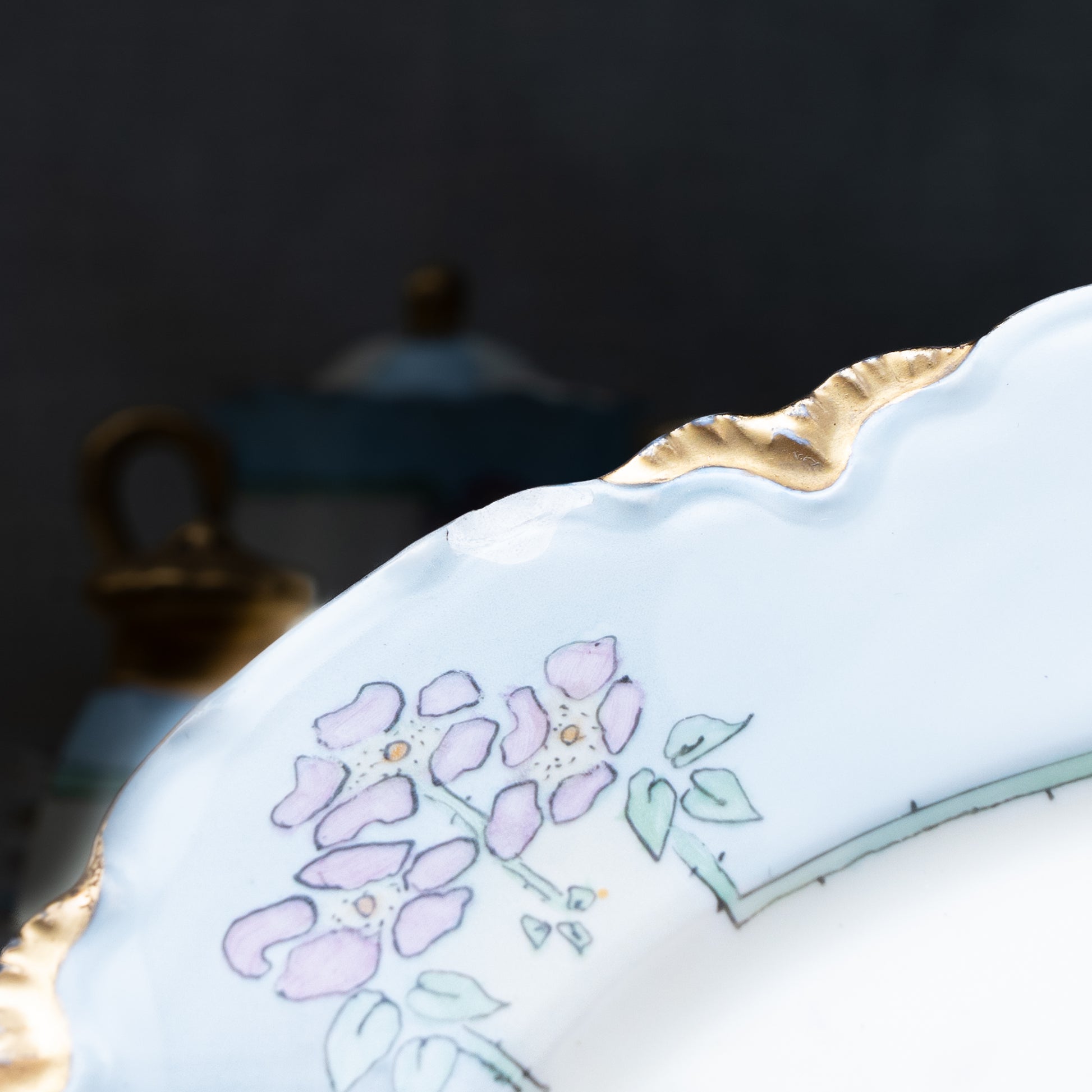 A charming 19-piece French porcelain breakfast service by Haviland & Co. Limoges, dating from 1894 to 1931, featuring a delightfully naïve hand-painted poppy motif in soft coral red, light blue, blush pink, and gilded accents. This early 20th-century ensemble includes four breakfast plates, four teacups with matching saucers, two oval serving platters, a lidded sugar jar, a creamer, and a pair of salt and pepper shakers—all rendered in luminous white porcelain with delicate brushwork and restrained gold detailing. The whimsical floral design, paired with the refined forms and subtle palette, evokes a sense of quiet morning rituals and rustic elegance, exemplifying the enduring charm of Haviland’s Limoges production at the turn of the century. See photos for condition.