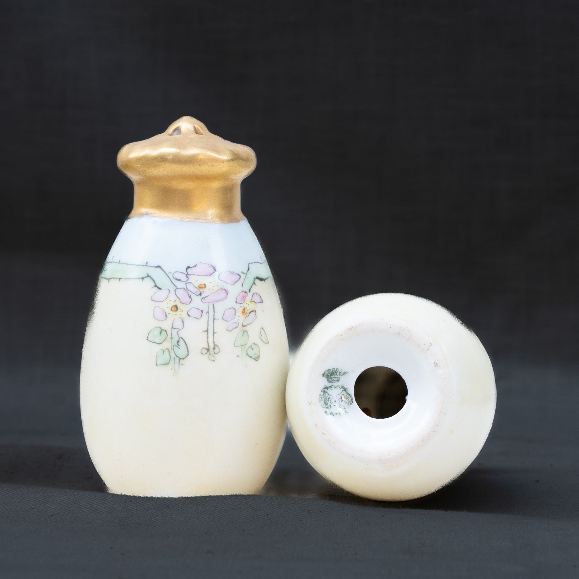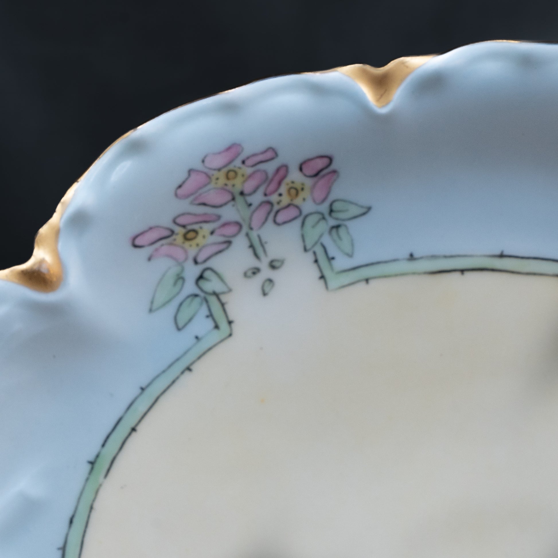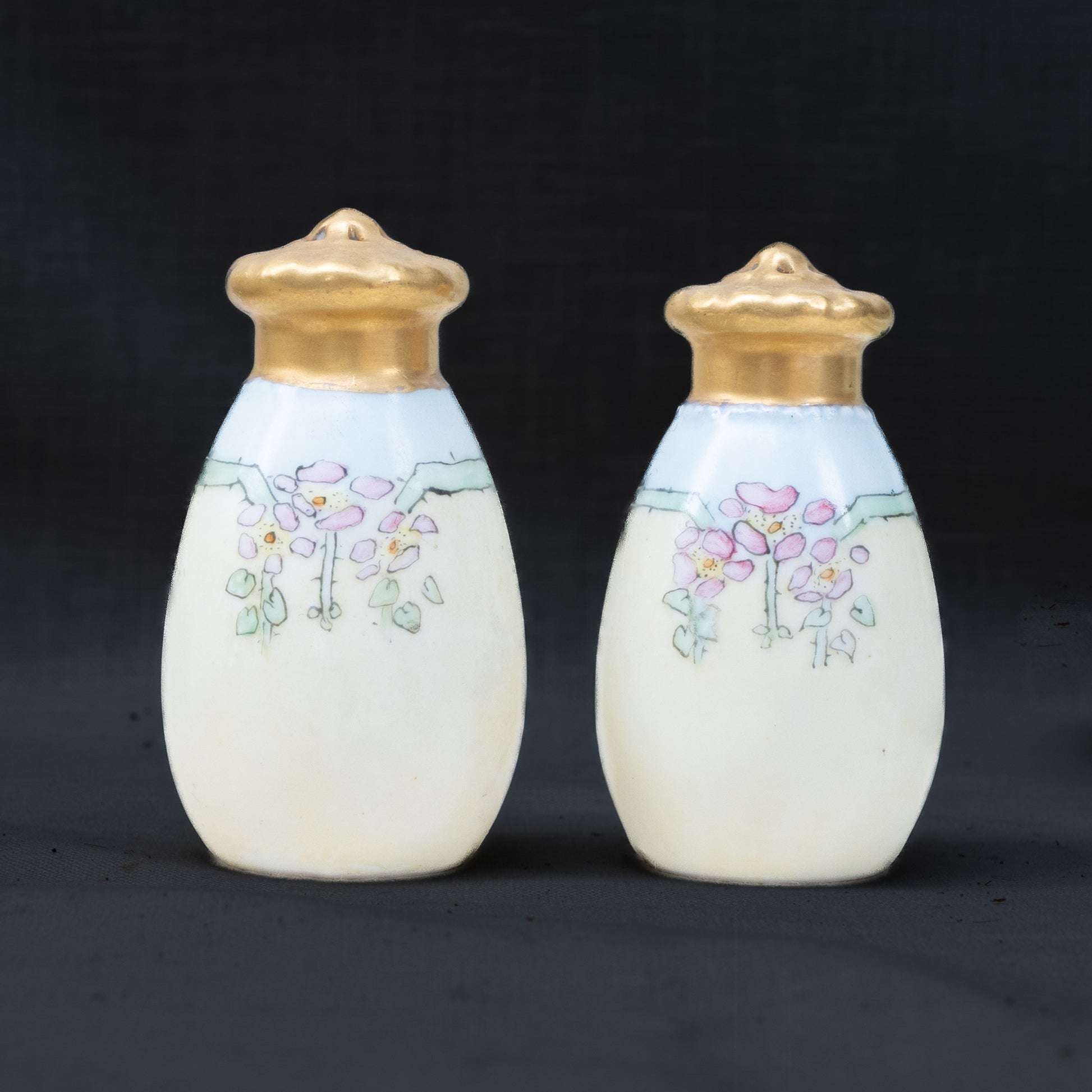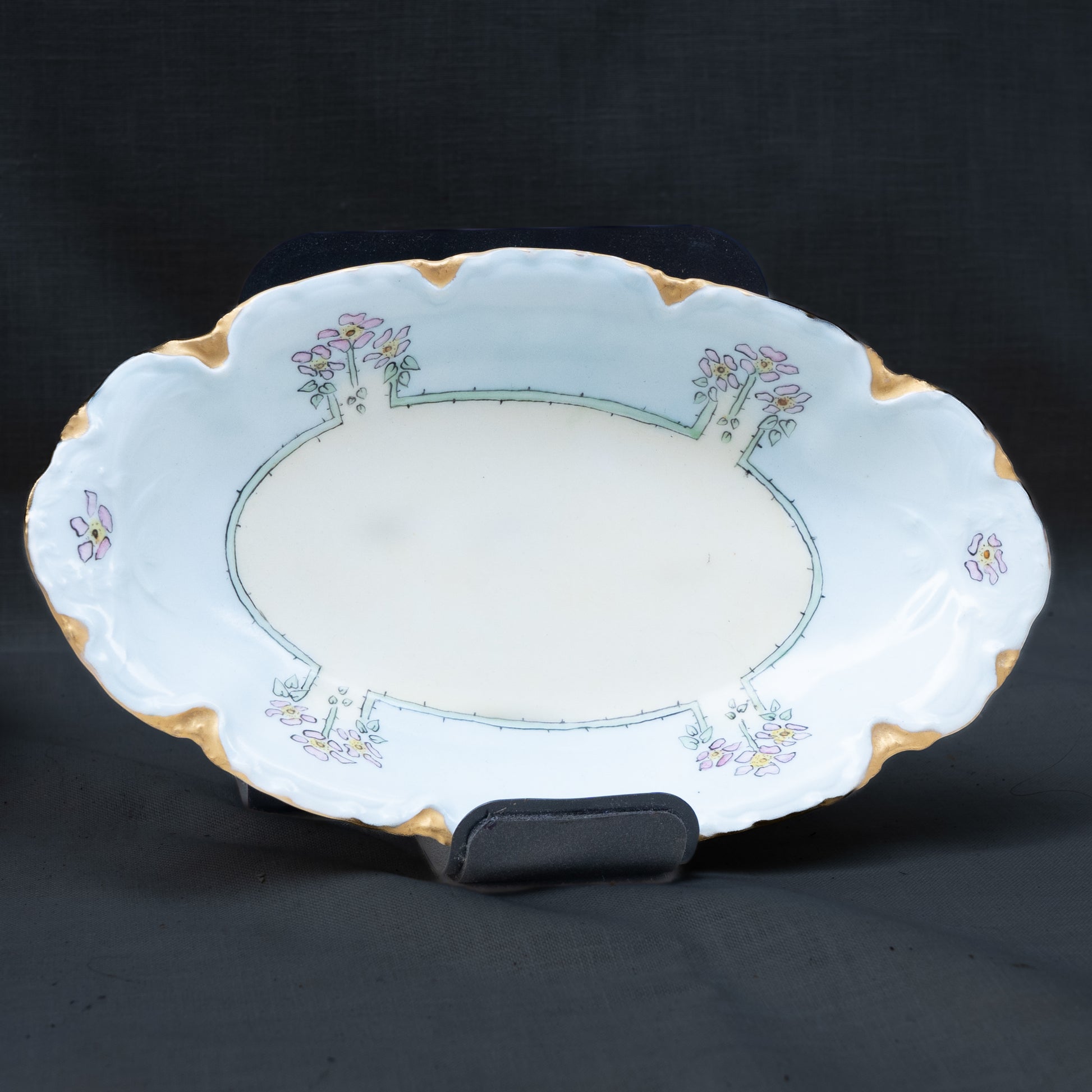 A charming 19-piece French porcelain breakfast service by Haviland & Co. Limoges, dating from 1894 to 1931, featuring a delightfully naïve hand-painted poppy motif in soft coral red, light blue, blush pink, and gilded accents. This early 20th-century ensemble includes four breakfast plates, four teacups with matching saucers, two oval serving platters, a lidded sugar jar, a creamer, and a pair of salt and pepper shakers—all rendered in luminous white porcelain with delicate brushwork and restrained gold detailing. The whimsical floral design, paired with the refined forms and subtle palette, evokes a sense of quiet morning rituals and rustic elegance, exemplifying the enduring charm of Haviland’s Limoges production at the turn of the century. See photos for condition.