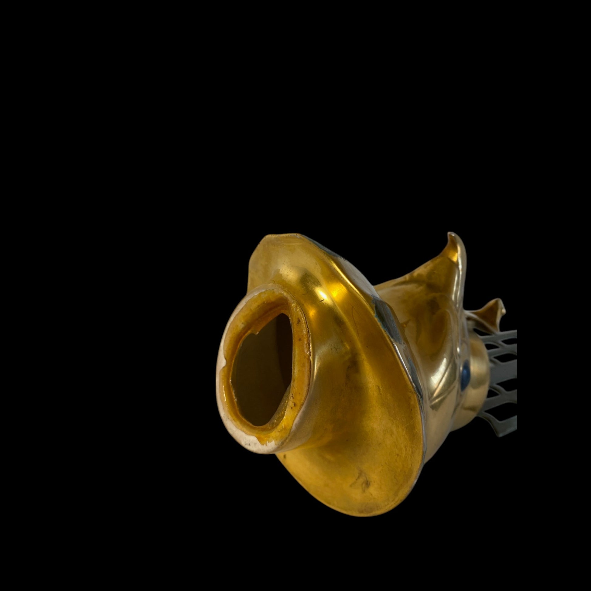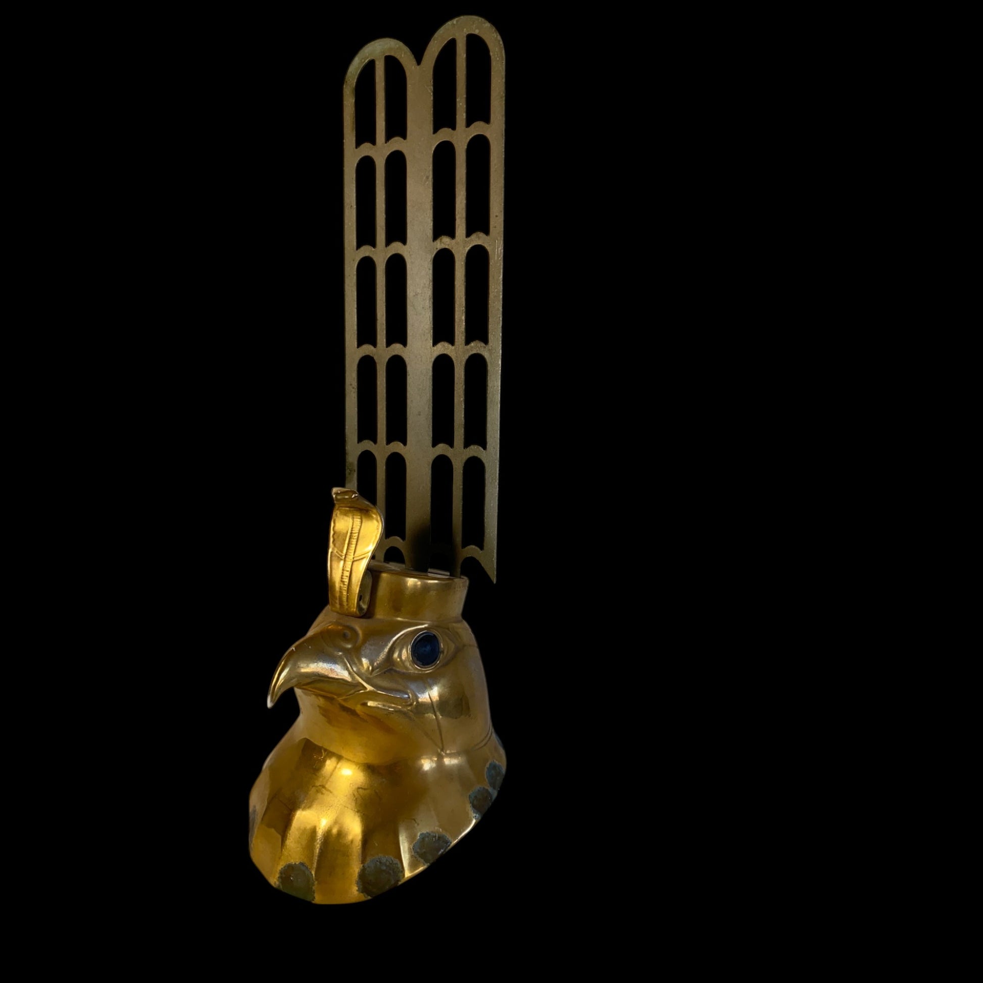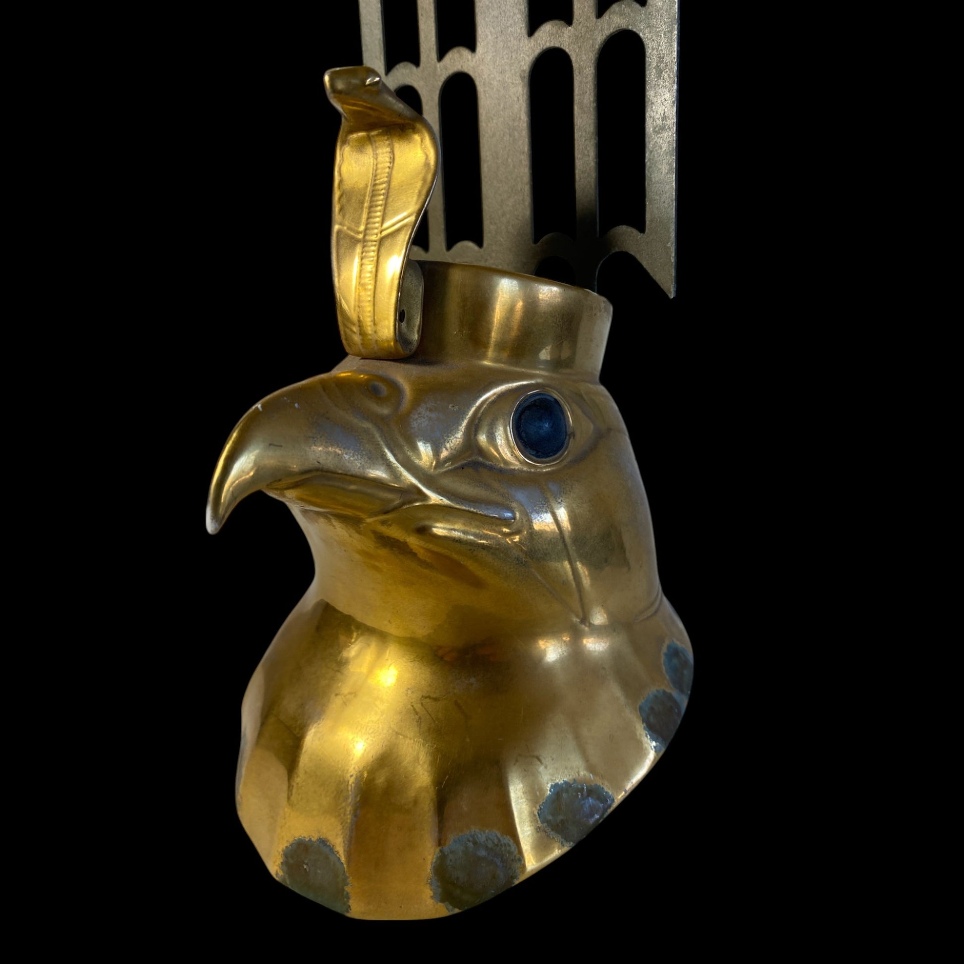 This is an Egyptian Revival Falcon head, perhaps a depiction of the sun god Ra. Made of Porcelain with a Brass Crown, this piece is unique and would add an Ancient touch to any interior. This object was propbably the lid of a jar but stands handsomely on its own. Found in San Diego, Ca.