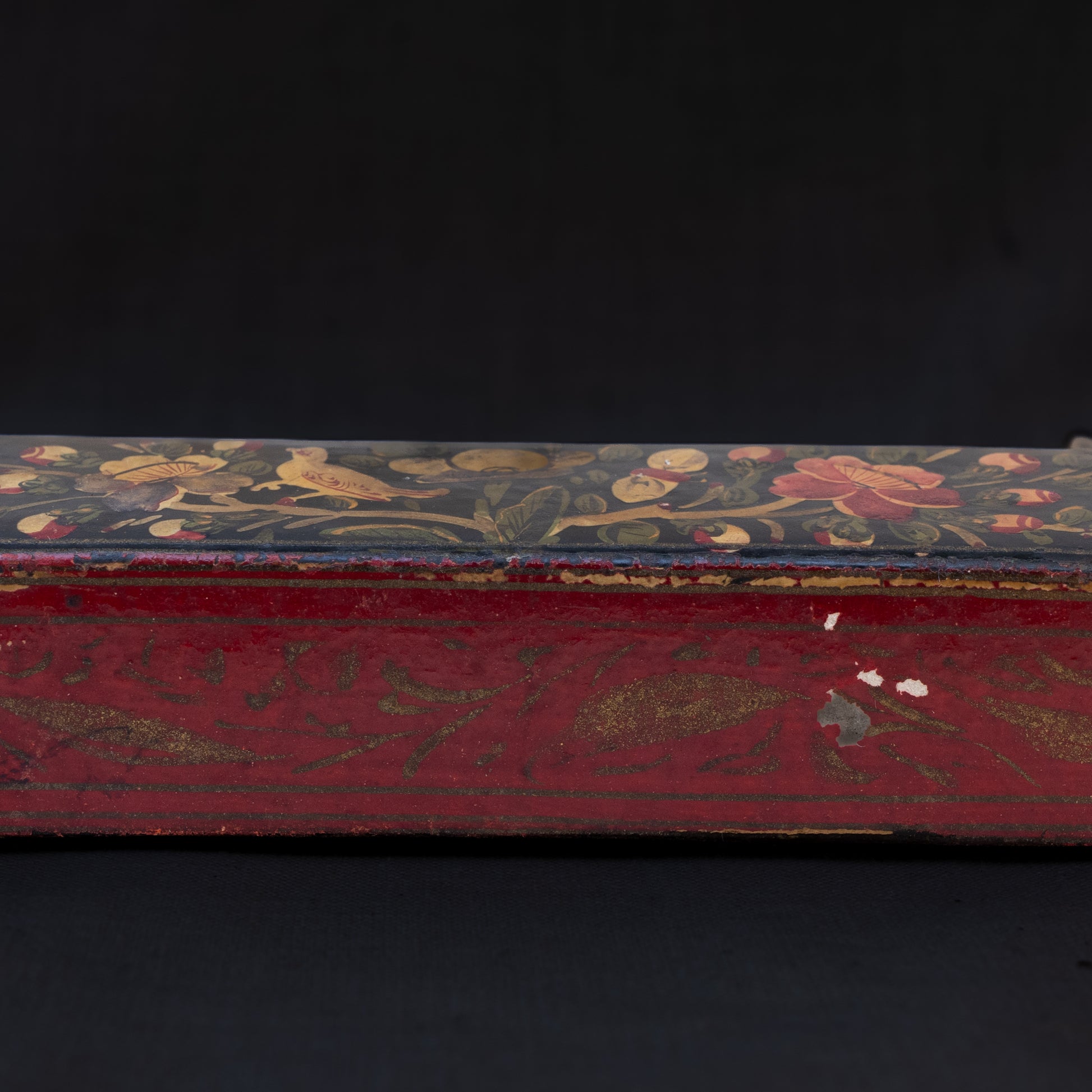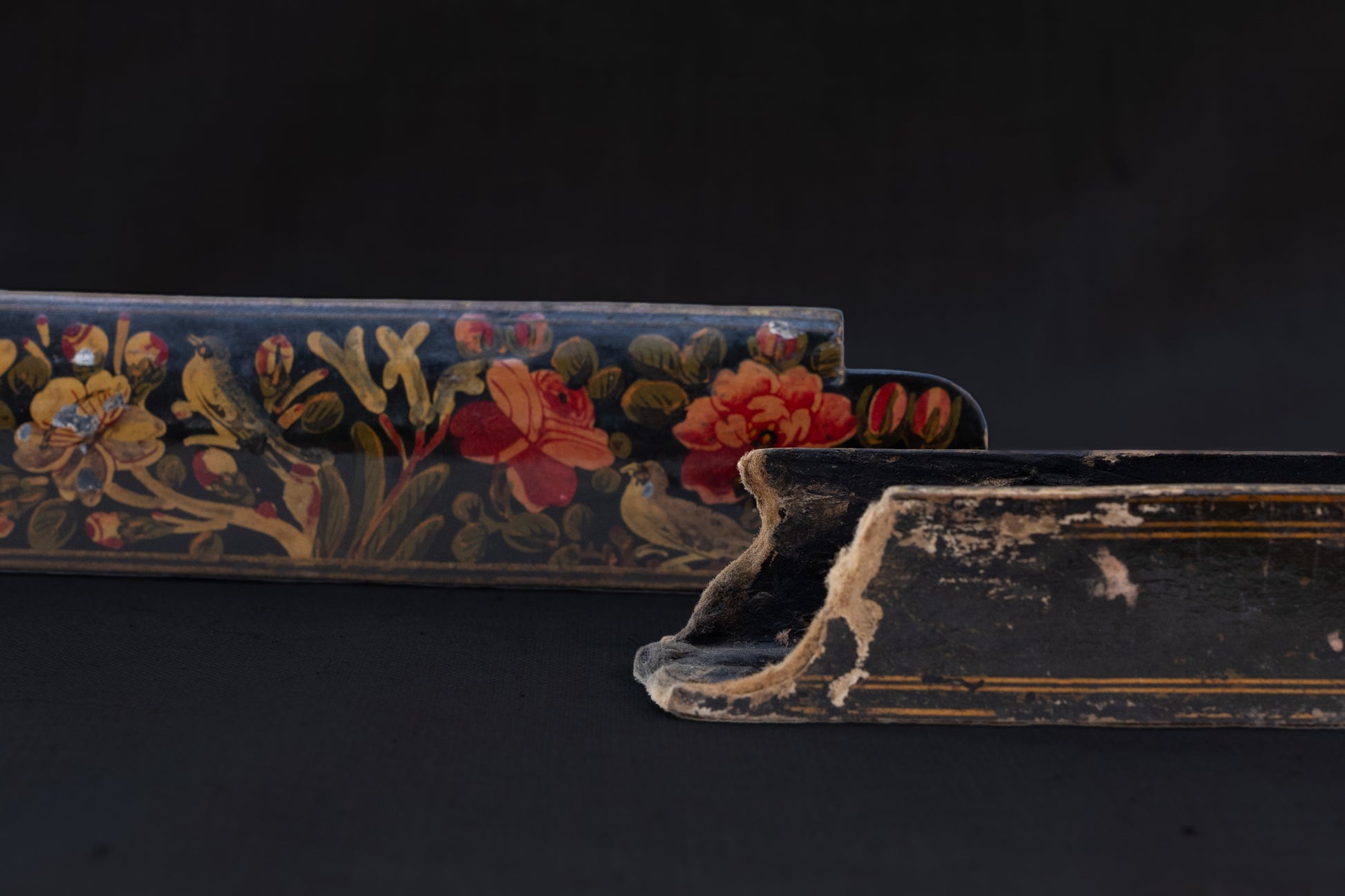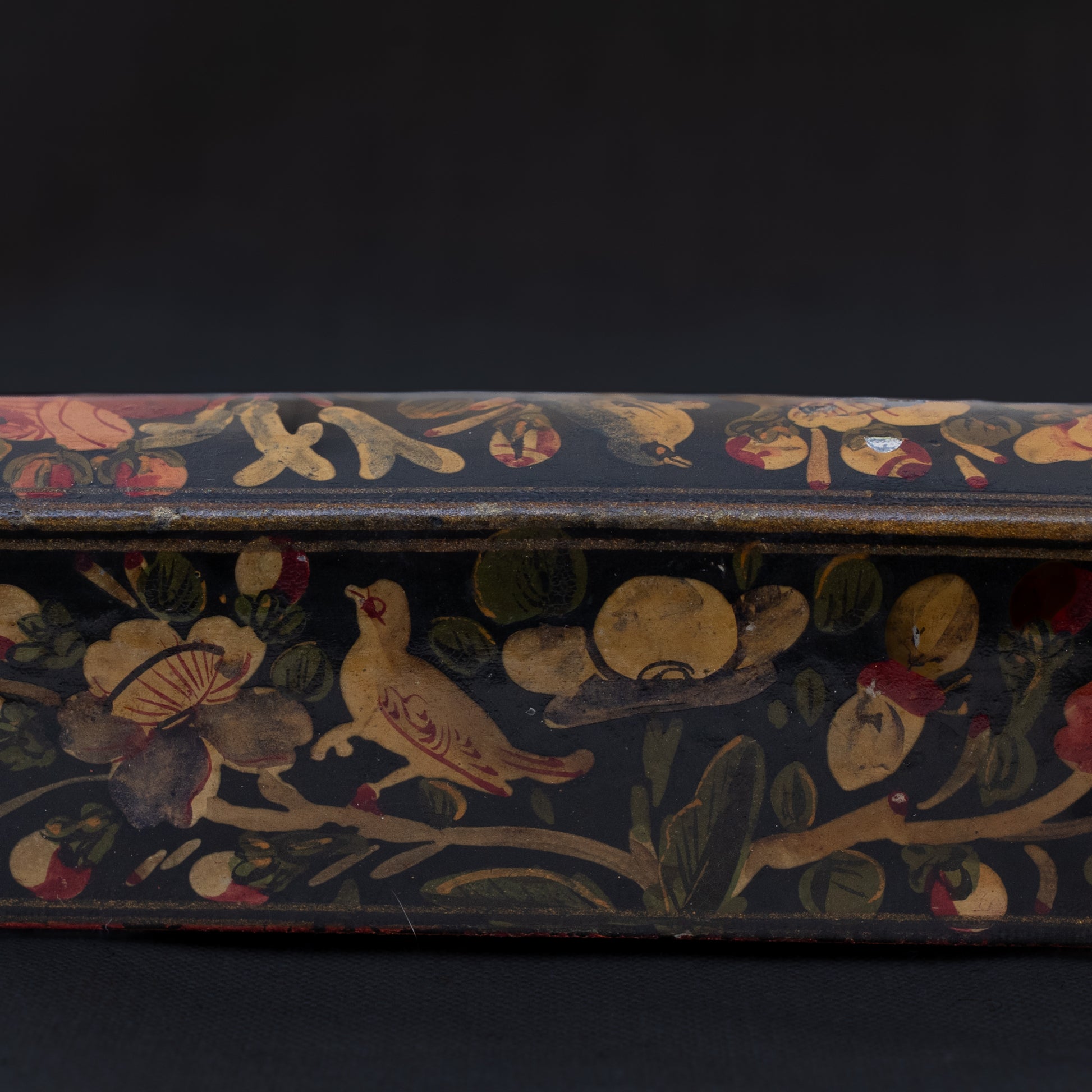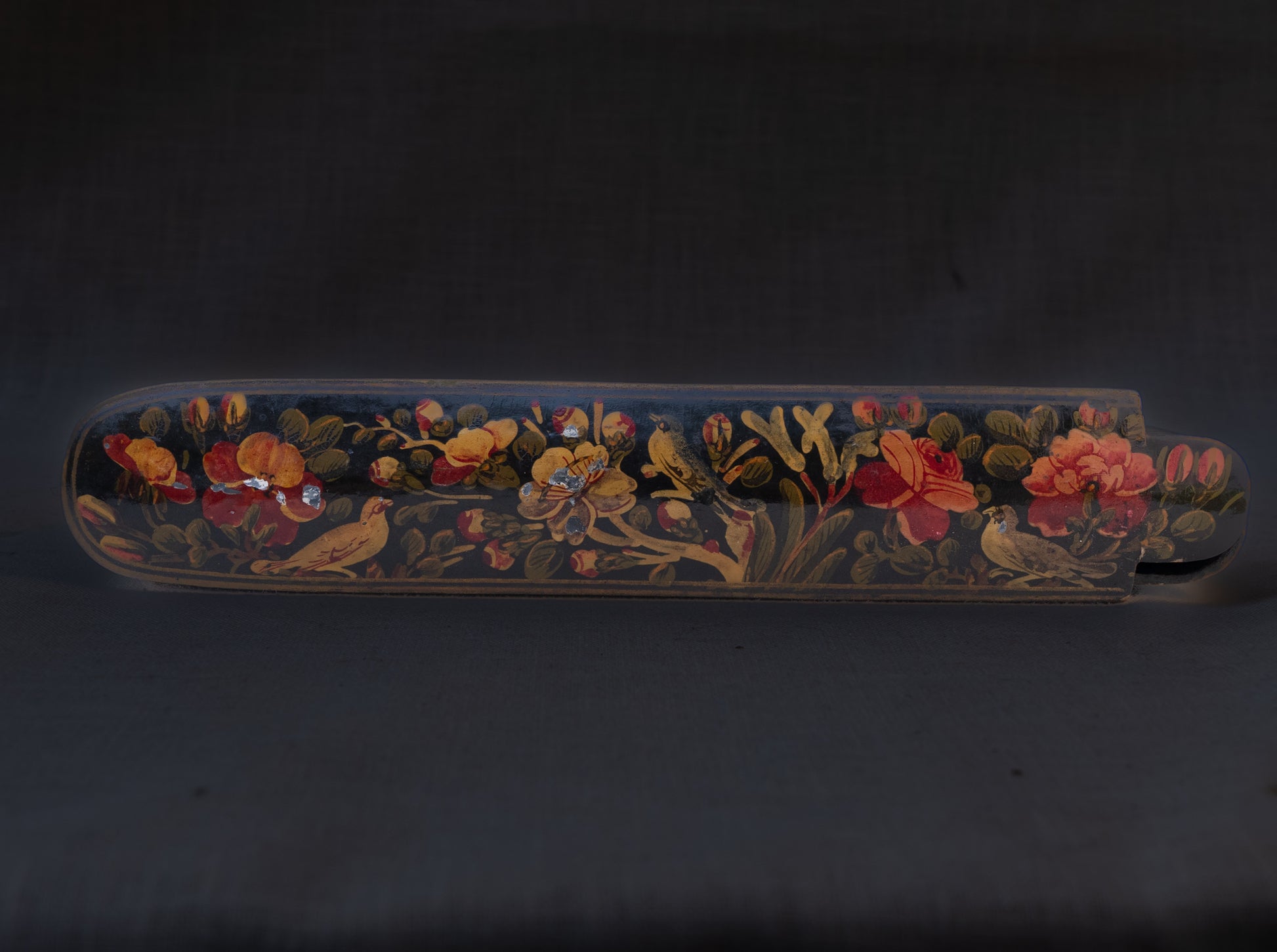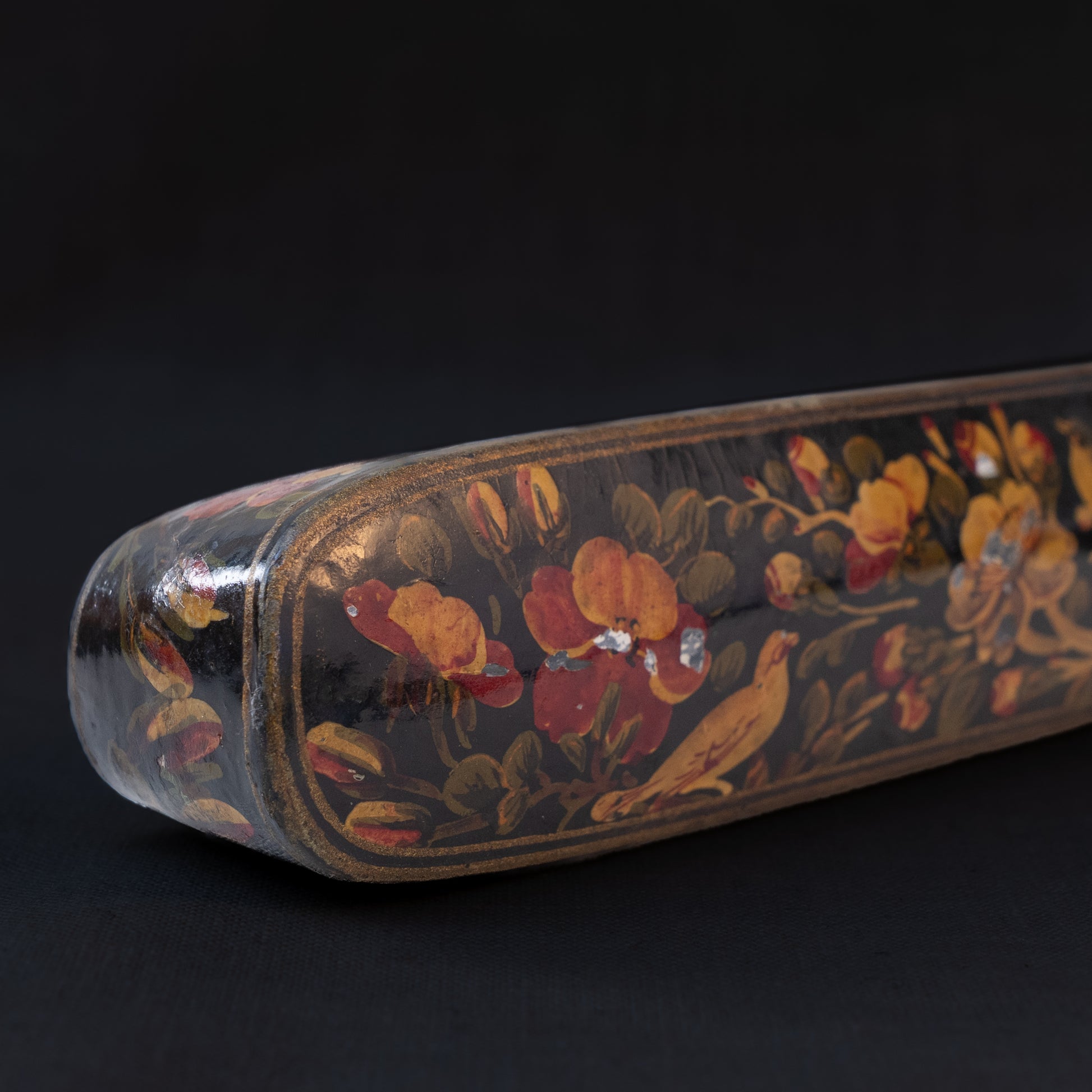 An elegant lacquered qalamdan (pen case), Persia, likely late 19th to early 20th century, masterfully hand-painted with a continuous floral tableau. The surface bursts with naturalistic blooms—roses, irises, and narcissus—set against a deep cobalt ground, their vivid pigments and delicate outlines speaking to the enduring Persian love of botanical ornament. Executed in fine lacquer over papier-mâché, the form is quintessential: gently curved edges, sliding inner tray, and black-lacquered base. While the qalamdan traditionally served as a scholar’s essential, housing reed pens and ink, its surface became a canvas for narrative, allegory, or decorative splendor. This example, free from figural elements, exemplifies refined restraint and rhythmic composition, drawing the viewer into an idealized garden—a golshan of timeless beauty.