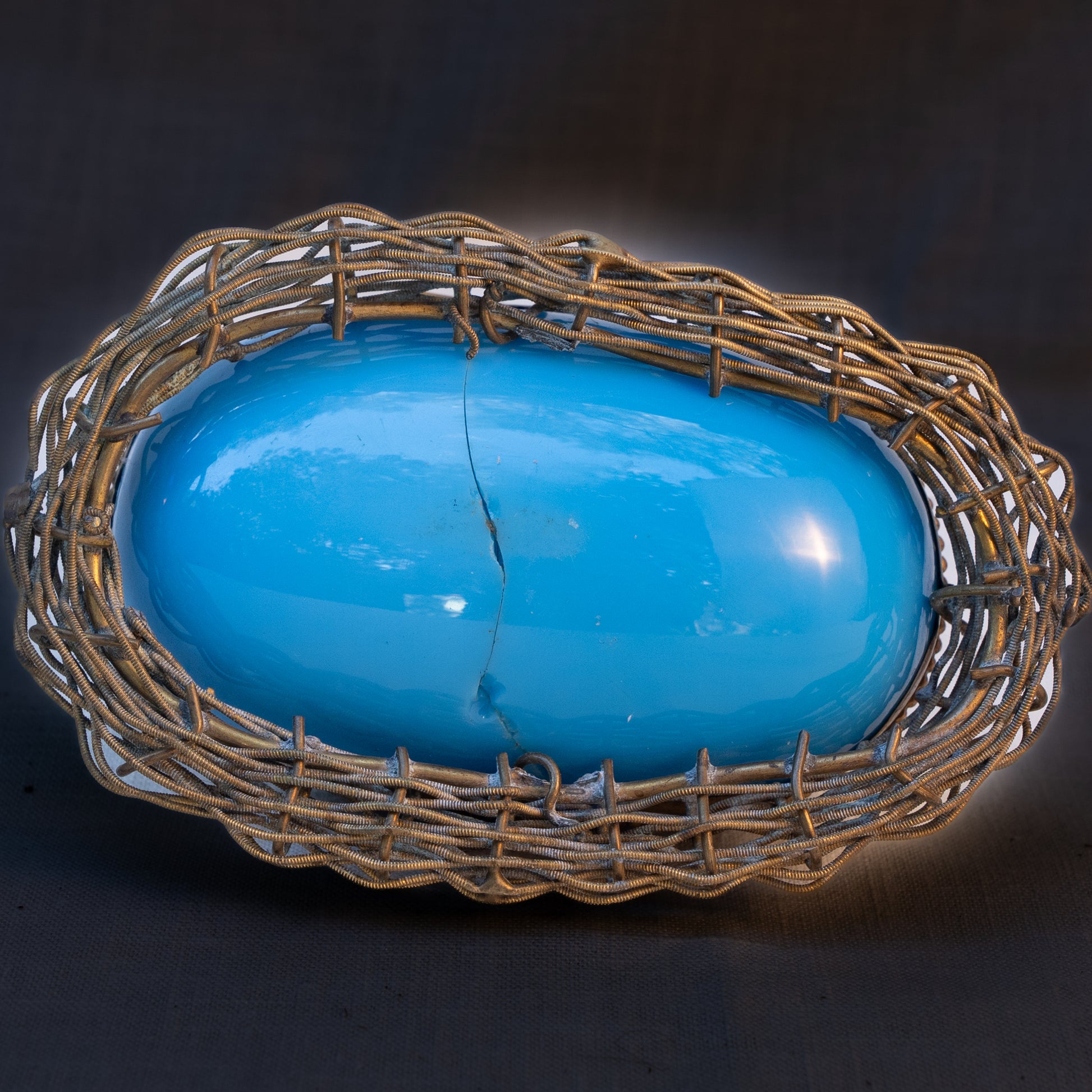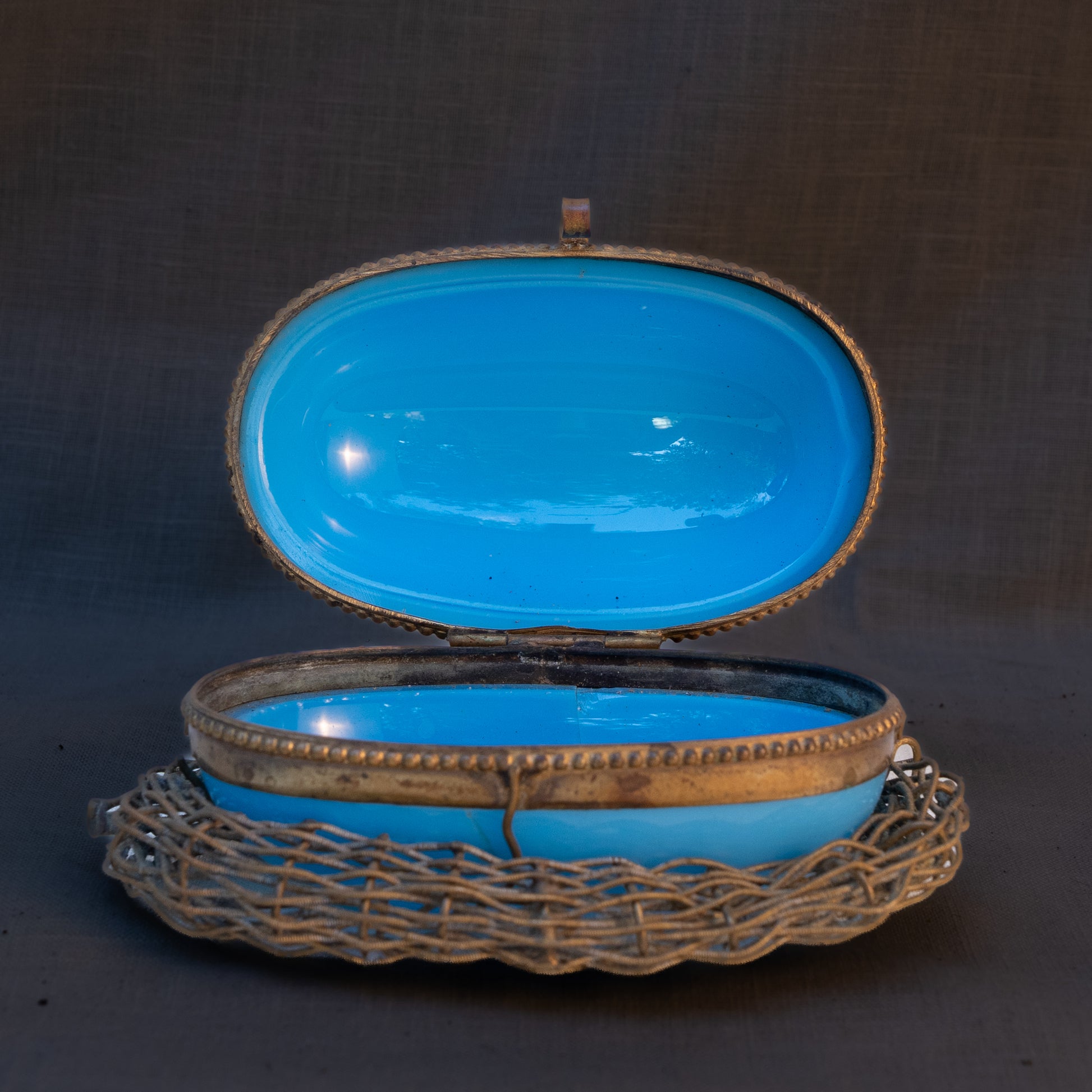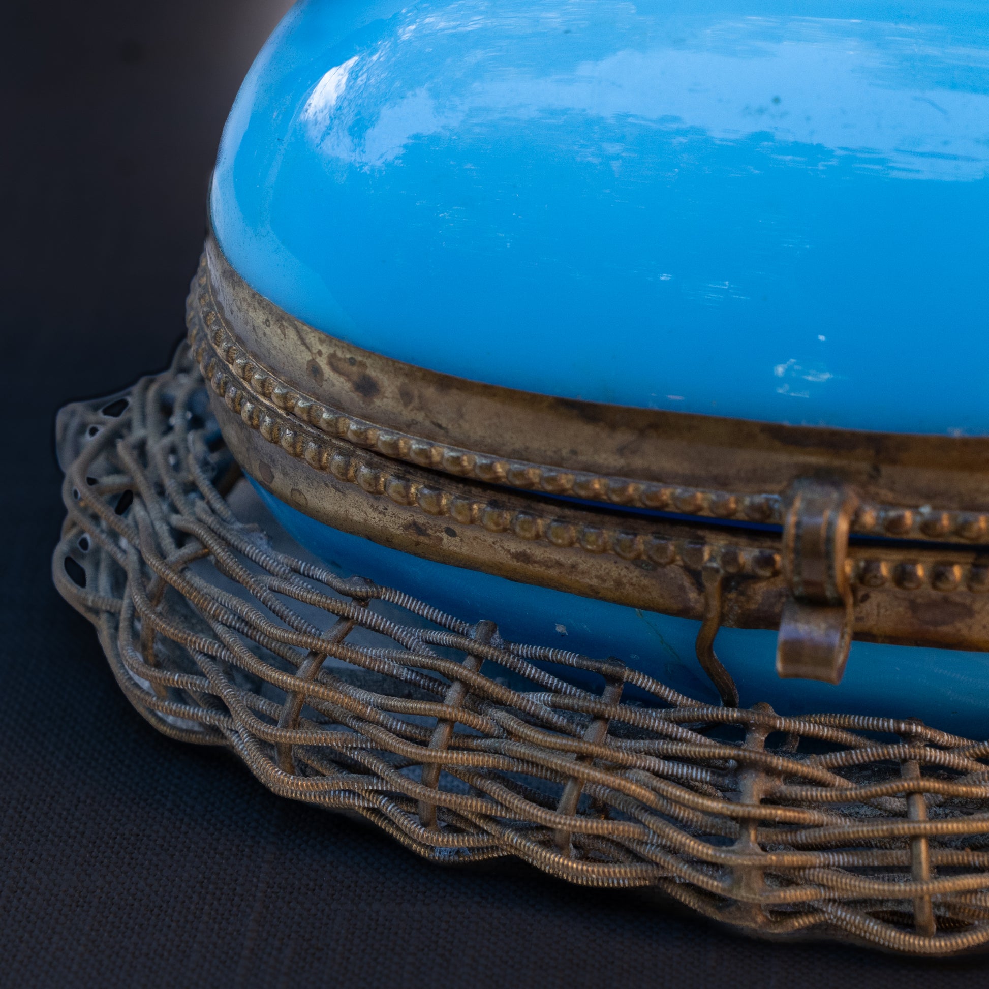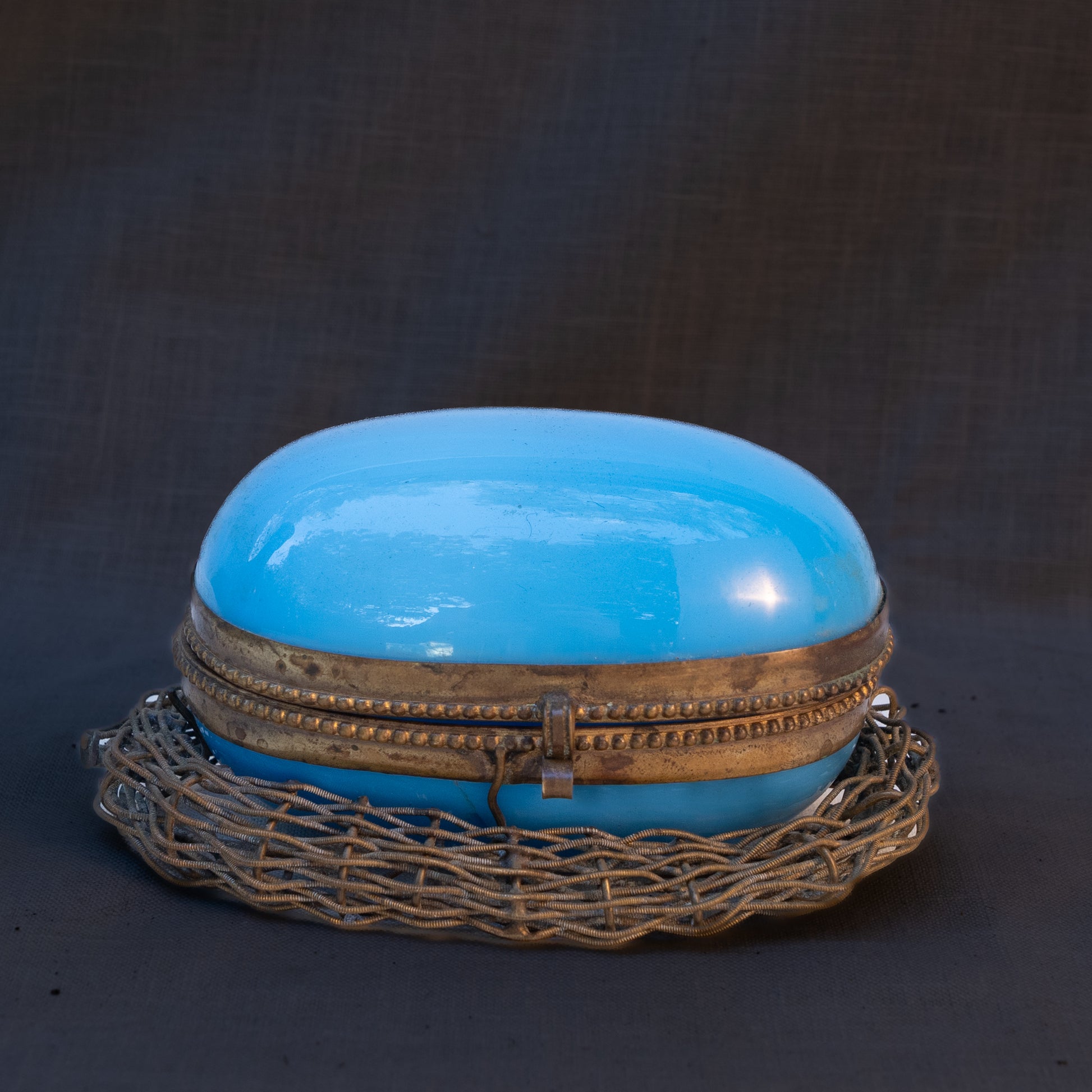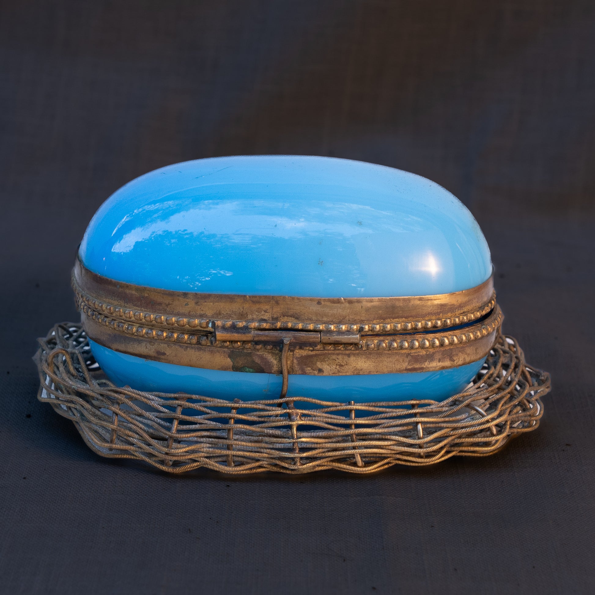 This whimsical French-made box from the Victorian era (ca1880) is quite an unusual treasure! The trinket box forms the shape of a 3-dimensional egg, which is nestled at the center of a woven "bird's nest" border. The egg is made of blue opaline glass. It rests within a coiled wirework frame made of brass, which has been gilded for a vibrant gold finish. A hinge allows the egg to open from the front, revealing a hollow interior where small jewels or trinkets could be stored inside.