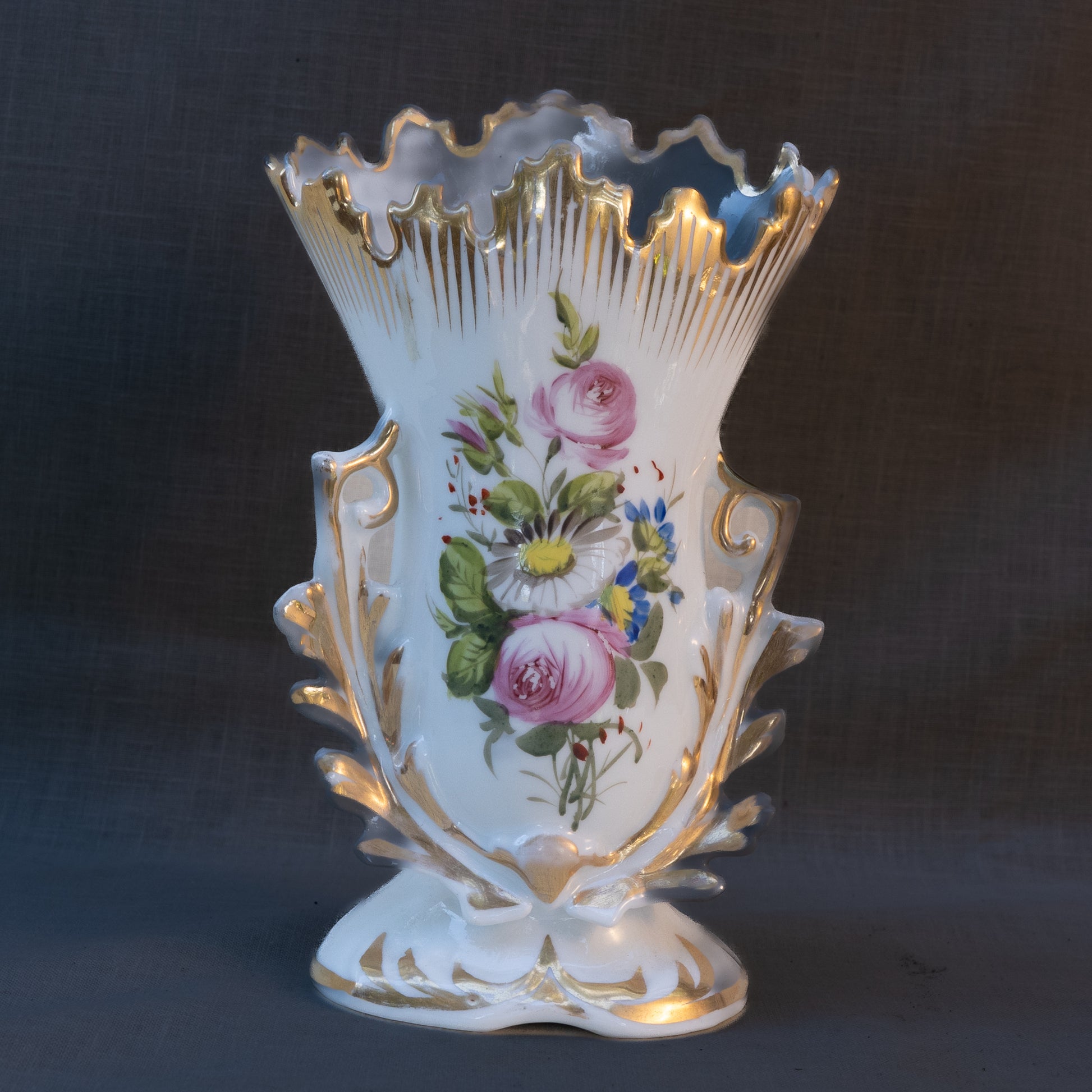 A delightful French veilleuse-style porcelain vase, likely Limoges, late 19th century, featuring an elaborately scalloped rim and pedestal base with pierced and molded leafwork accents. The white glazed body is enriched with hand-painted floral bouquets—roses, daisies, forget-me-nots—in vibrant polychrome enamels, all framed by ornate gilded detailing. While veilleuses were originally designed to serve warm beverages atop small nightlamps, this example was likely conceived as a decorative vase inspired by that form. Its Rococo Revival flourishes and brilliant palette make it a quintessential salon ornament—a small but spirited example of the enduring French love affair with floral porcelain and domestic opulence.