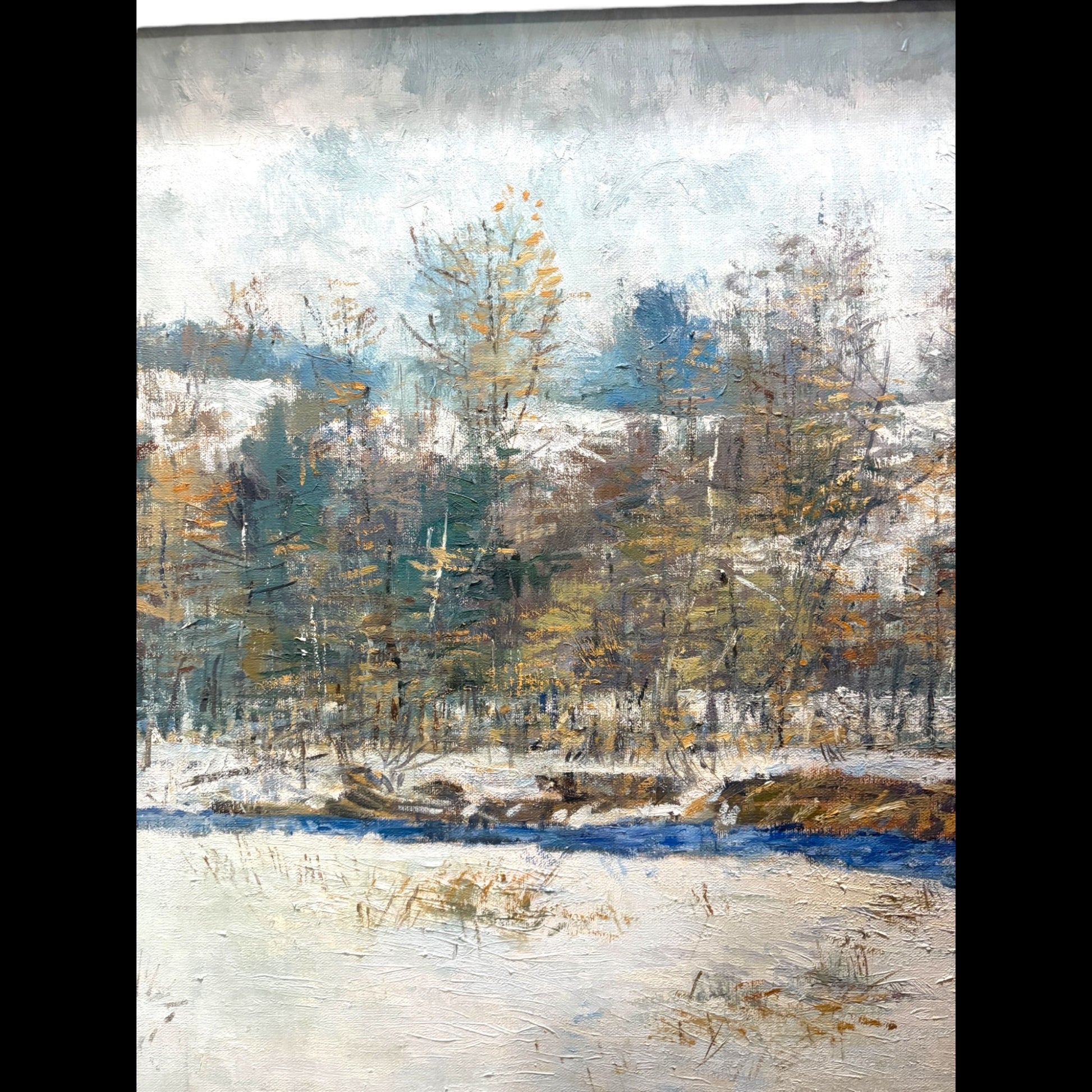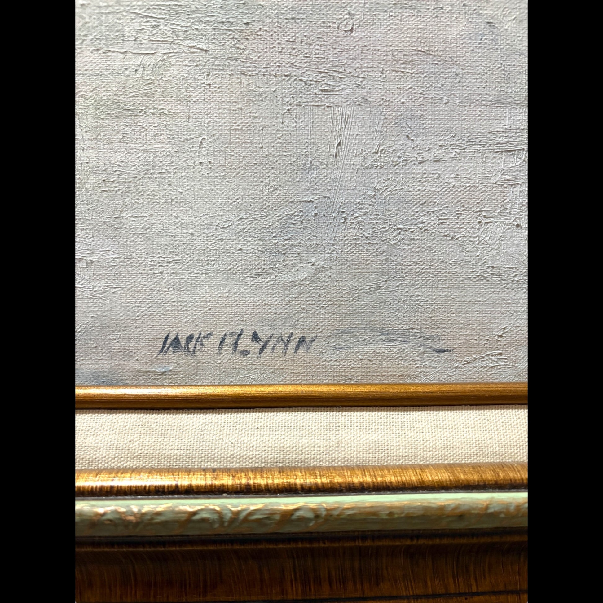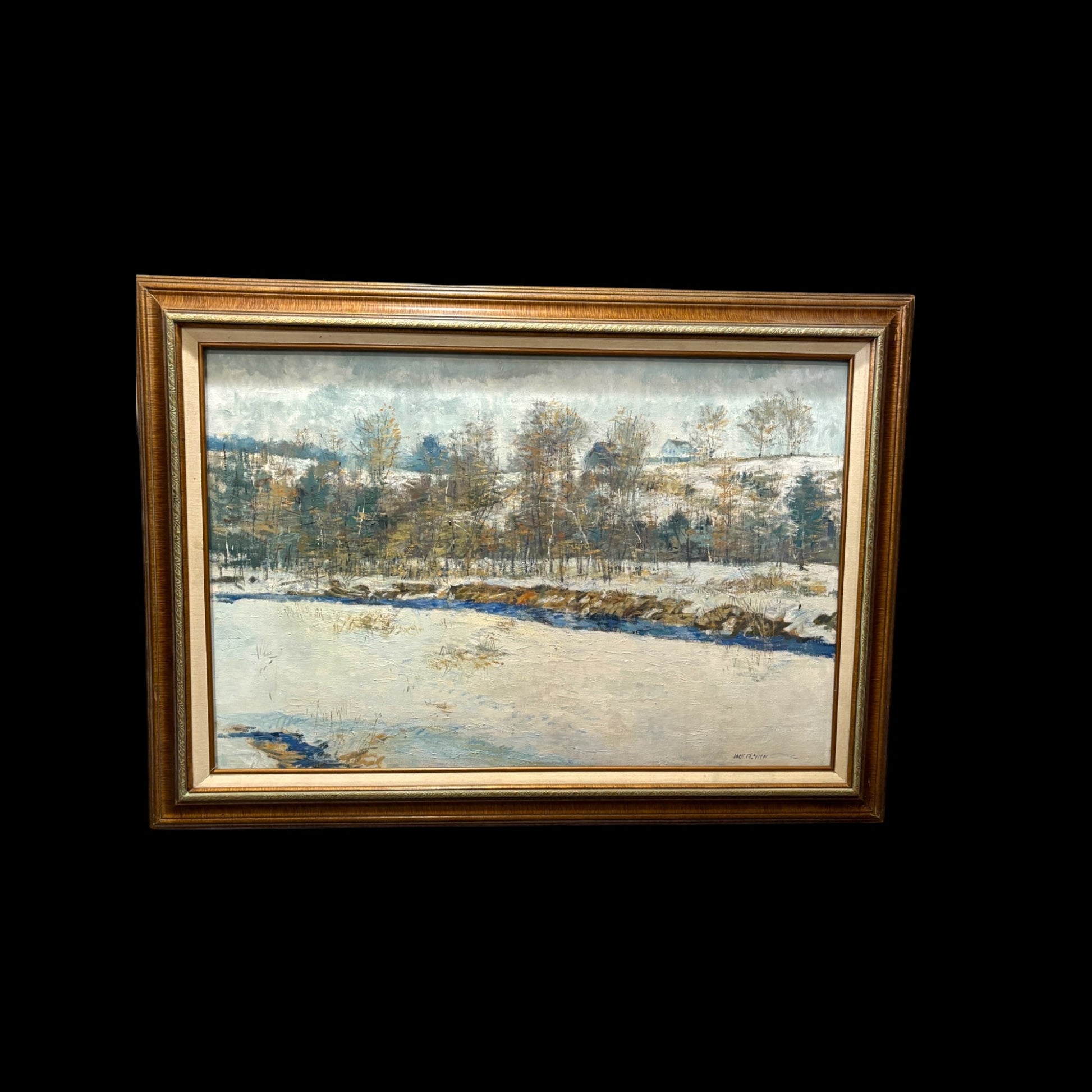 A tranquil snowscape rendered in soft yet assured brushwork by listed American artist Jack Flynn. This impressionistic oil painting captures a serene winter morning where skeletal trees stand quietly along a frozen stream, and distant farmhouses rest beneath a sky heavy with pale cloud. Flynn’s subtle control of palette—cool whites, dusky blues, and ochre accents—evokes the hush of early winter light and the poetic stillness of rural solitude. A beautifully balanced composition that draws the eye into its quiet narrative, this work reflects Flynn’s sensitivity to nature and mood. Presented in its original tiered wood frame with linen liner, this is a striking piece of mid-century American landscape painting.