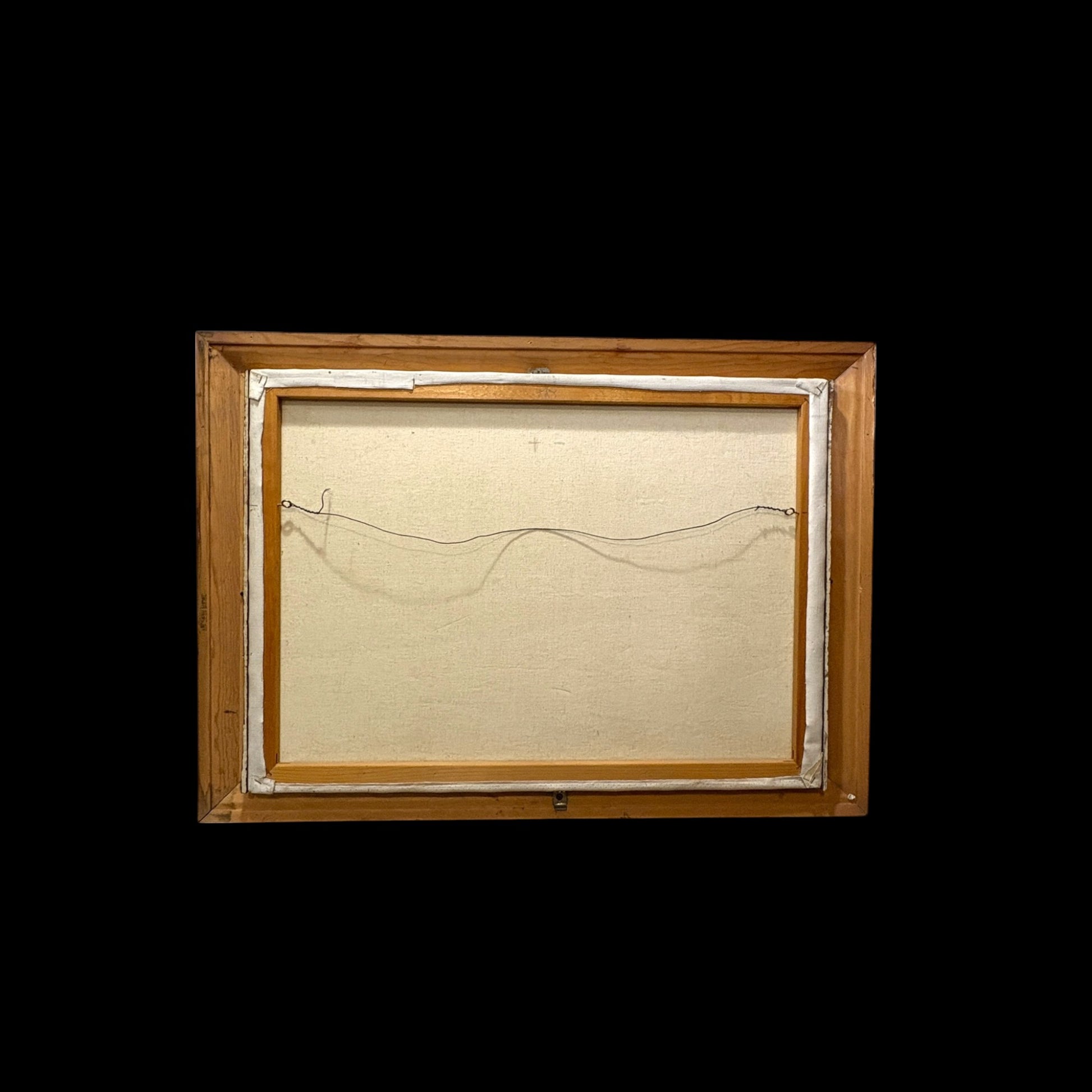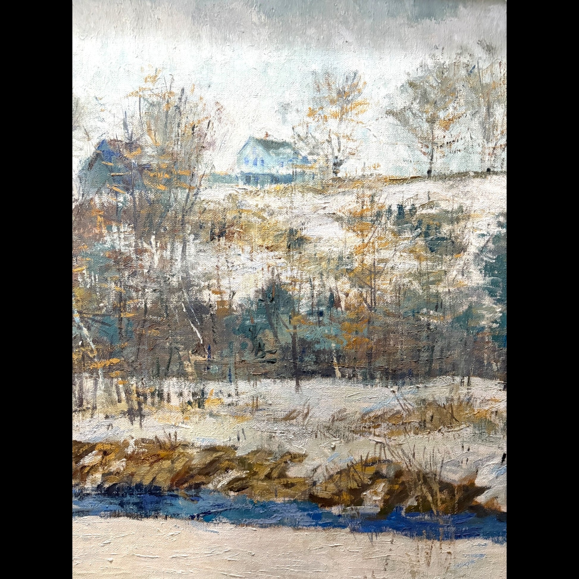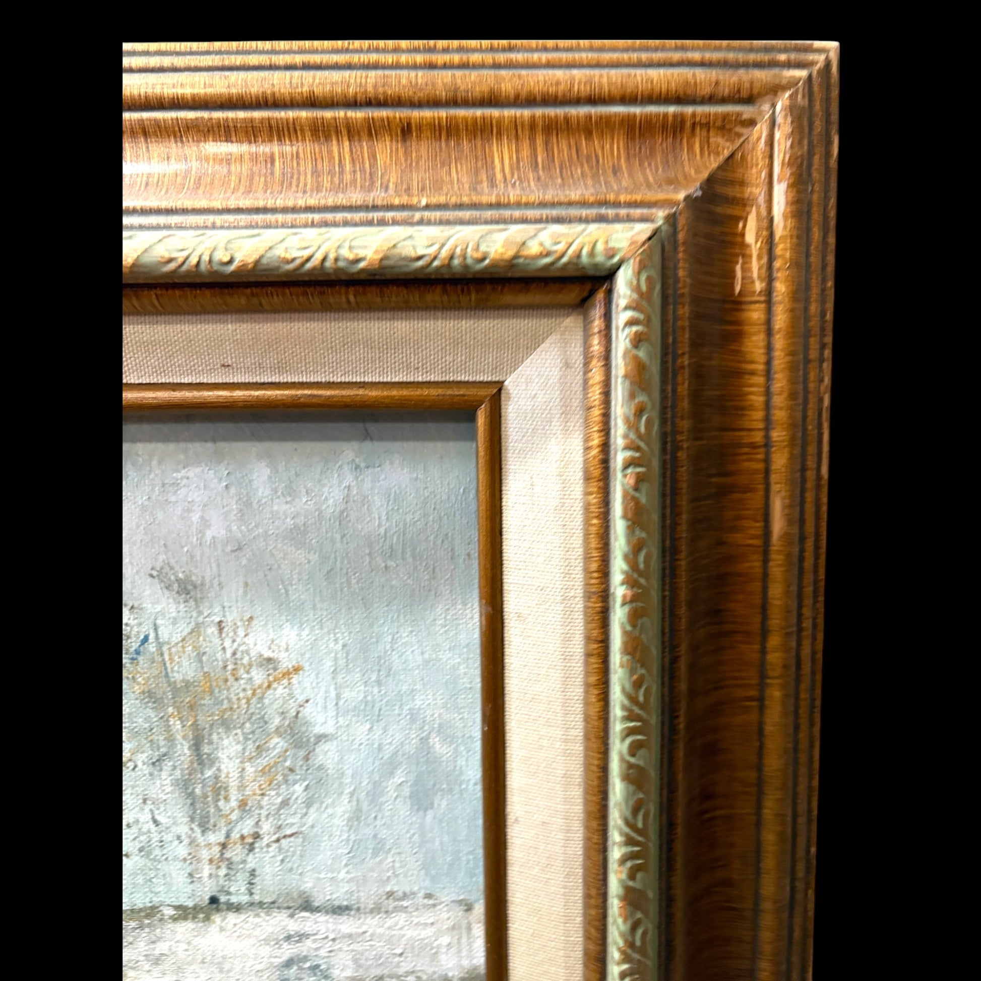 A tranquil snowscape rendered in soft yet assured brushwork by listed American artist Jack Flynn. This impressionistic oil painting captures a serene winter morning where skeletal trees stand quietly along a frozen stream, and distant farmhouses rest beneath a sky heavy with pale cloud. Flynn’s subtle control of palette—cool whites, dusky blues, and ochre accents—evokes the hush of early winter light and the poetic stillness of rural solitude. A beautifully balanced composition that draws the eye into its quiet narrative, this work reflects Flynn’s sensitivity to nature and mood. Presented in its original tiered wood frame with linen liner, this is a striking piece of mid-century American landscape painting.