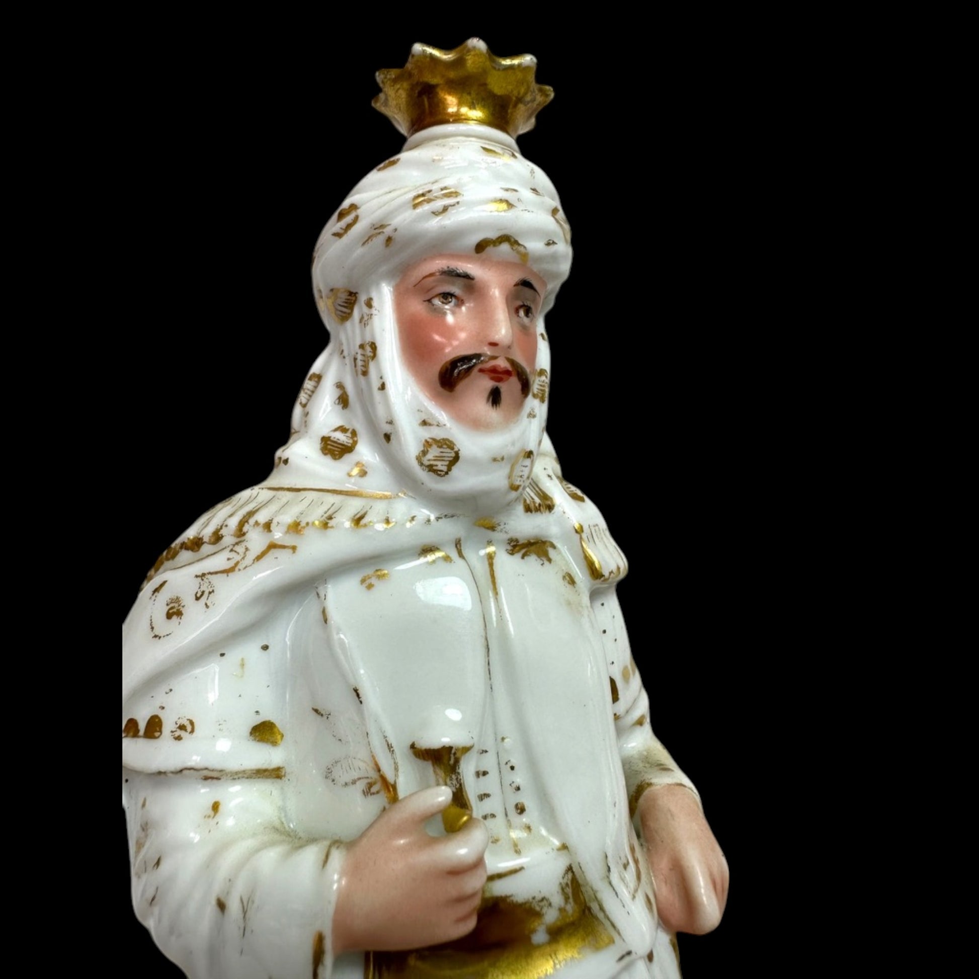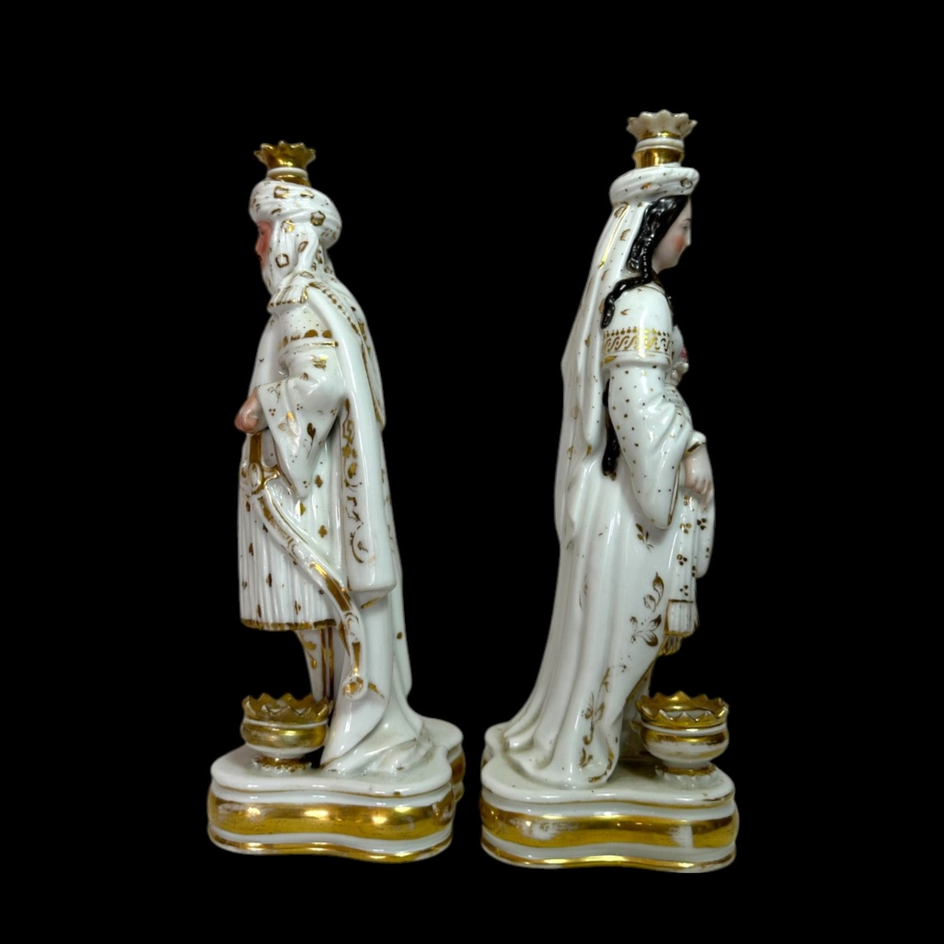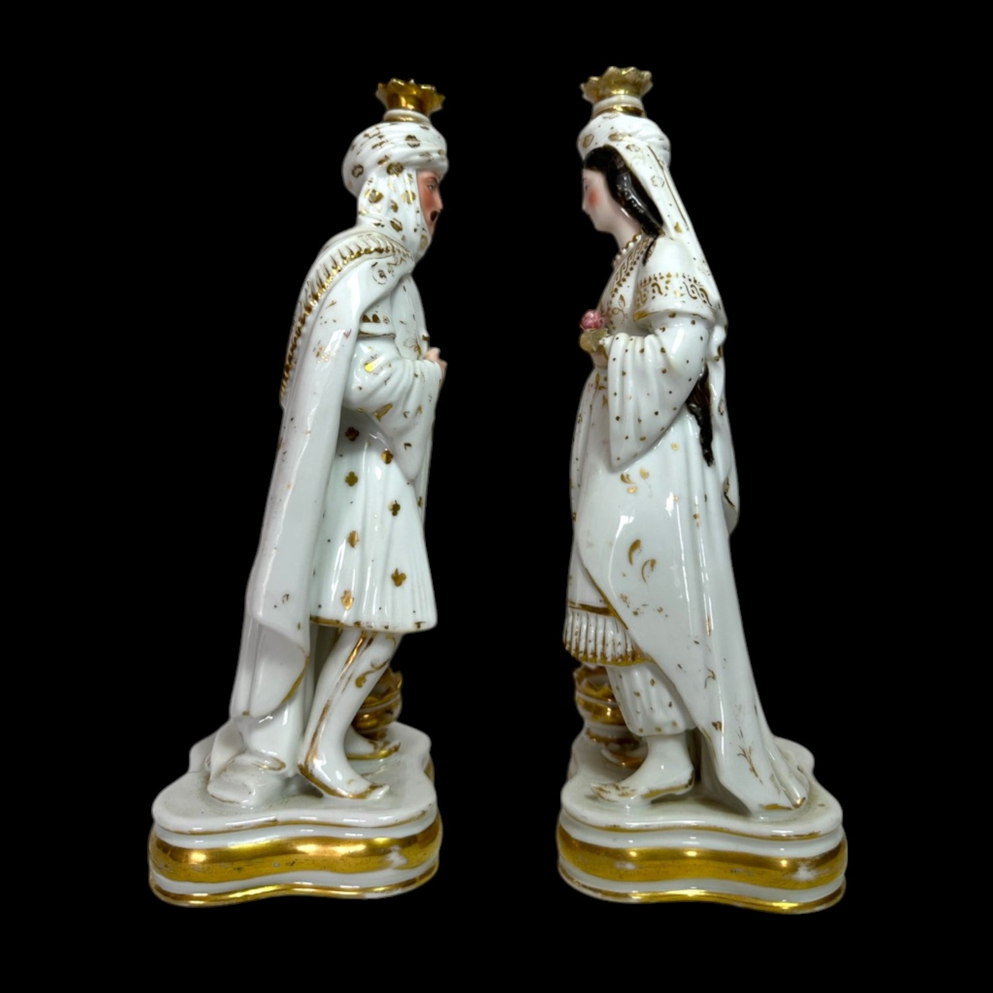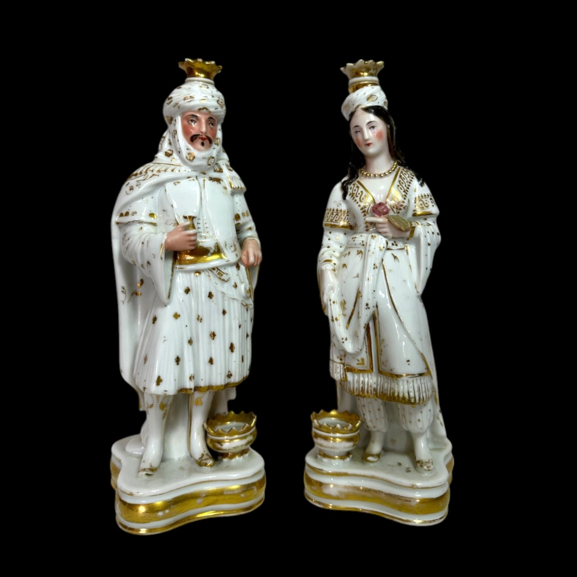 Antique Pair Of Jacob Petit Porcelain Sultan & Sultana Bottle / Candle Holders. Early 19th century Jacob Petit Porcelain Factory, two porcelain perfume bottles in the shape of Turkish sultan and sultana in white gilded robes. Signed under the base. There is some fading to the gold and a hairline fracture in one of the pieces, please refer to photos. This is an excellent addition to any serious collection of French Porcelain, or orientalist objects.