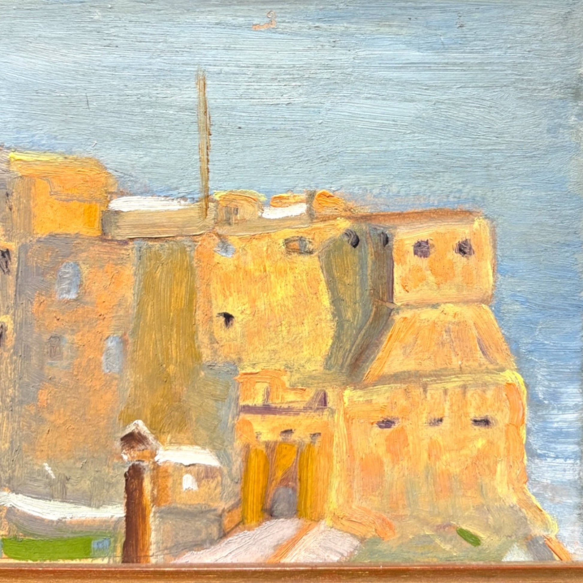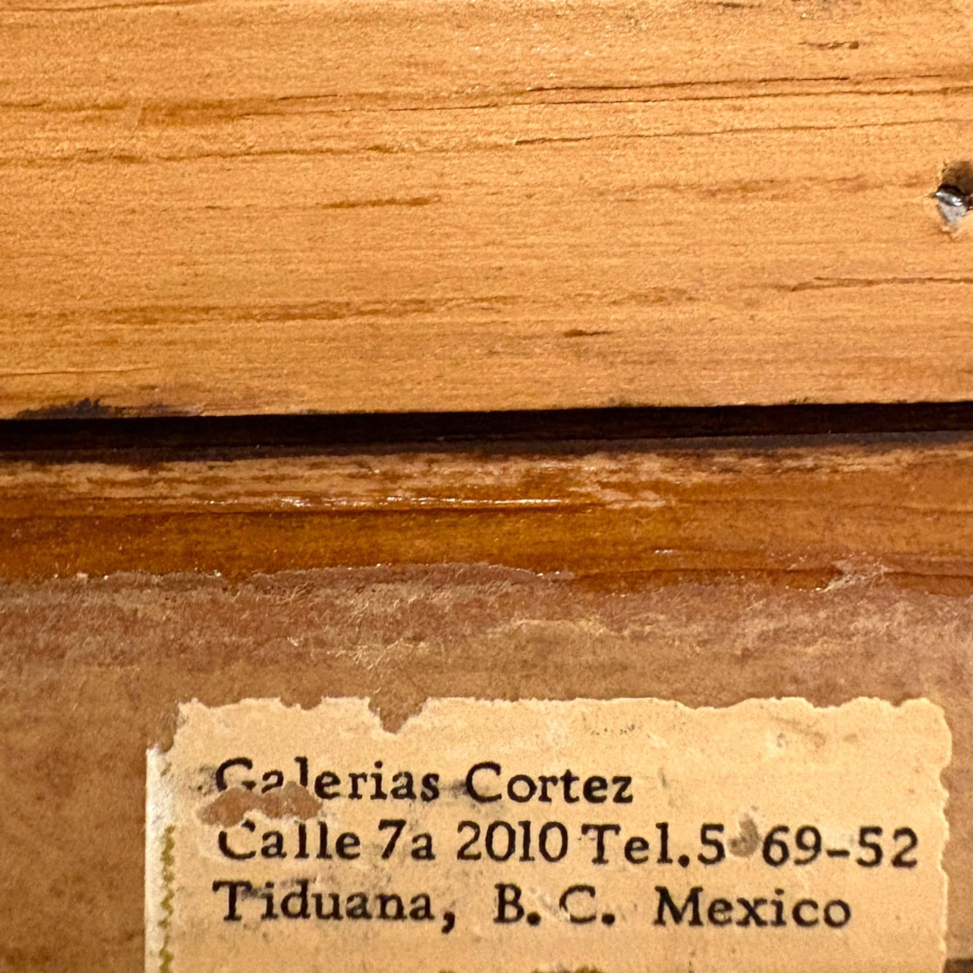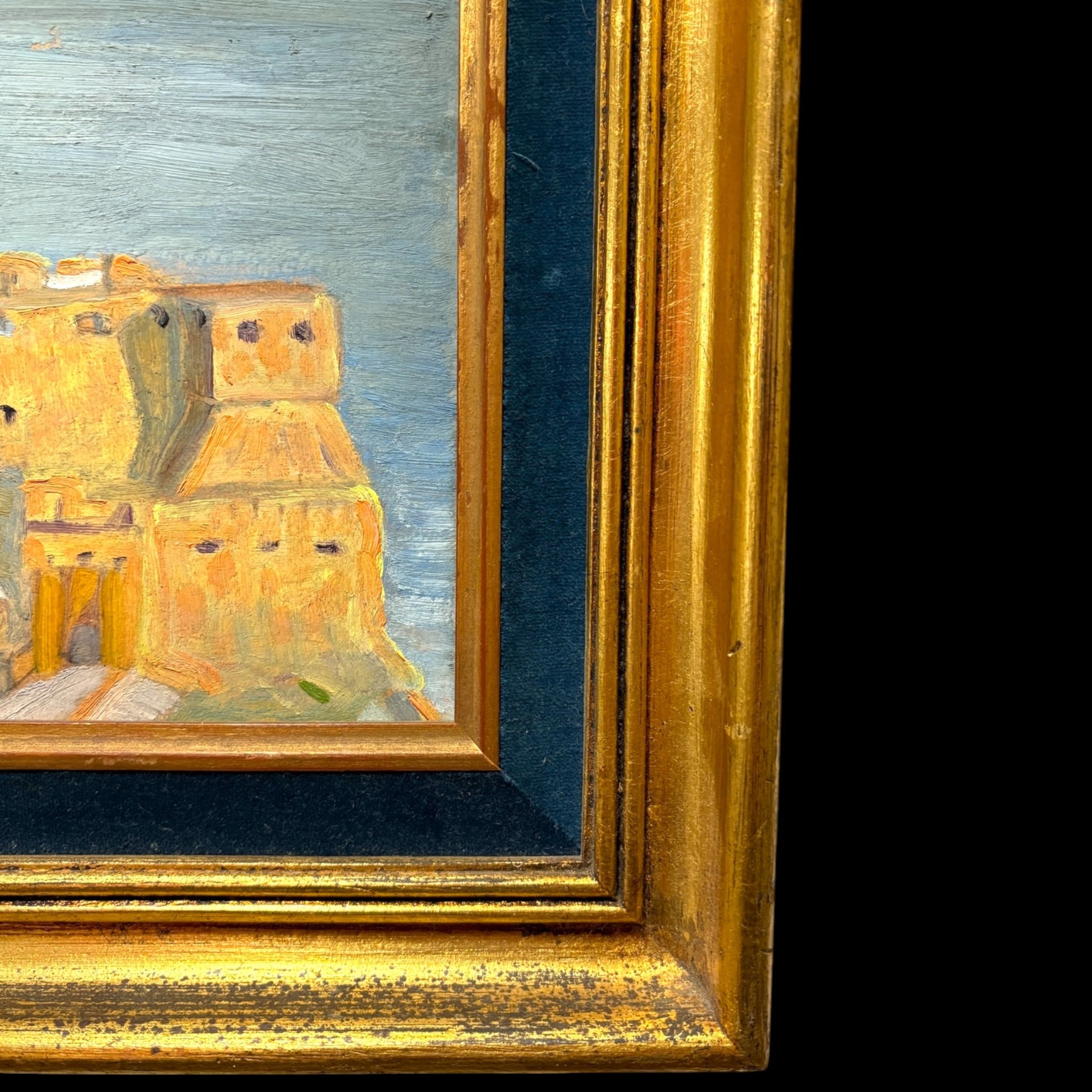 Unknown Artist (Mid-20th Century) Coastal Fortification Oil on panel | Galerias Cortez label verso (Tijuana, Mexico) — Rendered in a sunlit palette of ochre, seafoam, and coral, this intimate coastal landscape depicts an ancient seaside fortress rising above a calm blue horizon. With simplified forms and expressive brushwork, the painting captures both the architectural weight of history and the breezy lightness of the sea beyond. The artist’s hand suggests a modernist influence with nods to naïve perspective, inviting a nostalgic gaze toward Mediterranean or Latin American coastal towns. Presented in its original gilded frame with velvet-lined mat, and bearing a label from the storied Galerias Cortez of Tijuana, this piece offers collectors a soulful blend of folk charm and painterly elegance.