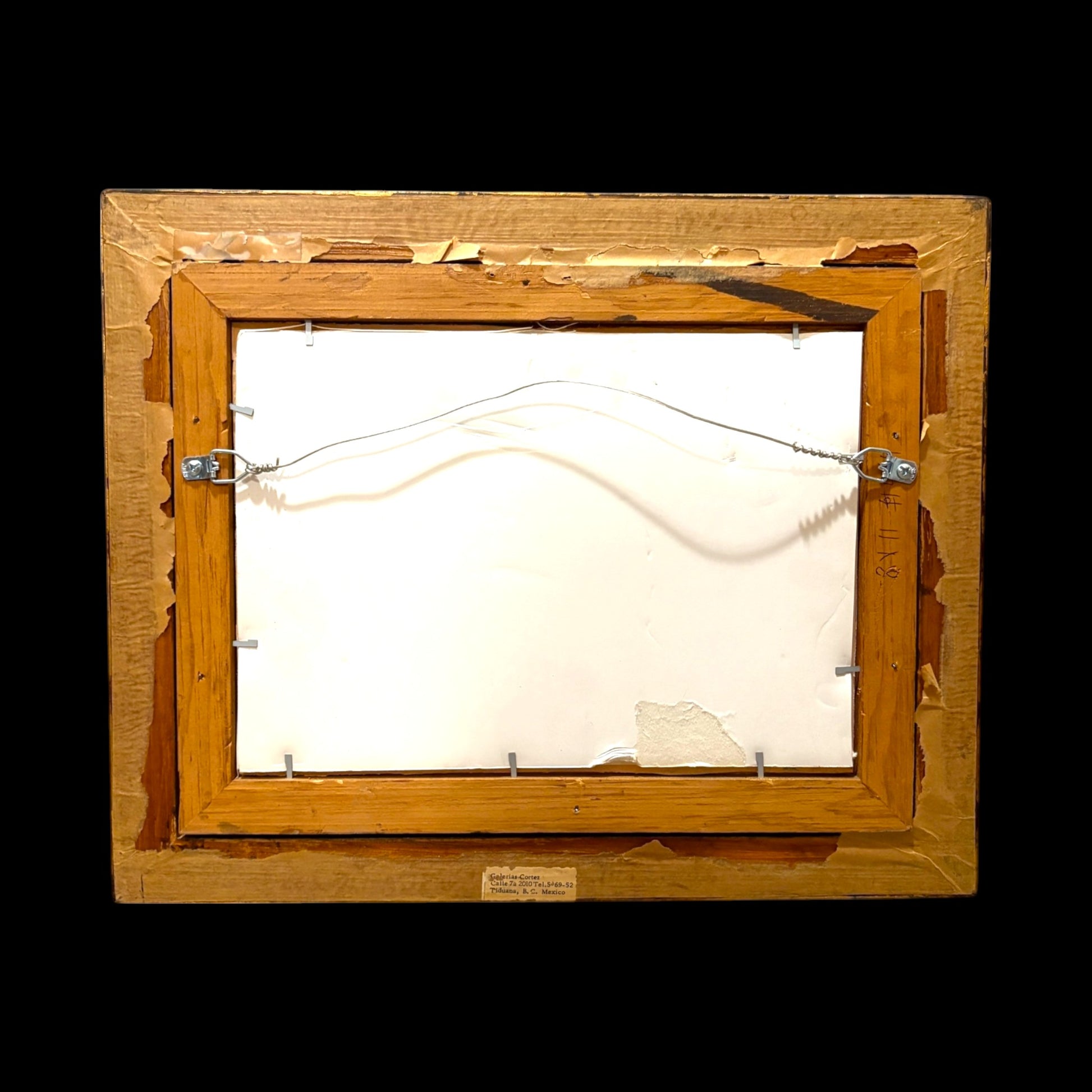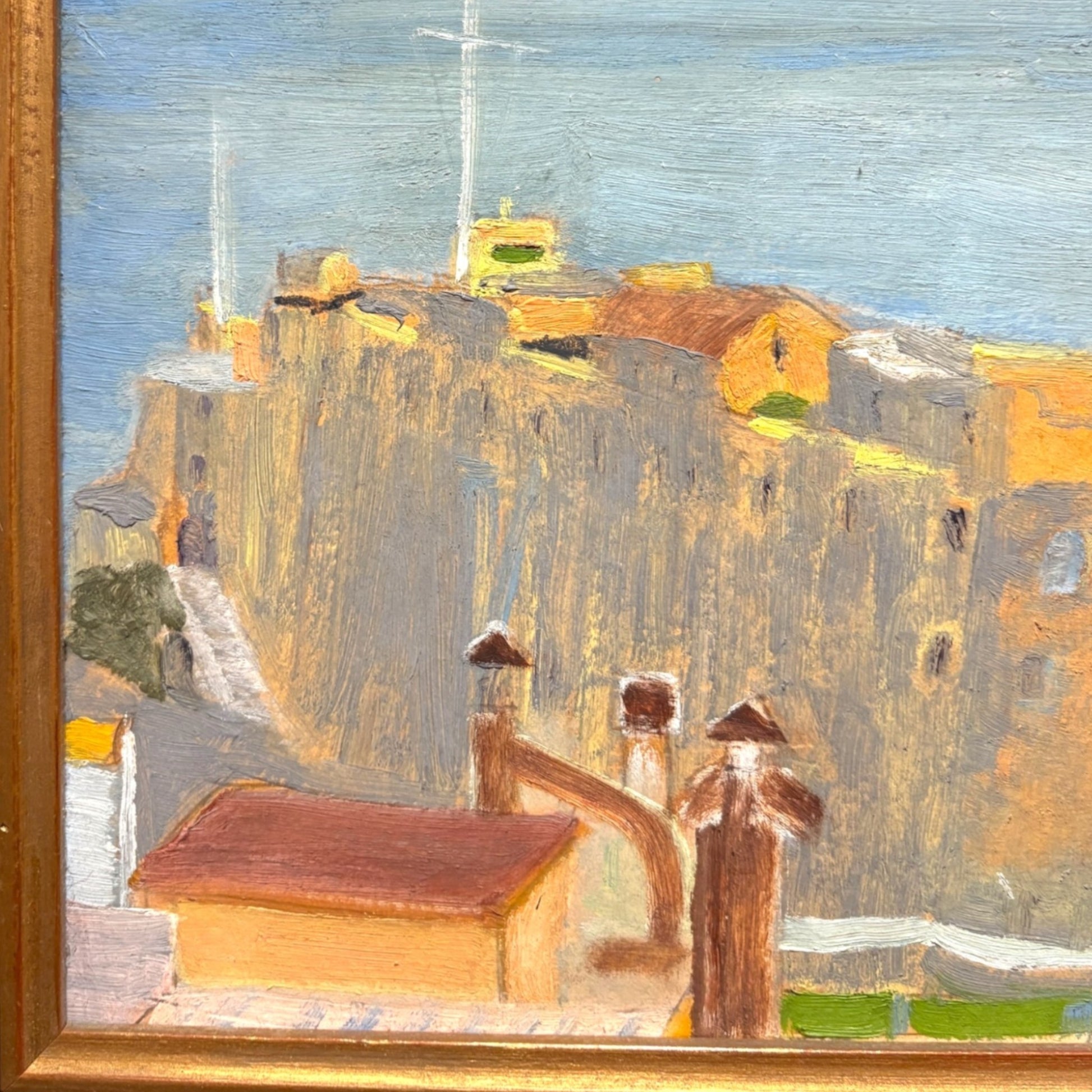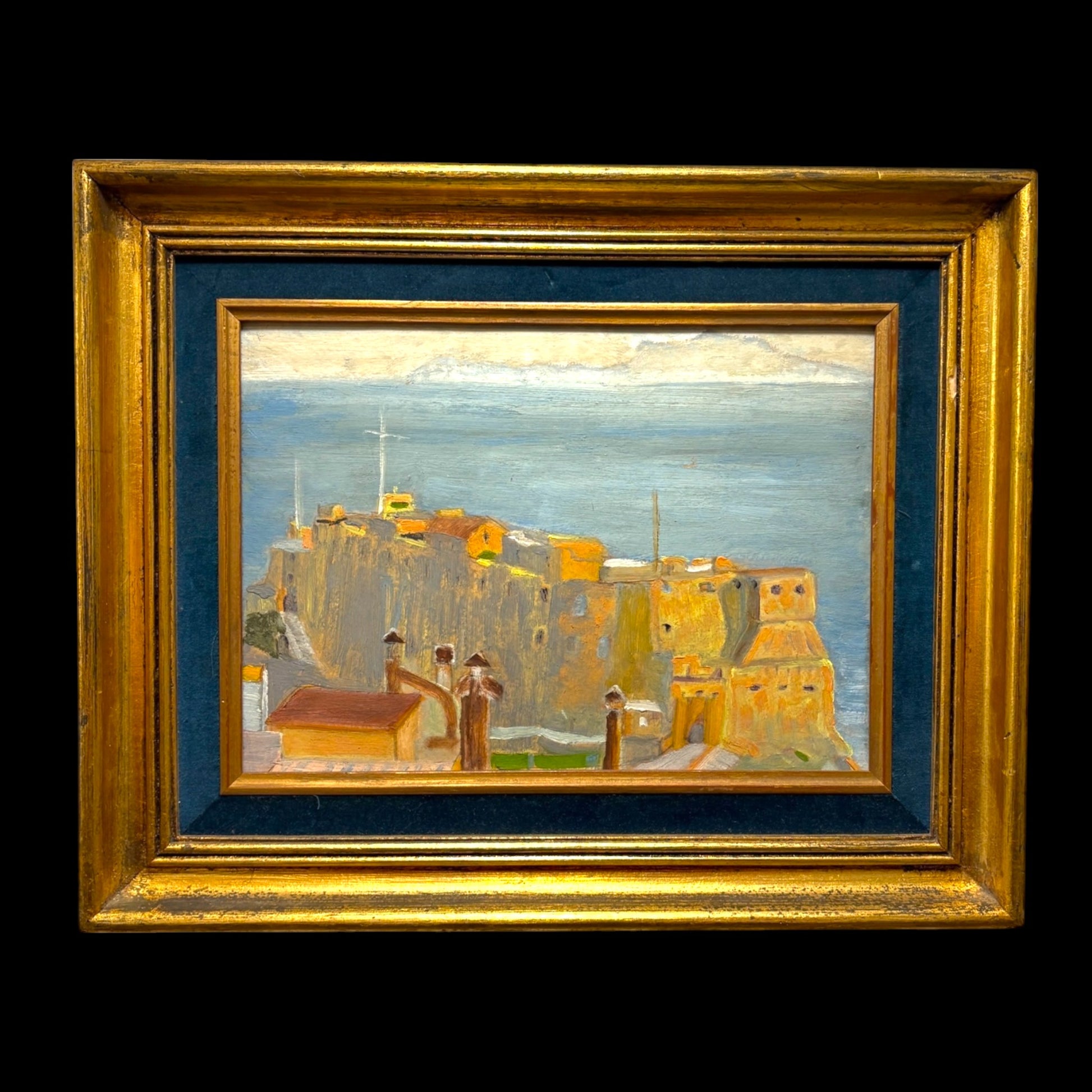 Unknown Artist (Mid-20th Century) Coastal Fortification Oil on panel | Galerias Cortez label verso (Tijuana, Mexico) — Rendered in a sunlit palette of ochre, seafoam, and coral, this intimate coastal landscape depicts an ancient seaside fortress rising above a calm blue horizon. With simplified forms and expressive brushwork, the painting captures both the architectural weight of history and the breezy lightness of the sea beyond. The artist’s hand suggests a modernist influence with nods to naïve perspective, inviting a nostalgic gaze toward Mediterranean or Latin American coastal towns. Presented in its original gilded frame with velvet-lined mat, and bearing a label from the storied Galerias Cortez of Tijuana, this piece offers collectors a soulful blend of folk charm and painterly elegance.
