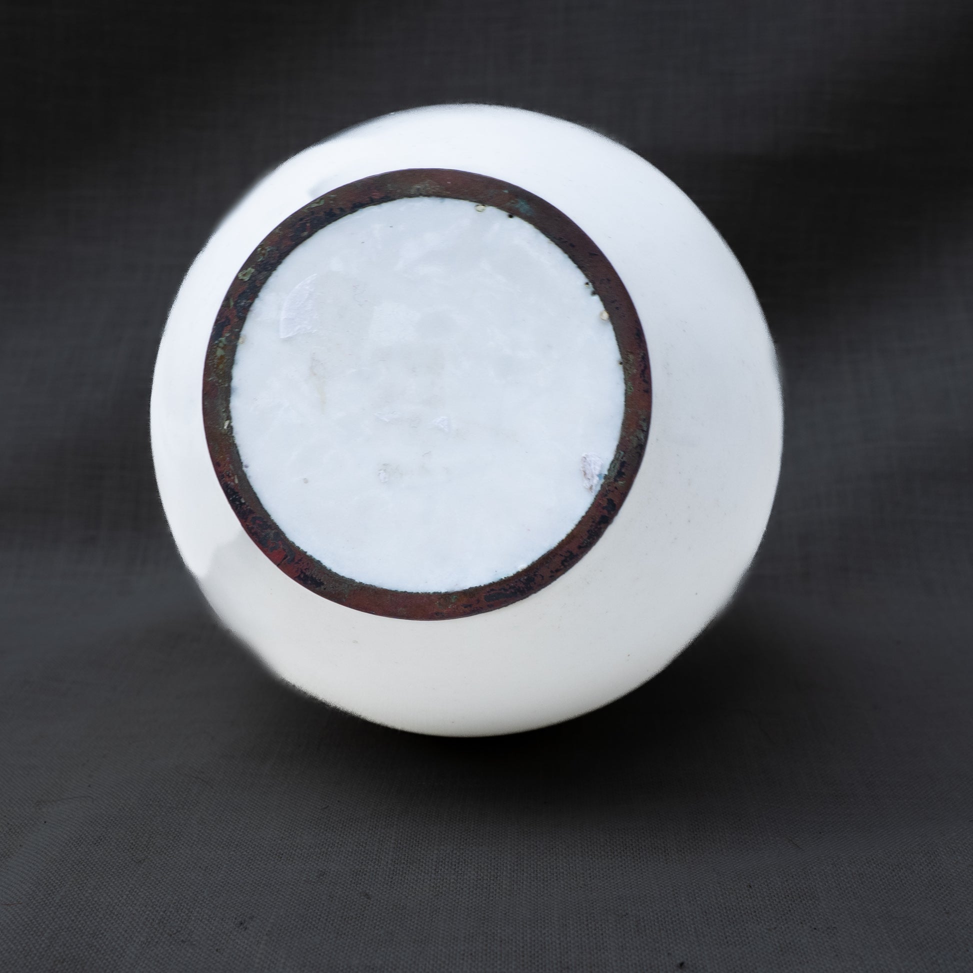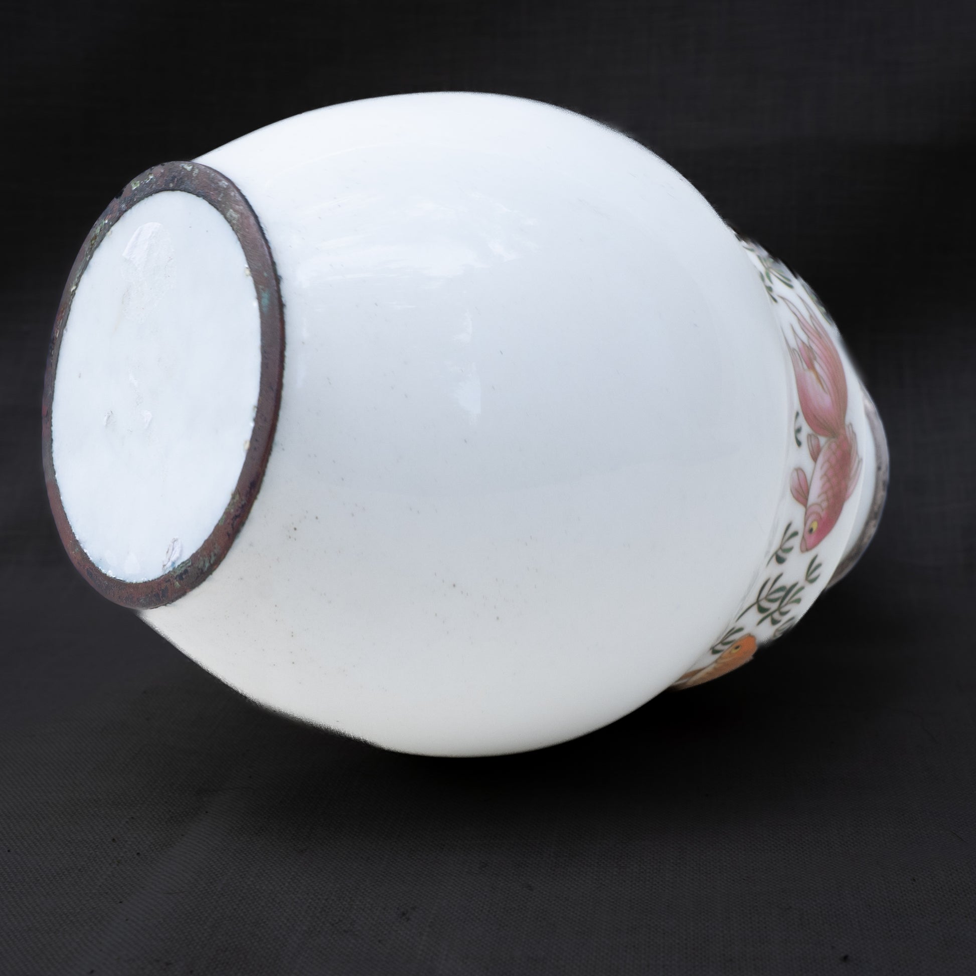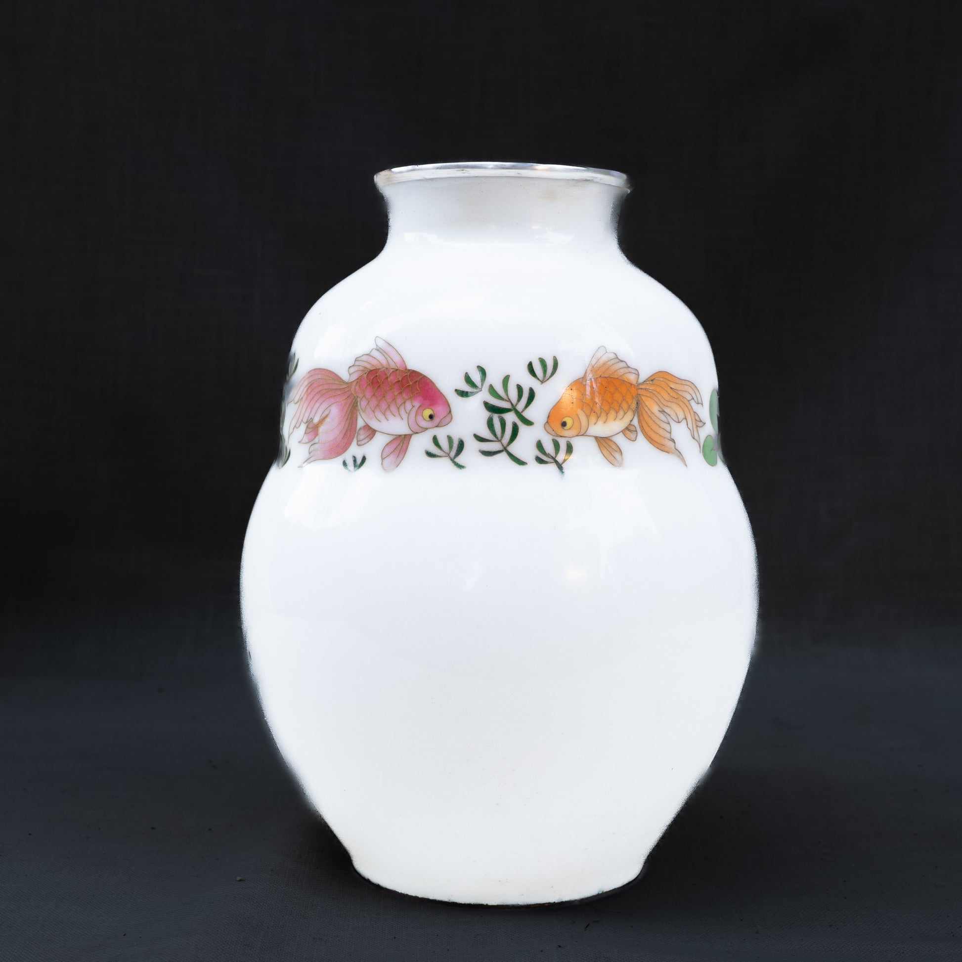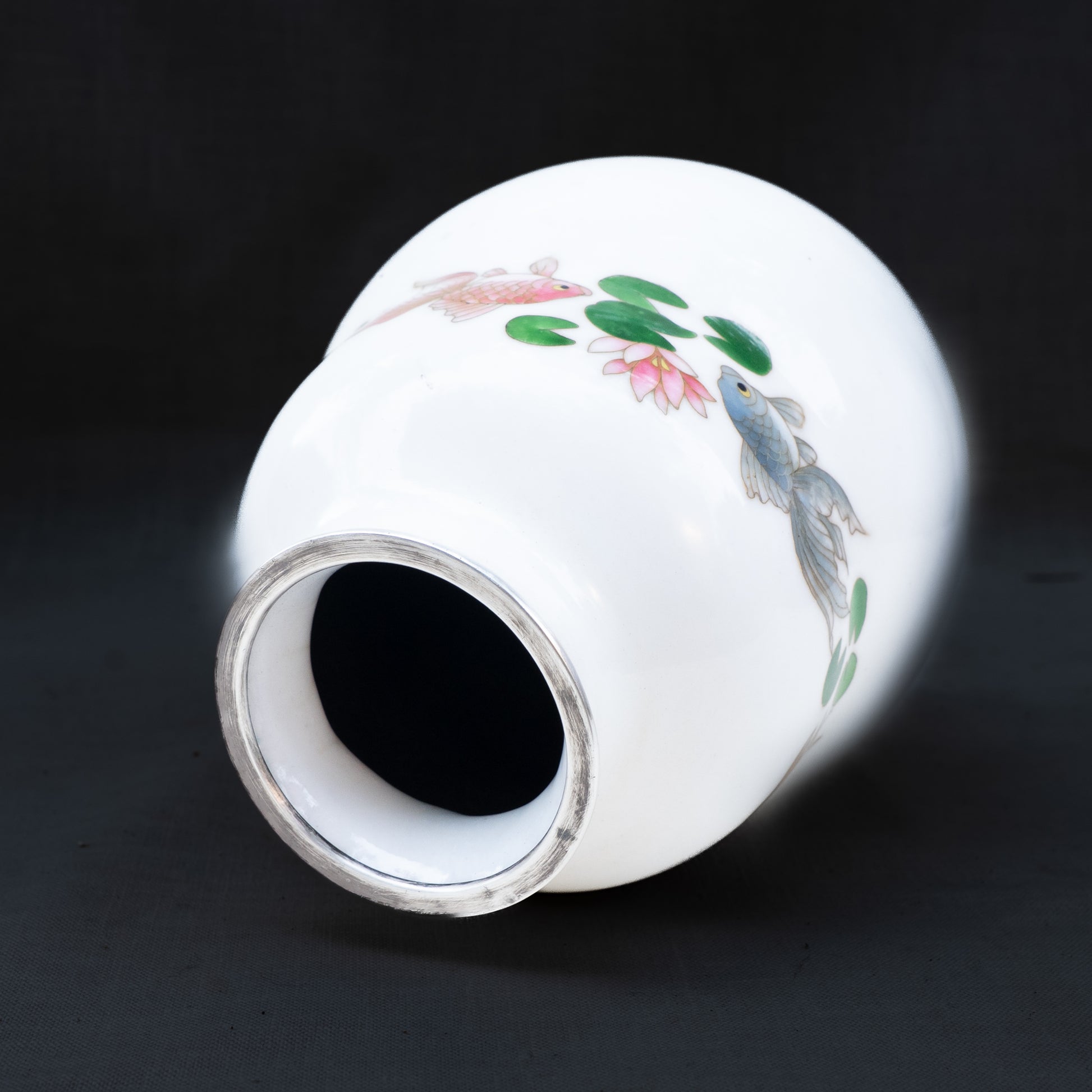 A refined Meiji-era cloisonné vase, likely dating to the late 19th century and executed in the celebrated style of Ando Jubei, one of Japan’s foremost cloisonné masters. The elegant baluster form is set against a pure white enamel ground, its surface delicately adorned with a continuous scene of koi fish swimming amidst blooming lotuses and floating lily pads. The use of shaded enamel and fine silver wirework reveals the hand of a master enameller, capturing both movement and serenity with painterly precision. Cloisonné of this caliber was frequently presented at international expositions and remains a cornerstone of Japanese decorative art collecting. This example reflects both the technical sophistication and poetic sensibility that defined the golden age of Japanese cloisonné.