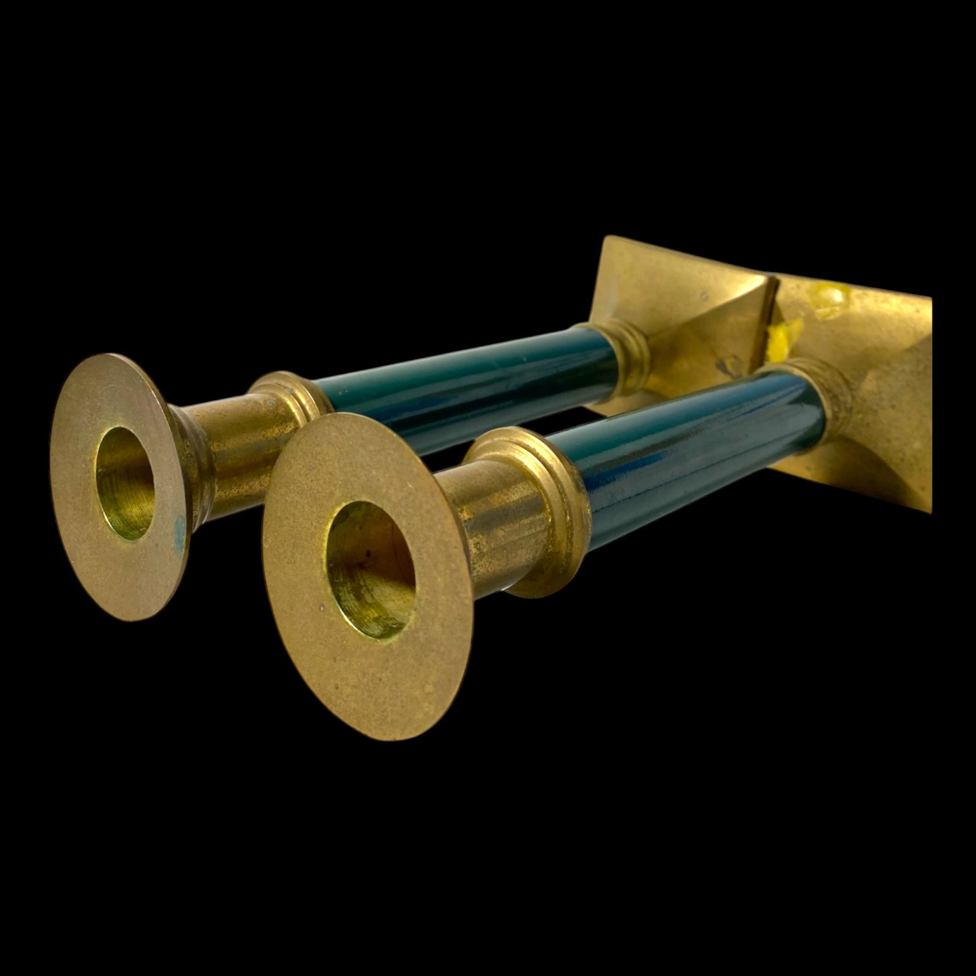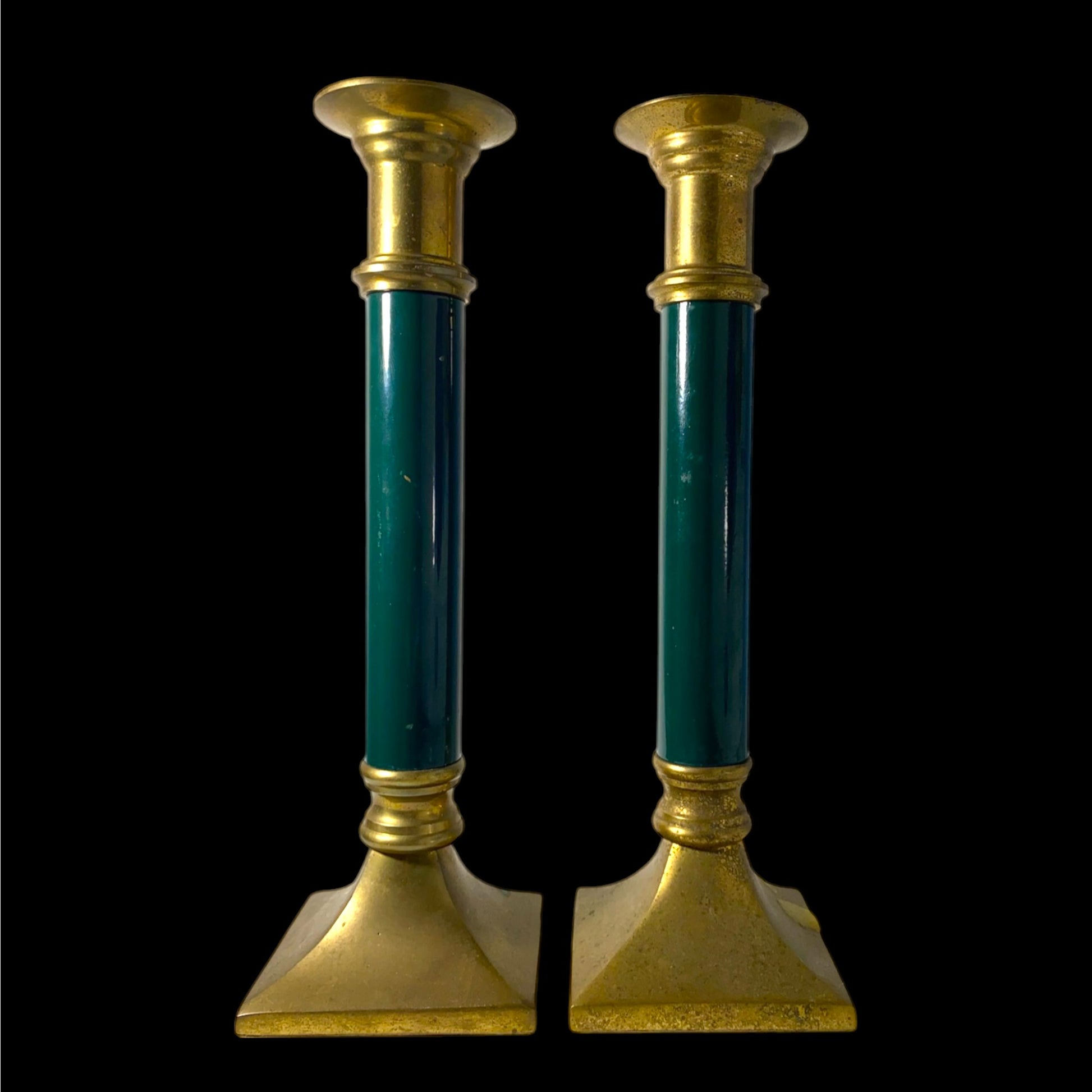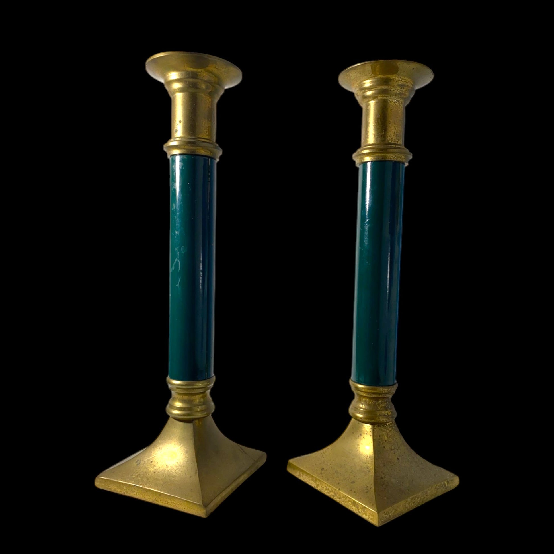 Vintage brass and forest green candlesticks are elegant candle holders that exude a rustic and natural feel. The brass material adds warmth and durability to the design, while the deep forest green color creates a serene and peaceful ambiance. These candlesticks are a timeless addition to any home decor, perfect for creating a cozy and inviting atmosphere.