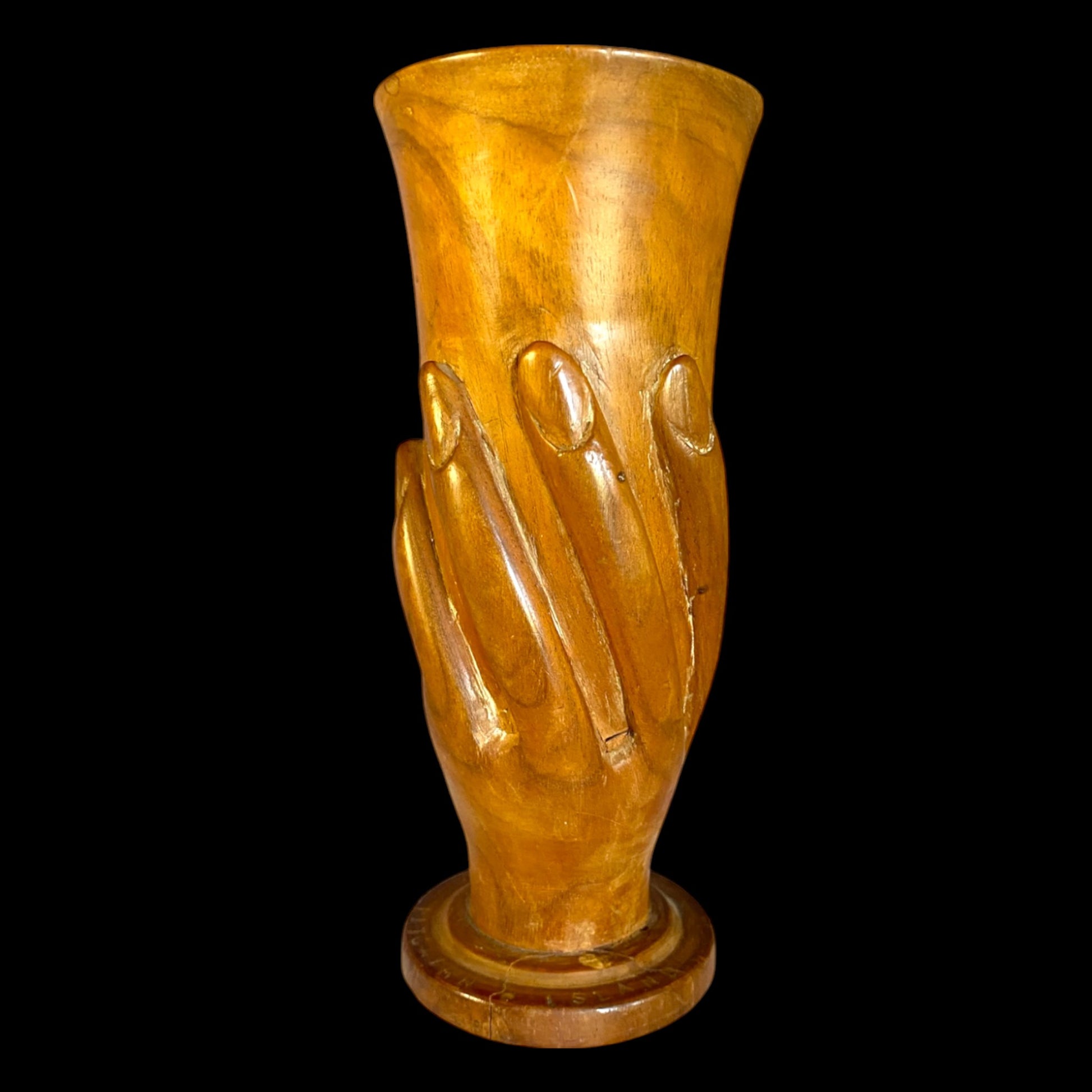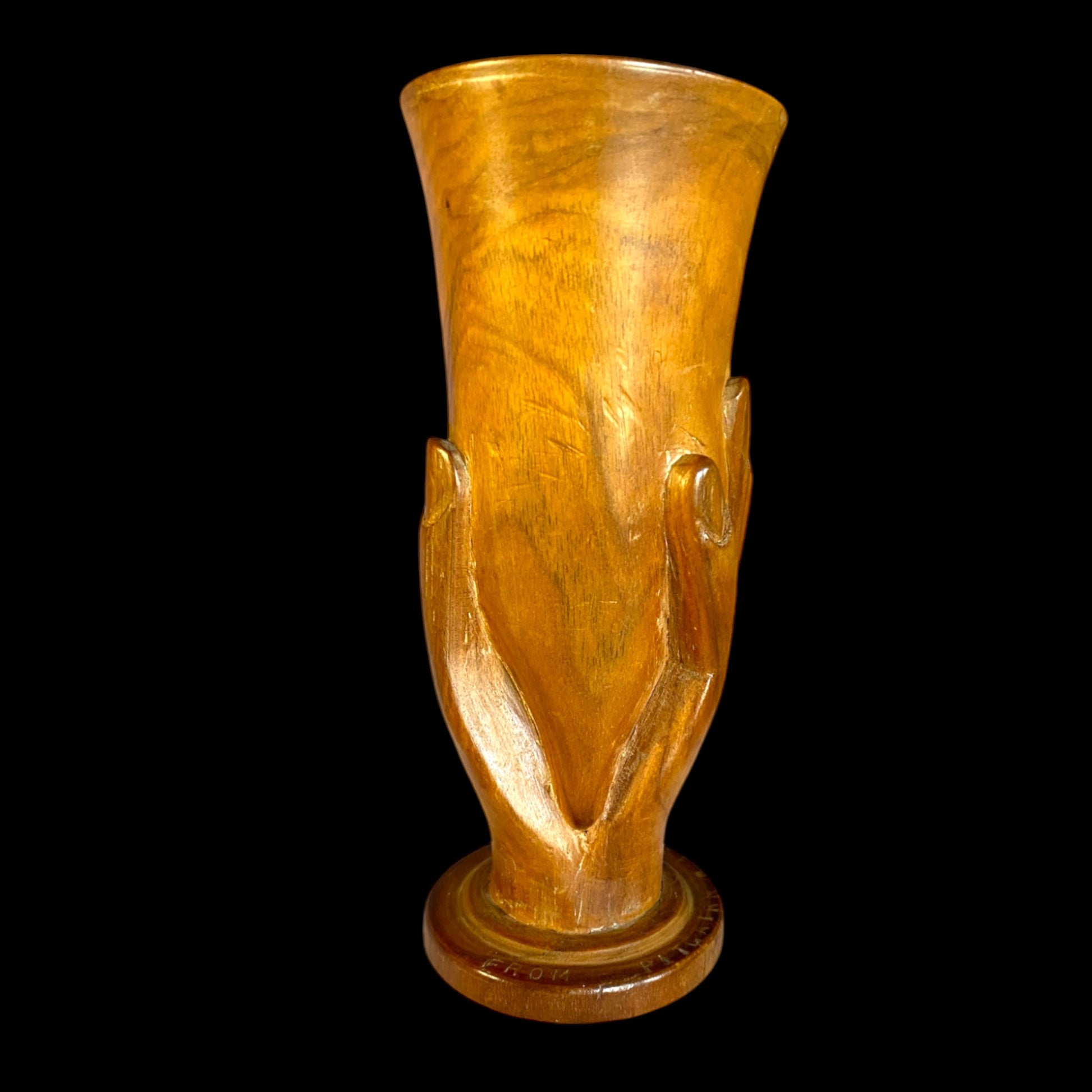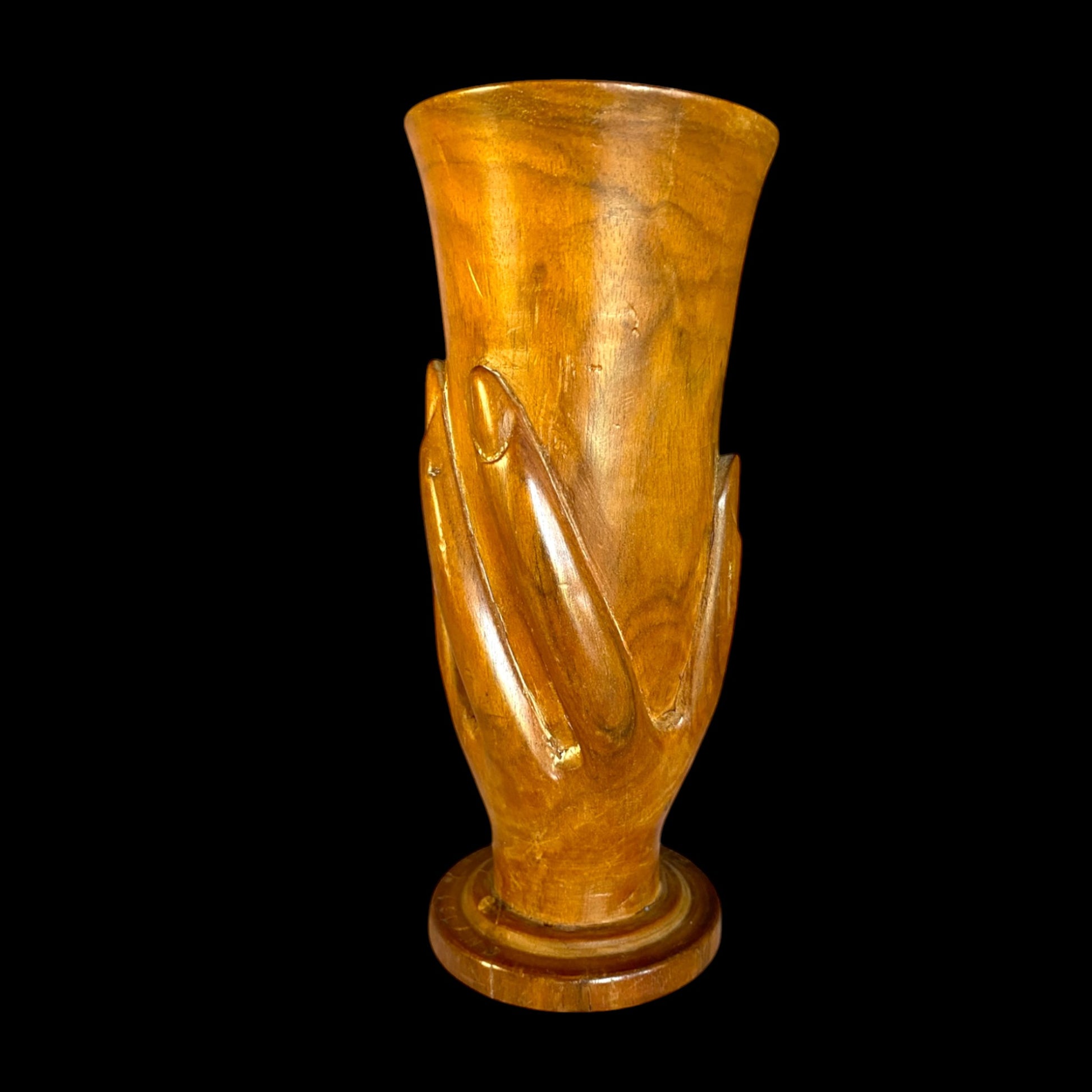 Discover the essence of Mid-Century Modern elegance with our Pacific Hardwood Carved Vase. Crafted from fine hardwood, this one-of-a-kind piece features a stylized hand grasping its form, seamlessly blending traditional craftsmanship with a modern touch. Elevate your space with this unique and affordable treasure, a true fusion of East meets West design.