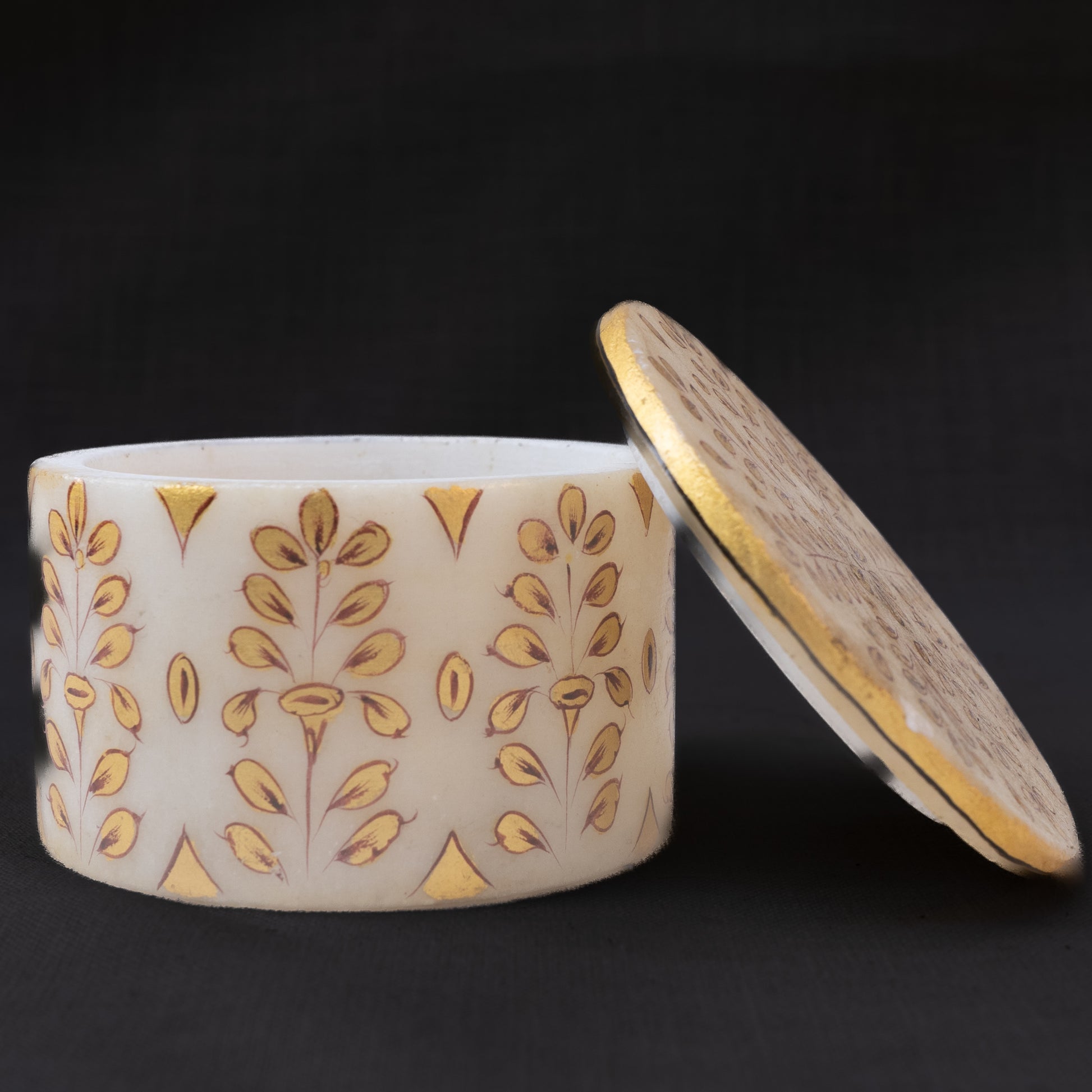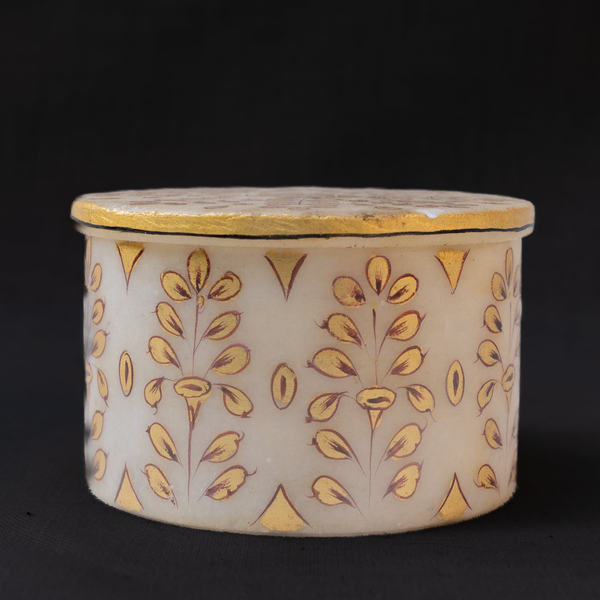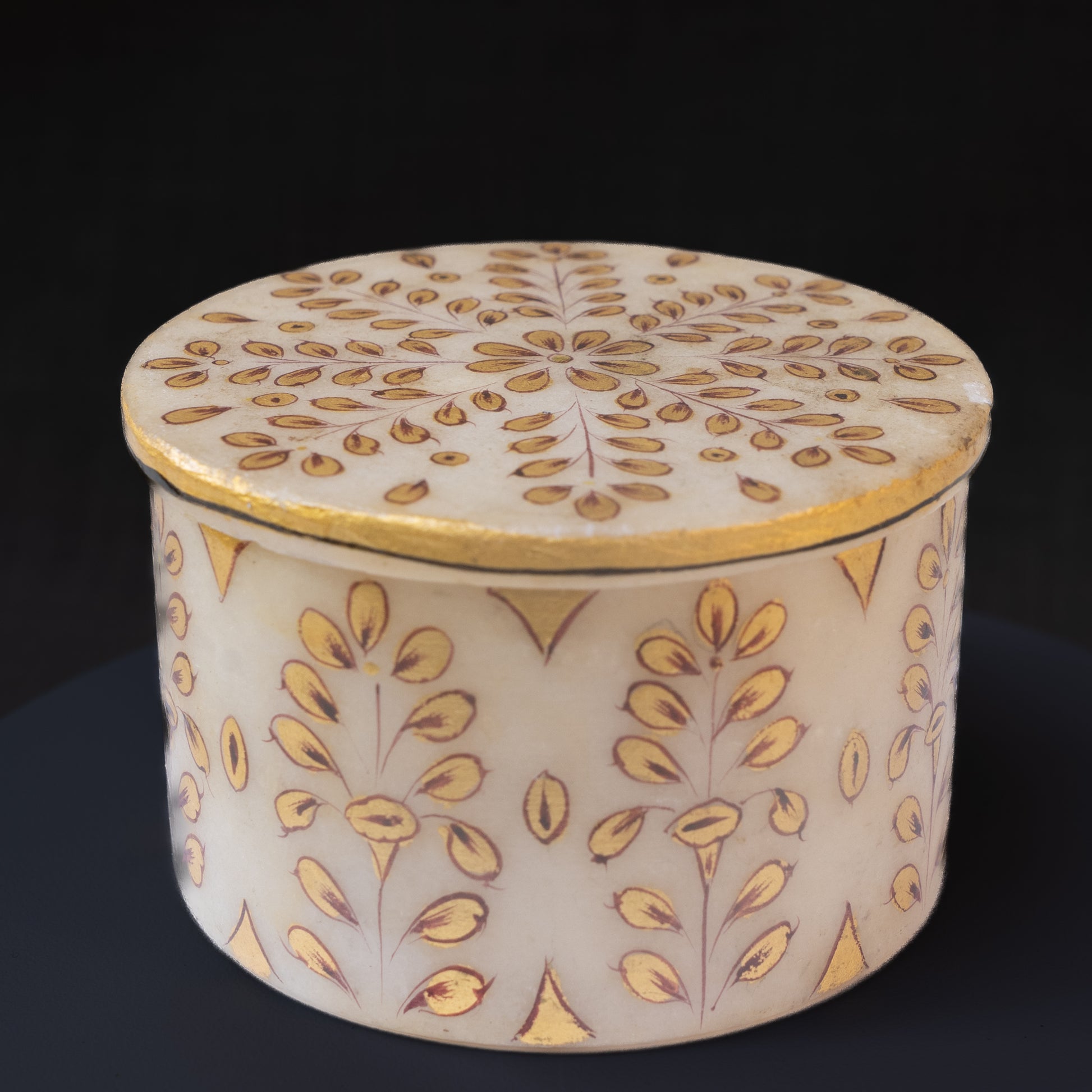 A delicate and luminous trinket box rendered in creamy alabaster-toned stone, inspired by the refined courtly aesthetics of the Mughal Empire. The cylindrical form is adorned with hand-painted foliate motifs in stylized palmettes and floral buds, executed in warm crimson and gilded hues, echoing the symmetrical geometry of imperial Mughal ornamentation. The lid is rimmed with gilt detailing, lending an added sense of luxury to this petite object. Whether used to hold rings, prayer beads, or treasured keepsakes, this box channels the opulence of Mughal ateliers—where artisans merged Persianate forms with indigenous materials to create objects of sublime elegance. A quiet yet potent testament to the enduring appeal of Indo-Islamic design in decorative arts.
