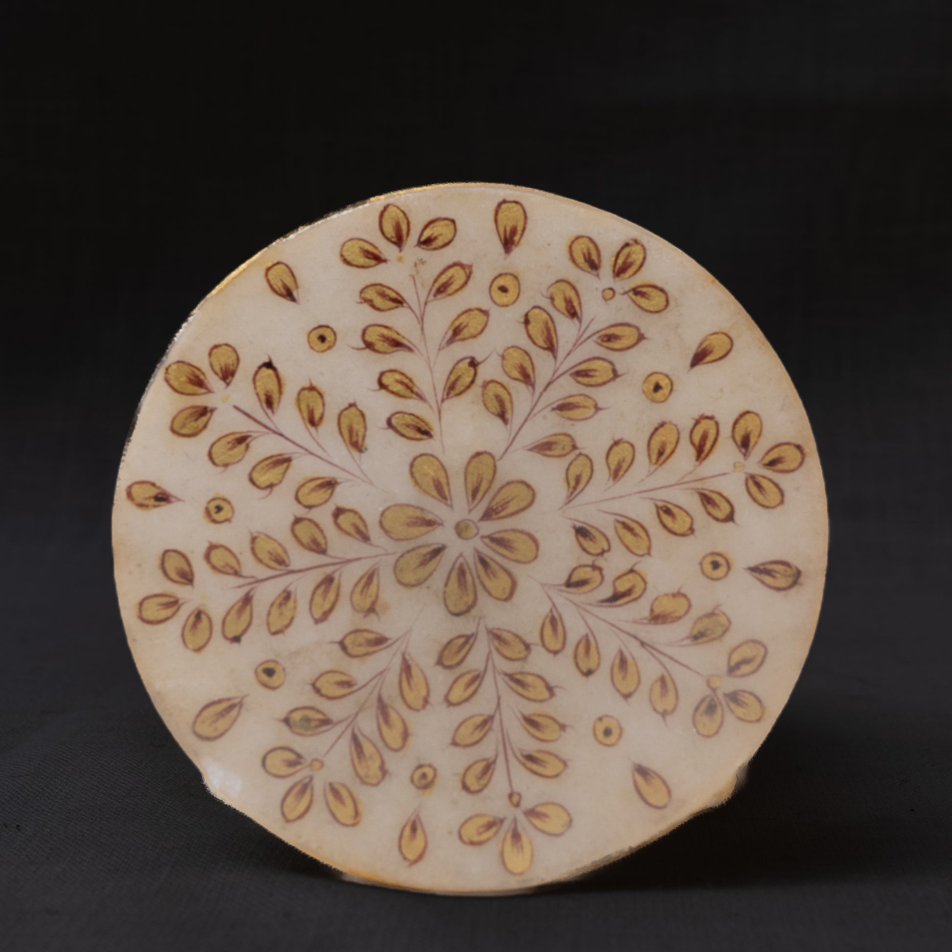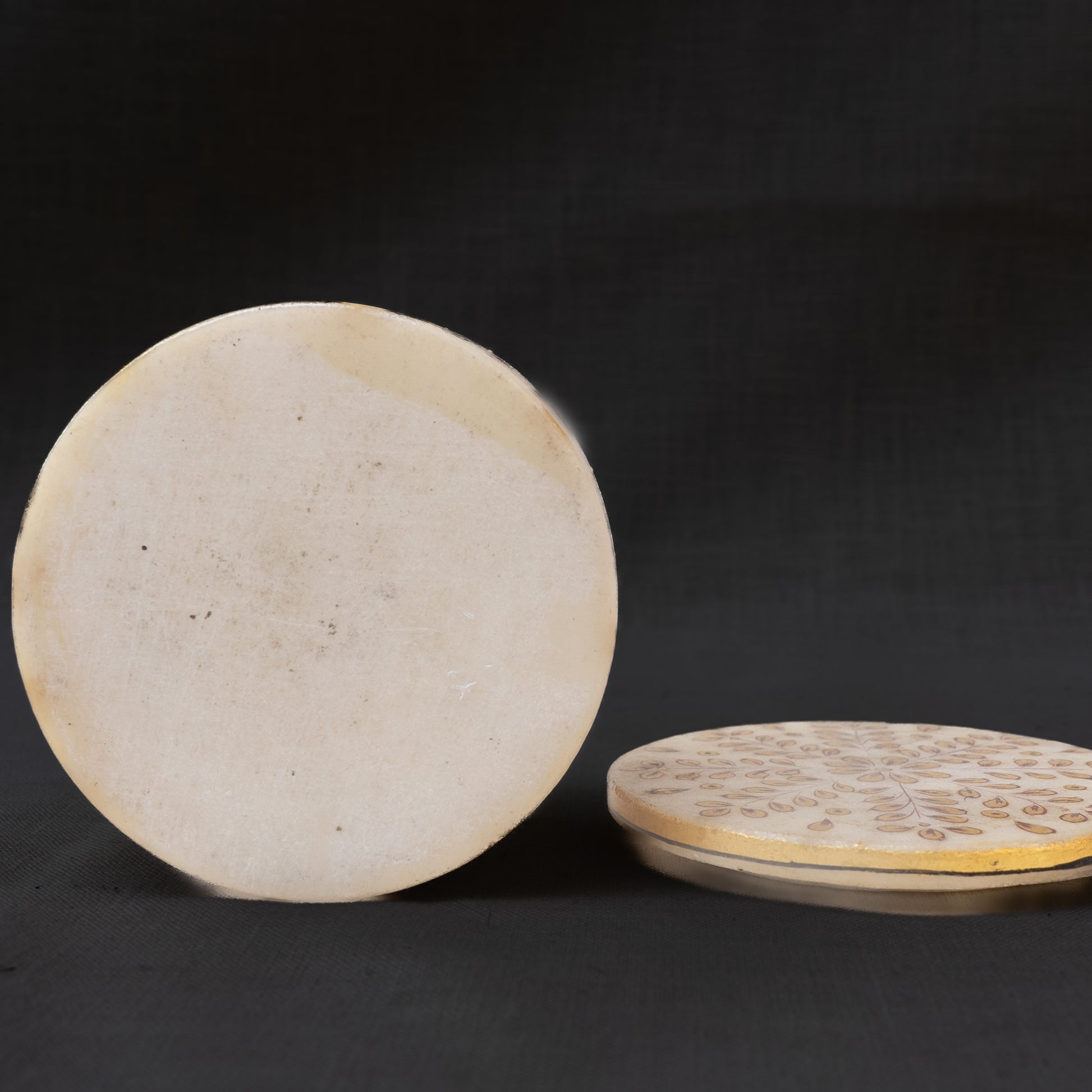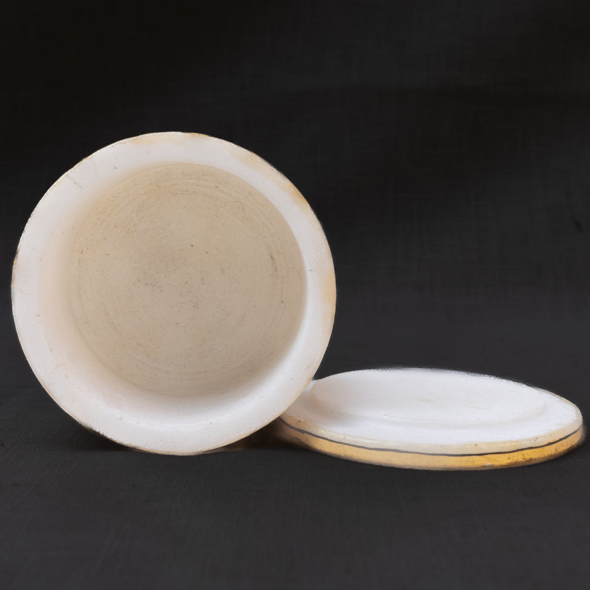 A delicate and luminous trinket box rendered in creamy alabaster-toned stone, inspired by the refined courtly aesthetics of the Mughal Empire. The cylindrical form is adorned with hand-painted foliate motifs in stylized palmettes and floral buds, executed in warm crimson and gilded hues, echoing the symmetrical geometry of imperial Mughal ornamentation. The lid is rimmed with gilt detailing, lending an added sense of luxury to this petite object. Whether used to hold rings, prayer beads, or treasured keepsakes, this box channels the opulence of Mughal ateliers—where artisans merged Persianate forms with indigenous materials to create objects of sublime elegance. A quiet yet potent testament to the enduring appeal of Indo-Islamic design in decorative arts.