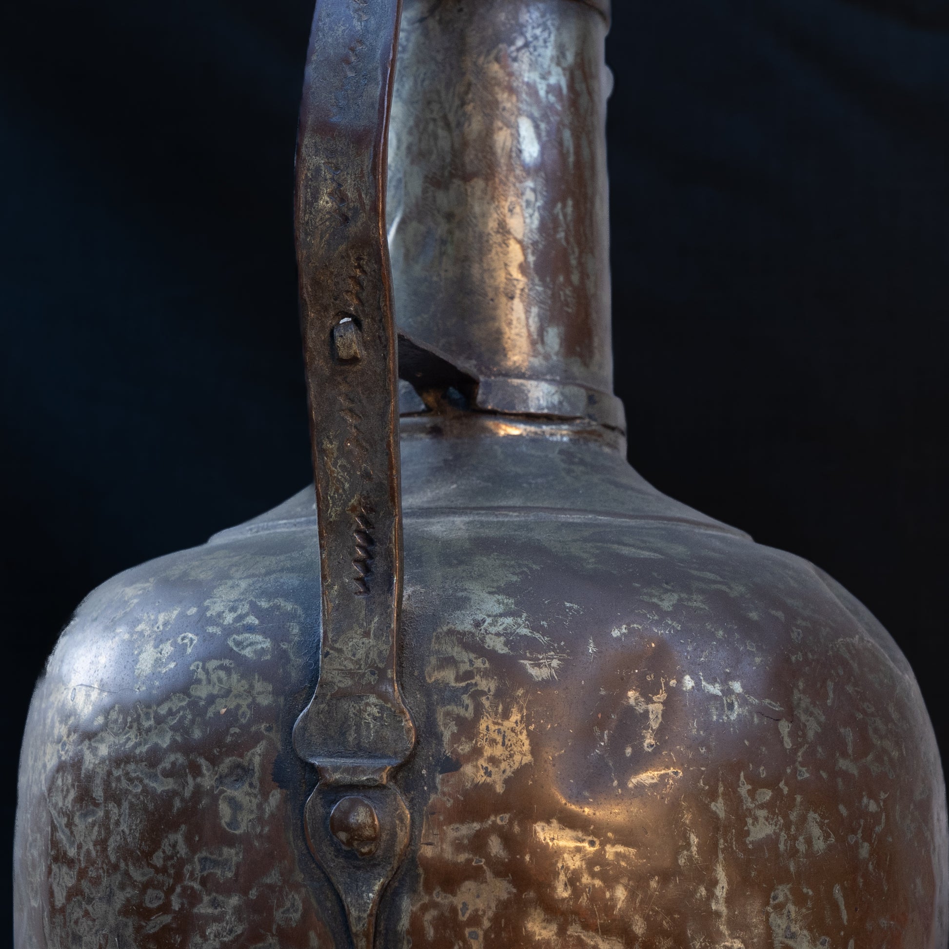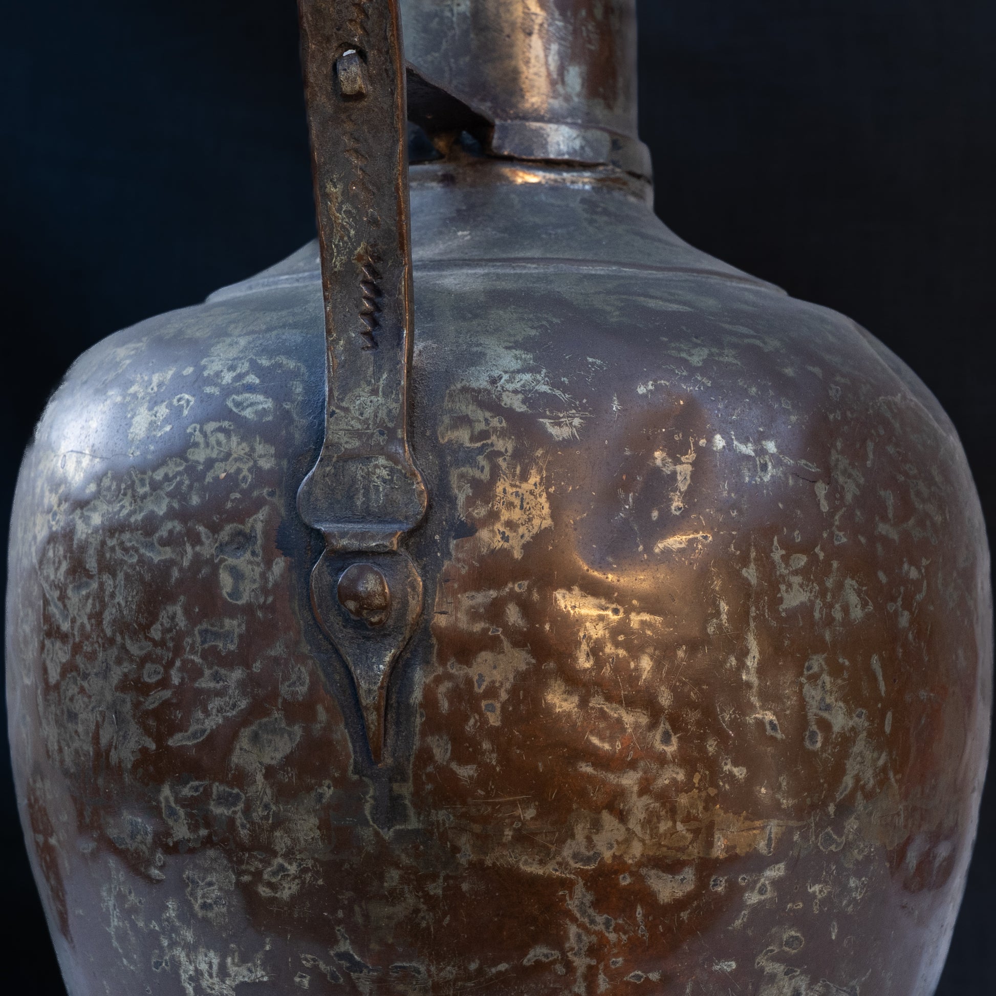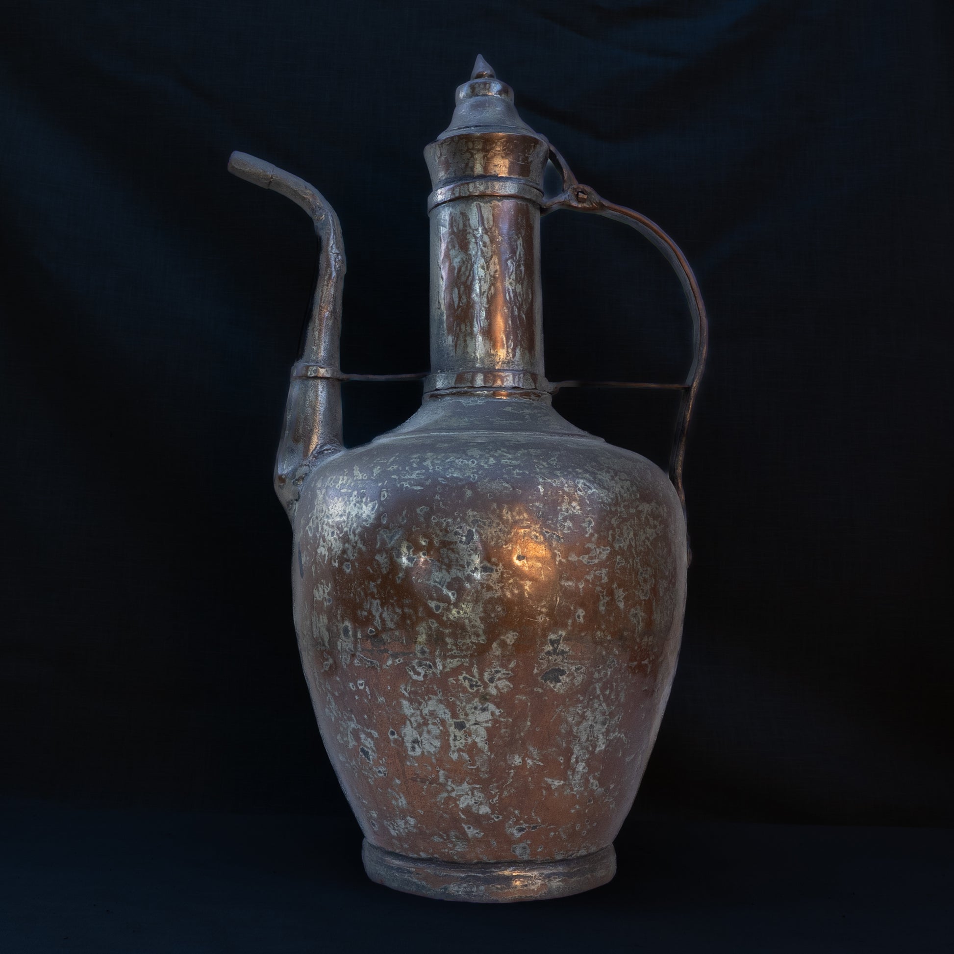 A large Ottoman ewer, likely 19th century, hand-forged in copper with a long tapering neck, curved handle, and elongated spout. The bulbous body, gently rounded and balanced atop a flat base, is typical of Anatolian and Levantine ewers used in domestic, hammam, and ceremonial settings. The patina—marked by age, oxidation, and gentle abrasions—evokes centuries of use and lends it a rich textural depth. These ewers (ibrik in Turkish) were essential in Ottoman daily ritual, particularly in the pouring of water for ablutions or in formal dining service. The domed lid and hinged finial, though slightly worn, speak to its original function as both utilitarian object and status symbol within the Ottoman household.