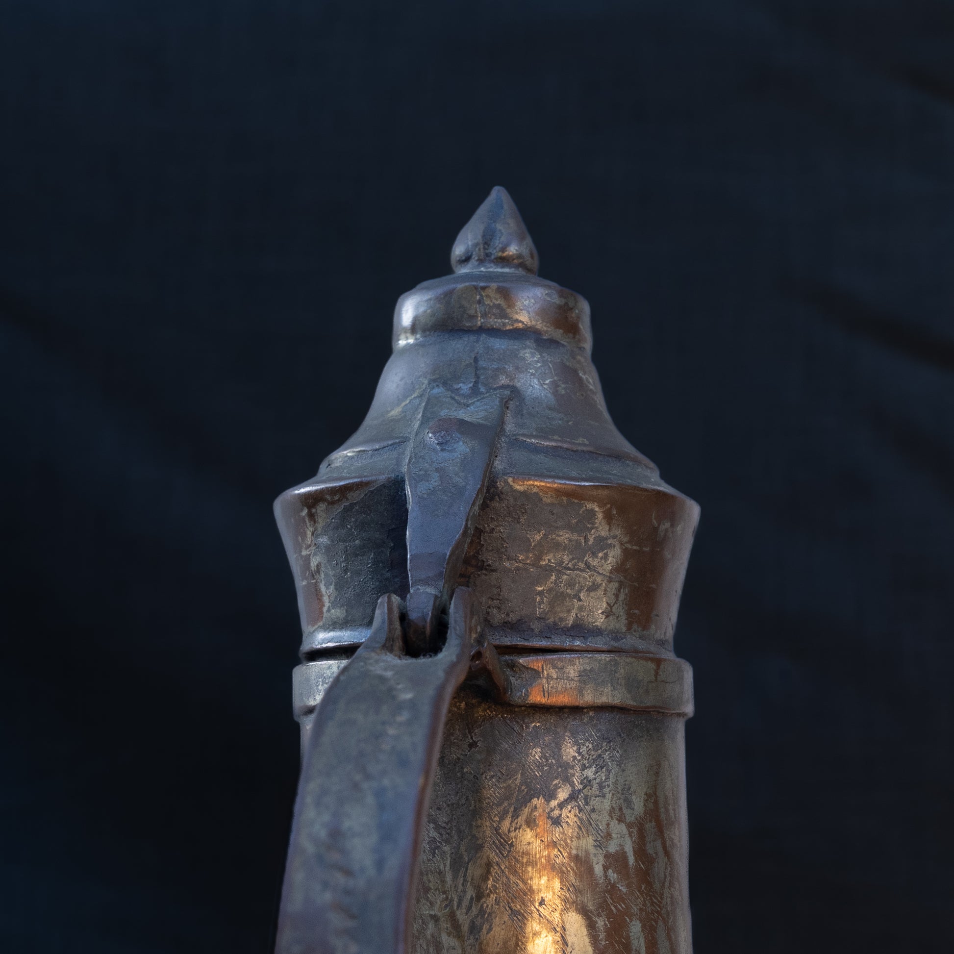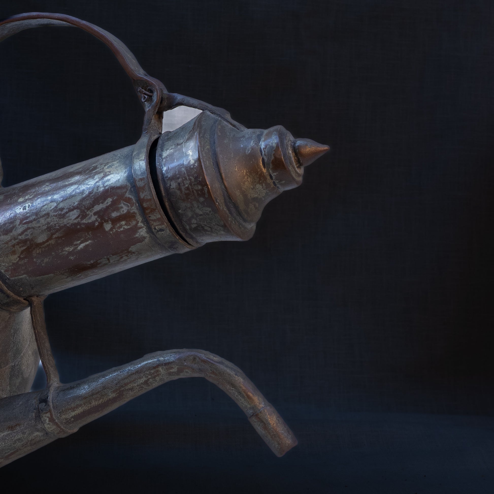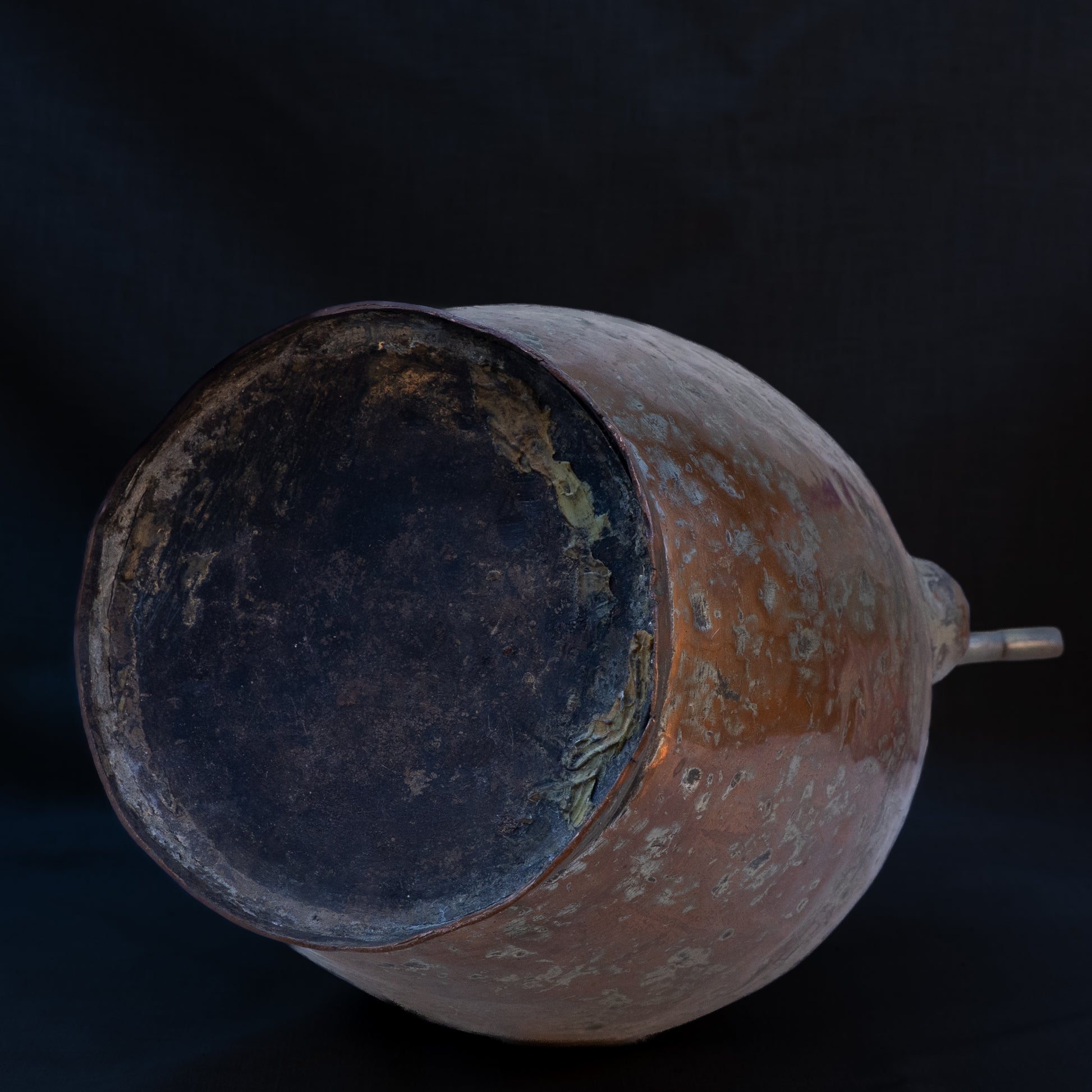A large Ottoman ewer, likely 19th century, hand-forged in copper with a long tapering neck, curved handle, and elongated spout. The bulbous body, gently rounded and balanced atop a flat base, is typical of Anatolian and Levantine ewers used in domestic, hammam, and ceremonial settings. The patina—marked by age, oxidation, and gentle abrasions—evokes centuries of use and lends it a rich textural depth. These ewers (ibrik in Turkish) were essential in Ottoman daily ritual, particularly in the pouring of water for ablutions or in formal dining service. The domed lid and hinged finial, though slightly worn, speak to its original function as both utilitarian object and status symbol within the Ottoman household.