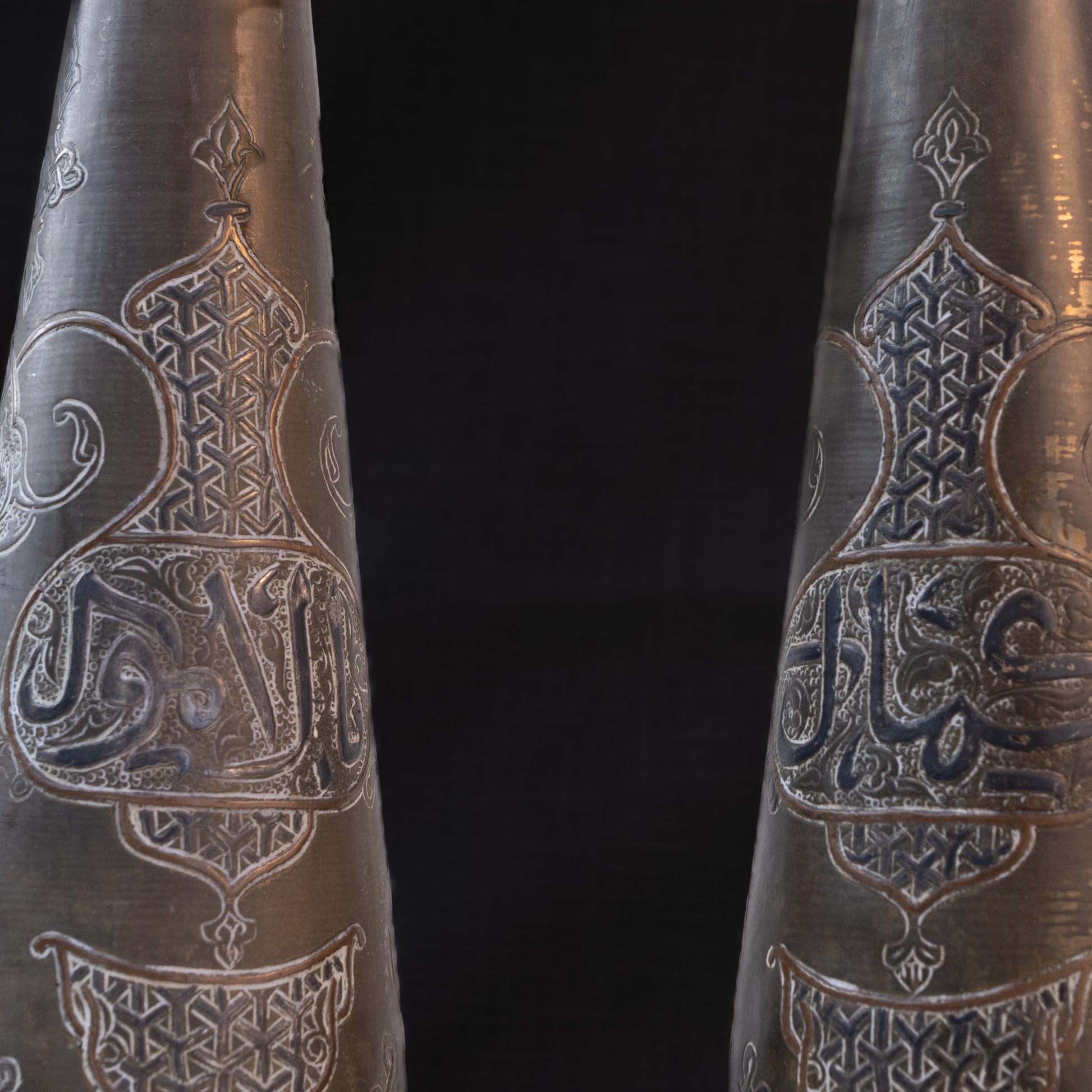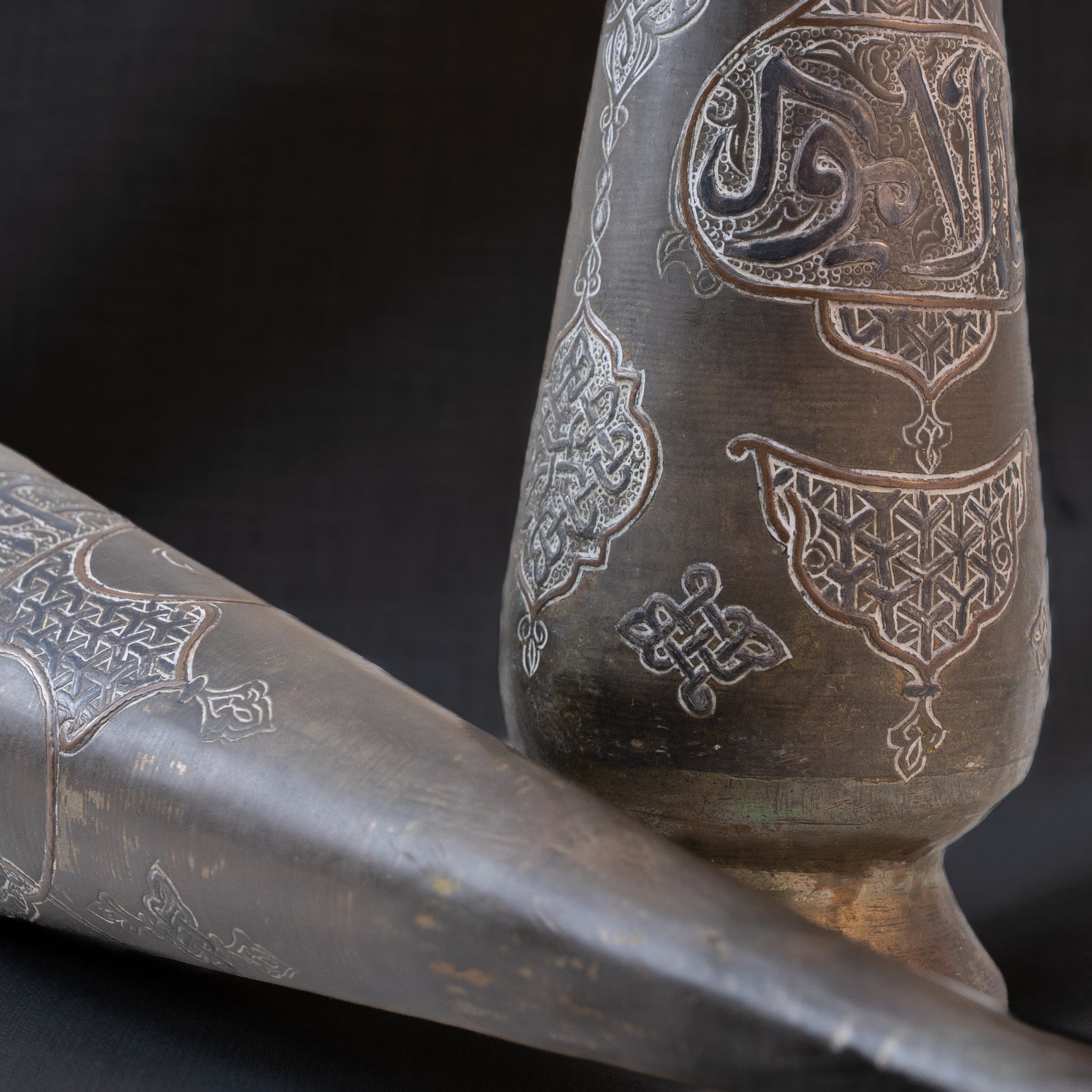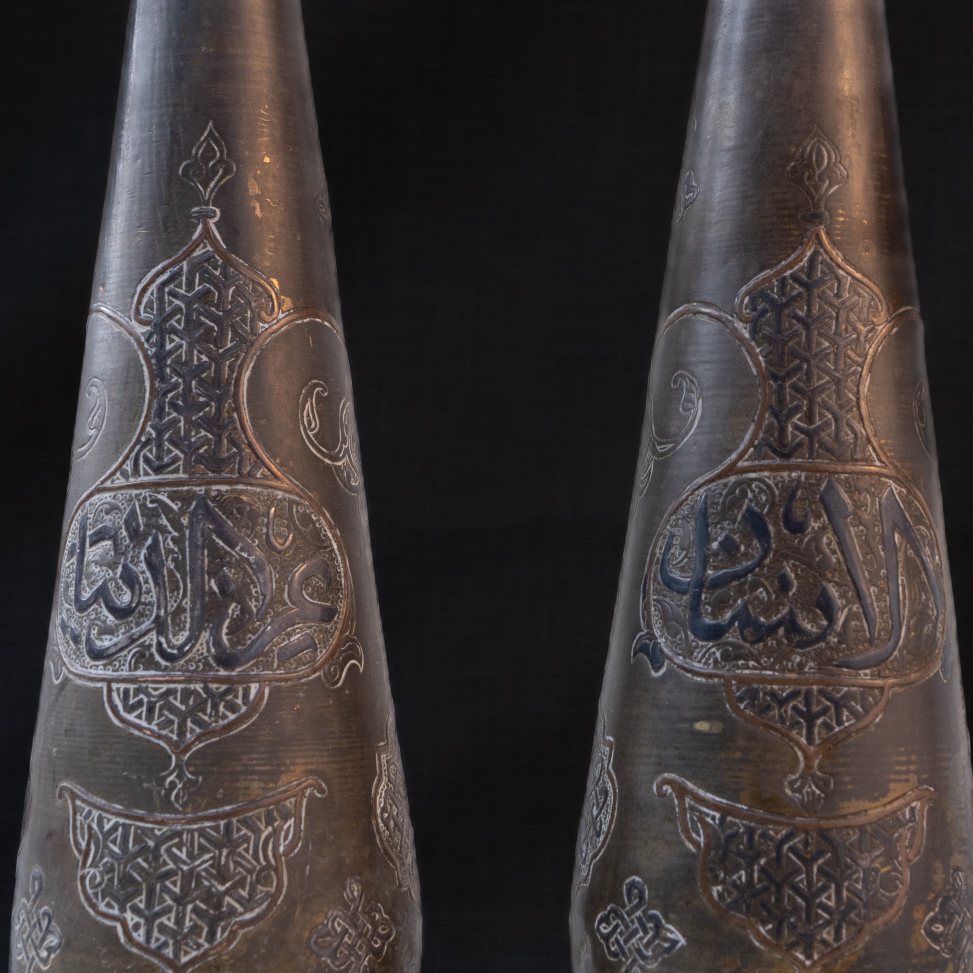 An elegant matched pair of tall Cairoware vases, Egypt, late 19th to early 20th century, crafted from hand-hammered brass with inlaid silver and copper decoration. The tapering bodies are etched with rich arabesques and filled with thuluth script cartouches, celebrating religious or poetic inscriptions in classical Arabic. The vases’ architectural silhouettes recall the minarets and domes of Mamluk Cairo, while the inlay technique reflects the revival of medieval craftsmanship during a time of nationalist renaissance. Each surface invites close reading, both literal and symbolic, as Cairo’s famed metalworkers sought to reclaim an artistic identity rooted in dynastic grandeur and calligraphic splendor.