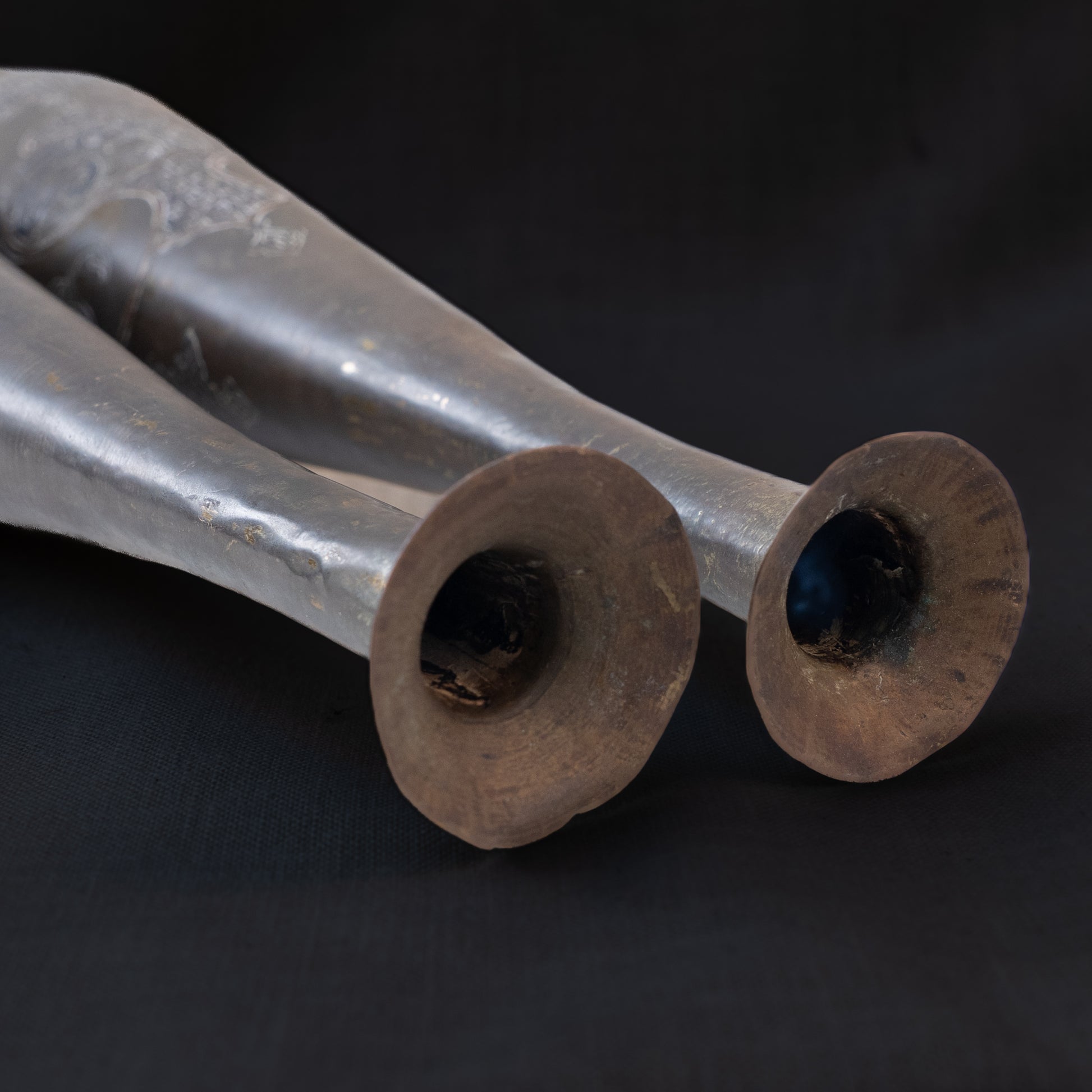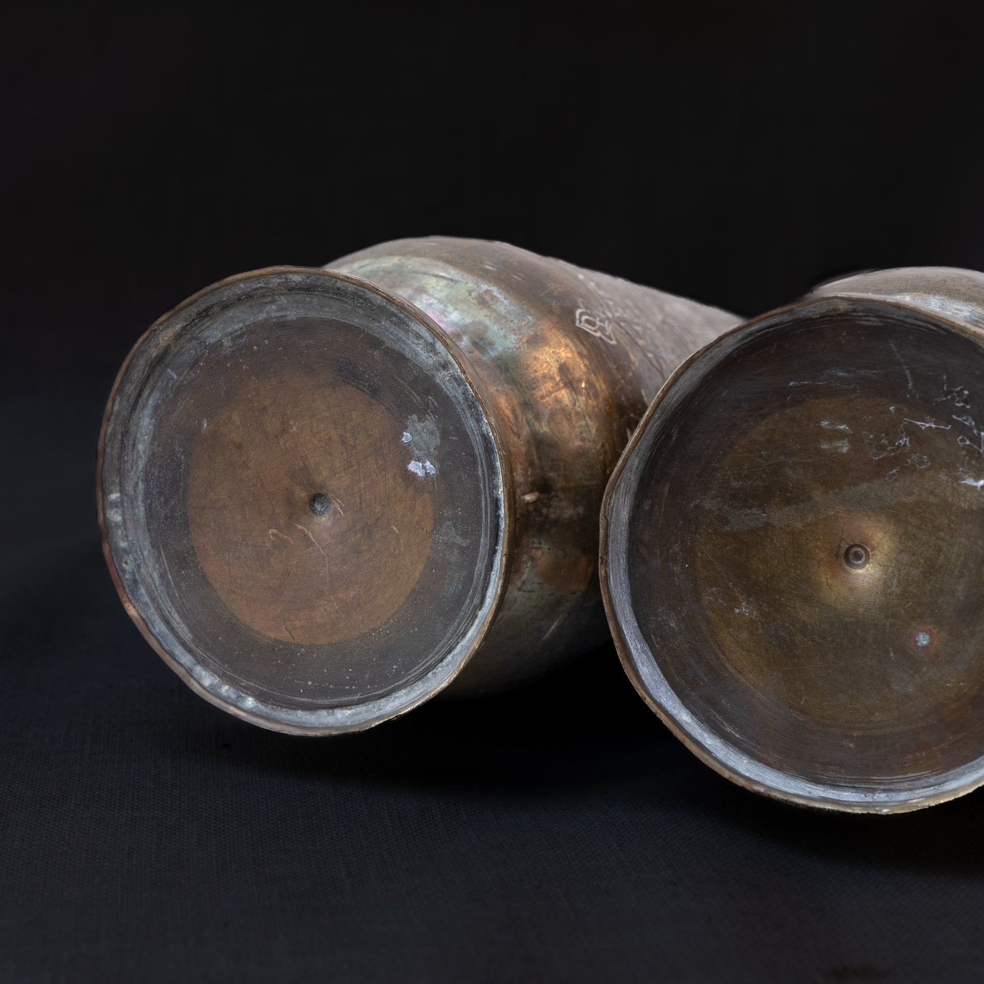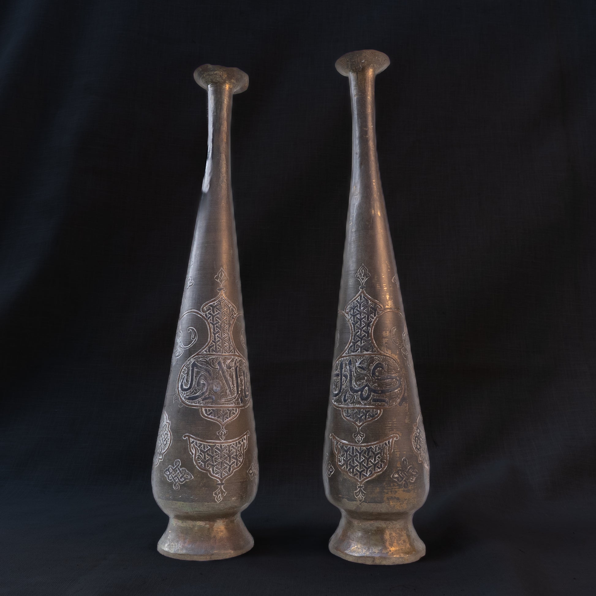 An elegant matched pair of tall Cairoware vases, Egypt, late 19th to early 20th century, crafted from hand-hammered brass with inlaid silver and copper decoration. The tapering bodies are etched with rich arabesques and filled with thuluth script cartouches, celebrating religious or poetic inscriptions in classical Arabic. The vases’ architectural silhouettes recall the minarets and domes of Mamluk Cairo, while the inlay technique reflects the revival of medieval craftsmanship during a time of nationalist renaissance. Each surface invites close reading, both literal and symbolic, as Cairo’s famed metalworkers sought to reclaim an artistic identity rooted in dynastic grandeur and calligraphic splendor.