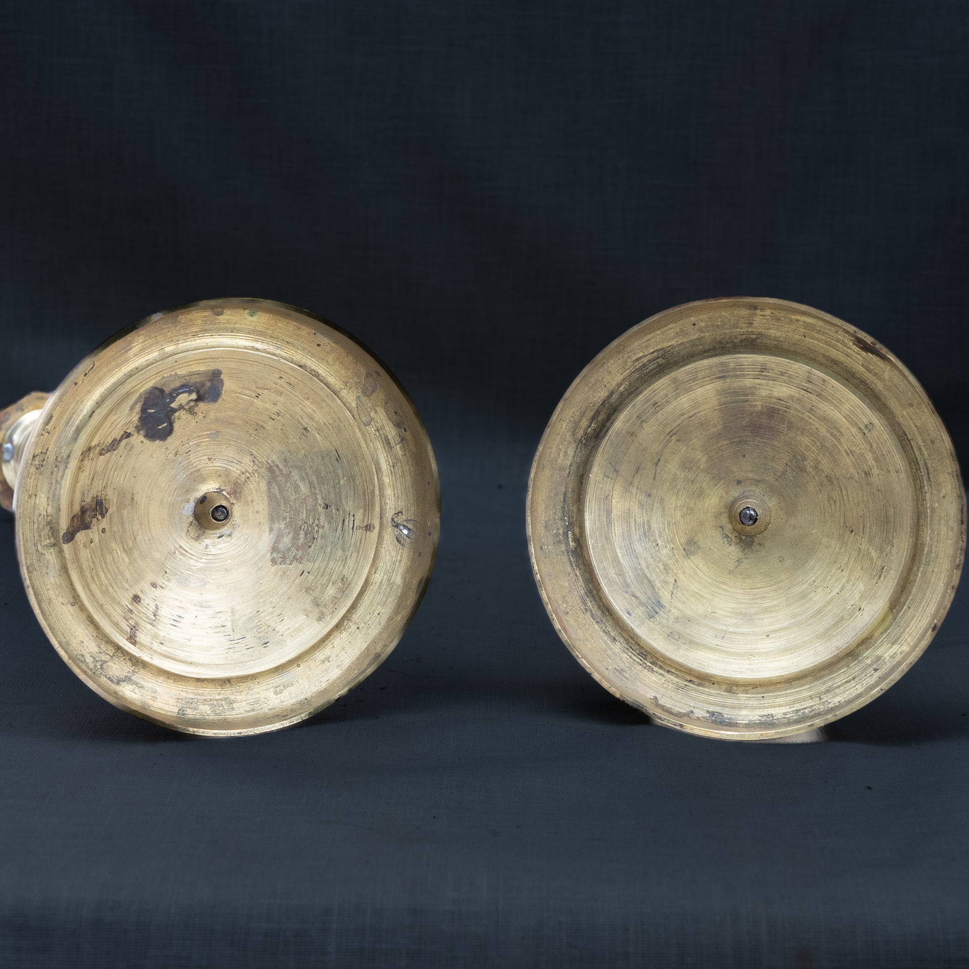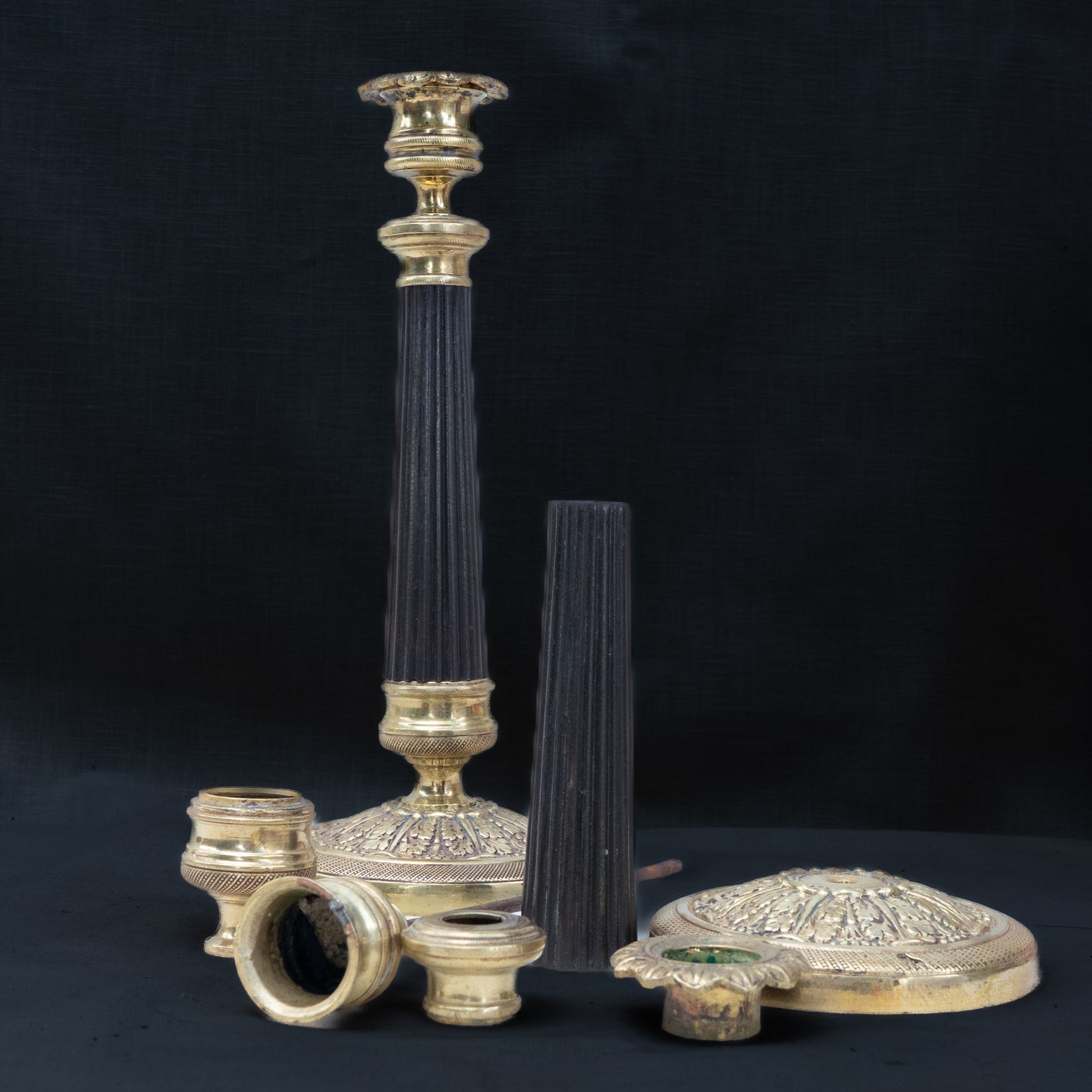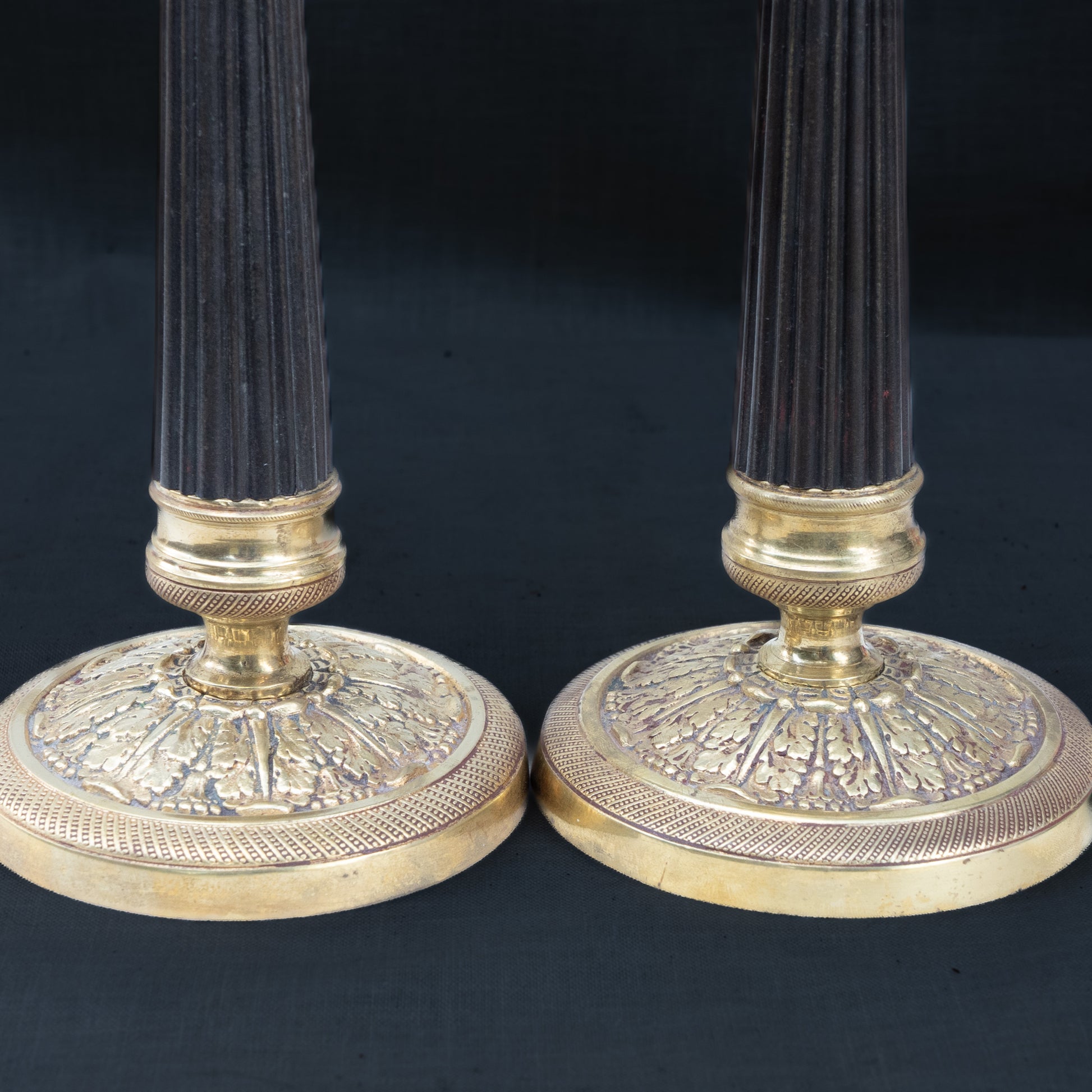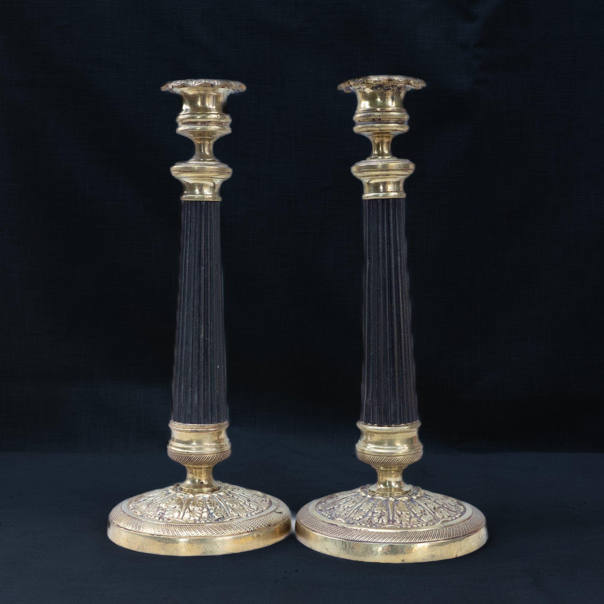 A refined pair of Empire Revival candlesticks, likely French or Northern European, late 19th century. Cast in a combination of gilt bronze and black-lacquered metal, these candlesticks exhibit all the hallmarks of the Napoleonic Empire aesthetic: vertical fluting, stepped circular bases with laurel wreath engravings, and classical columnar shafts. The contrast between the matte black and gleaming gilt evokes the severe elegance of Directoire taste, which sought to revive Roman imperial grandeur through a neoclassical lens. Tall and architectural, this pair brings gravitas to any mantle or formal dining table, embodying balance, symmetry, and enduring refinement.