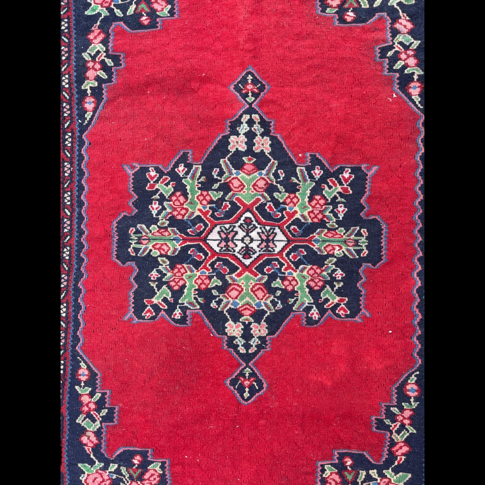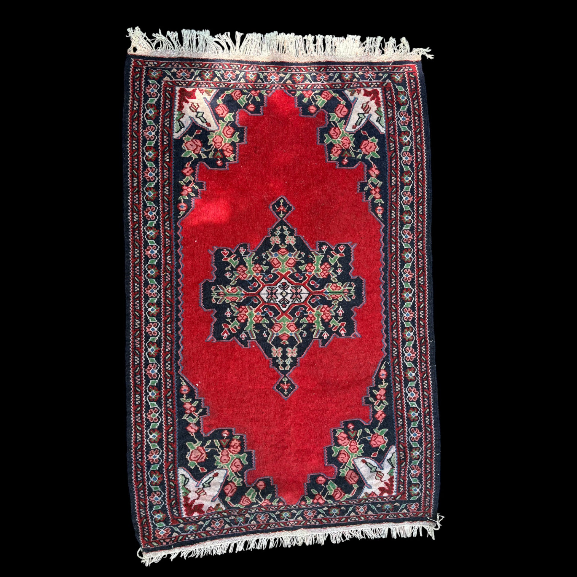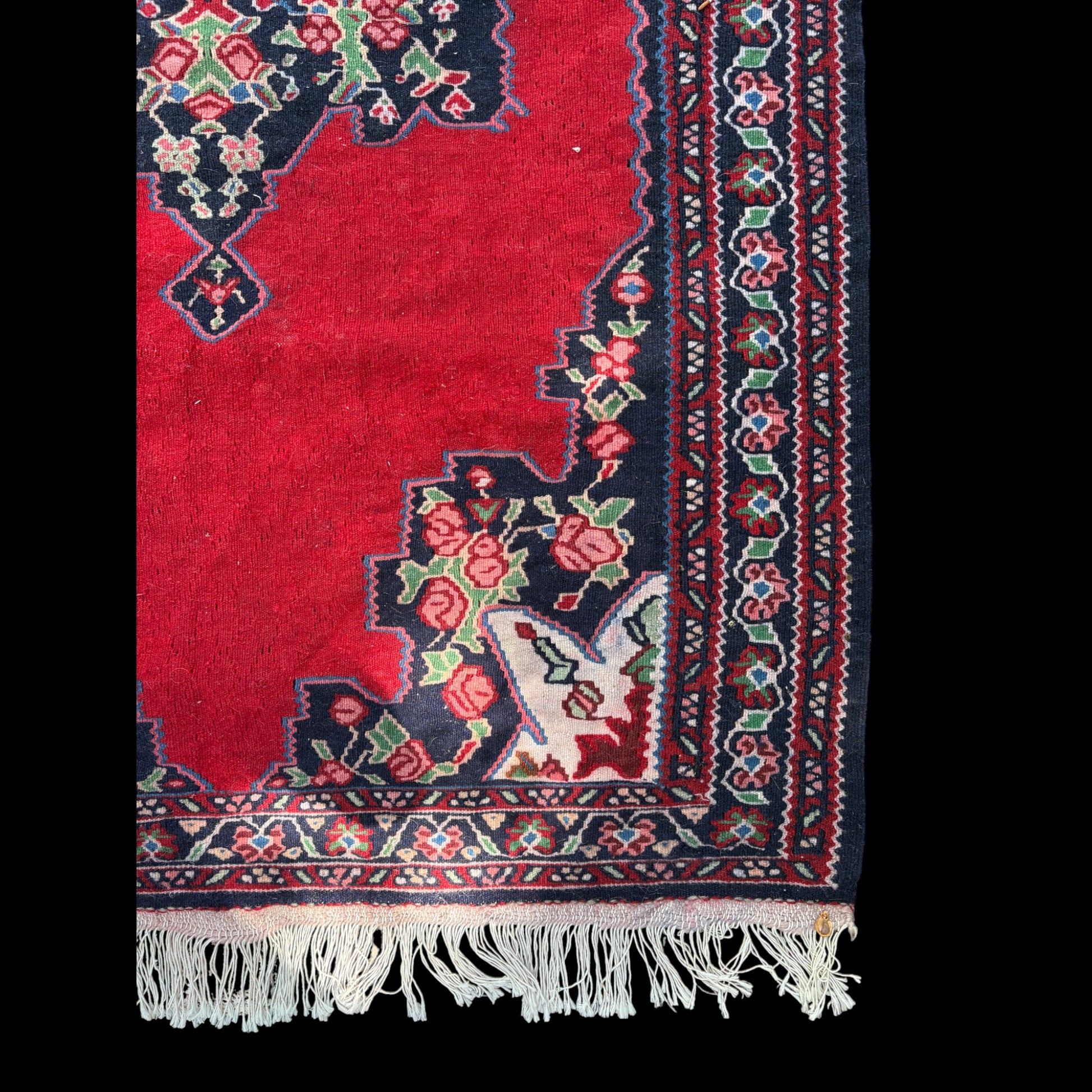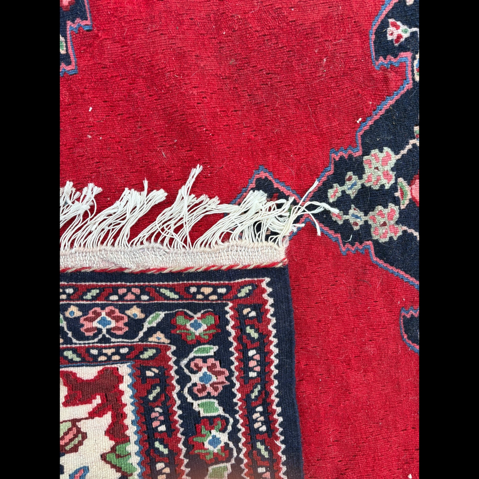 This striking Persian kilim is a handwoven flatweave rug, likely from the mid-20th century, showcasing a vibrant red field with a central stepped medallion in midnight blue, adorned with stylized floral motifs in ivory, green, and rose. The corners echo the central design, framed by multiple guard borders featuring rosettes and vine scrolls in complementary tones. Its bold color contrast and geometric symmetry are characteristic of tribal or village weaving traditions, possibly from northwestern Iran. The visible weft lines and tight weave point to an authentic wool-on-wool construction, giving it both durability and softness underfoot. Kilims of this kind are not only functional floor coverings but also expressive textile art pieces — ideal for layering, wall display, or grounding a curated space with cultural depth.