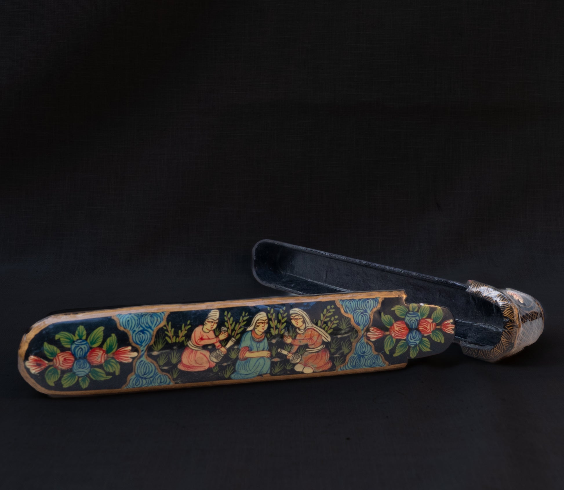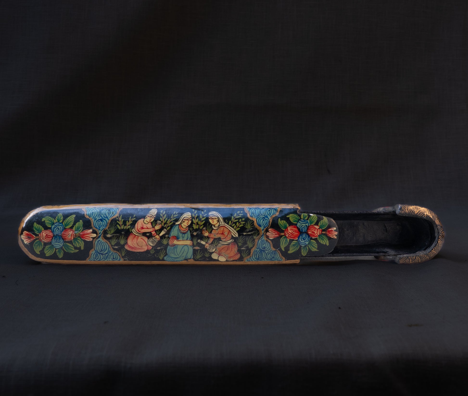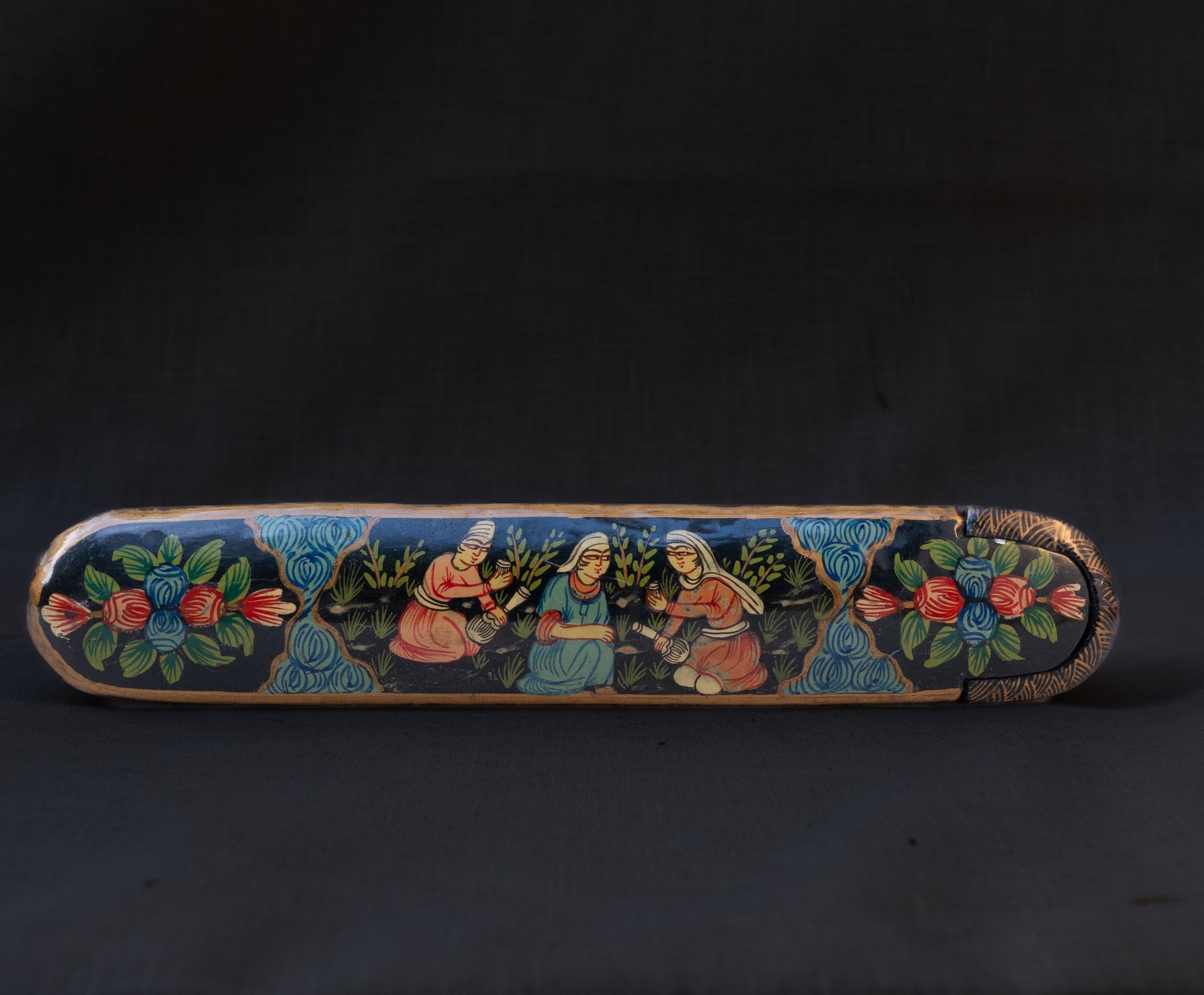 A fine late Qajar-era qalamdan (pen box), likely Persia, late 19th century, crafted in papier-mâché and painted with an exquisitely detailed figural scene beneath a polished lacquer finish. The lid depicts three elegantly robed women seated amidst a lush floral backdrop, engaged in intimate conversation and possibly partaking in wine—suggestive of a Bacchic gathering or poetic salon. Rendered in jewel-toned pigments with delicate gold highlights, their expressions are contemplative, their gestures graceful, embodying the refined literary and aesthetic culture of the Qajar court. Gilded borders frame the scene with arabesque motifs, while the interior and underside are lacquered in traditional deep black. As both a utilitarian object and a narrative artwork, this qalamdan embodies the fusion of calligraphic tradition, literary indulgence, and visual storytelling central to Persian artistic heritage.