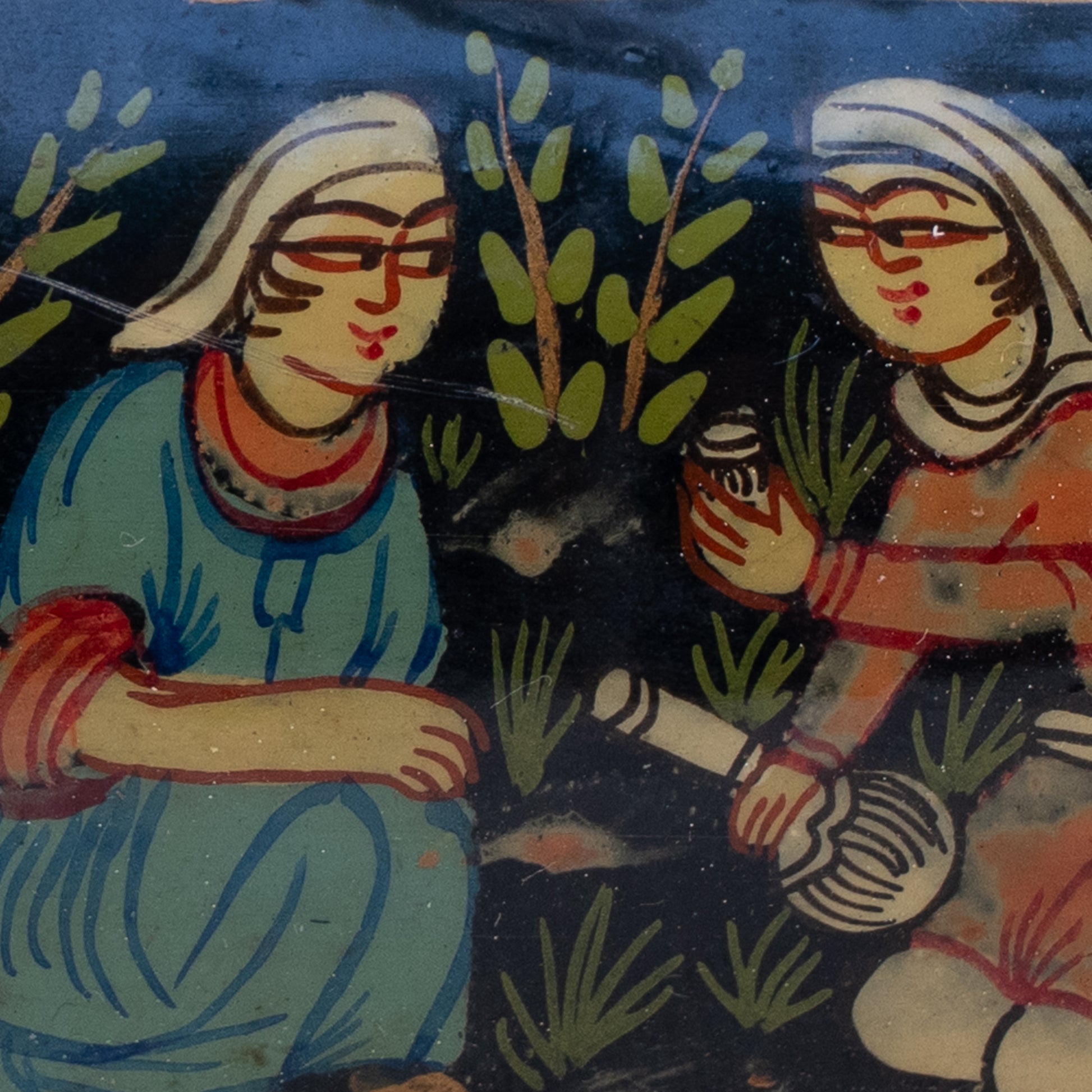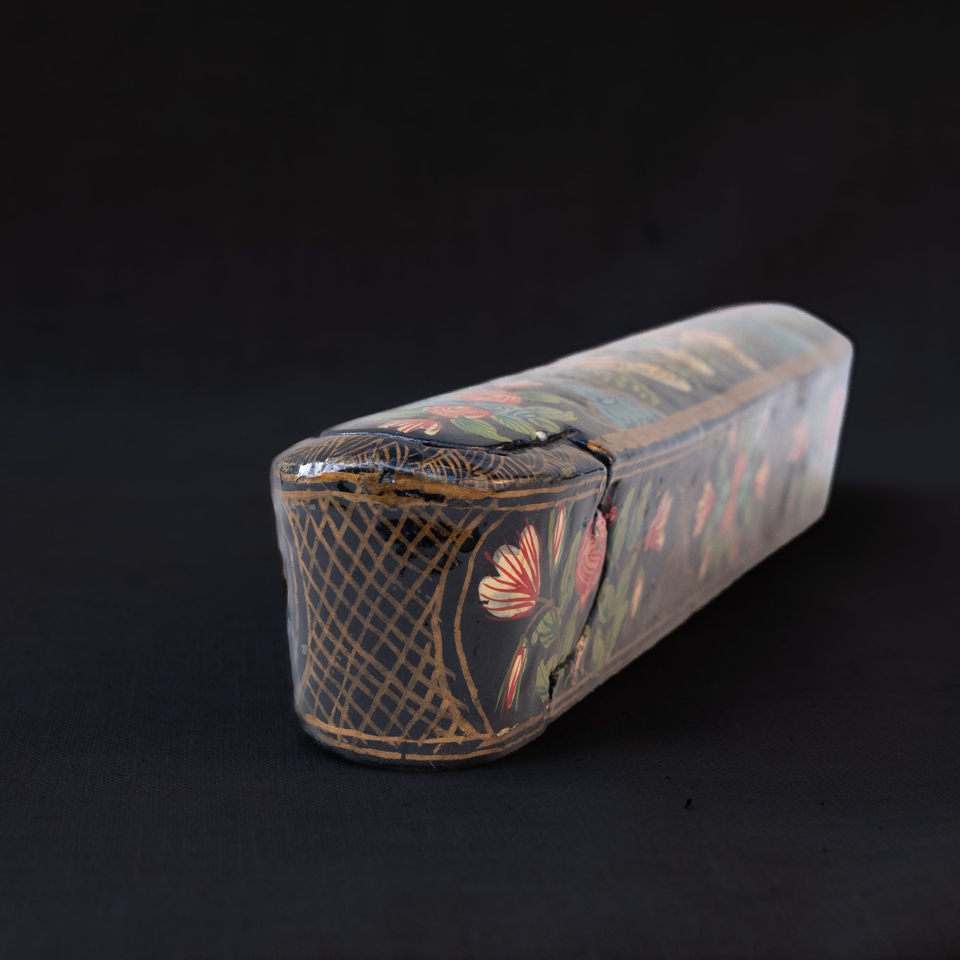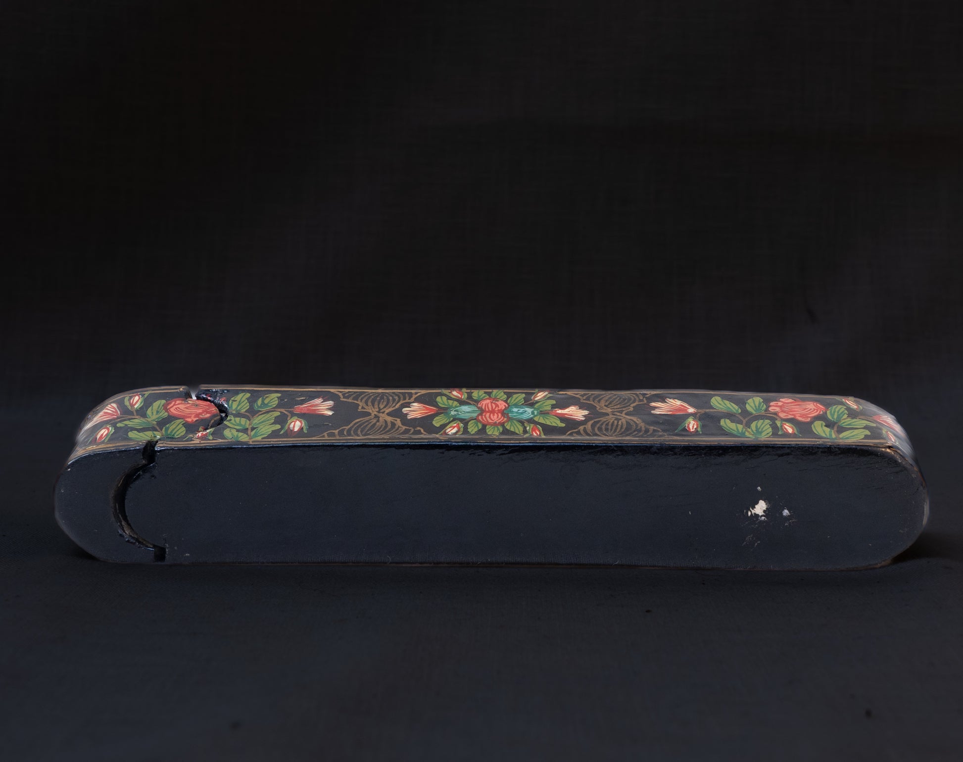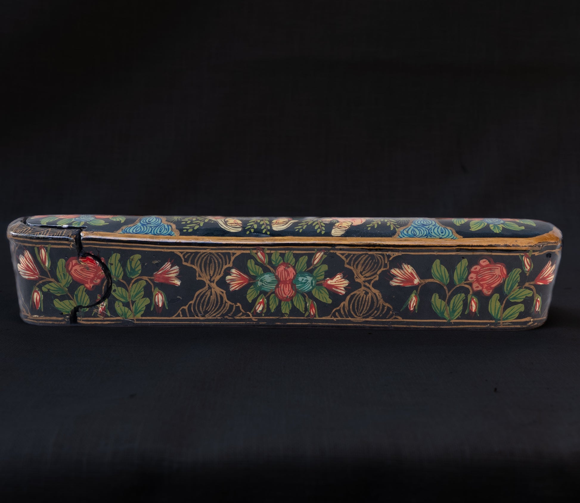 A fine late Qajar-era qalamdan (pen box), likely Persia, late 19th century, crafted in papier-mâché and painted with an exquisitely detailed figural scene beneath a polished lacquer finish. The lid depicts three elegantly robed women seated amidst a lush floral backdrop, engaged in intimate conversation and possibly partaking in wine—suggestive of a Bacchic gathering or poetic salon. Rendered in jewel-toned pigments with delicate gold highlights, their expressions are contemplative, their gestures graceful, embodying the refined literary and aesthetic culture of the Qajar court. Gilded borders frame the scene with arabesque motifs, while the interior and underside are lacquered in traditional deep black. As both a utilitarian object and a narrative artwork, this qalamdan embodies the fusion of calligraphic tradition, literary indulgence, and visual storytelling central to Persian artistic heritage.