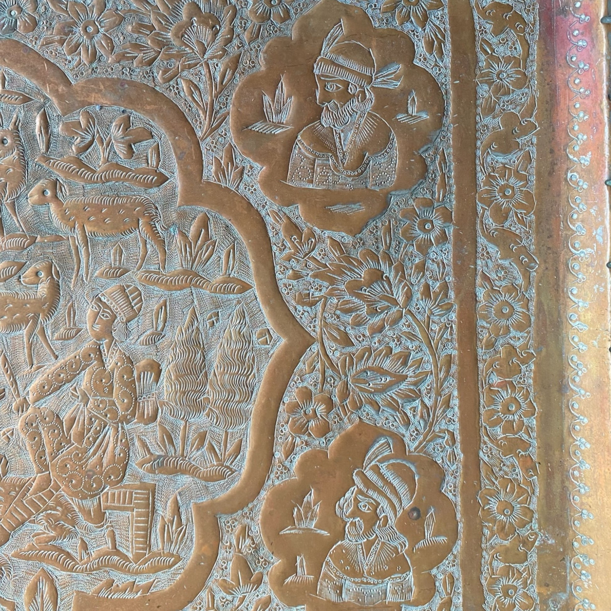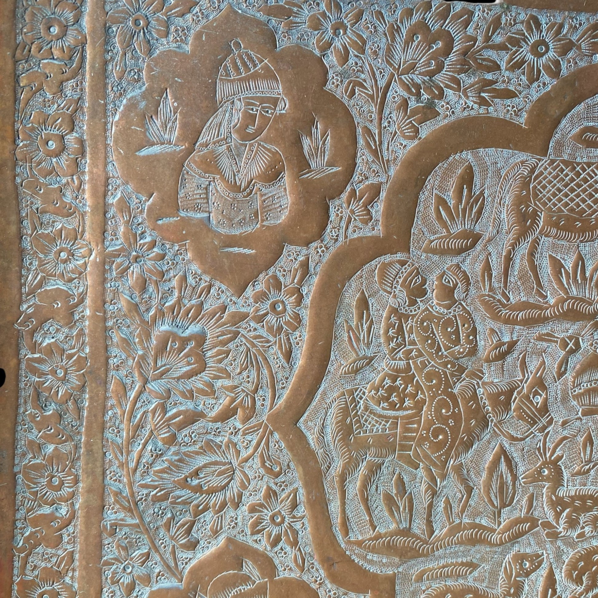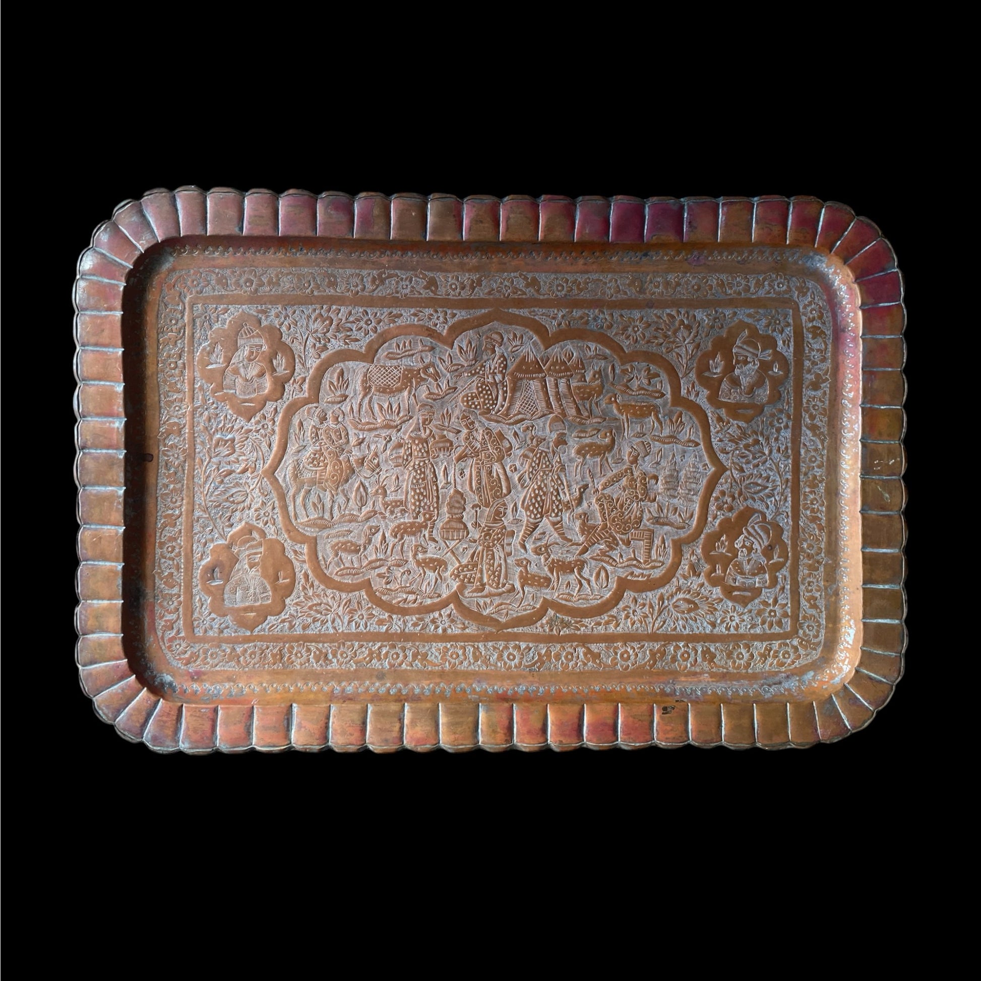 Immerse yourself in the splendor of Persian artistry with this rectangular Qajar copper tray. Each corner is adorned with separate depictions of busts, adding a touch of regal elegance to the design. At the center, a classical Persian scene unfolds—a captivating narrative of tents and travelers, intricately crafted to evoke the essence of ancient storytelling. The rich patina of copper lends a timeless allure to this masterpiece, showcasing the skillful handiwork and attention to detail characteristic of Qajar craftsmanship. Whether displayed as a focal point or used for serving, this tray invites you to marvel at its beauty and historical significance. Experience the enchanting world of Persian culture and history with a piece that captures the spirit of tradition and artistic excellence.