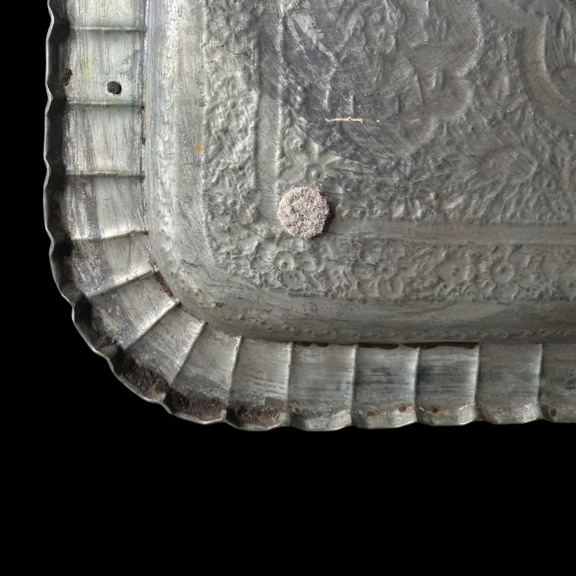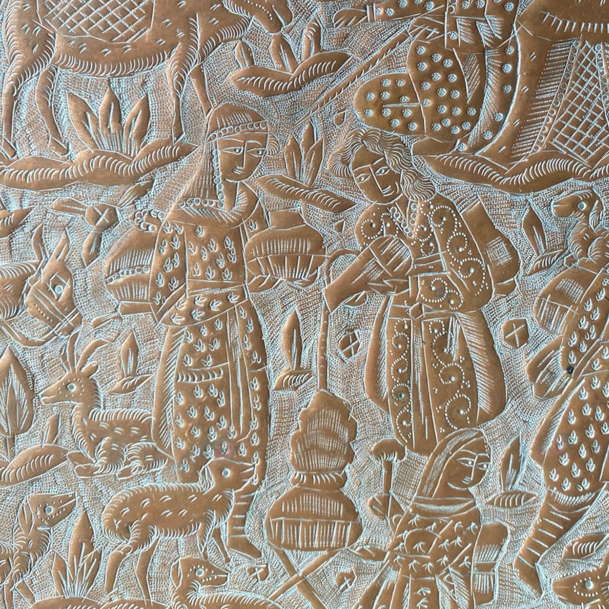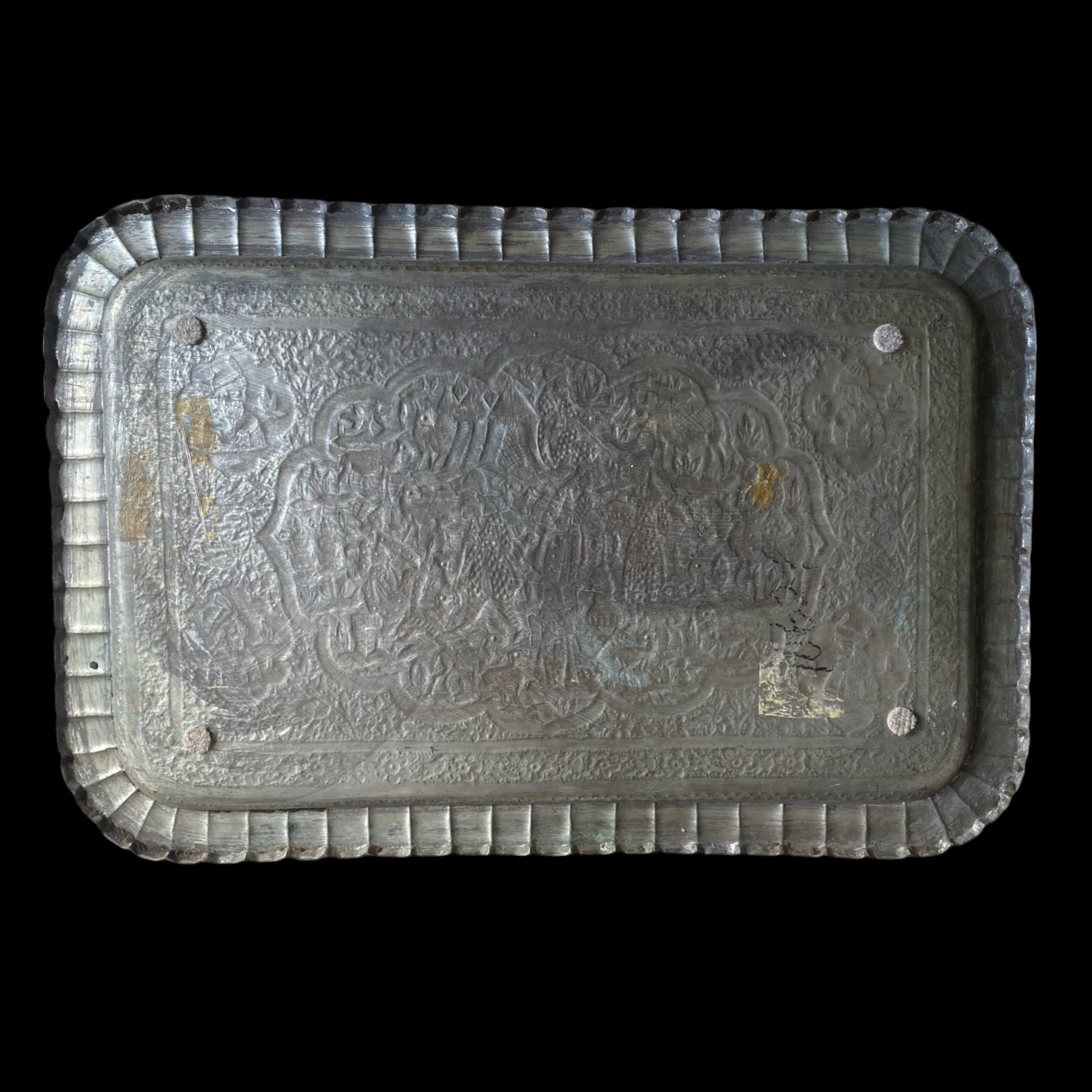 Immerse yourself in the splendor of Persian artistry with this rectangular Qajar copper tray. Each corner is adorned with separate depictions of busts, adding a touch of regal elegance to the design. At the center, a classical Persian scene unfolds—a captivating narrative of tents and travelers, intricately crafted to evoke the essence of ancient storytelling. The rich patina of copper lends a timeless allure to this masterpiece, showcasing the skillful handiwork and attention to detail characteristic of Qajar craftsmanship. Whether displayed as a focal point or used for serving, this tray invites you to marvel at its beauty and historical significance. Experience the enchanting world of Persian culture and history with a piece that captures the spirit of tradition and artistic excellence.