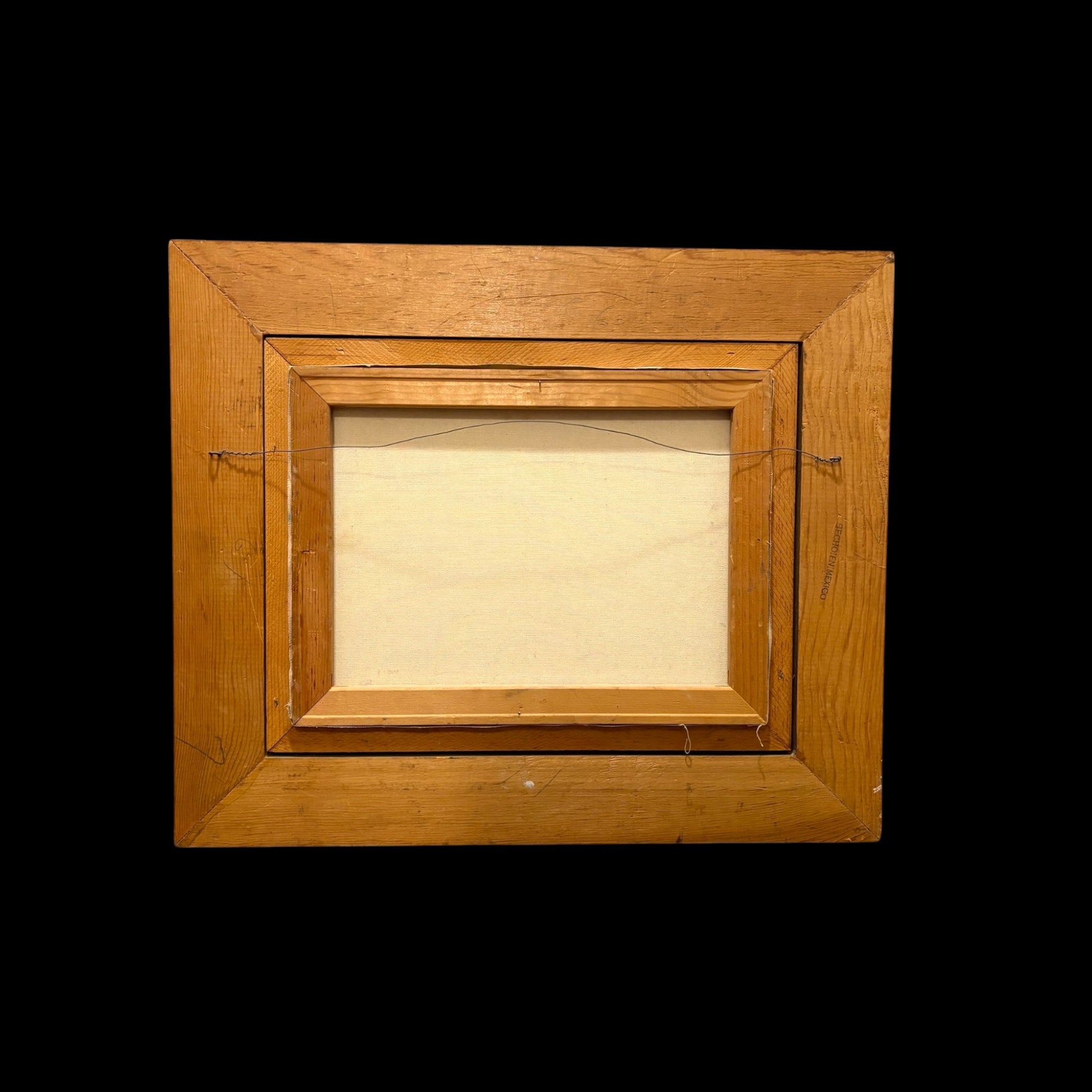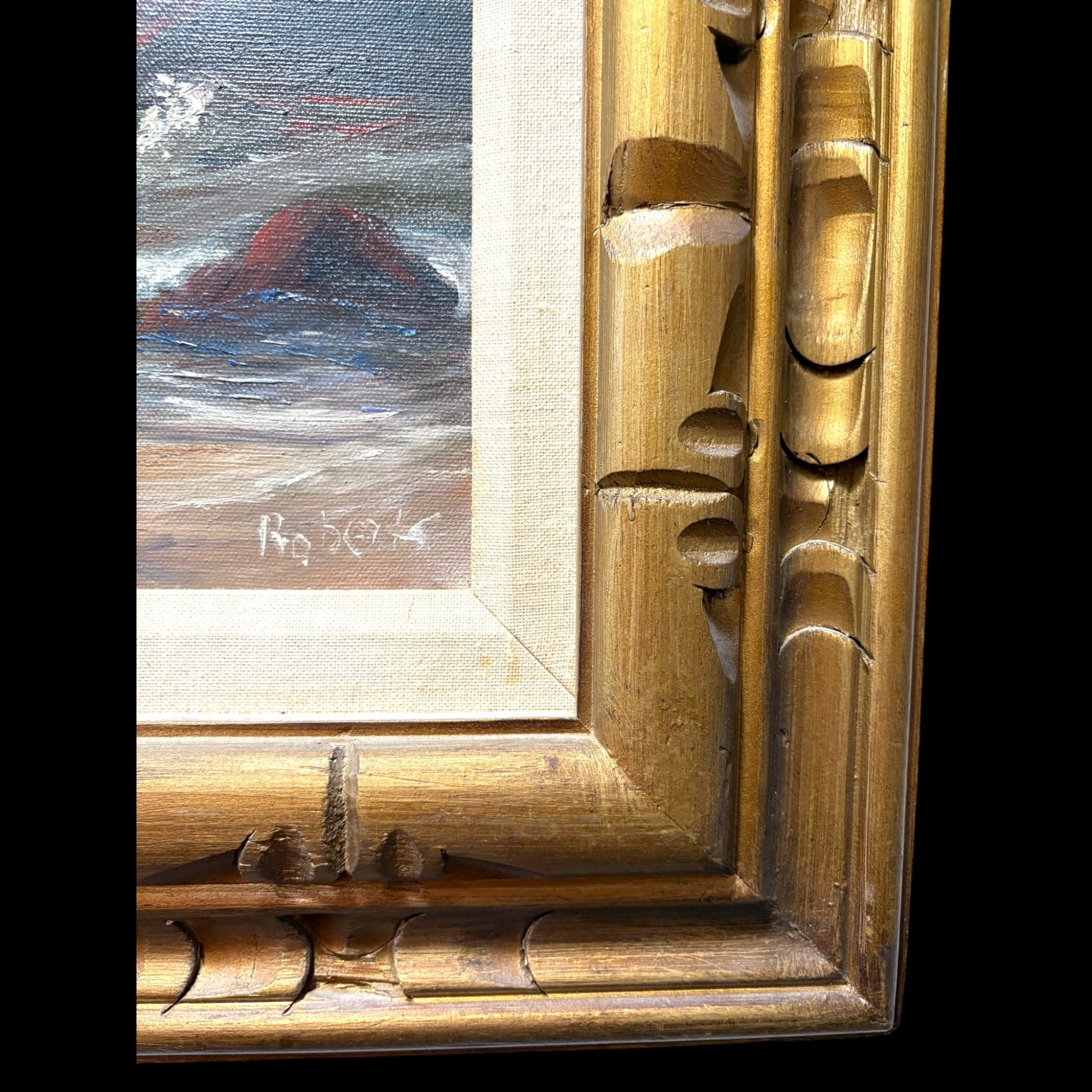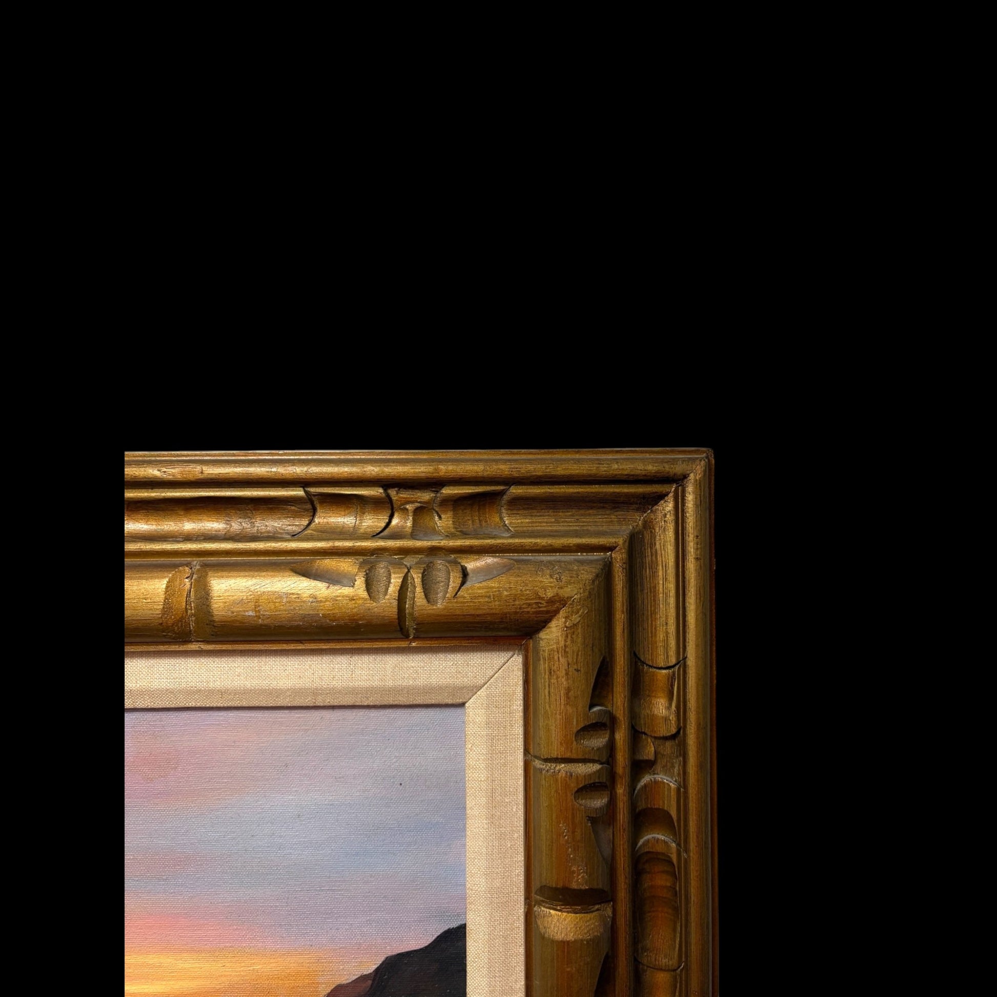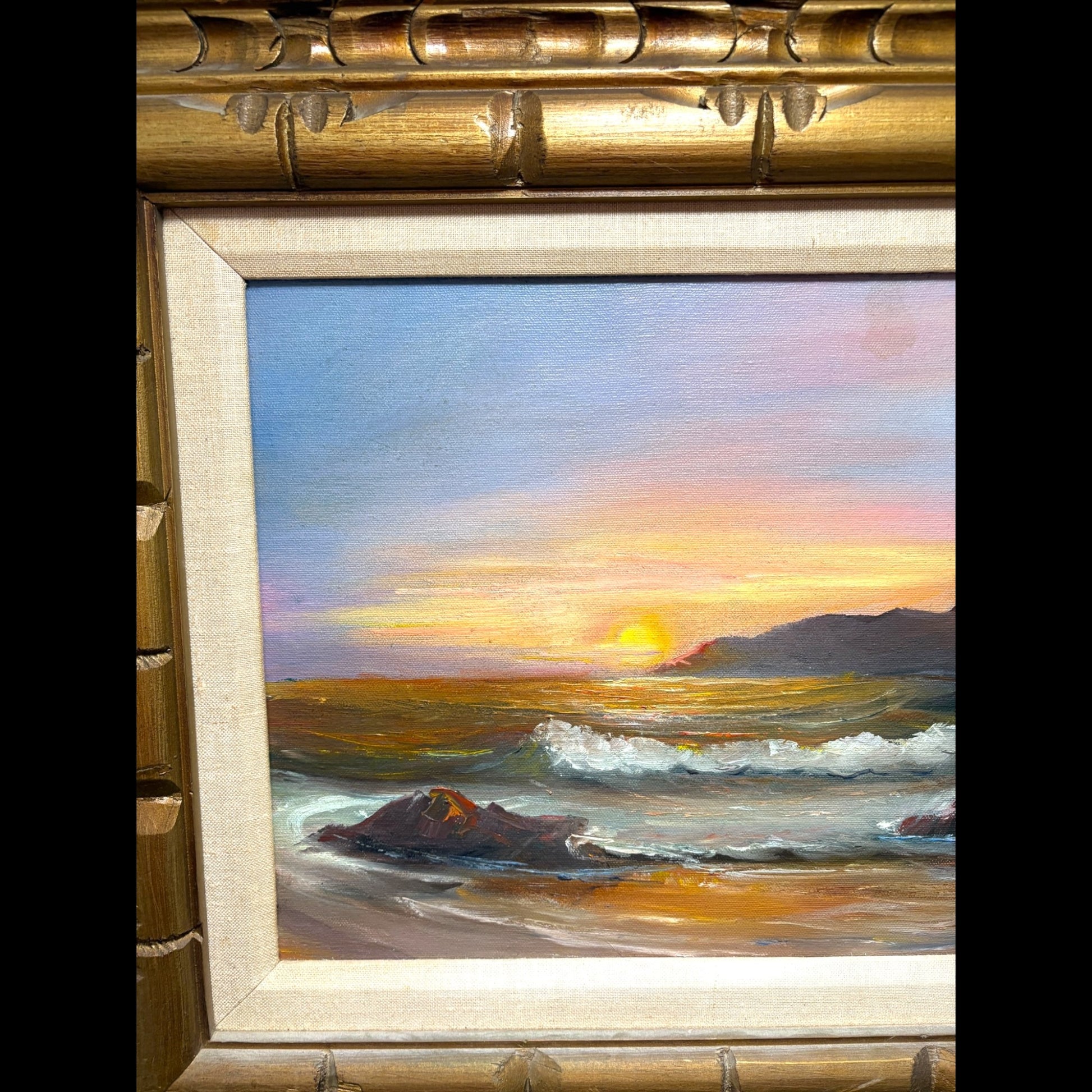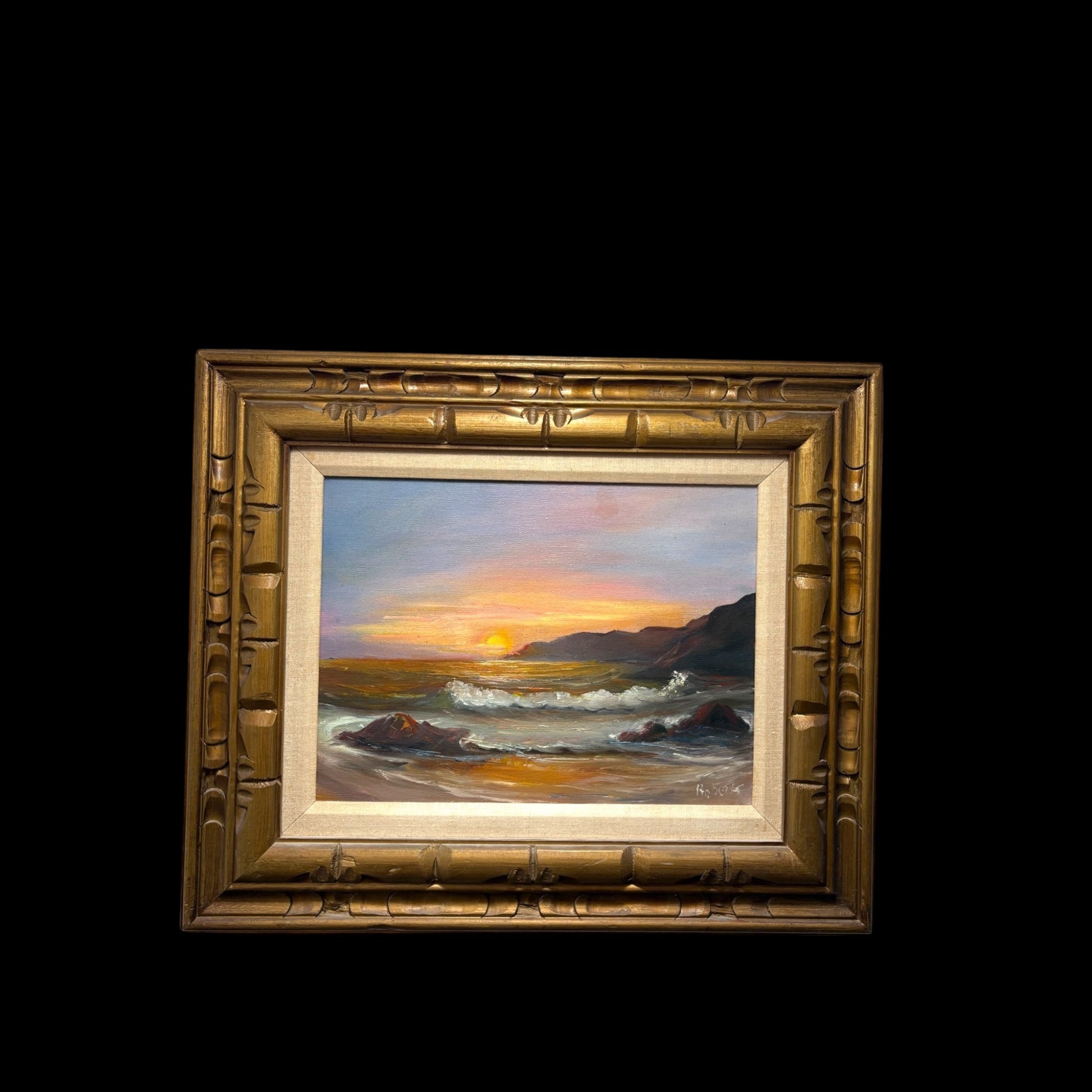 An atmospheric seascape signed Roberts capturing the last light of day as the sun sets beyond the Pacific, casting warm golds and violets across rolling waves. With expressive brushwork and a refined palette, Robert evokes the quiet power of nature at dusk.Presented in a carved giltwood bamboo-style frame with linen liner, the work offers both elegance and serenity—an intimate meditation on light, movement, and horizon.