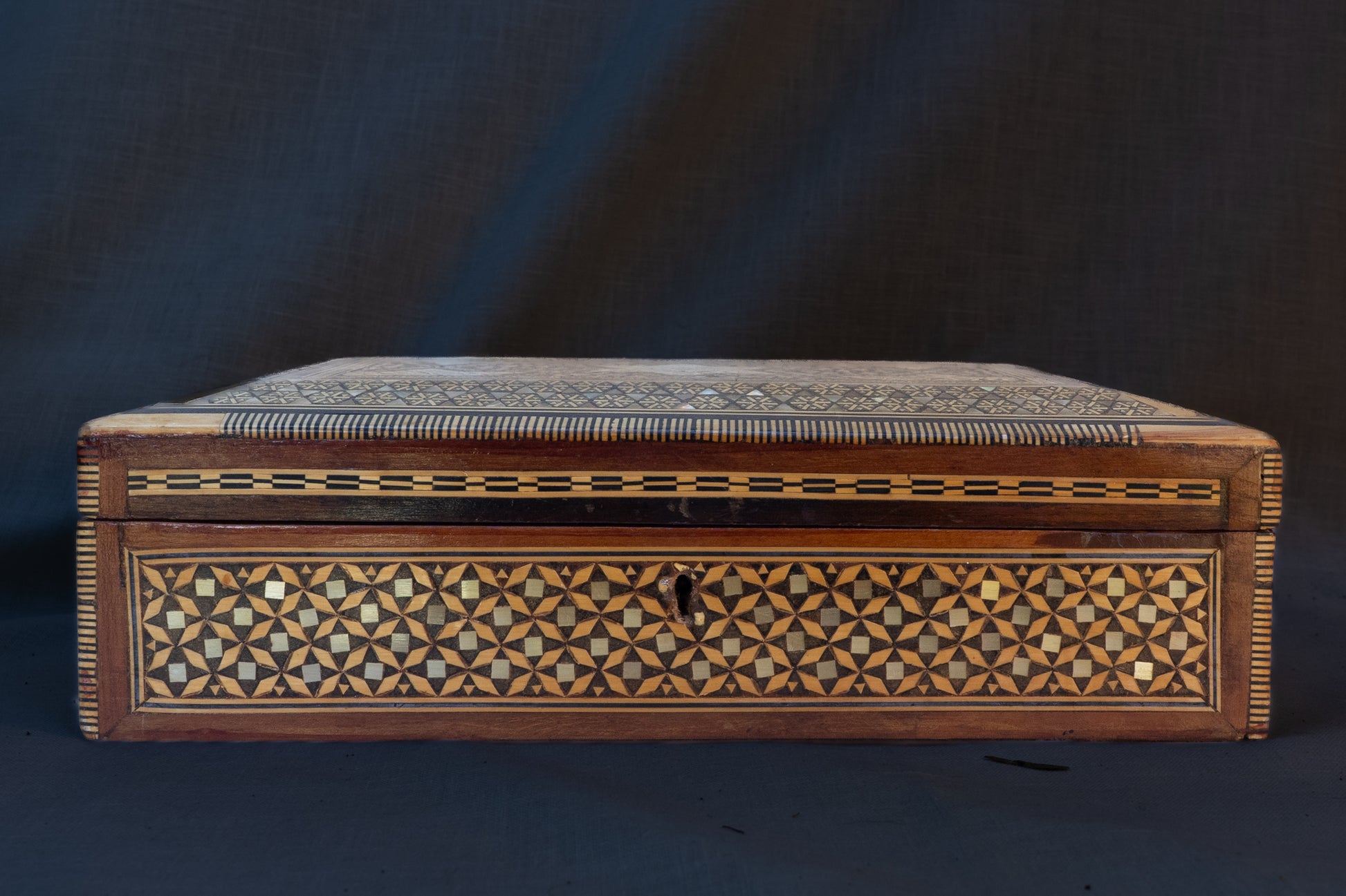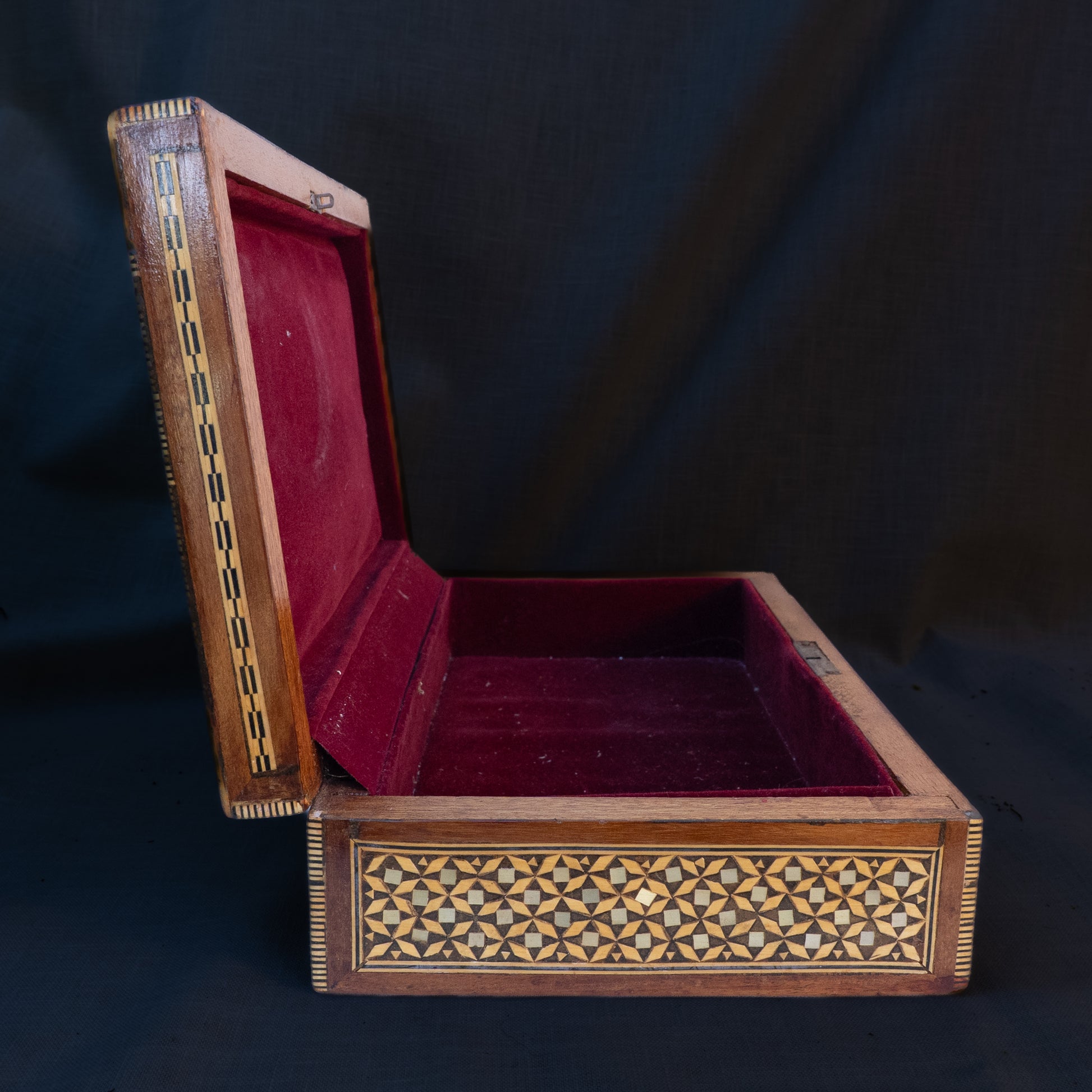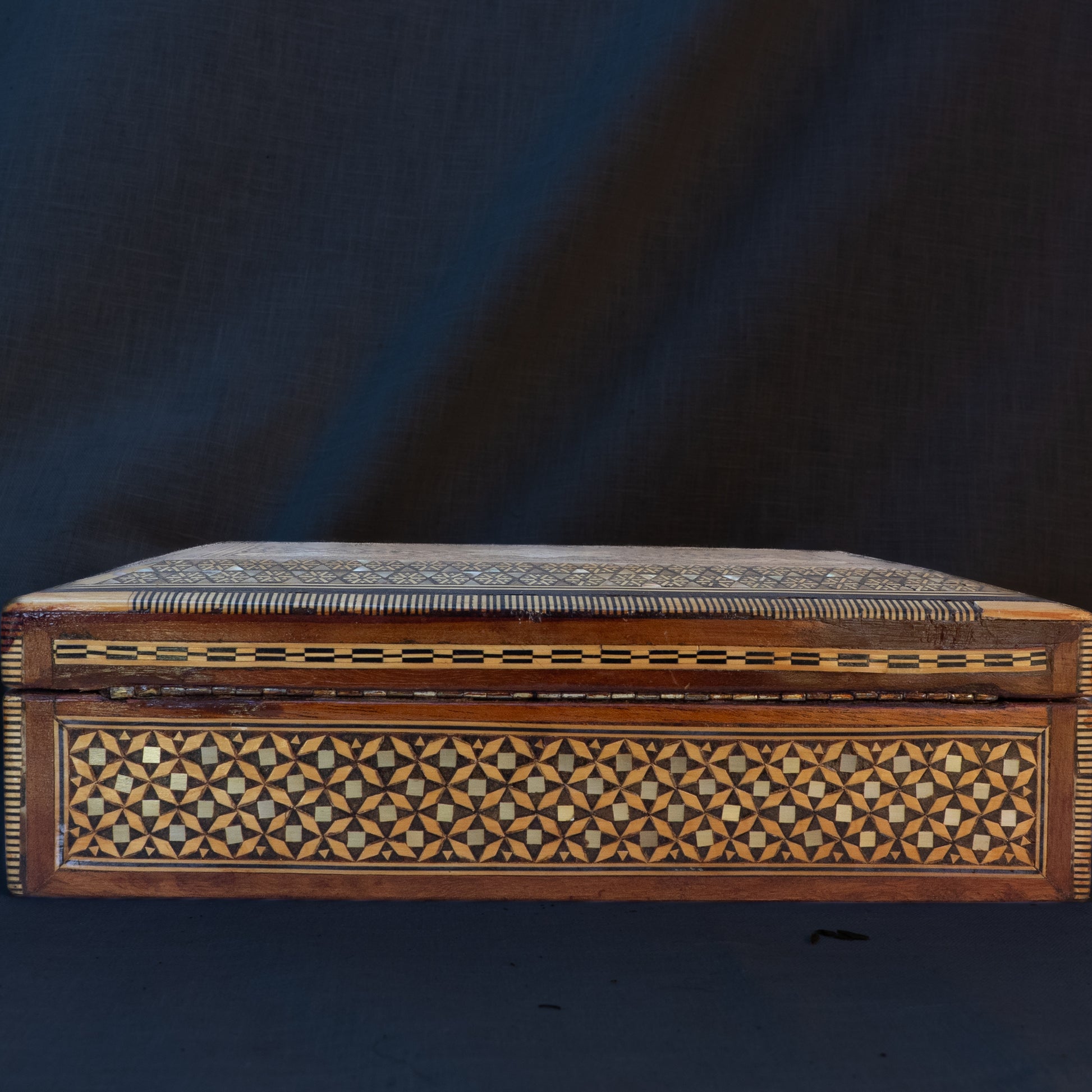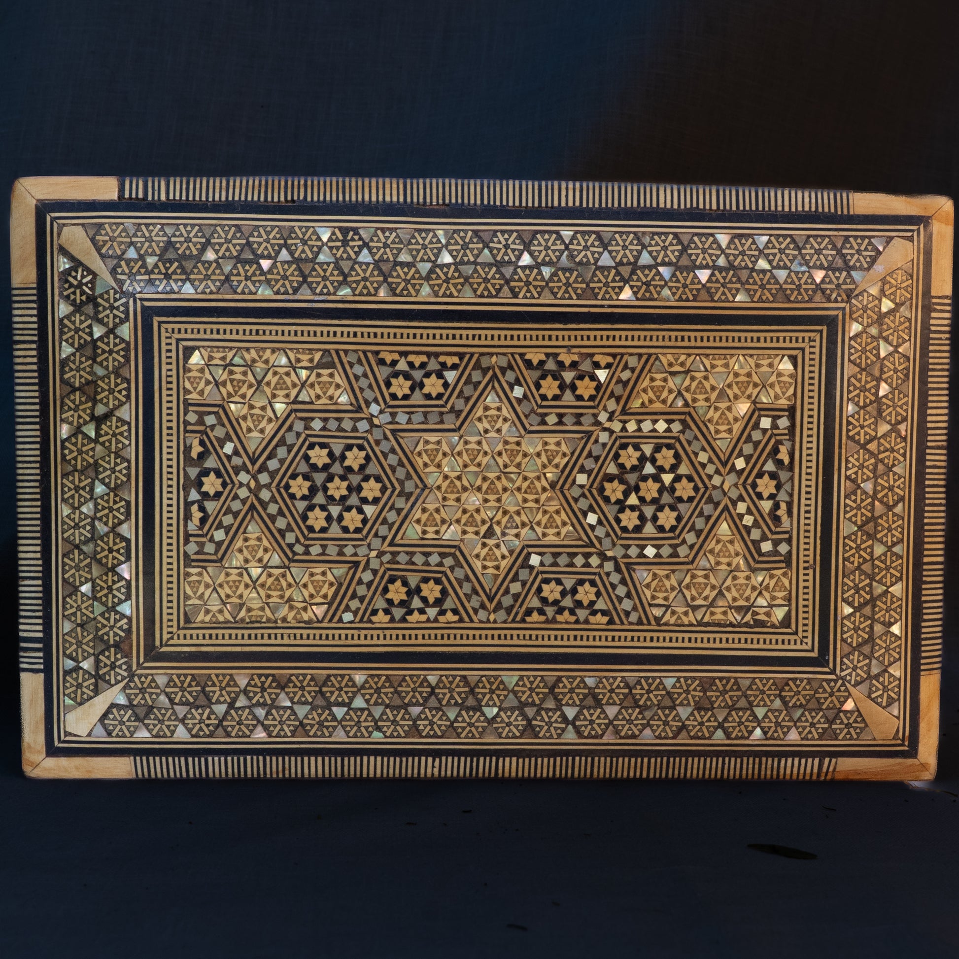 A superb example of Levantine marquetry craftsmanship, this Syrian box dates to the 1930s–1940s and features a complex geometric pattern composed of mother-of-pearl, bone, walnut, and dyed hardwoods. The central motif—an eight-pointed starburst within a larger interlaced border—is surrounded by intricate mosaic fields of repeated tessellations, reflecting the Islamic visual language of infinity and precision. Lined with red velvet, the interior suggests the piece was used to store jewelry, documents, or precious keepsakes. Produced during a period of national artistic pride and revival, this box represents the golden era of Syrian inlay work—where Damascus and Aleppo workshops synthesized Ottoman, Mamluk, and local influences into functional masterpieces.