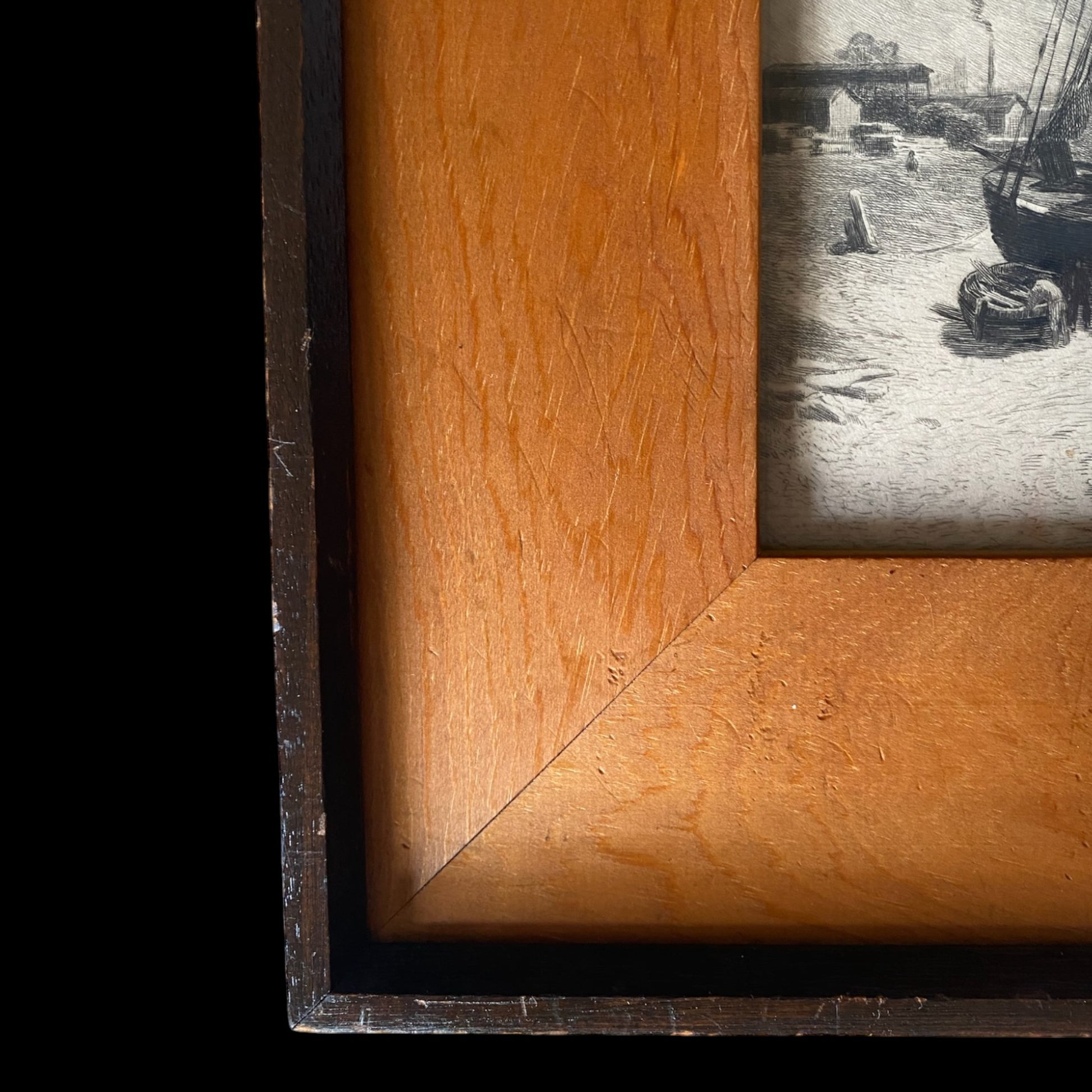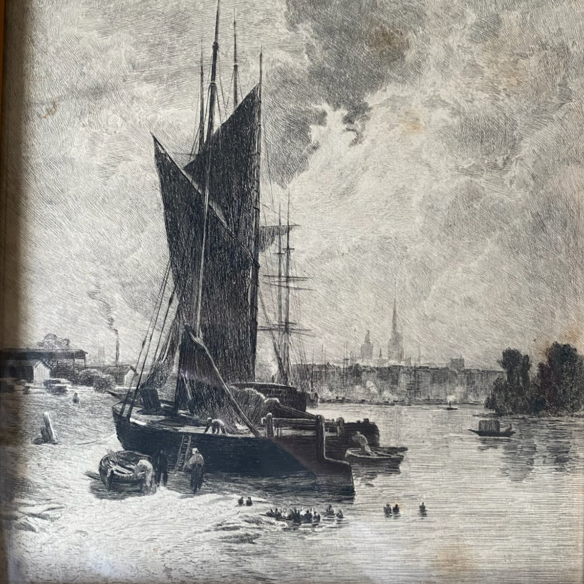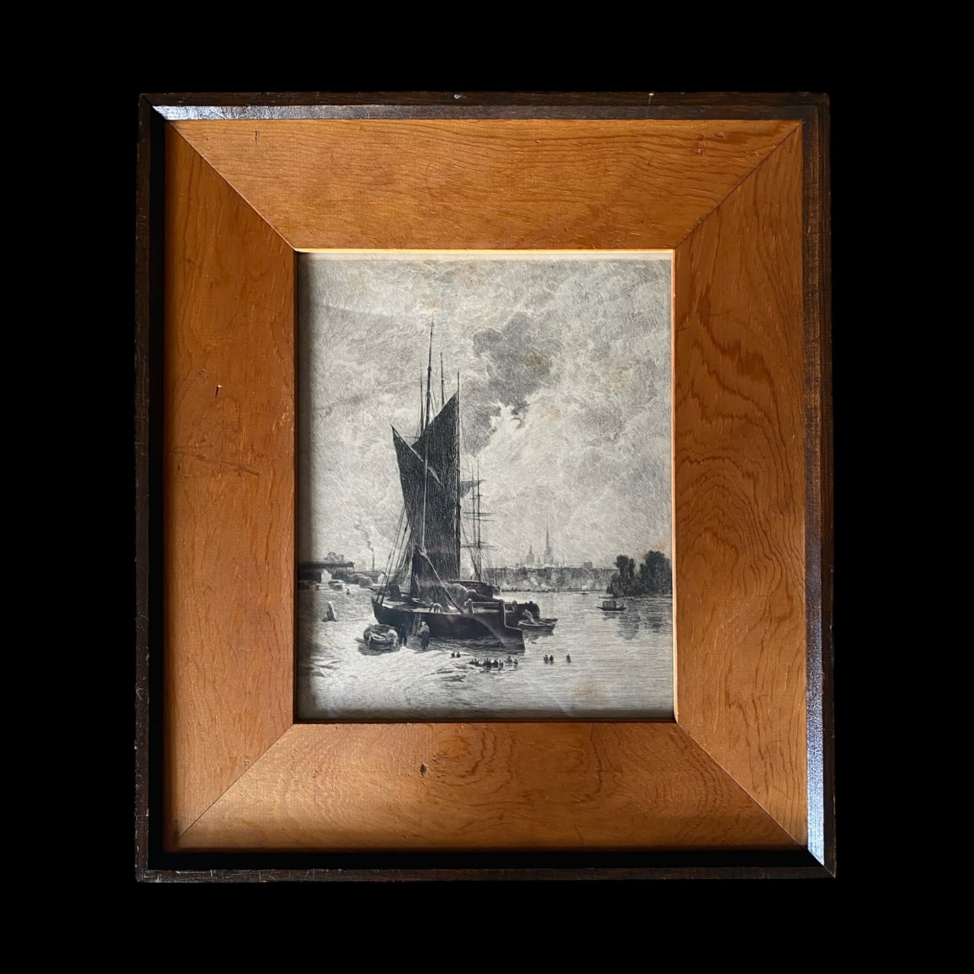 Embark on a visual journey with Theophile Chauvel's etching titled "Barges near Rouen." This captivating piece transports you to a serene nautical scene, expertly rendered with meticulous detail by the artist. Chauvel's etching skillfully captures the essence of barges navigating the waters near Rouen, portraying a scene rich in maritime beauty. The delicate lines and shading evoke a sense of movement, while the play of light on the water adds depth and atmosphere to the composition. Immerse yourself in the nuanced artistry of this nautical scene, where Chauvel's expertise in etching brings the maritime world to life. Displayed without distraction, the etching becomes a focal point, inviting you to appreciate the subtleties and storytelling within the intricate lines of this timeless piece.