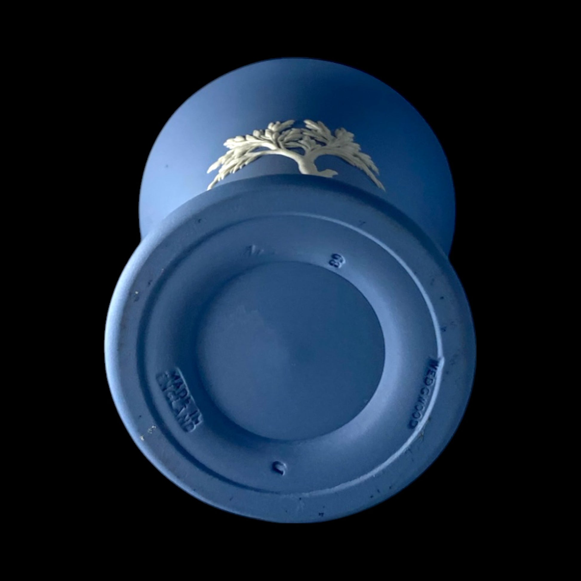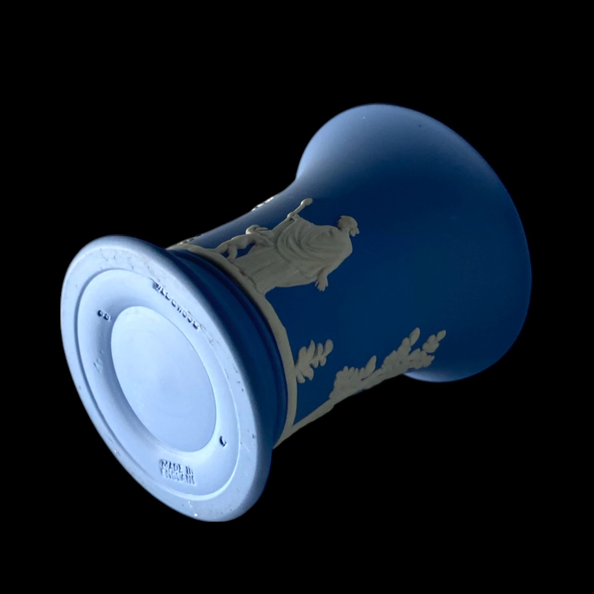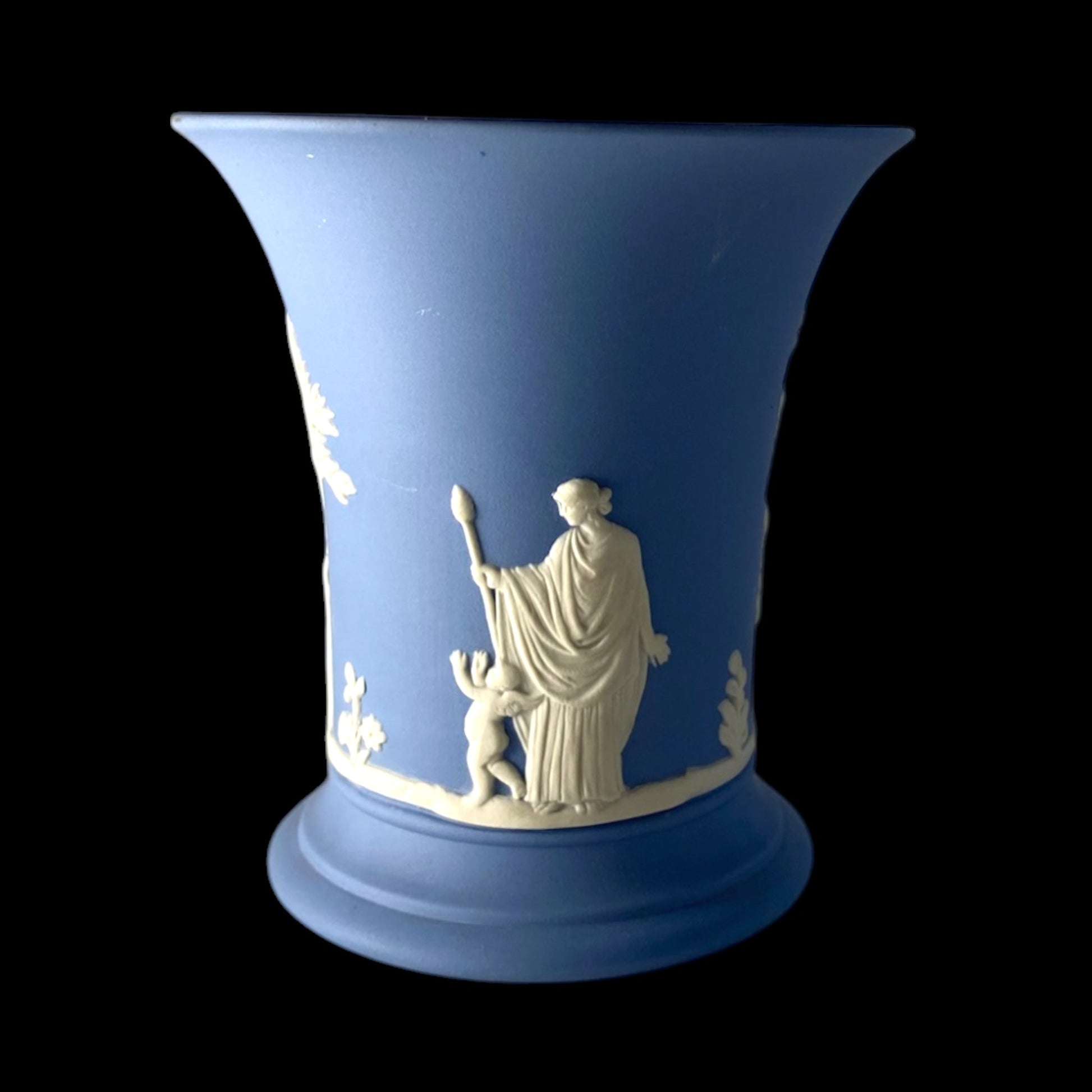 This is a Vintage Wedgwood Blue Jasperware Posy Pot. It features classical mythological motifs on the entirety of the pot and would make a great Pencil or utensil holder.