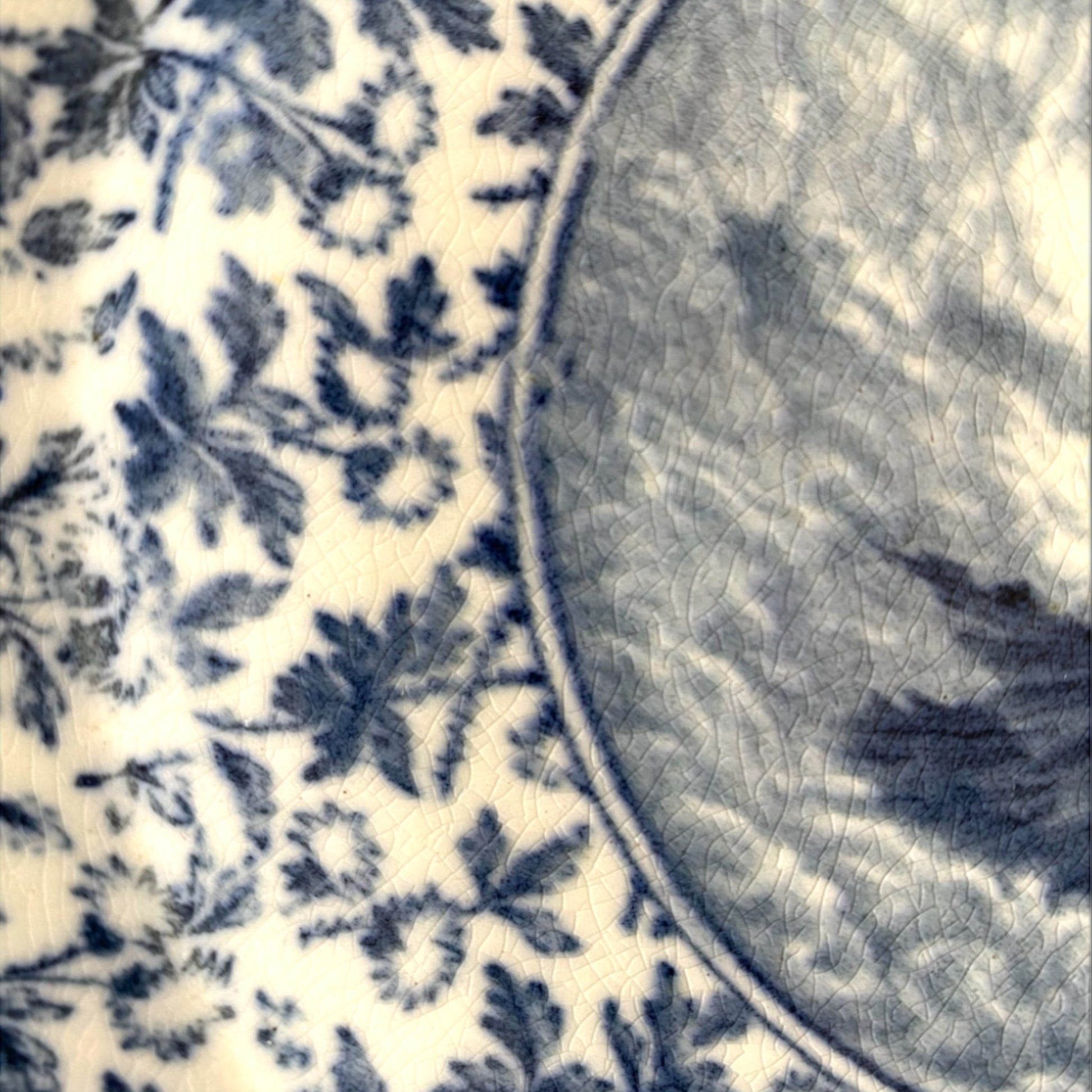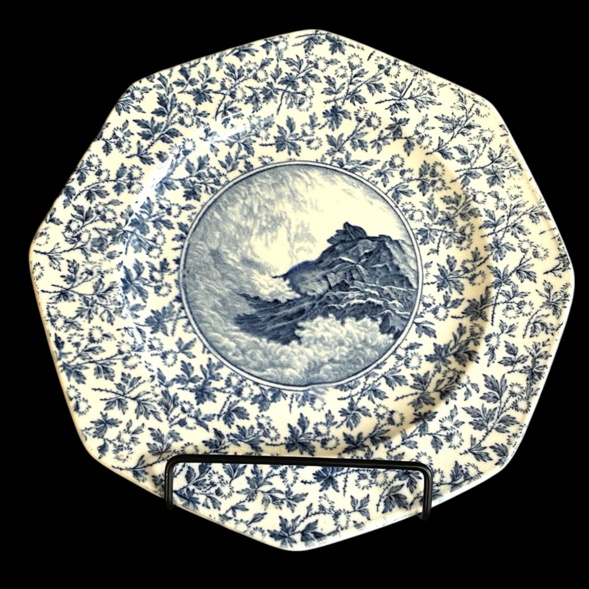A fine example of Wedgwood’s historic Americana series, this octagonal plate features a detailed cobalt blue transfer scene of the famed “Old Man of the Mountain,” the iconic rock formation that once loomed over Franconia Notch in New Hampshire's White Mountains. The central image depicts the craggy facial profile in rich relief, set against a mountainous backdrop — a romanticized nod to American natural landmarks, widely celebrated in 19th- and 20th-century decorative arts.